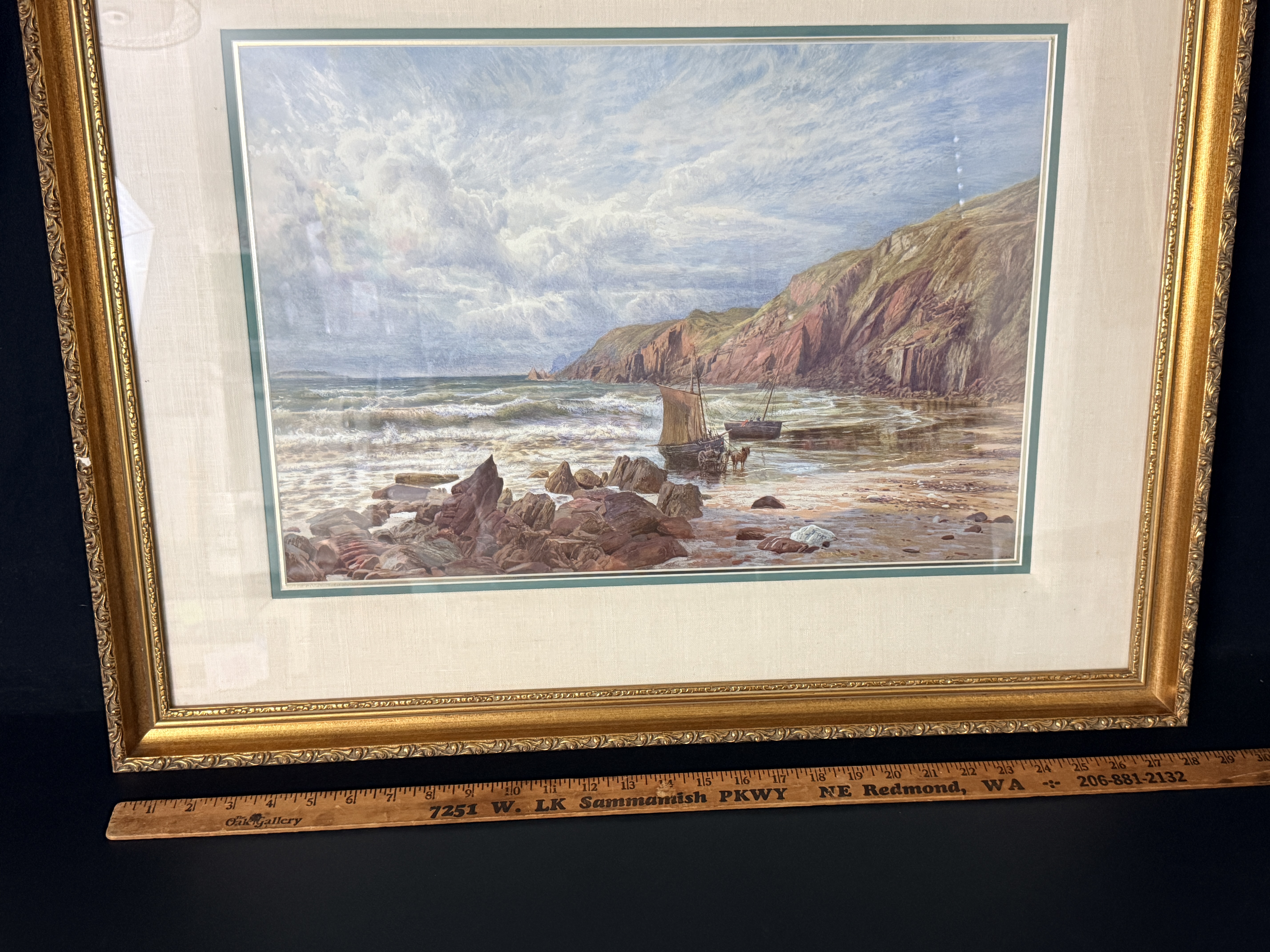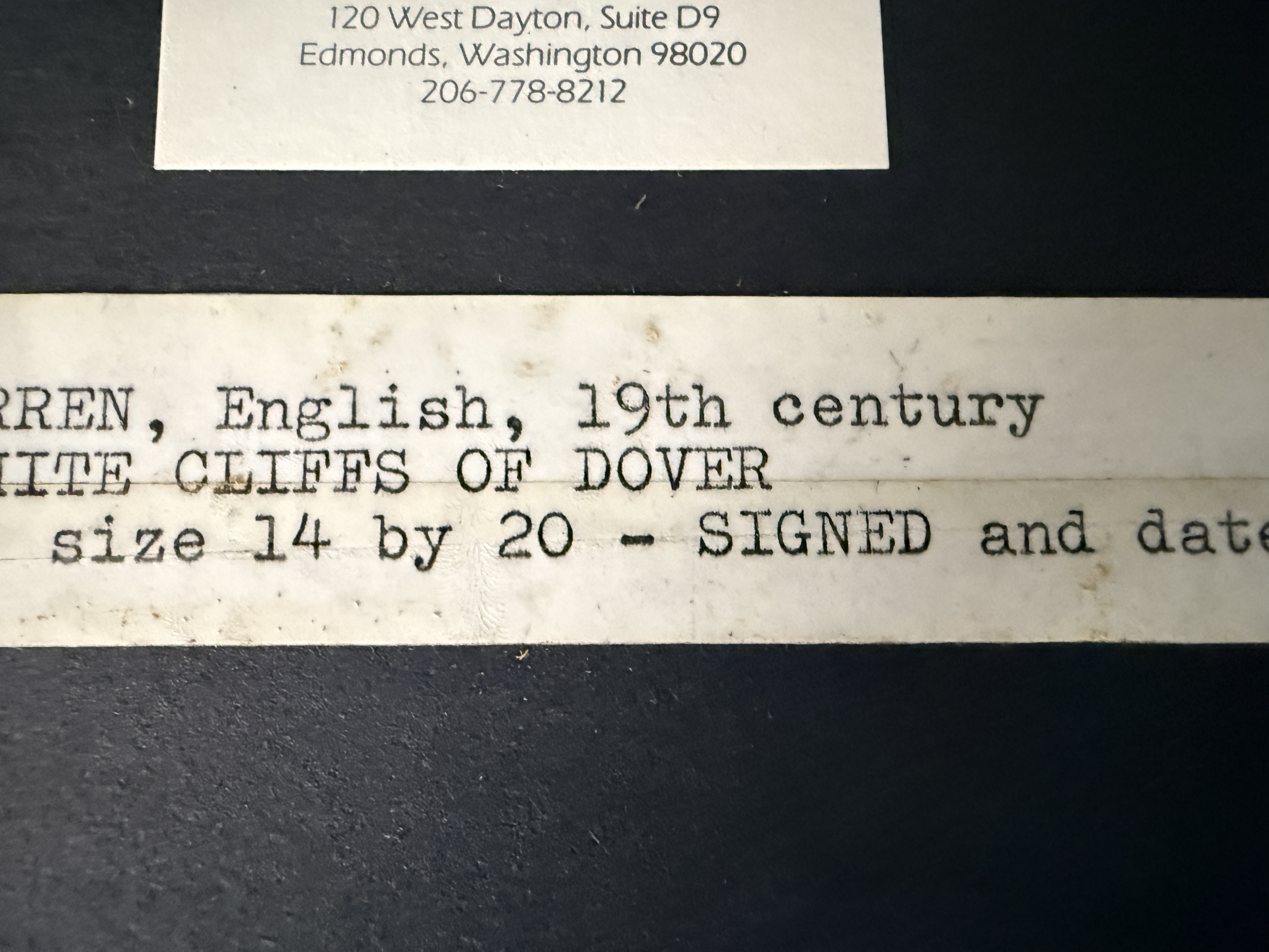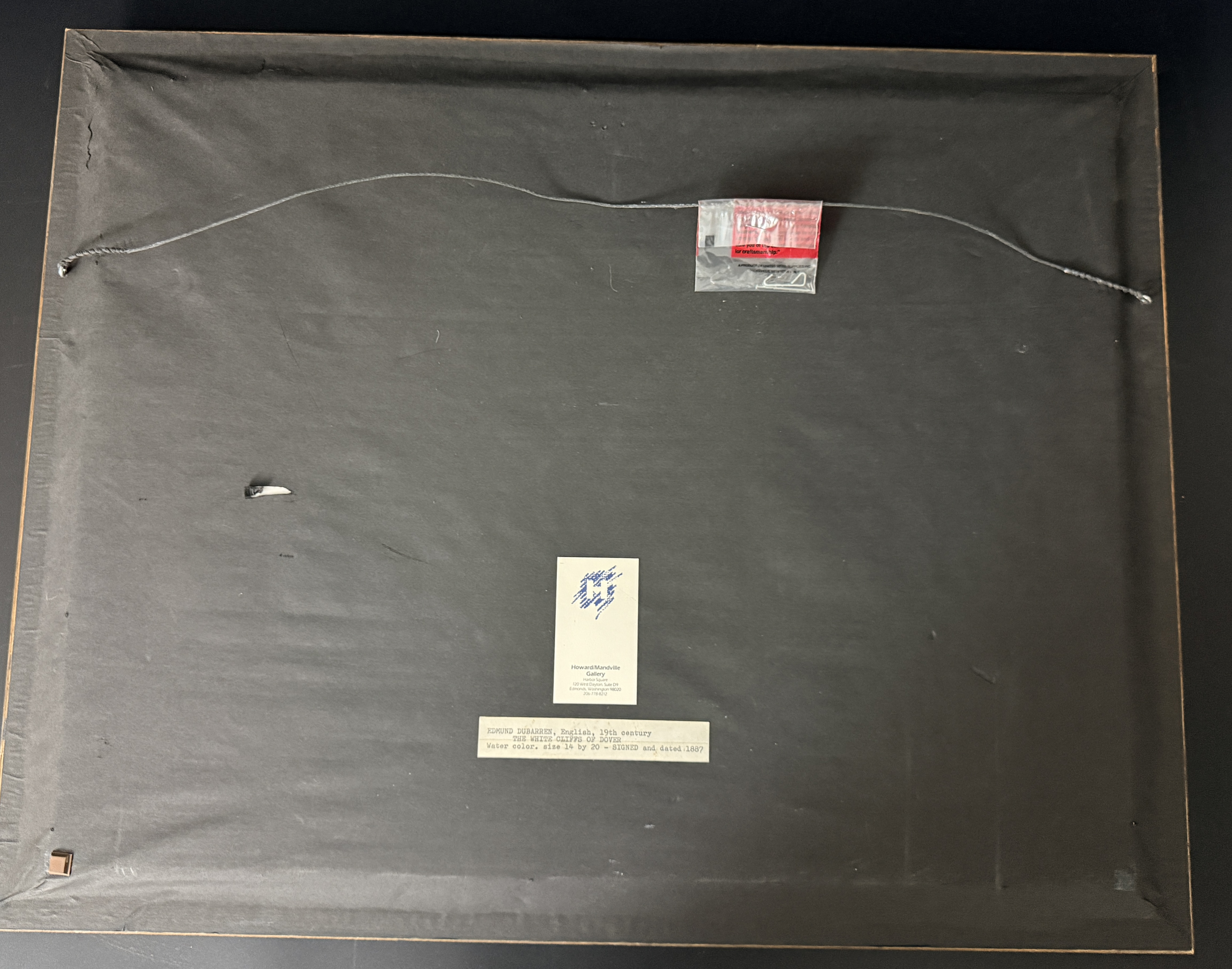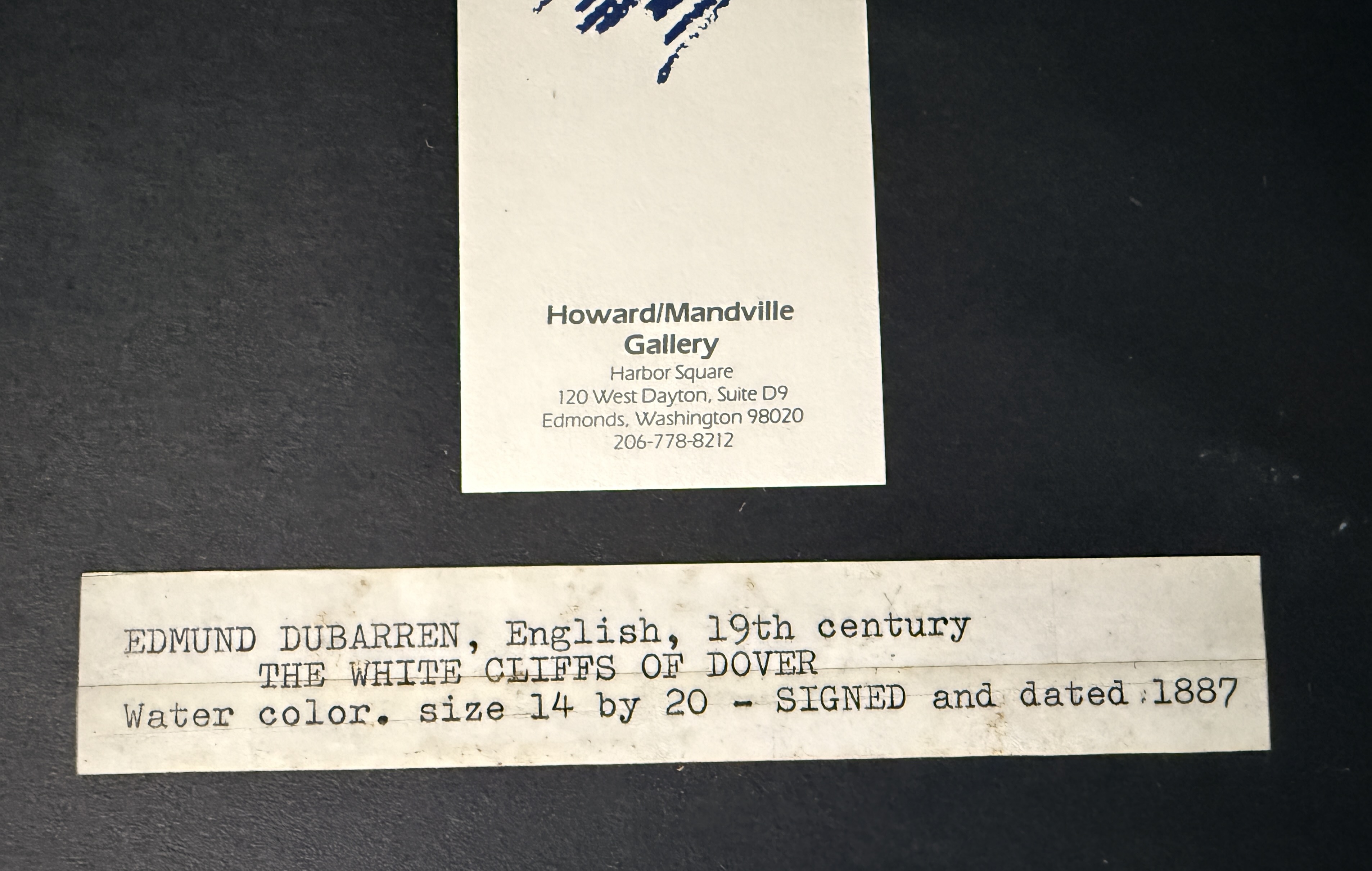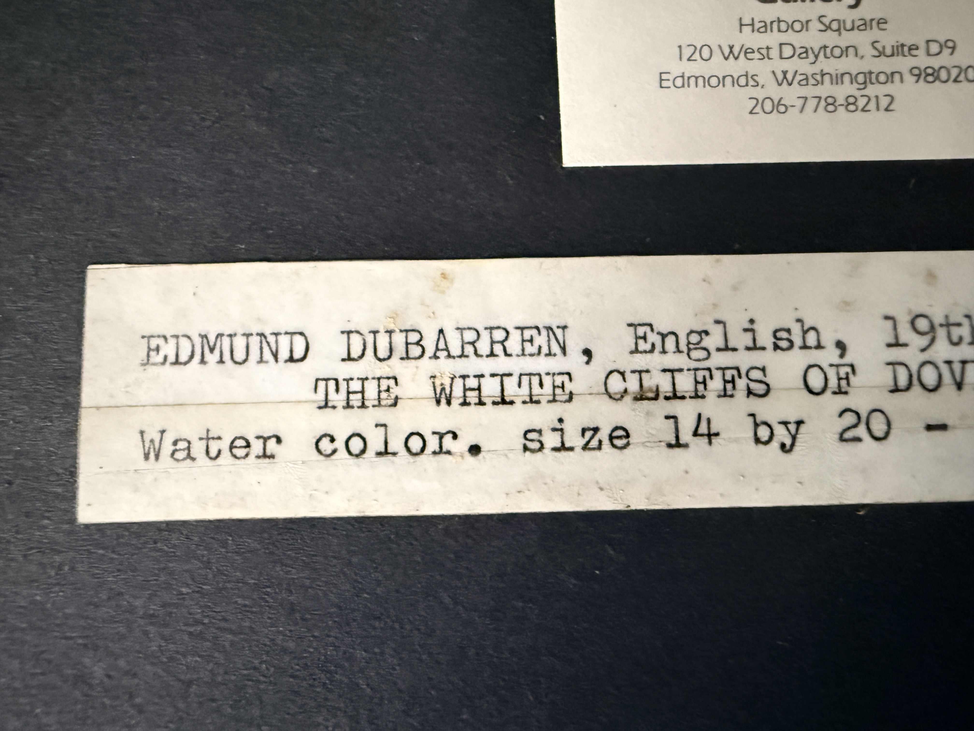 This 19th-century watercolor on paper by English artist Edmund Dubarren is titled The White Cliffs of Dover. The coastal scene depicts figures, horses, and a cart on a beach alongside small sailing vessels in the surf, set against a backdrop of red-toned cliffs. The work is signed and dated 1887 by the artist in the lower left corner. It is mounted within a light linen-covered mat and housed in an ornate, gilded gesso-on-wood frame. Affixed to the reverse are gallery labels from the Howard/Mandville Gallery in Edmonds, Washington, providing the attribution, title, and medium.