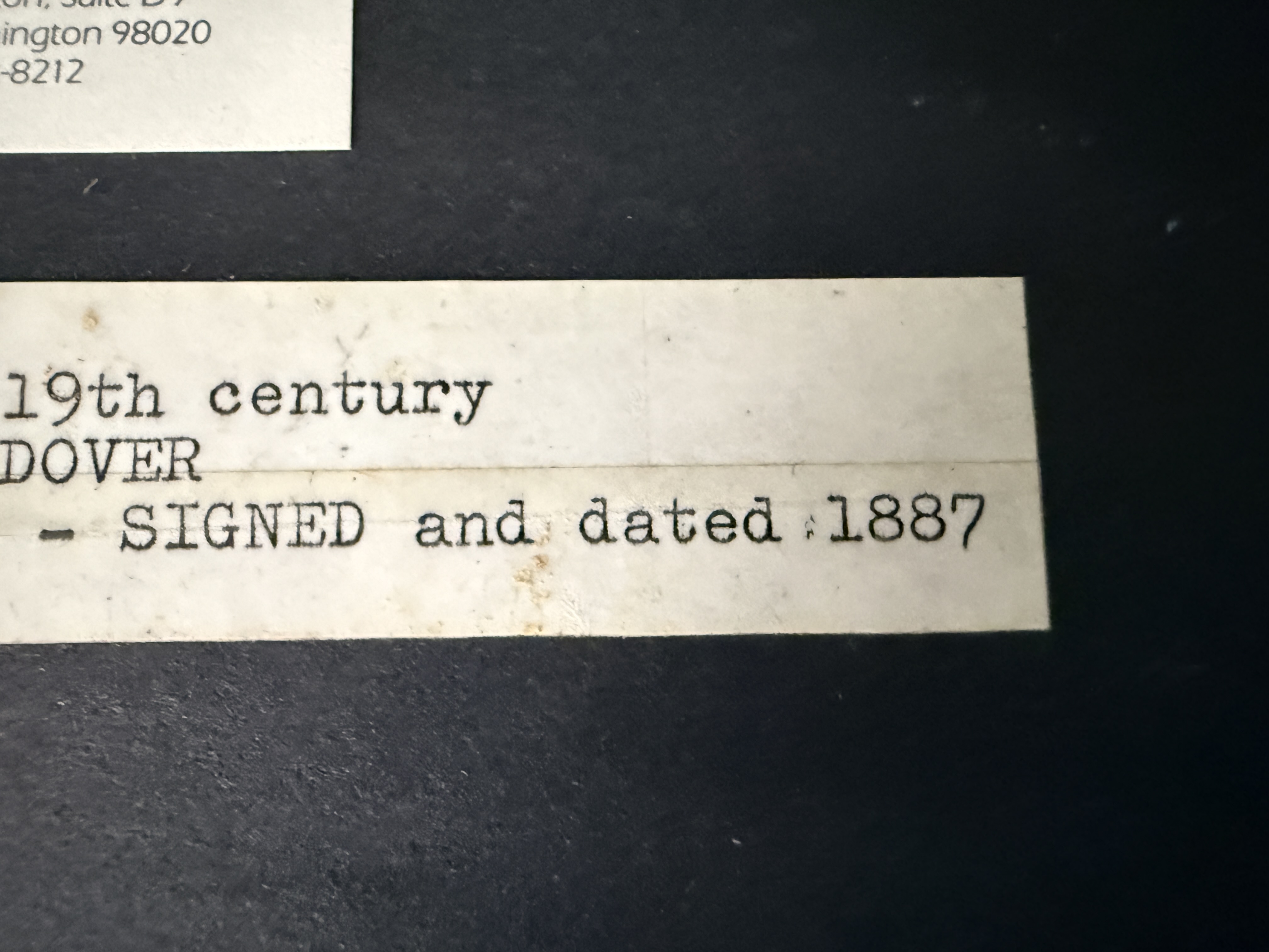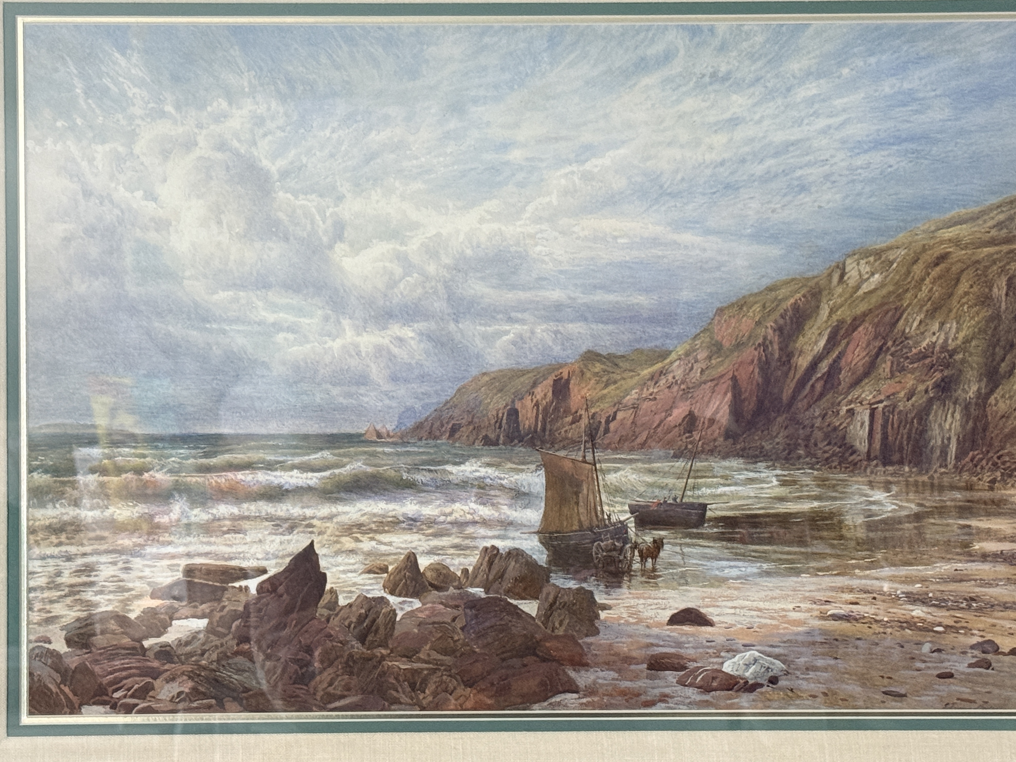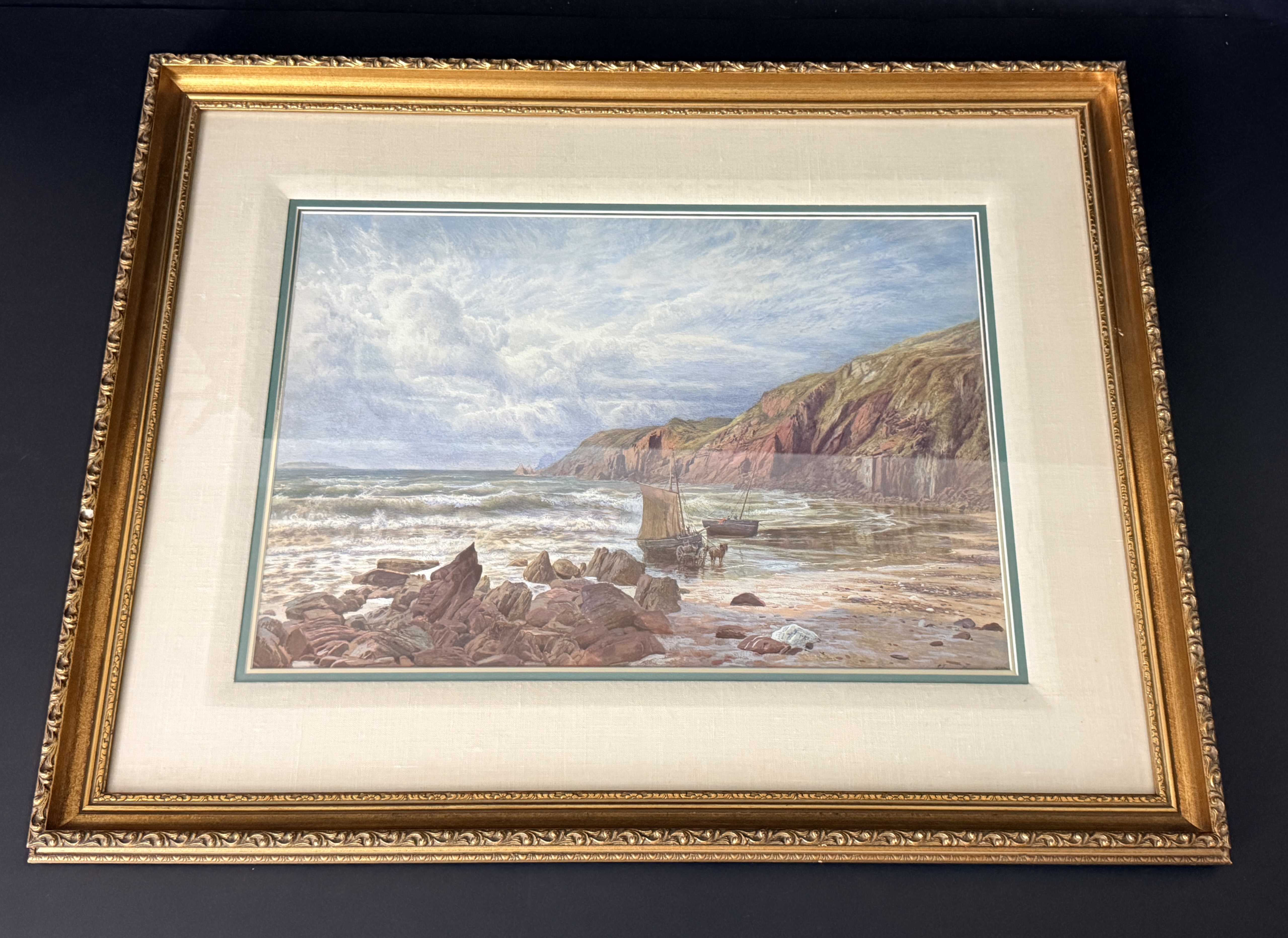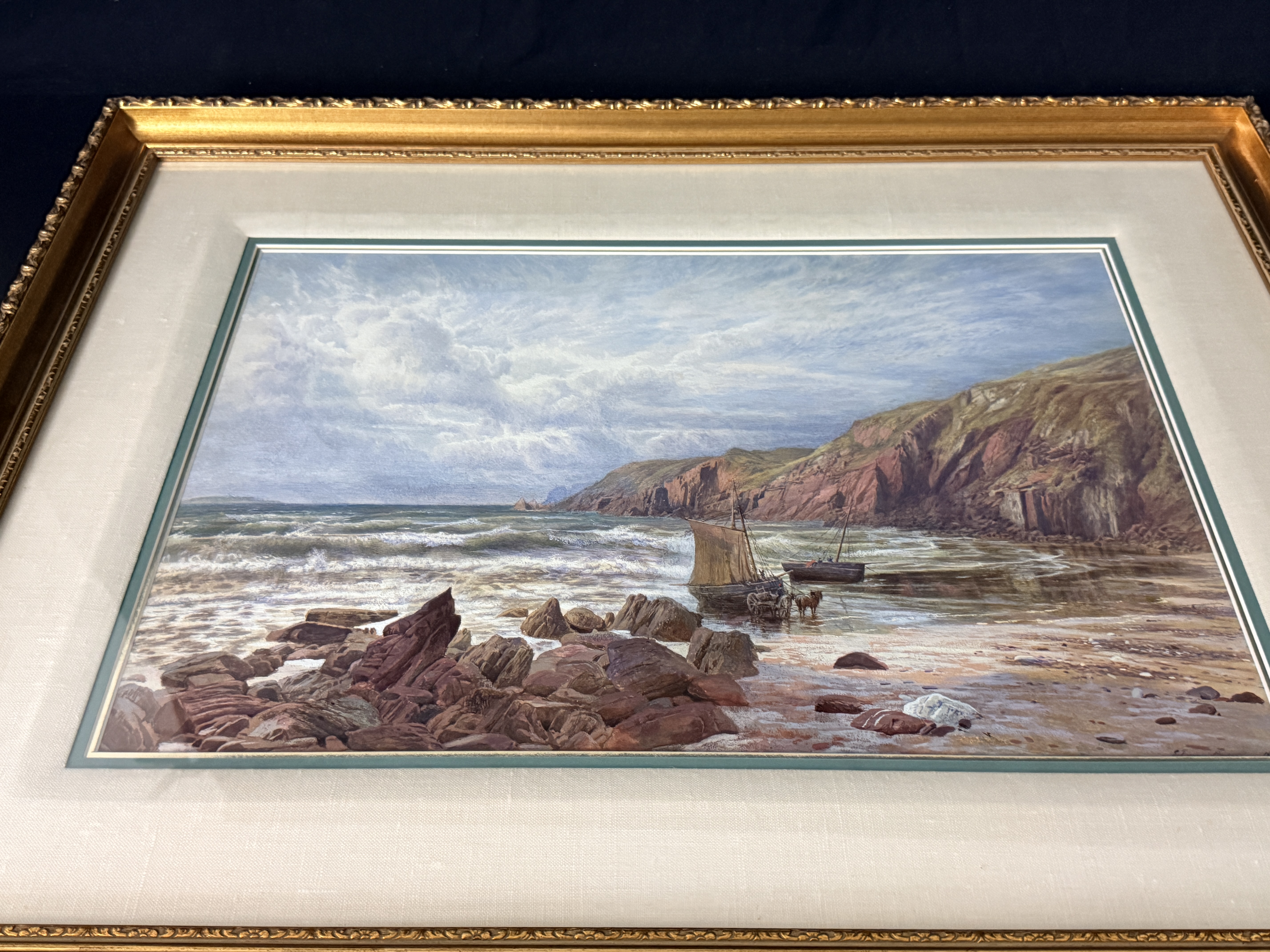This 19th-century watercolor on paper by English artist Edmund Dubarren is titled The White Cliffs of Dover. The coastal scene depicts figures, horses, and a cart on a beach alongside small sailing vessels in the surf, set against a backdrop of red-toned cliffs. The work is signed and dated 1887 by the artist in the lower left corner. It is mounted within a light linen-covered mat and housed in an ornate, gilded gesso-on-wood frame. Affixed to the reverse are gallery labels from the Howard/Mandville Gallery in Edmonds, Washington, providing the attribution, title, and medium.
