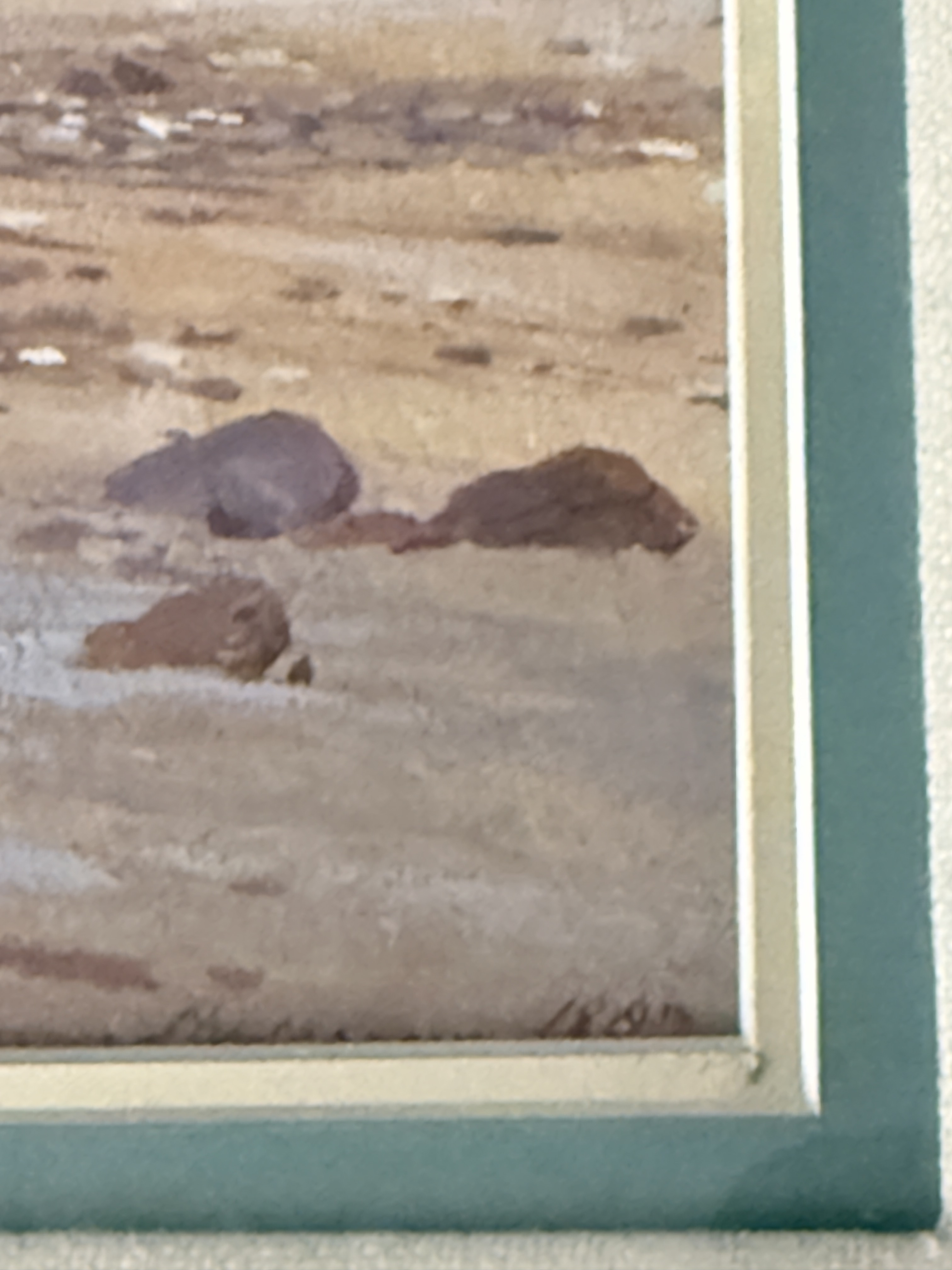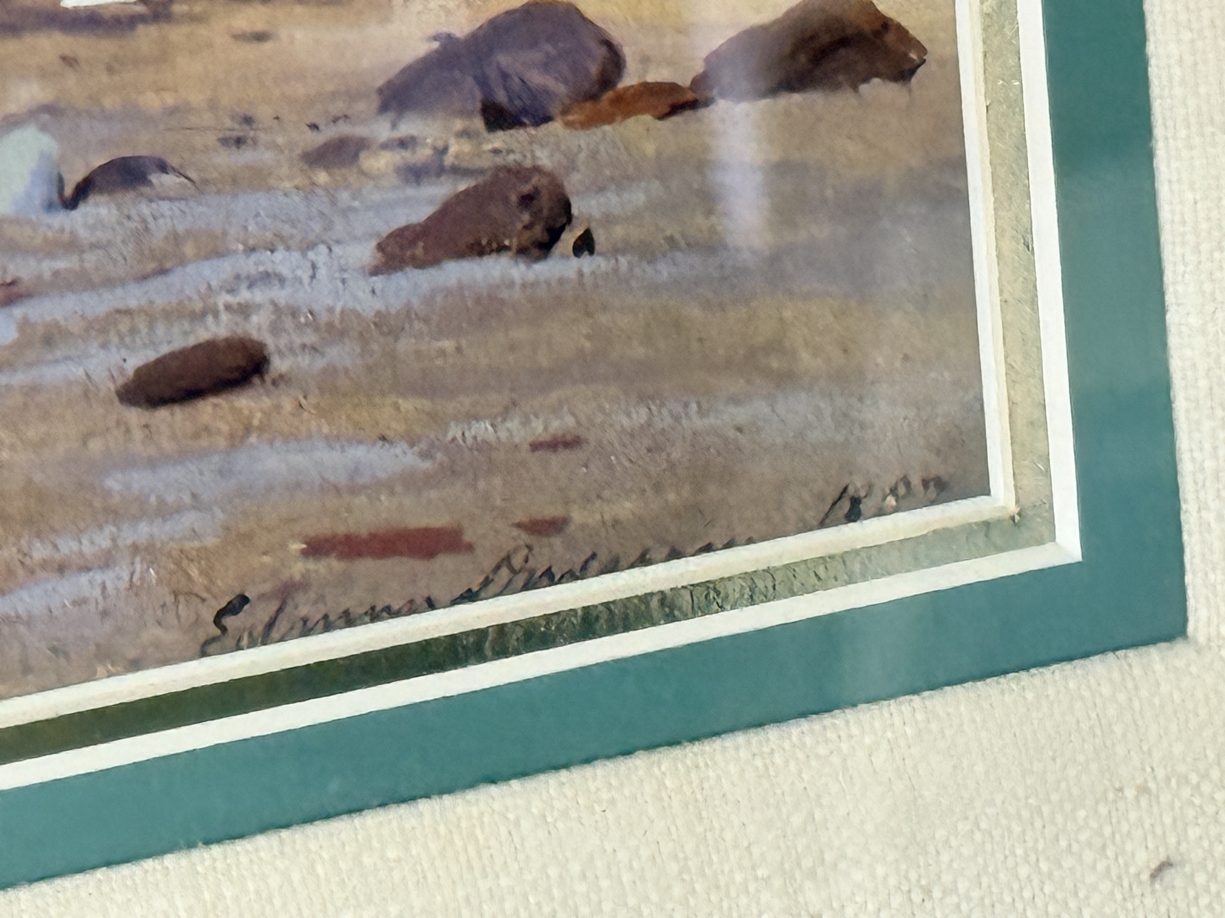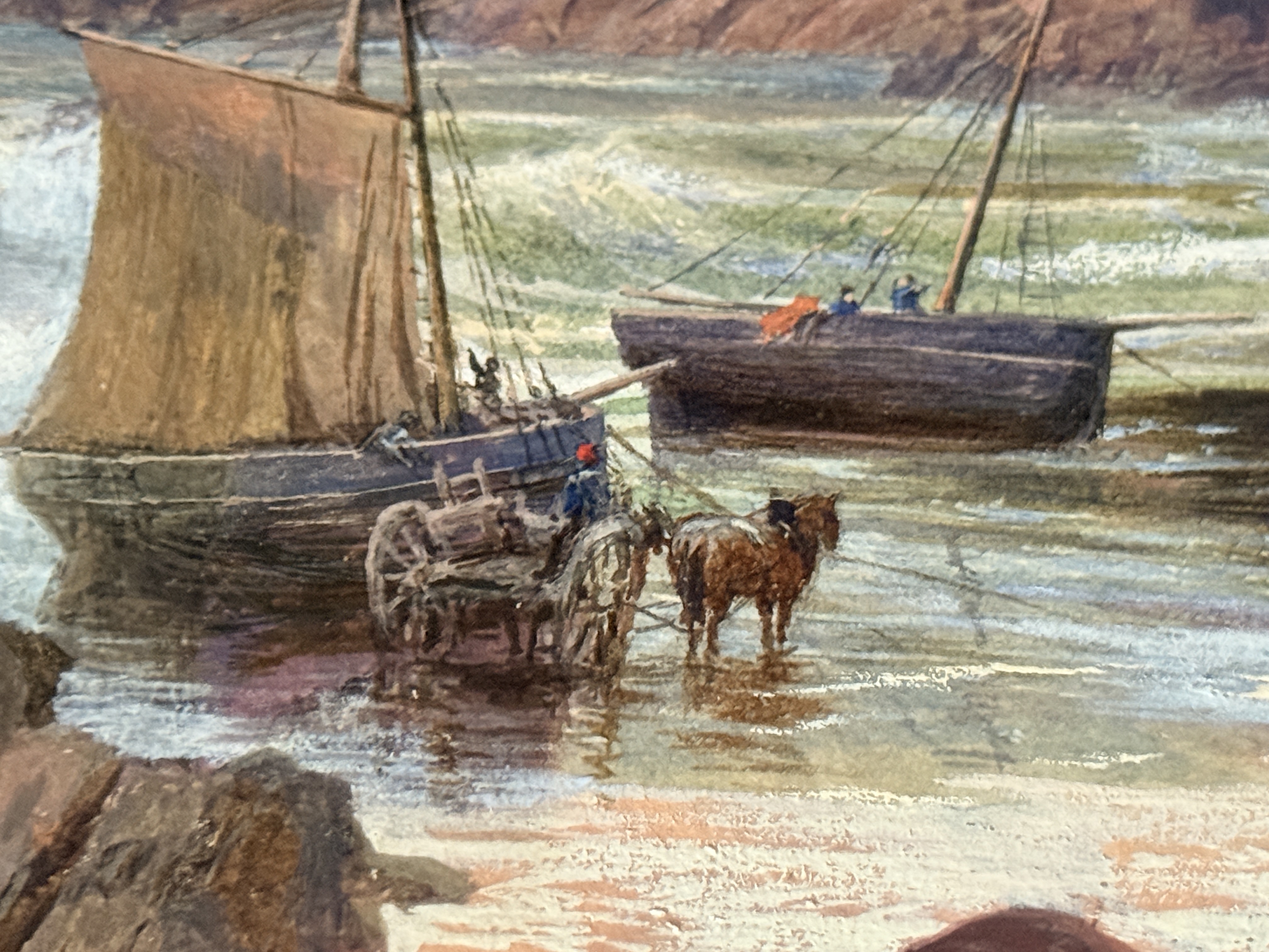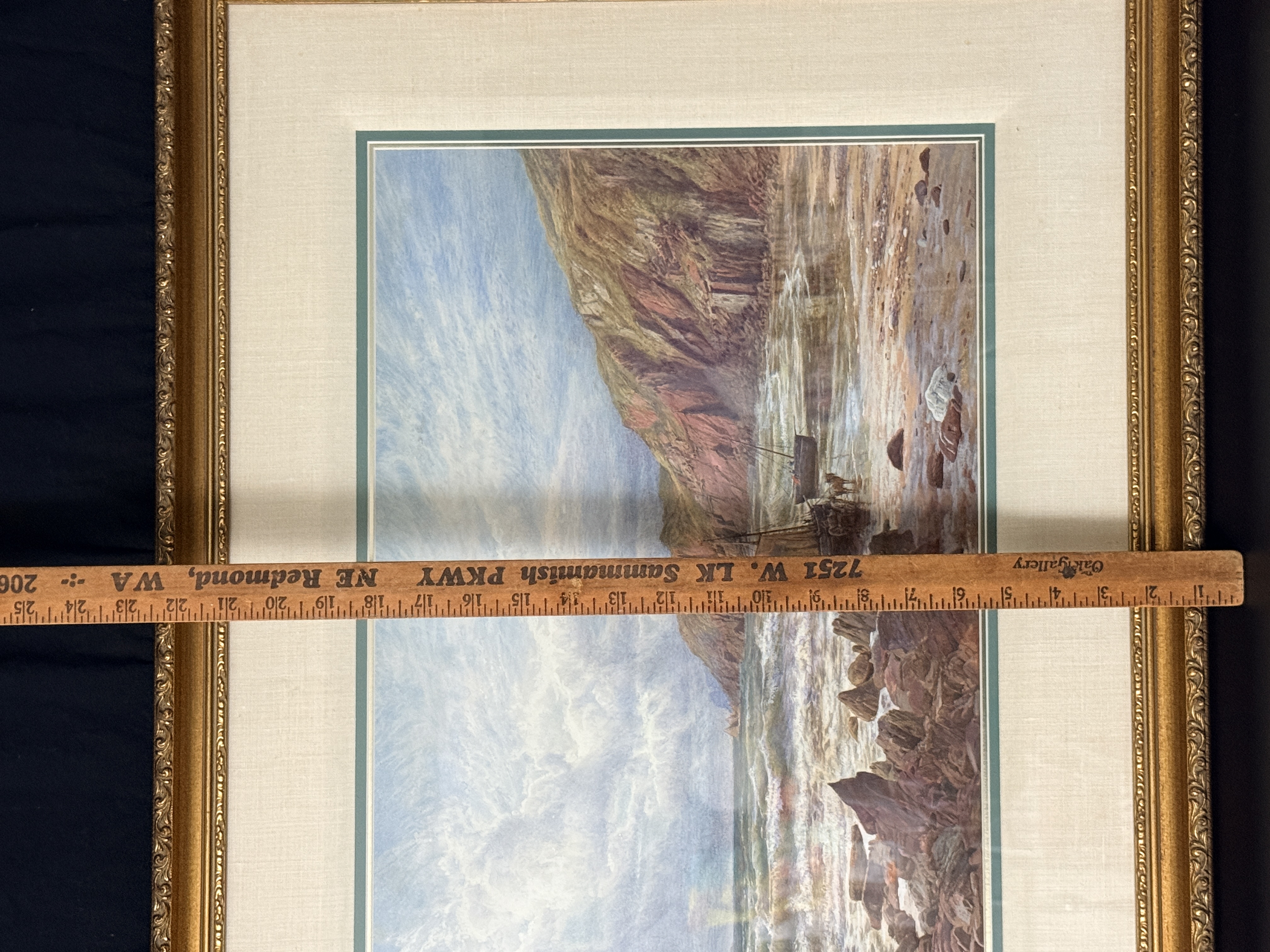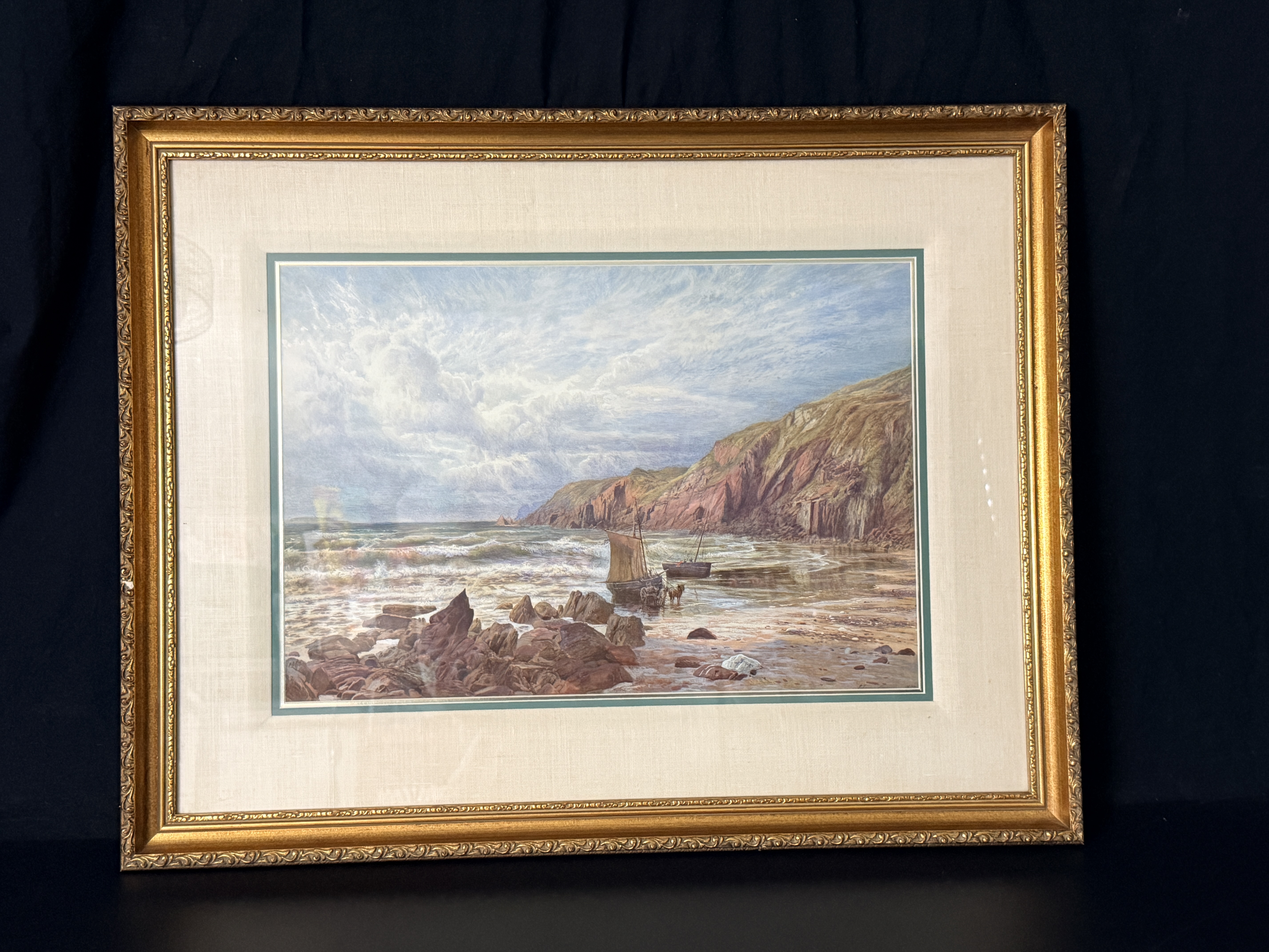 This 19th-century watercolor on paper by English artist Edmund Dubarren is titled The White Cliffs of Dover. The coastal scene depicts figures, horses, and a cart on a beach alongside small sailing vessels in the surf, set against a backdrop of red-toned cliffs. The work is signed and dated 1887 by the artist in the lower left corner. It is mounted within a light linen-covered mat and housed in an ornate, gilded gesso-on-wood frame. Affixed to the reverse are gallery labels from the Howard/Mandville Gallery in Edmonds, Washington, providing the attribution, title, and medium.