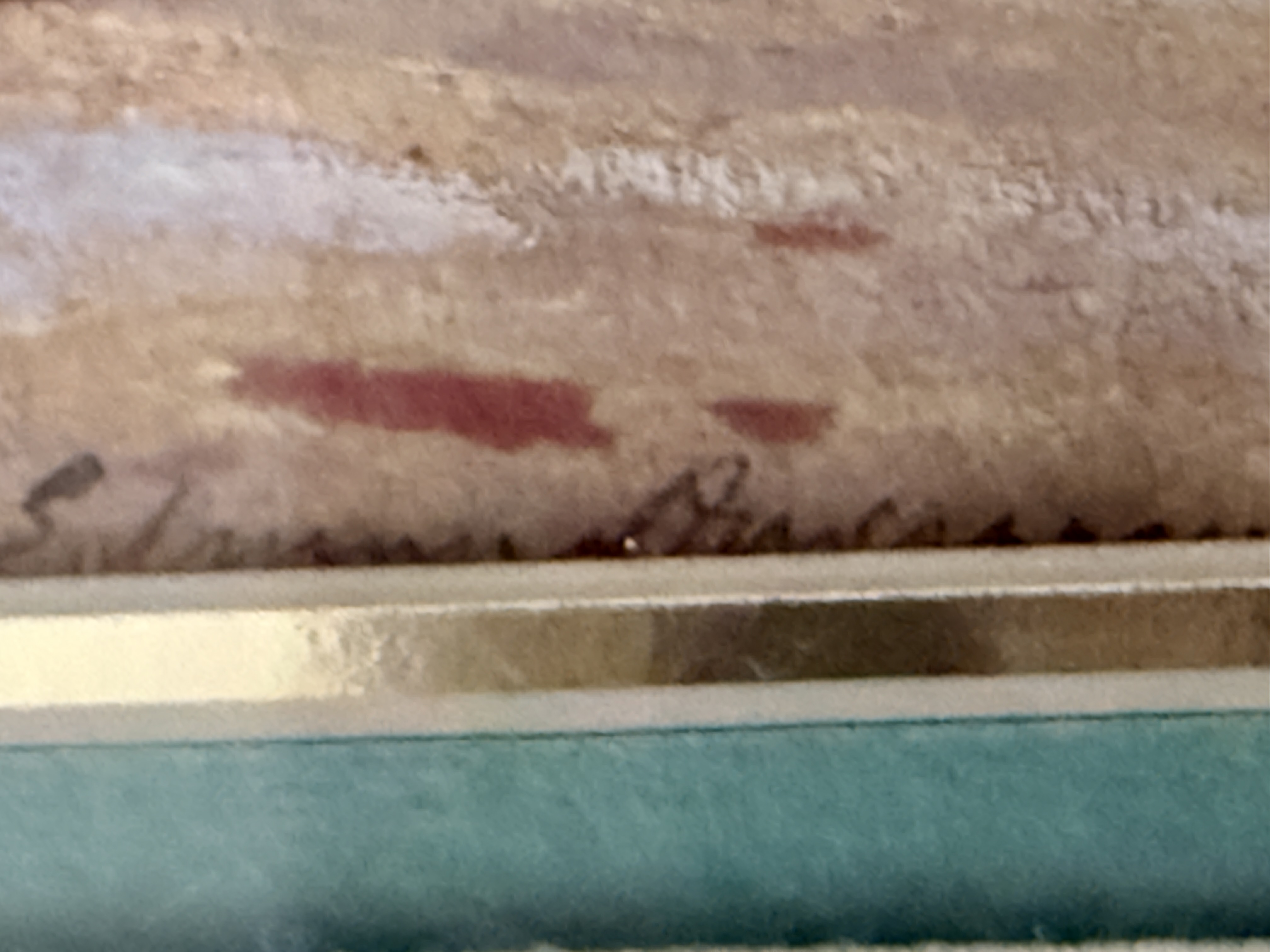 The watercolor is in good overall condition with no visible foxing or significant fading. The gilded gesso-on-wood frame shows minor age-appropriate wear, including small surface abrasions and minor losses to the gilding. Art is from a clean smoke free home.