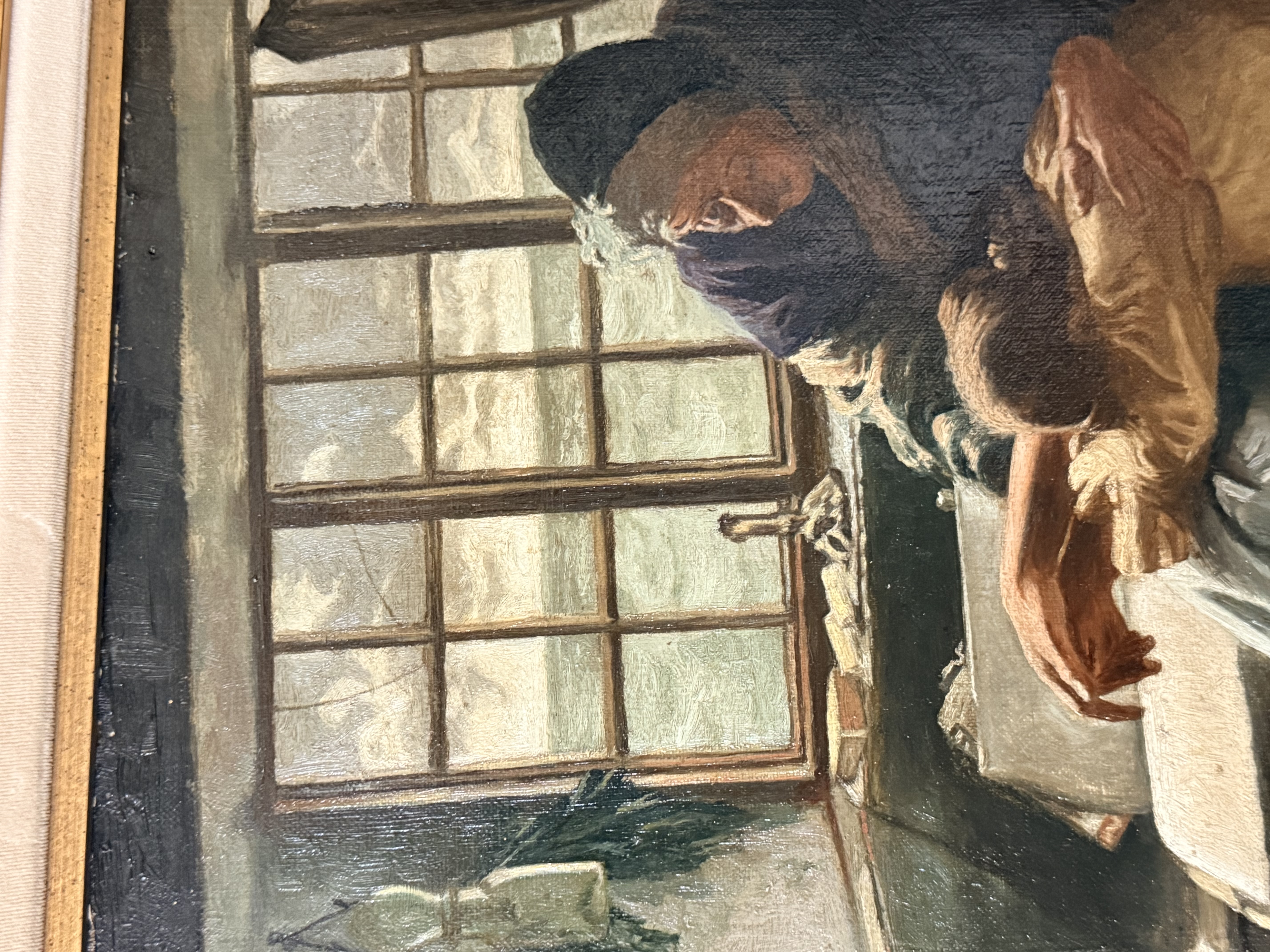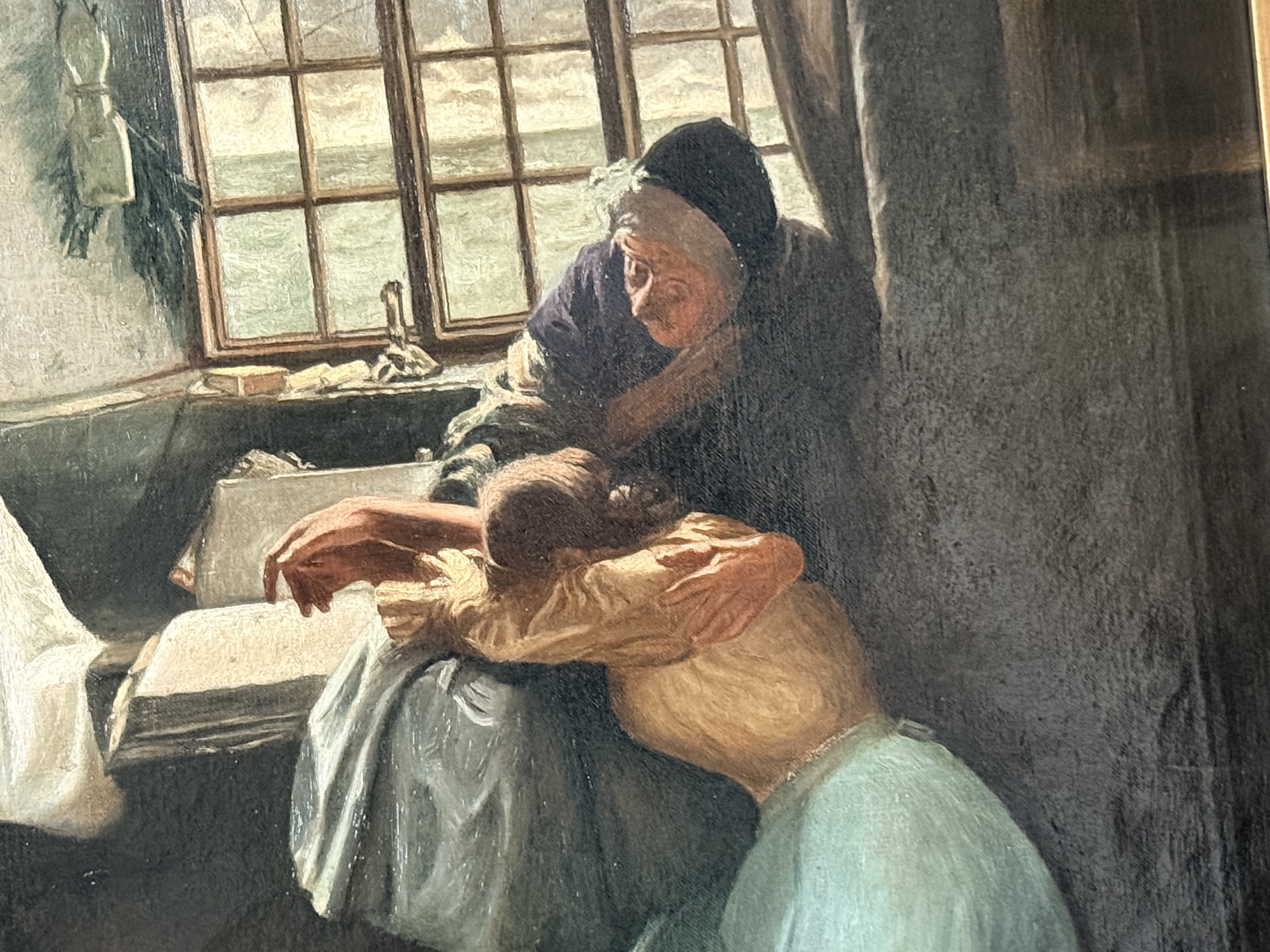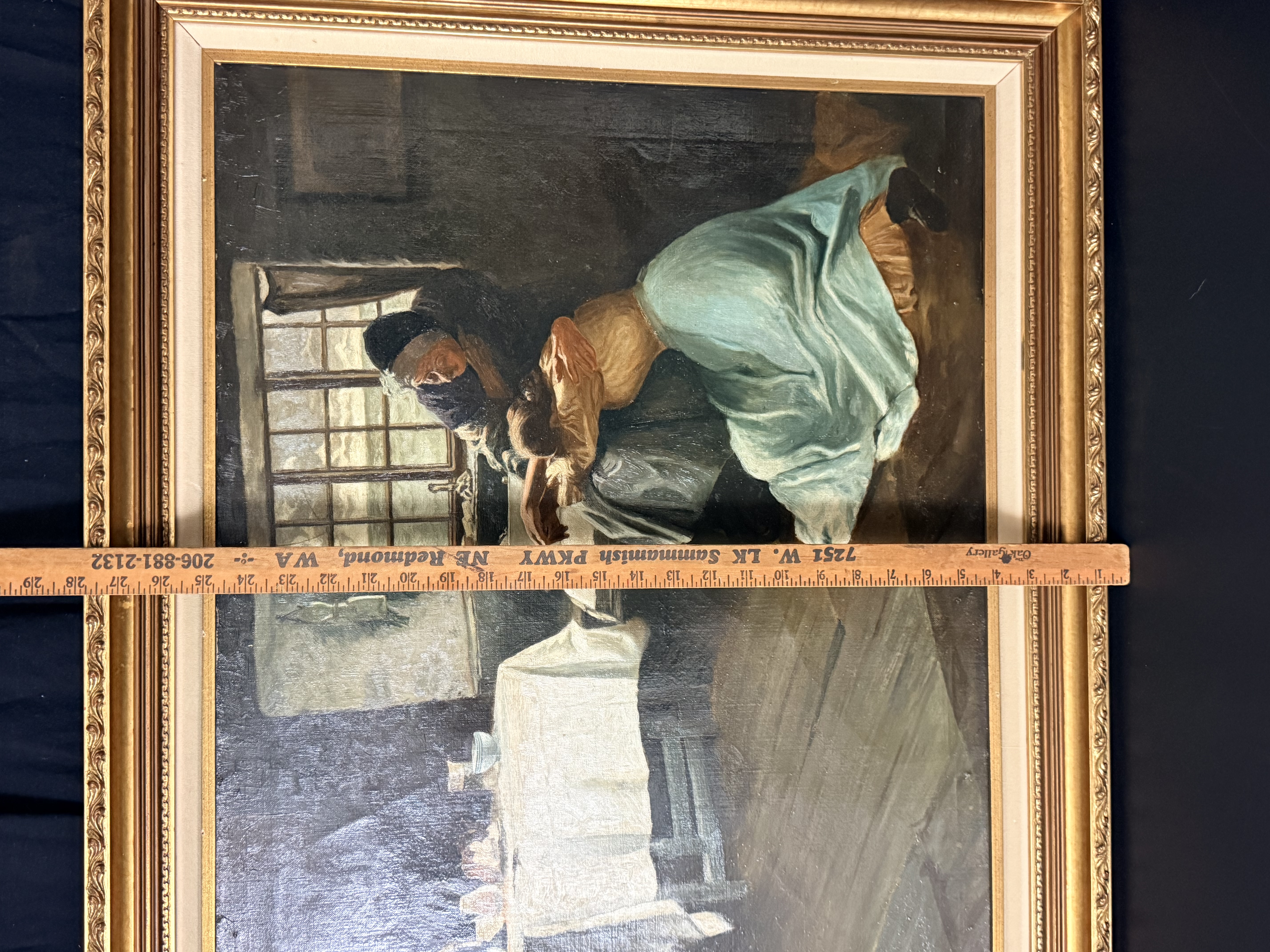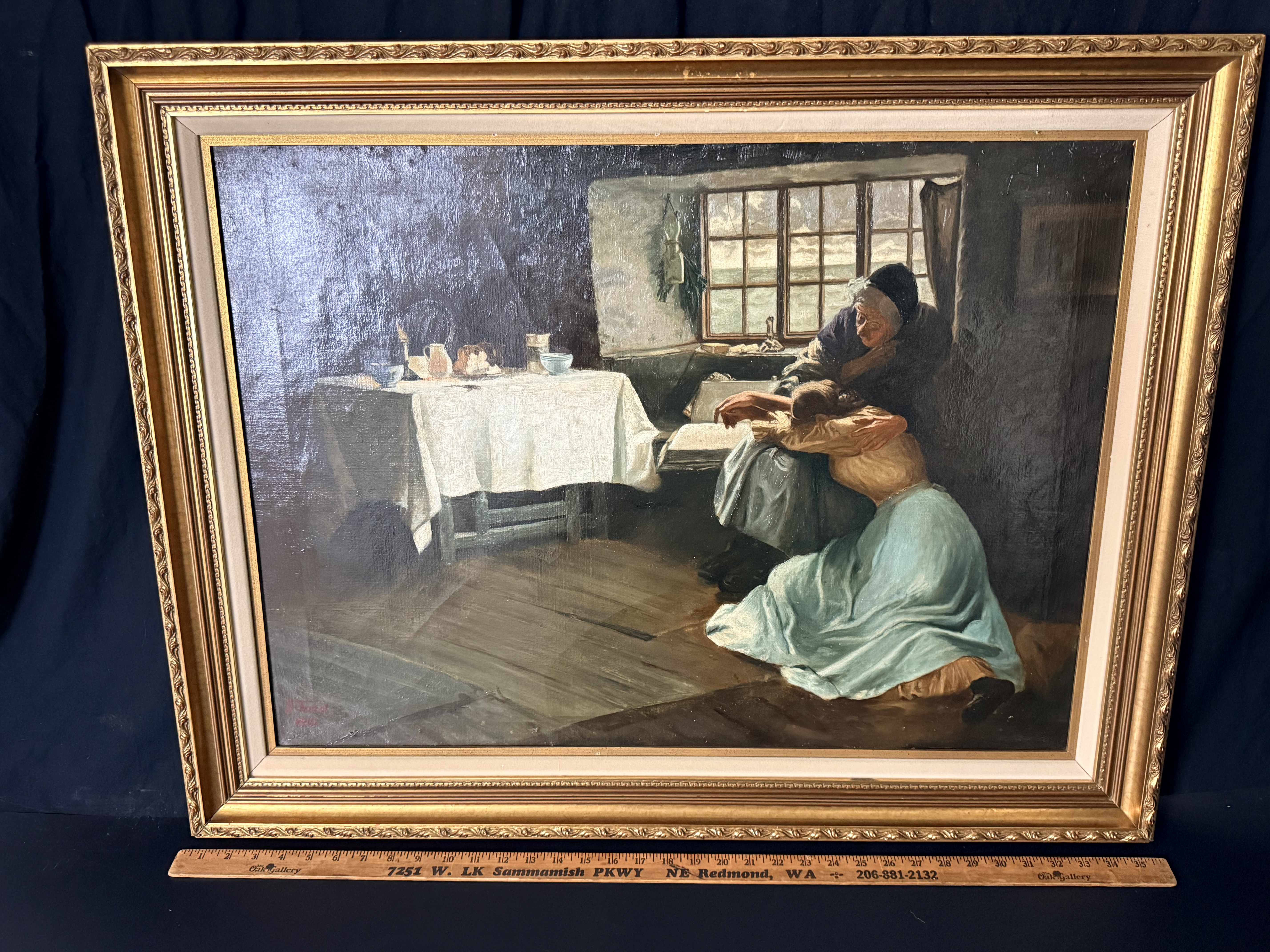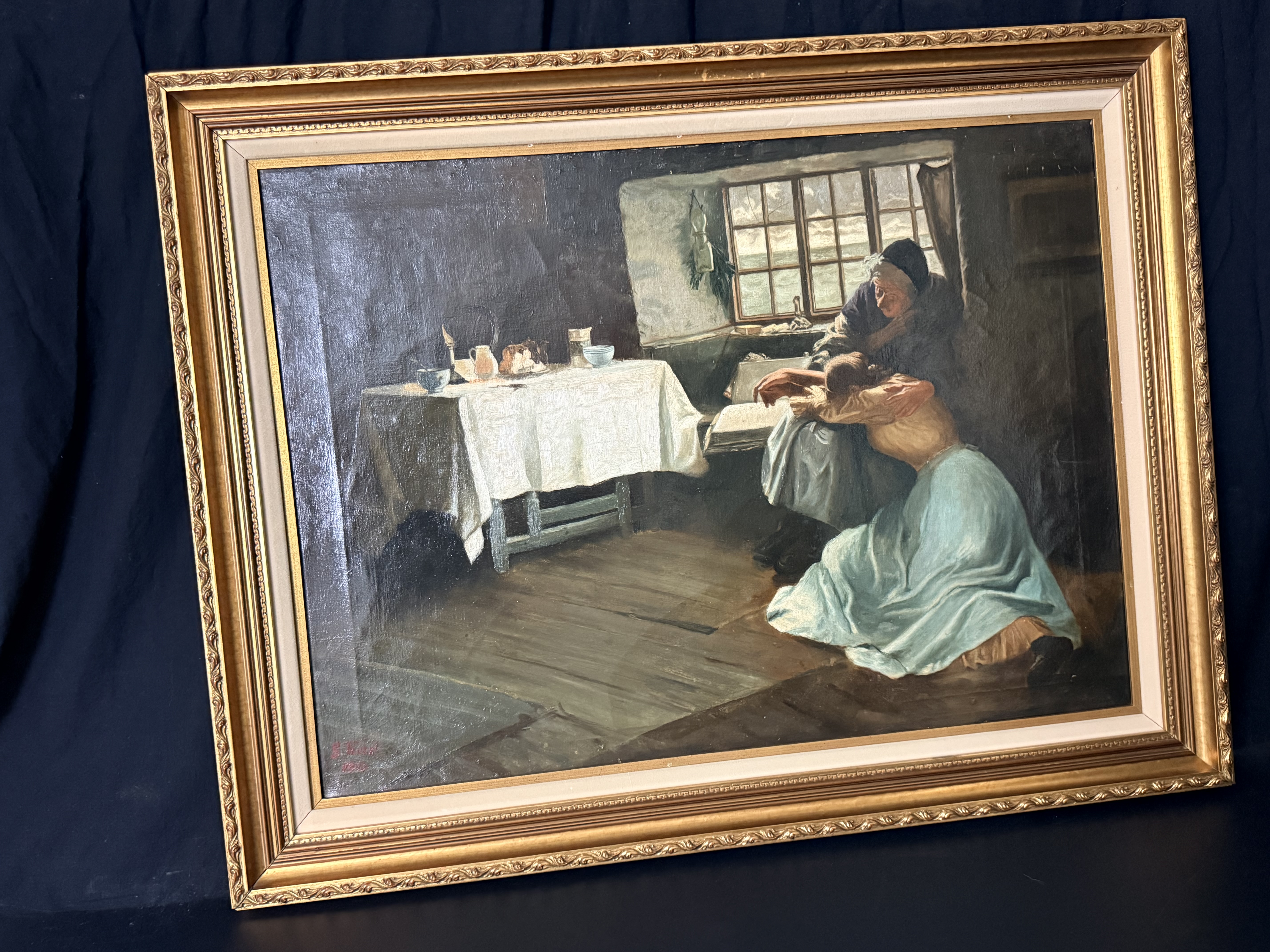 This oil painting on canvas depicts a realist genre scene set within an interior. The composition features an elderly woman seated by a window, consoling a younger woman who is kneeling with her head in the older woman’s lap. The background includes a wooden table covered with a white cloth and a meal. The work is signed S. Faust and dated 1910 in the lower-left corner. The painting is housed in a carved, gold-toned wooden frame with a linen liner. The reverse reveals a wooden stretcher with corner keys and a wire hanging mount. Staining and foxing are visible on the unprimed canvas back.