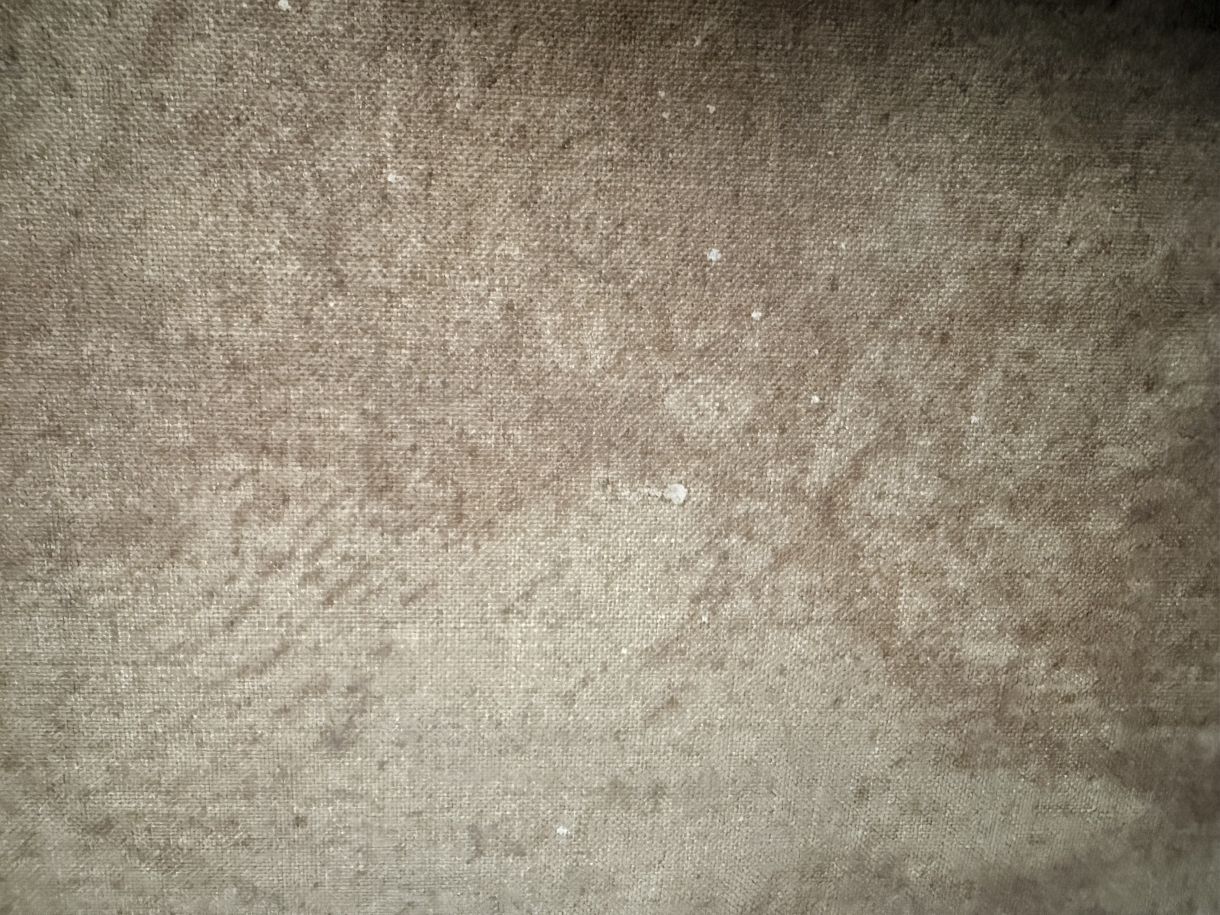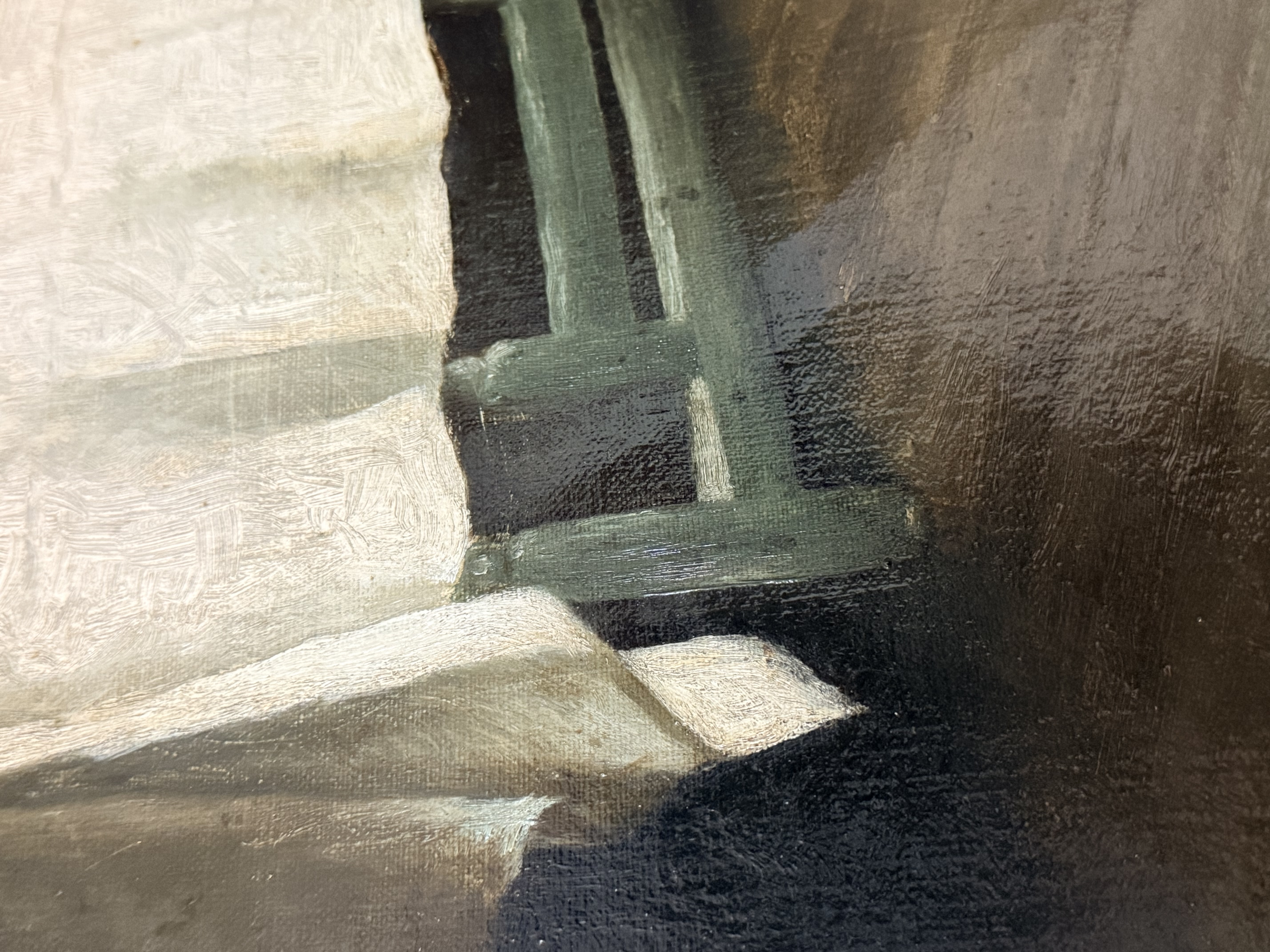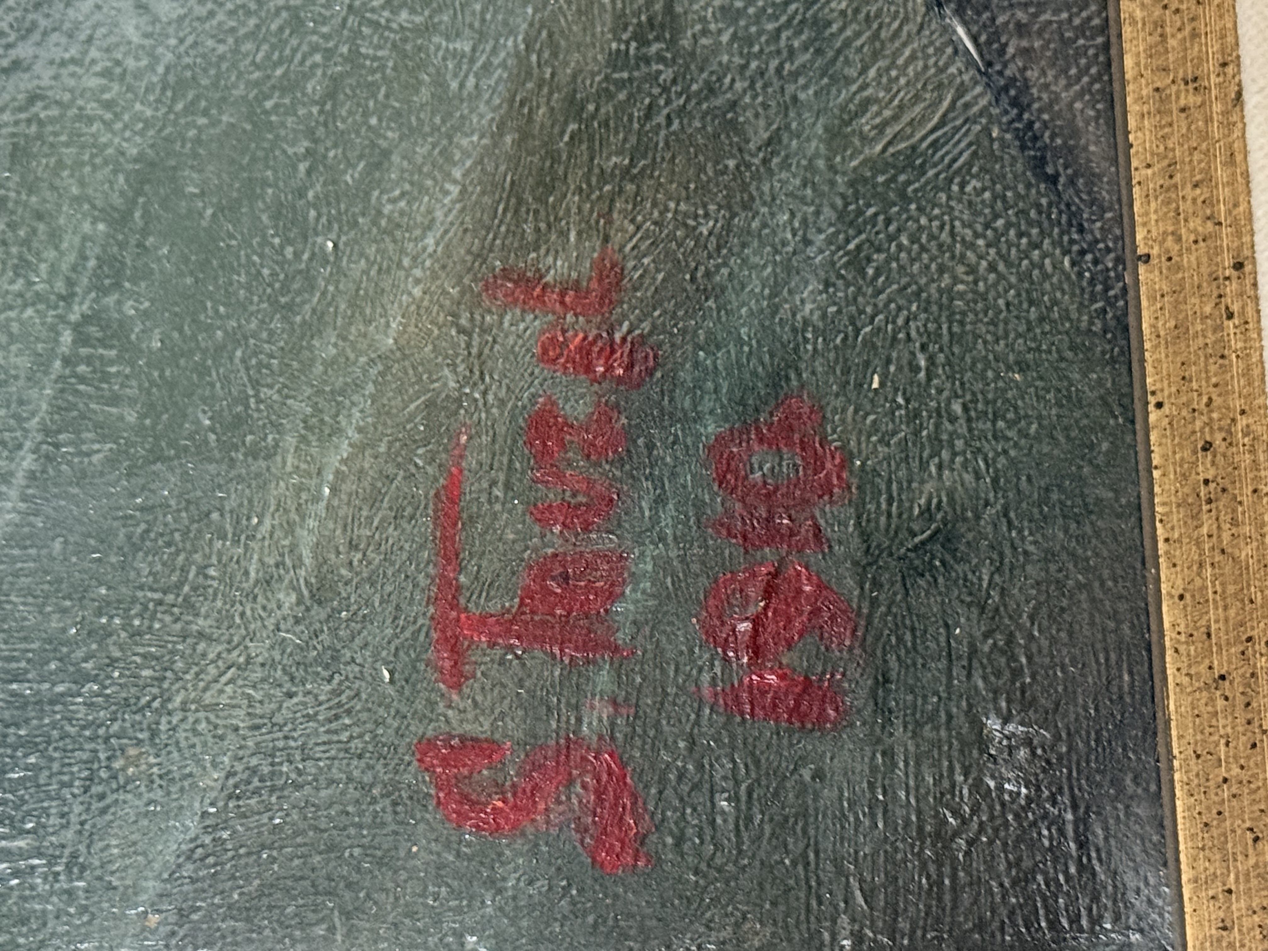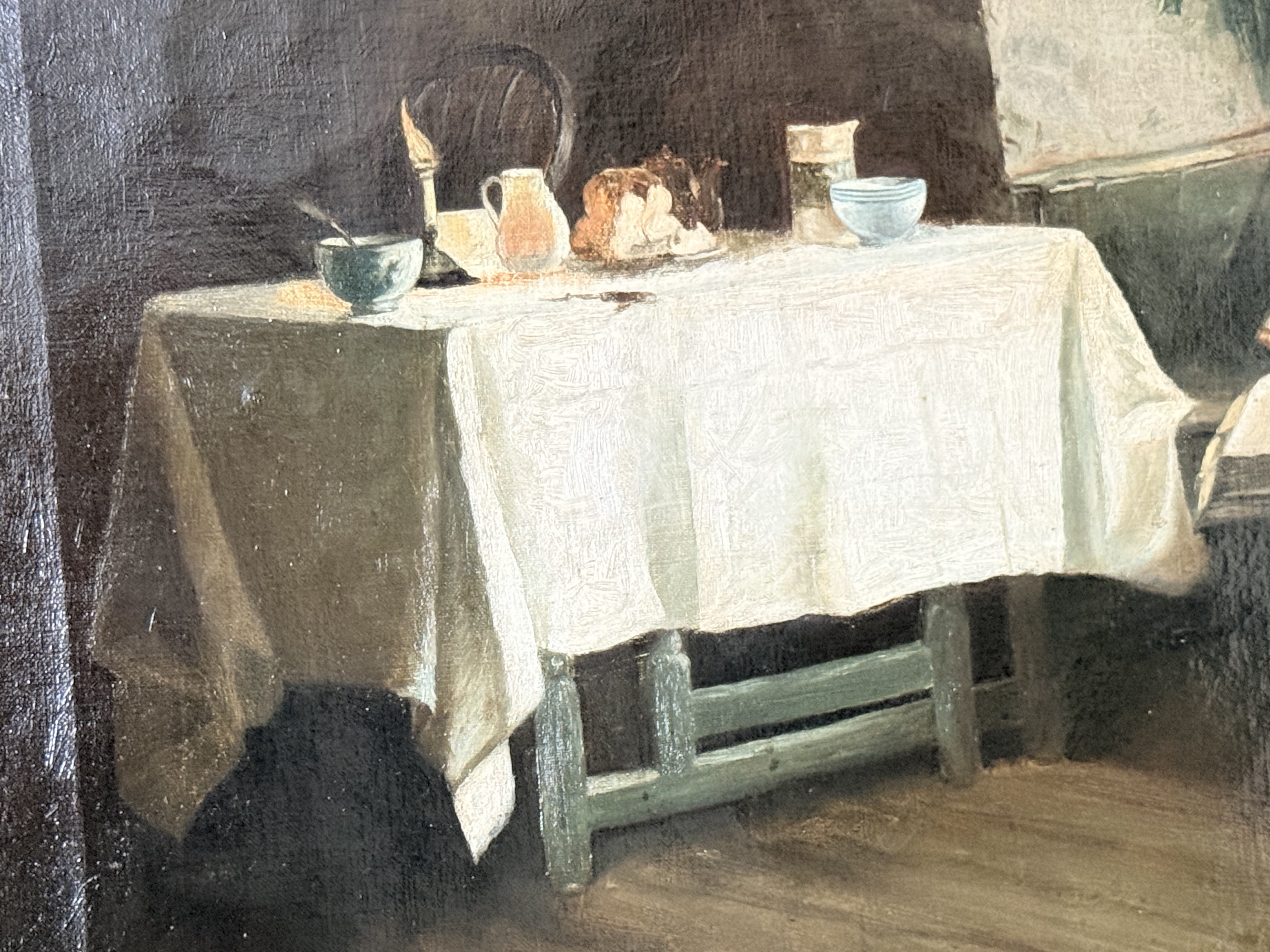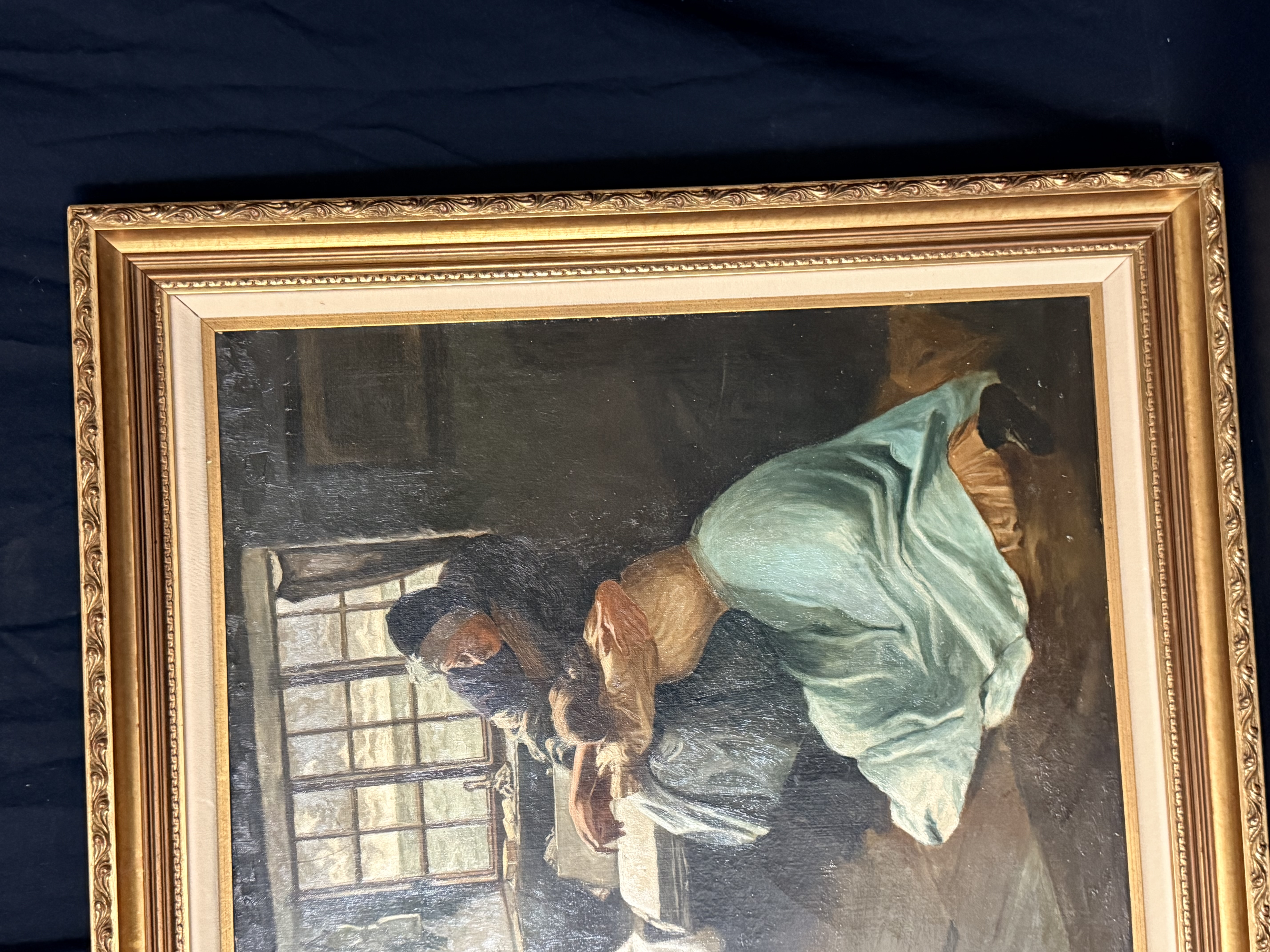 This oil painting on canvas depicts a realist genre scene set within an interior. The composition features an elderly woman seated by a window, consoling a younger woman who is kneeling with her head in the older woman’s lap. The background includes a wooden table covered with a white cloth and a meal. The work is signed S. Faust and dated 1910 in the lower-left corner. The painting is housed in a carved, gold-toned wooden frame with a linen liner. The reverse reveals a wooden stretcher with corner keys and a wire hanging mount. Staining and foxing are visible on the unprimed canvas back.