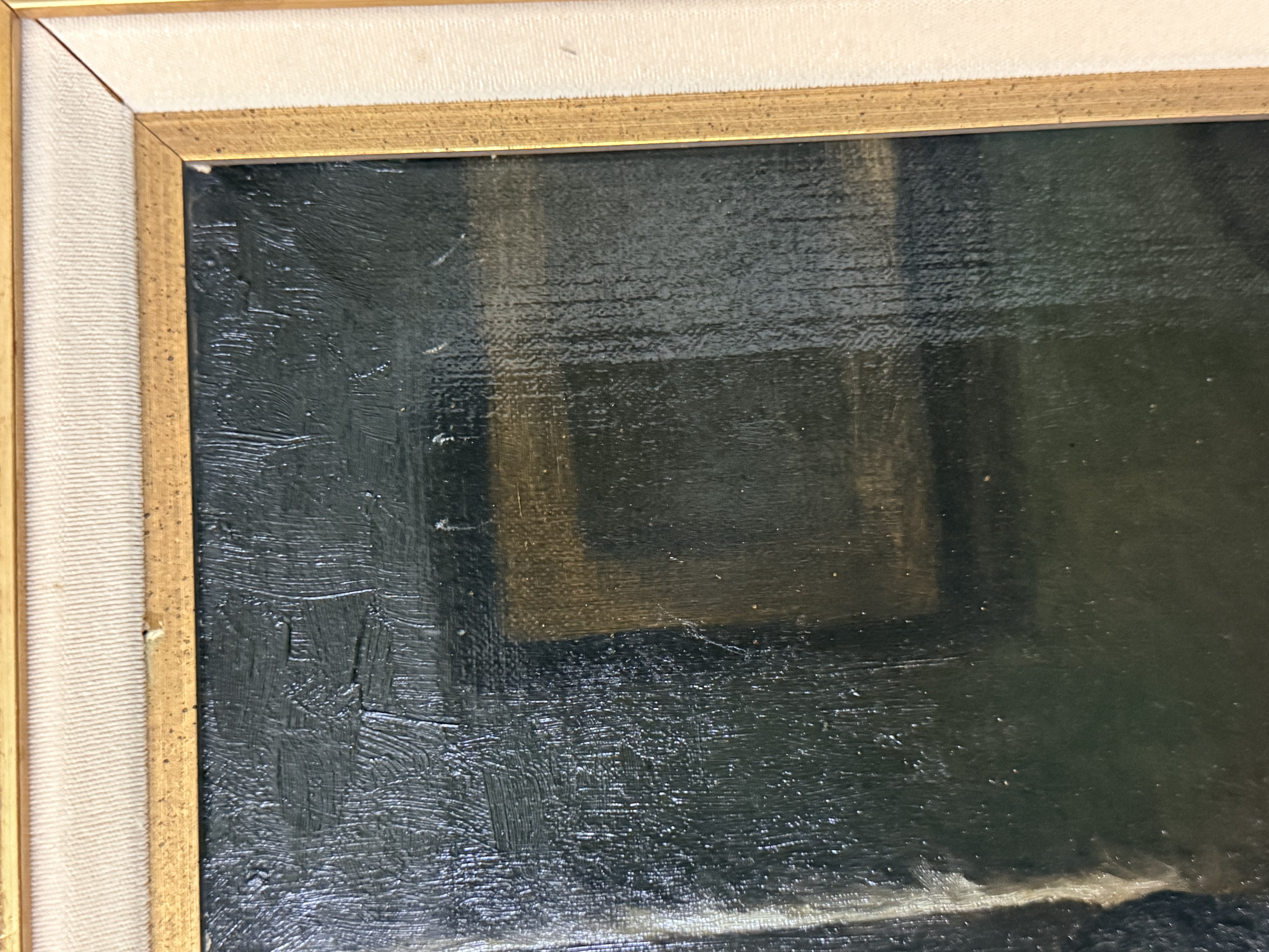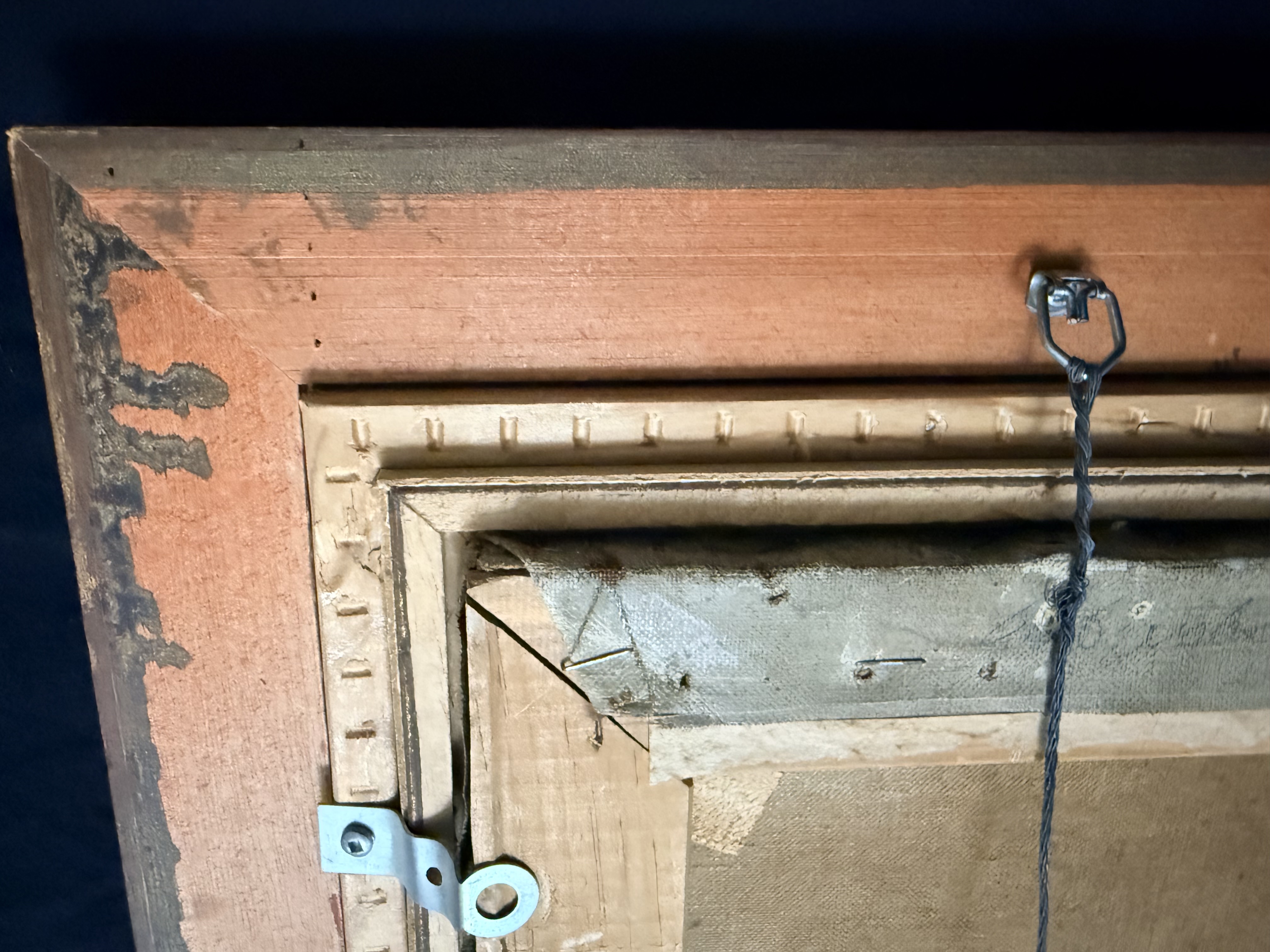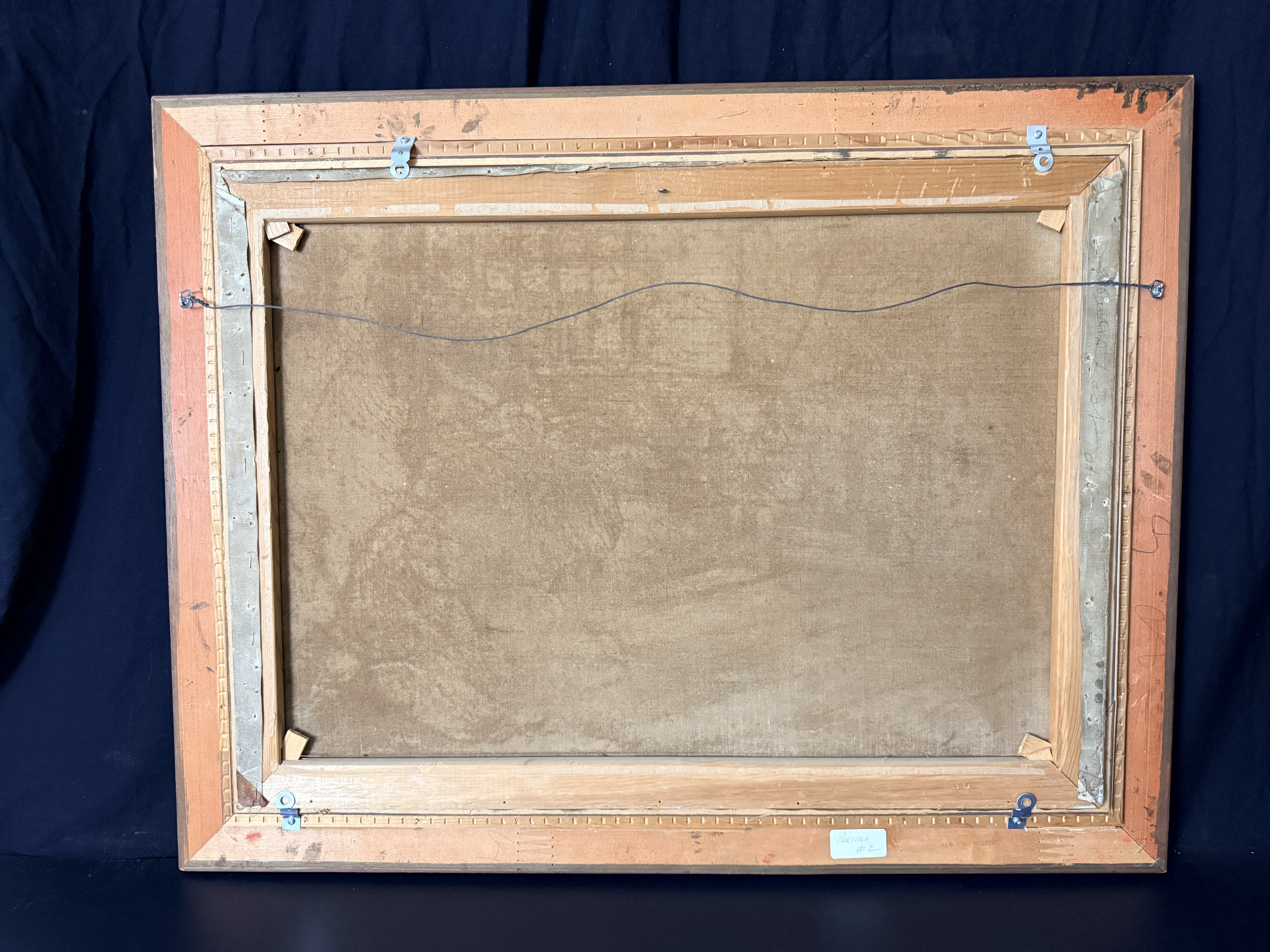 The paint surface exhibits fine craquelure and surface grime. The carved frame shows minor nicks and wear to the gilded finish. The unprimed canvas on the reverse displays light staining and foxing. See images for condition. Art is from a clean smoke free home.