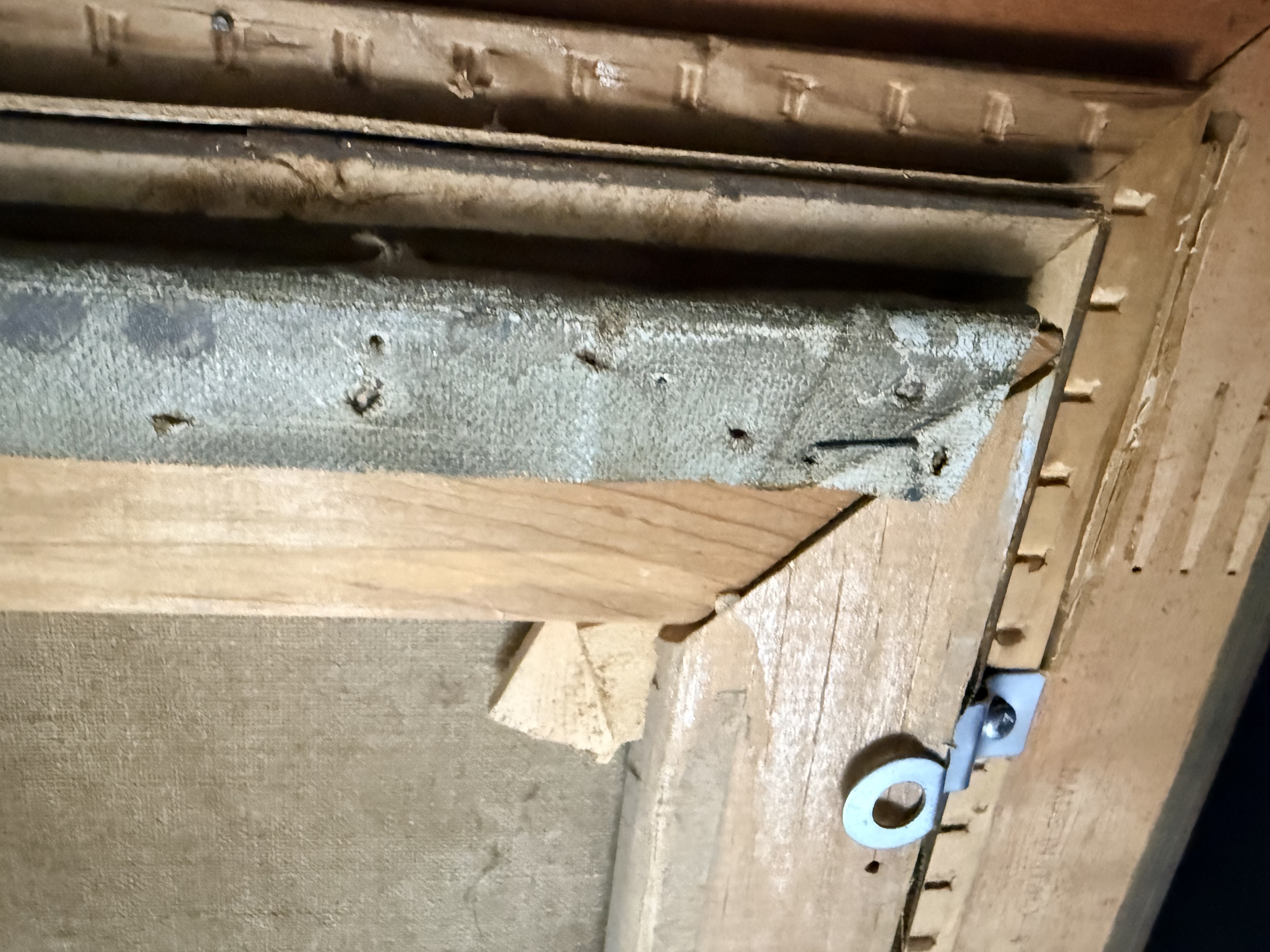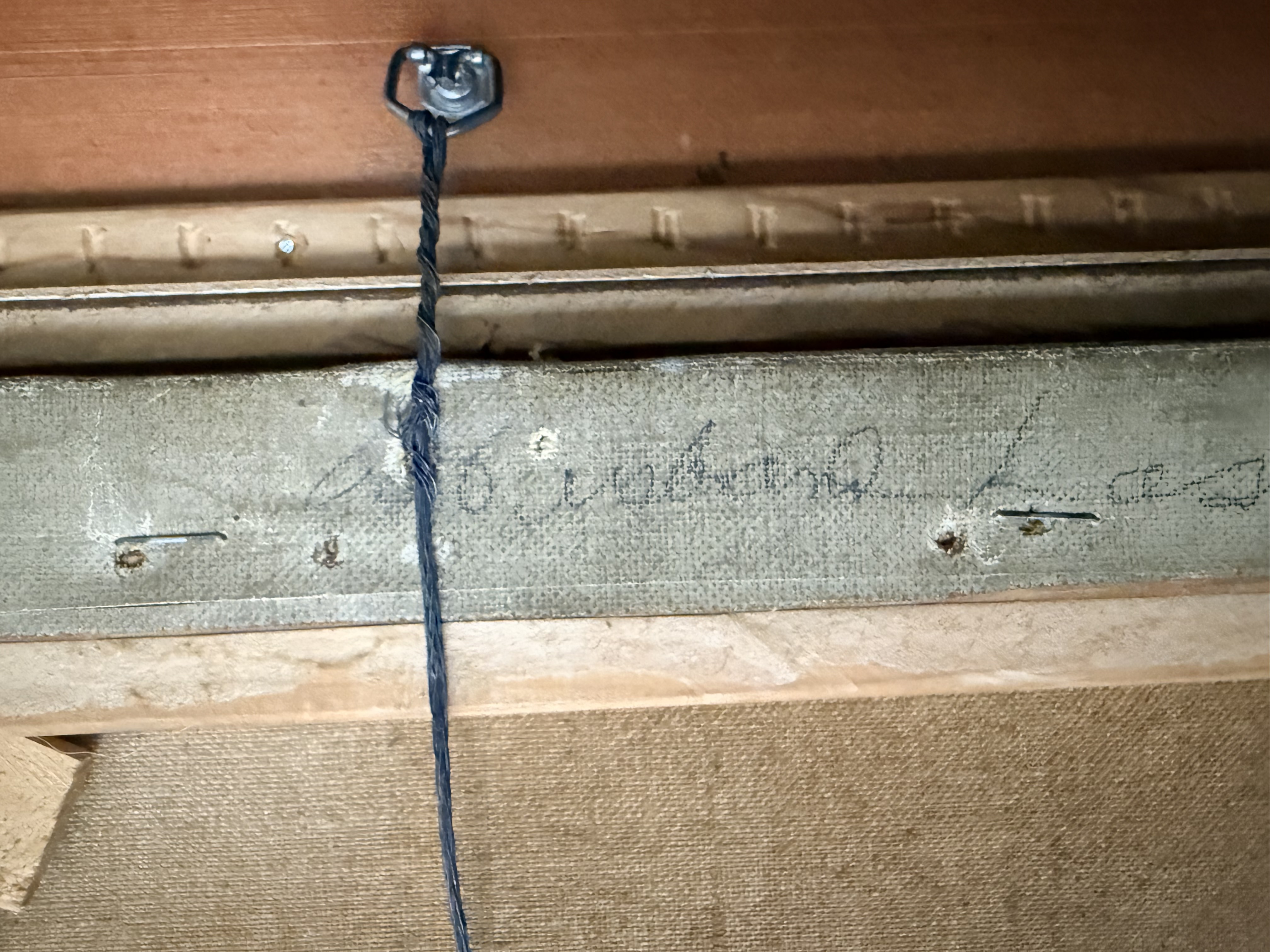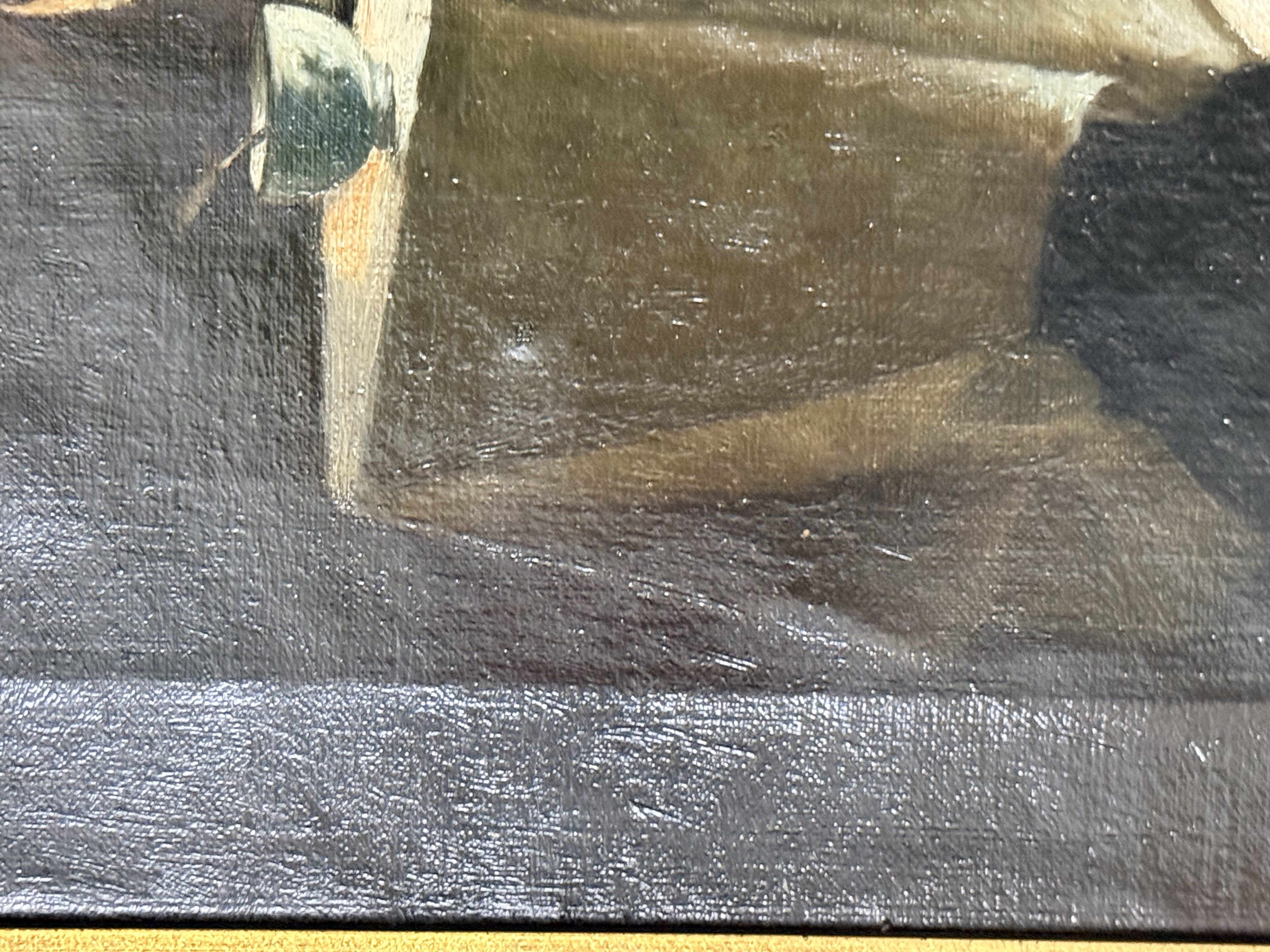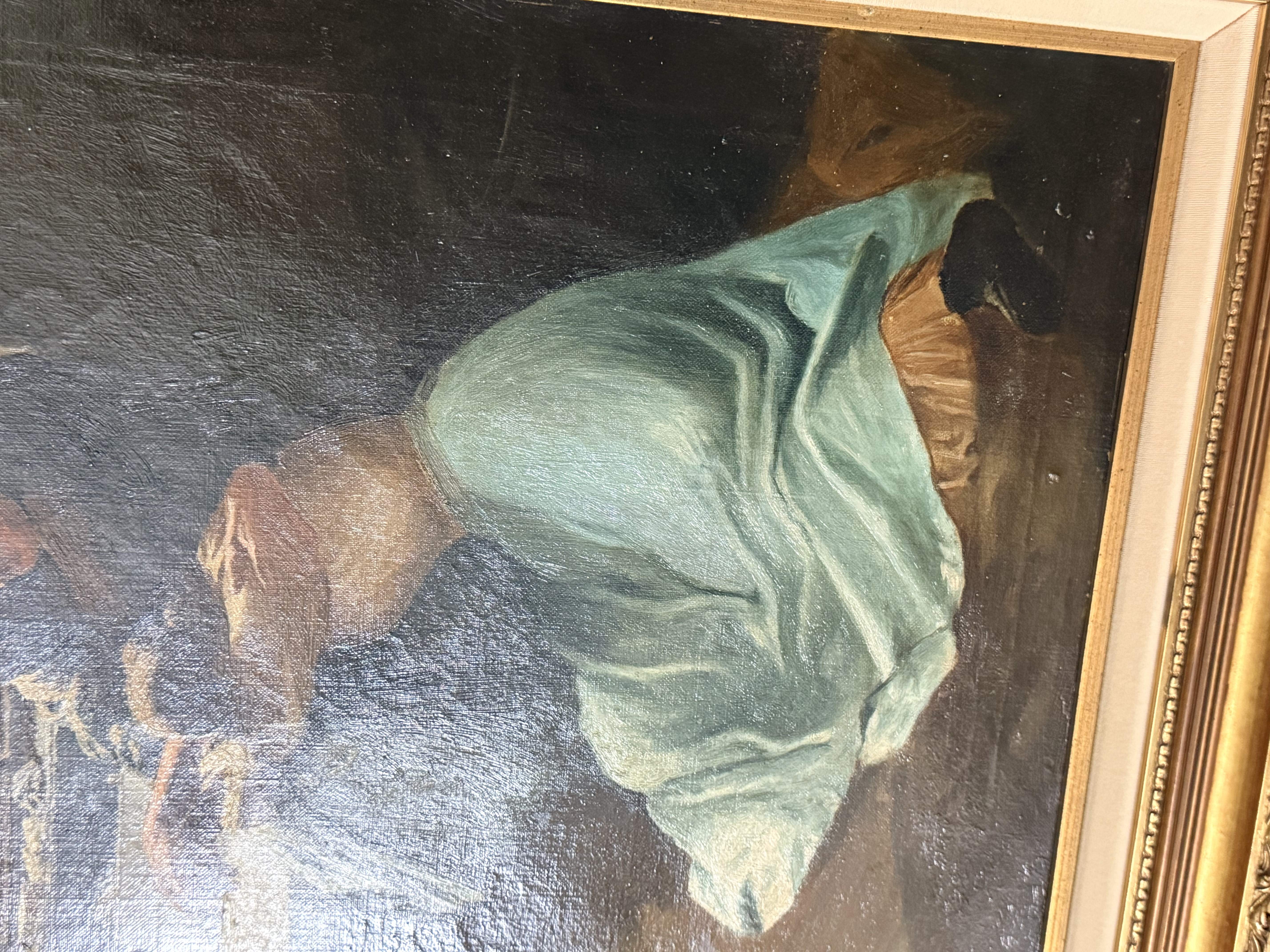 The paint surface exhibits fine craquelure and surface grime. The carved frame shows minor nicks and wear to the gilded finish. The unprimed canvas on the reverse displays light staining and foxing. See images for condition. Art is from a clean smoke free home.
