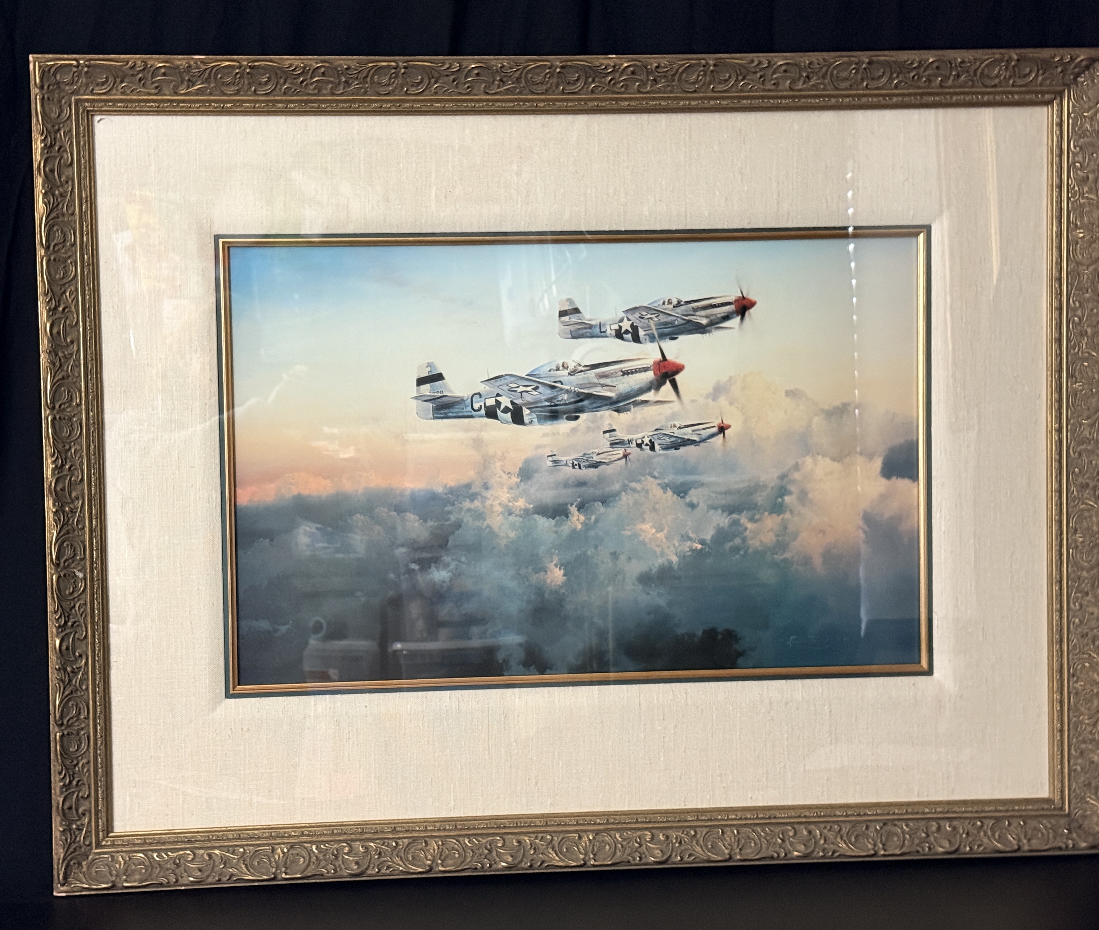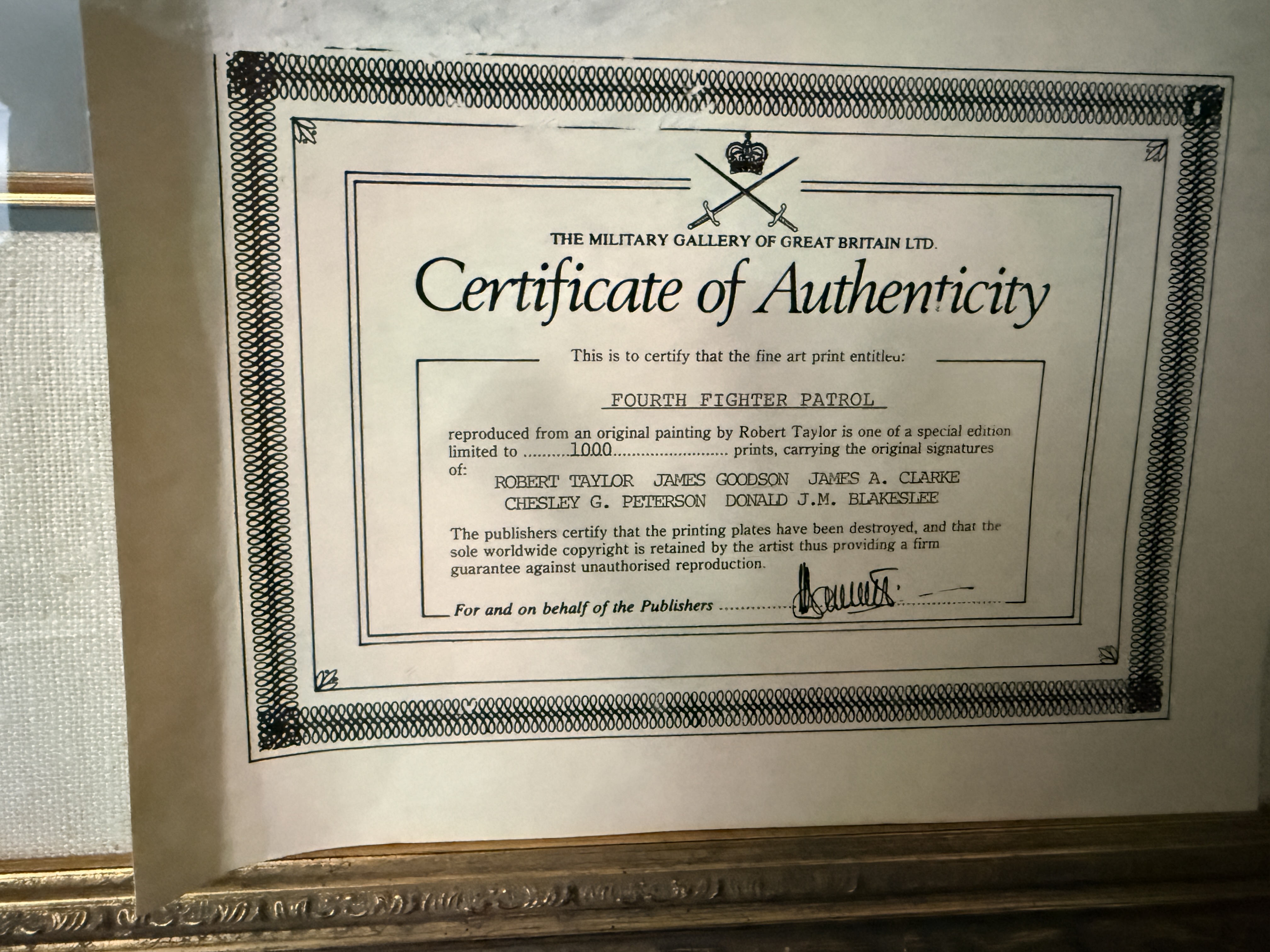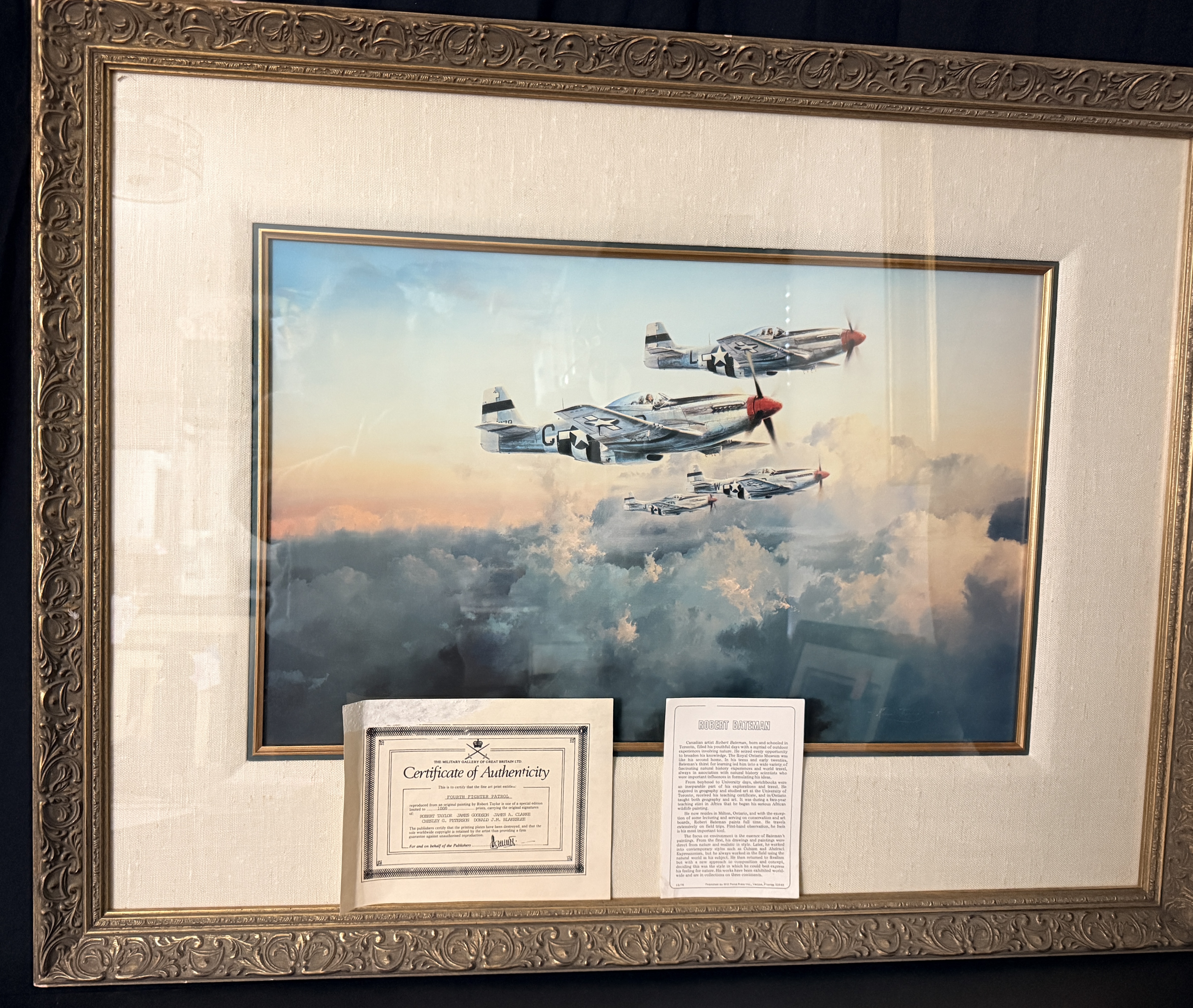 A framed limited edition aviation print titled Fourth Fighter Patrol by artist Robert Taylor, depicting four North American P-51 Mustang aircraft in flight above a cloud layer at sunset. The print is signed in pencil along the lower margin by the artist and four World War II pilots: James Goodson, James A. Clarke, Chesley G. Peterson, and Donald J.M. Blakeslee. This work is part of a special edition limited to 1,000 copies. The print is housed in a gilt-finished molded frame with a linen-textured matting under Tru Vue Conservation Glass. Included documentation consists of a Certificate of Authenticity from The Military Gallery of Great Britain Ltd., a gallery card from Howard/Mandville Gallery, and a biographical insert for Robert Bateman.