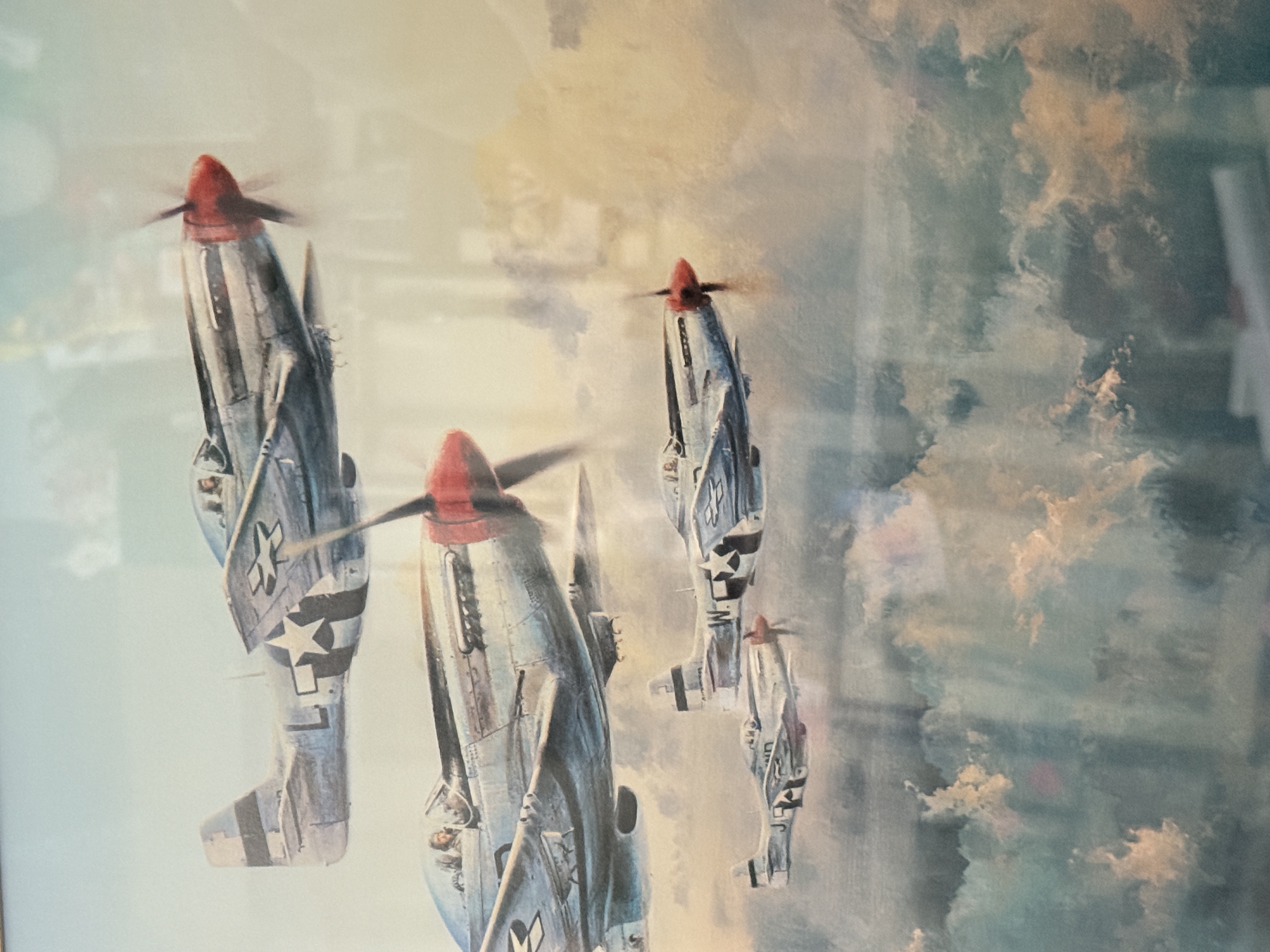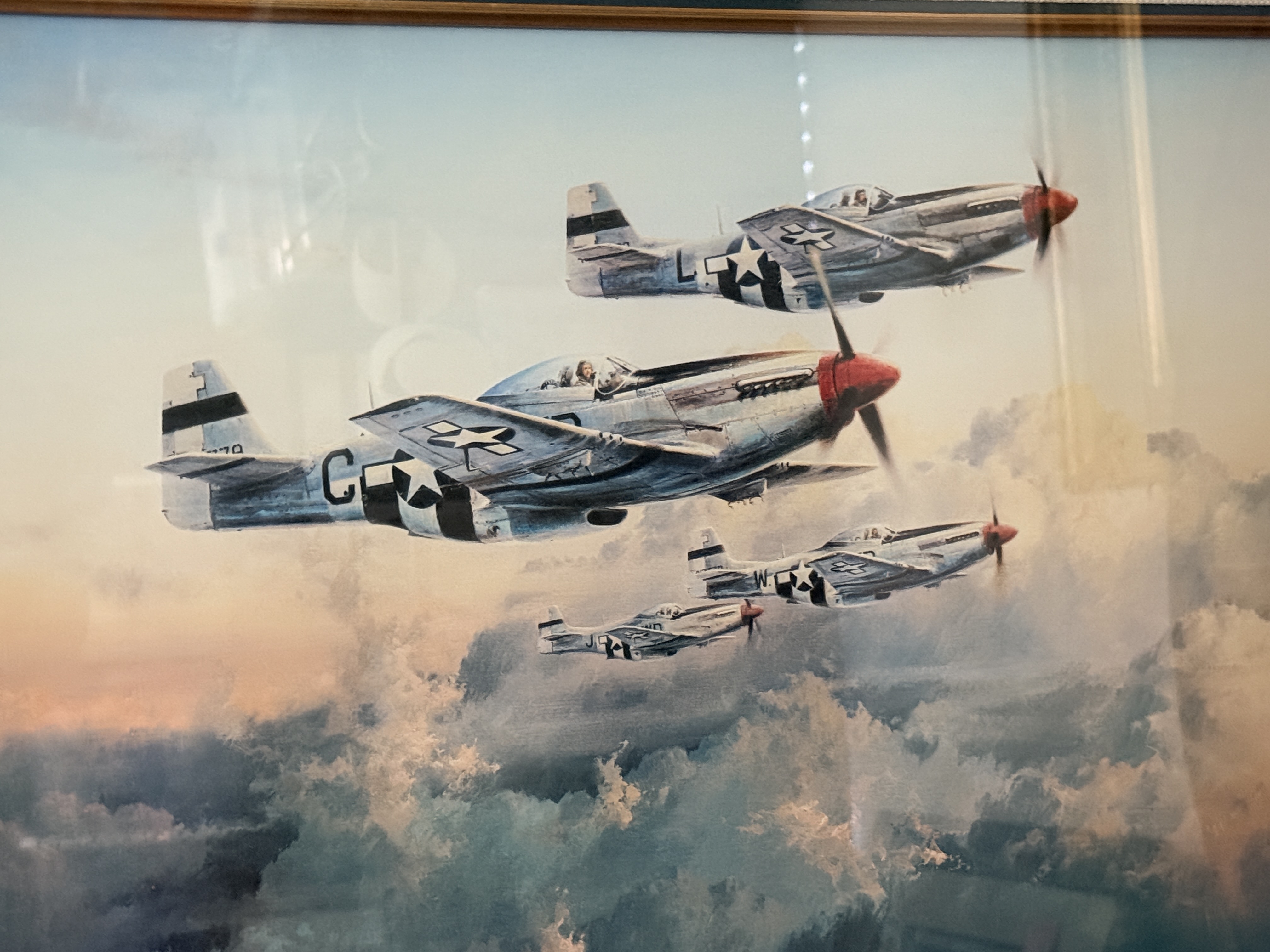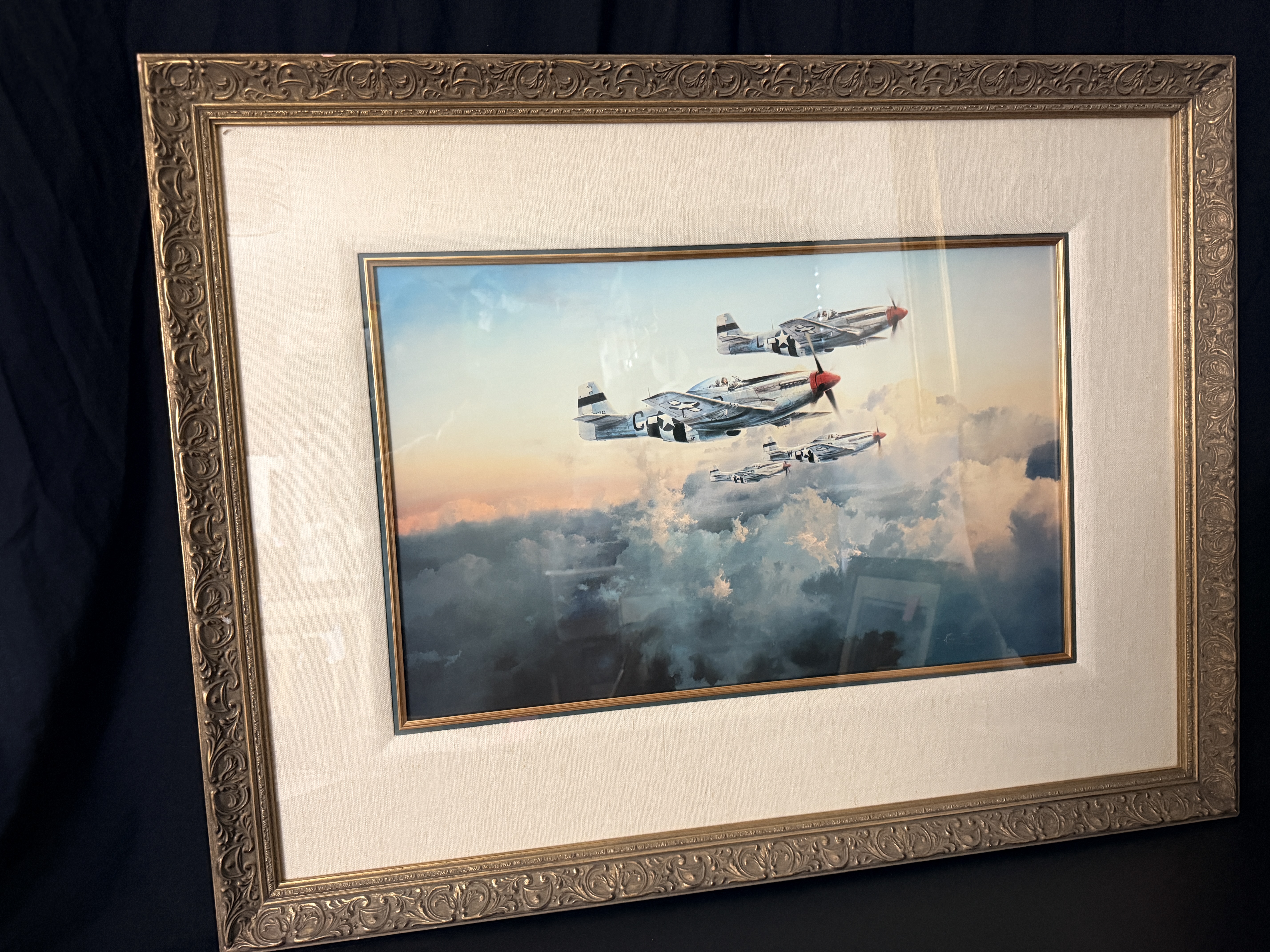 A framed limited edition aviation print titled Fourth Fighter Patrol by artist Robert Taylor, depicting four North American P-51 Mustang aircraft in flight above a cloud layer at sunset. The print is signed in pencil along the lower margin by the artist and four World War II pilots: James Goodson, James A. Clarke, Chesley G. Peterson, and Donald J.M. Blakeslee. This work is part of a special edition limited to 1,000 copies. The print is housed in a gilt-finished molded frame with a linen-textured matting under Tru Vue Conservation Glass. Included documentation consists of a Certificate of Authenticity from The Military Gallery of Great Britain Ltd., a gallery card from Howard/Mandville Gallery, and a biographical insert for Robert Bateman.
