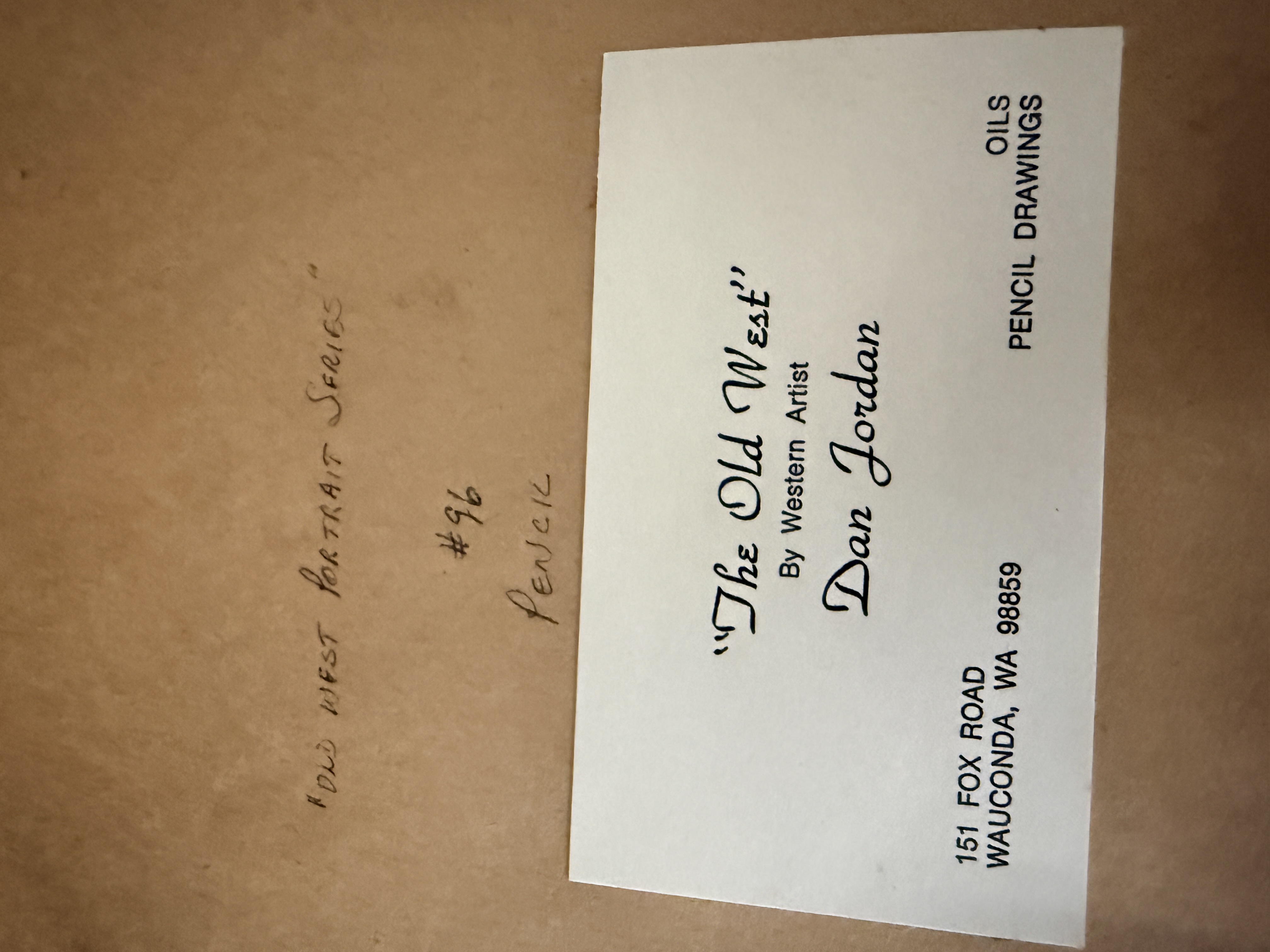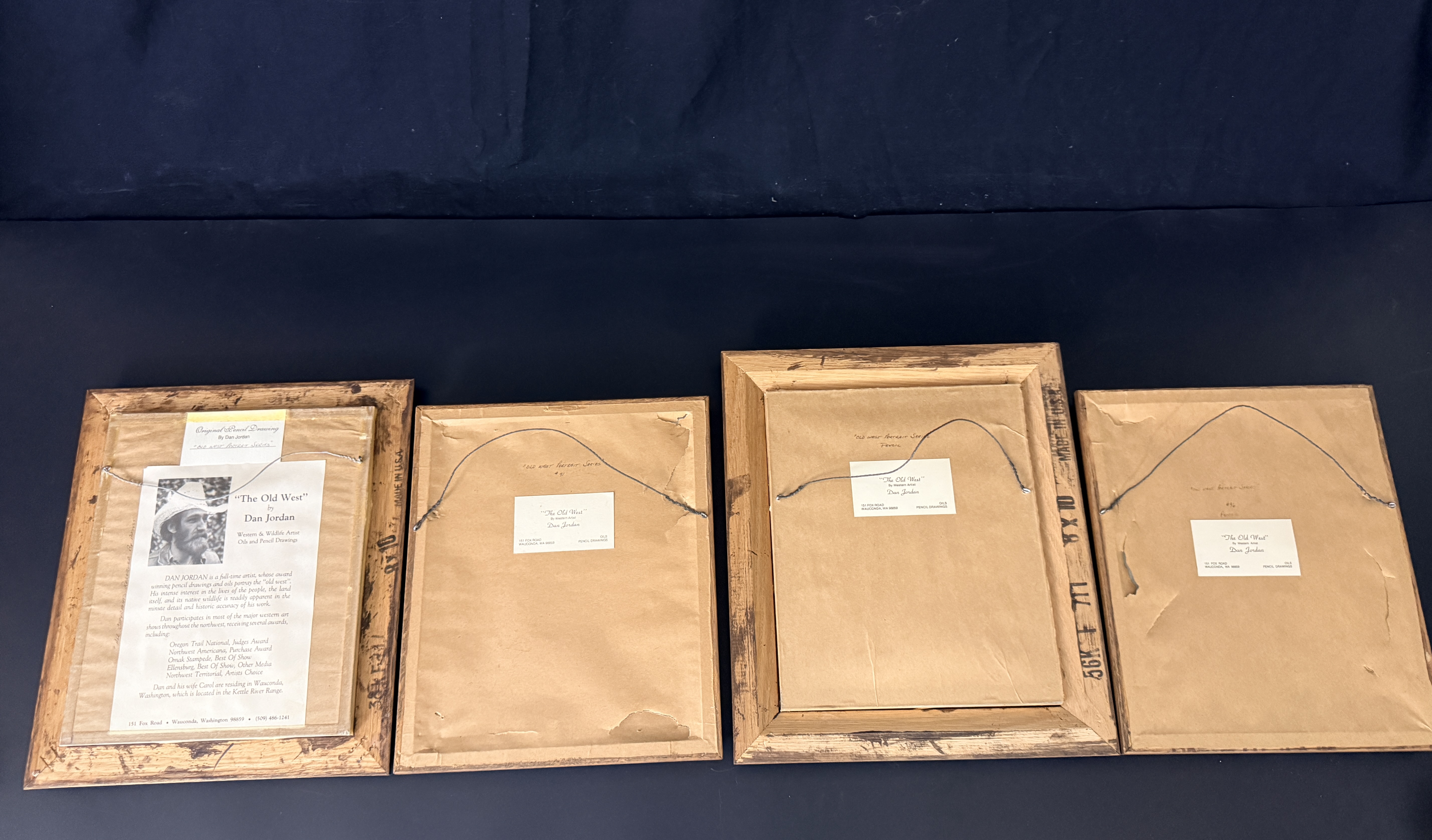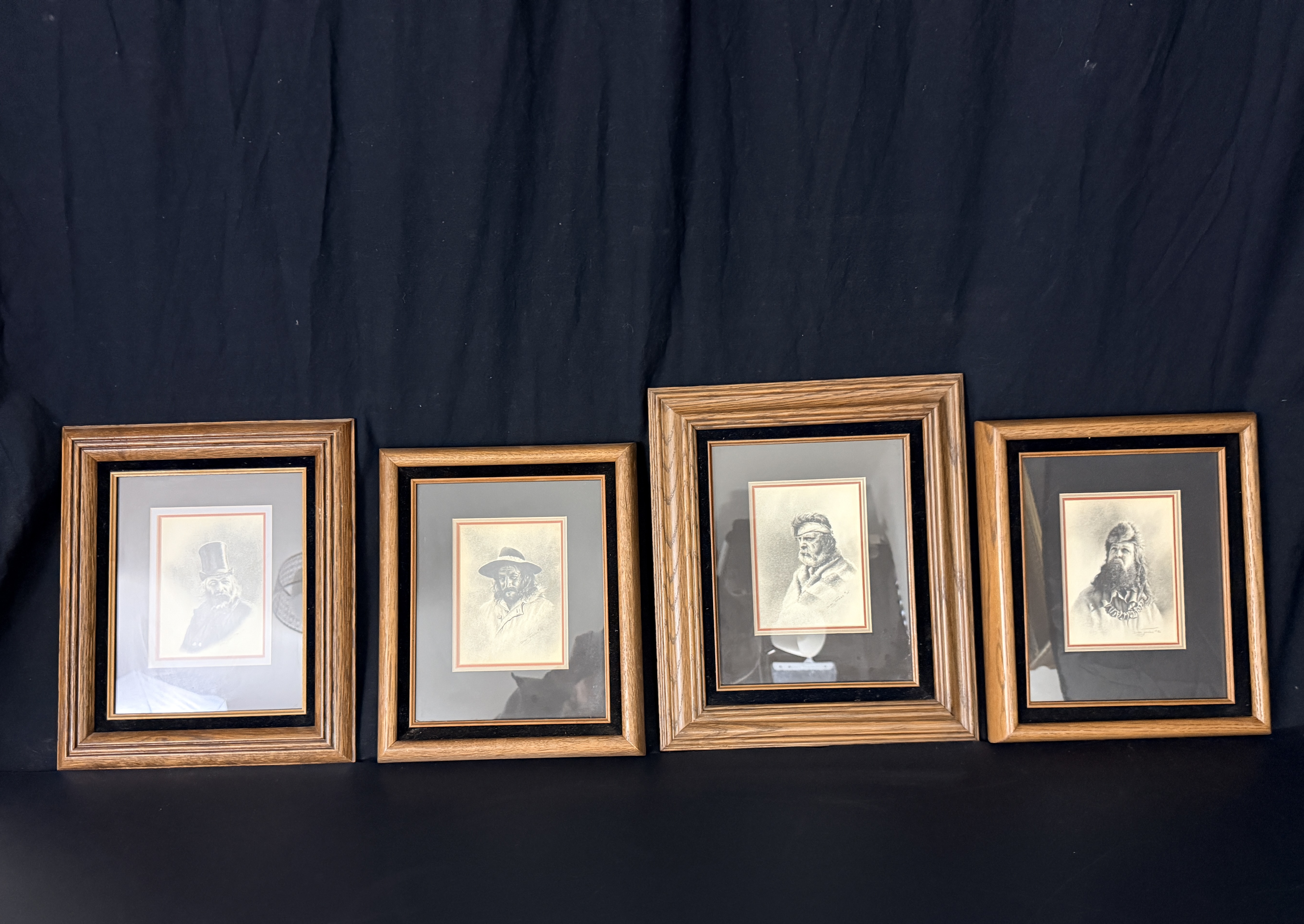 A collection of original pencil drawings on paper by Western artist Dan Jordan, from The Old West portrait series. The works consist of character studies depicting men in historical frontier attire, including a figure in a top hat, a figure in a wide-brimmed hat, a figure with a headband, and a figure wearing a fur hat with a grizzly claw necklace. Each drawing is signed and dated by the artist, with visible dates including 1976, 1983, 1984, and 1986. The drawings are professionally matted using a triple-mat system featuring a red-accented white mat and a secondary black velvet mat. The collection is housed in stepped oak-finish wood frames under glass. The reverse of the frames includes printed biographical information about the artist and series labels identifying the works as part of the Old West Portrait Series.