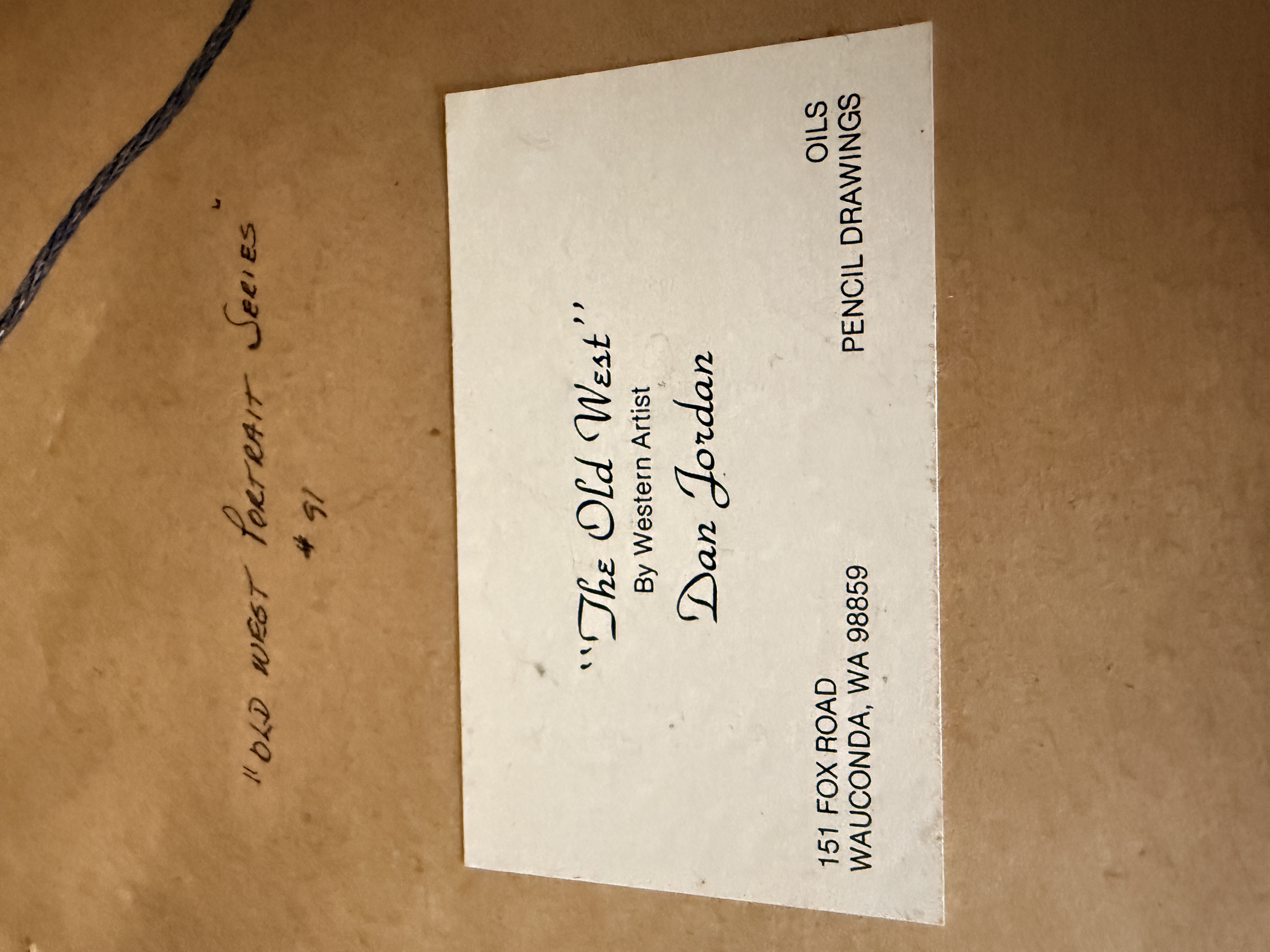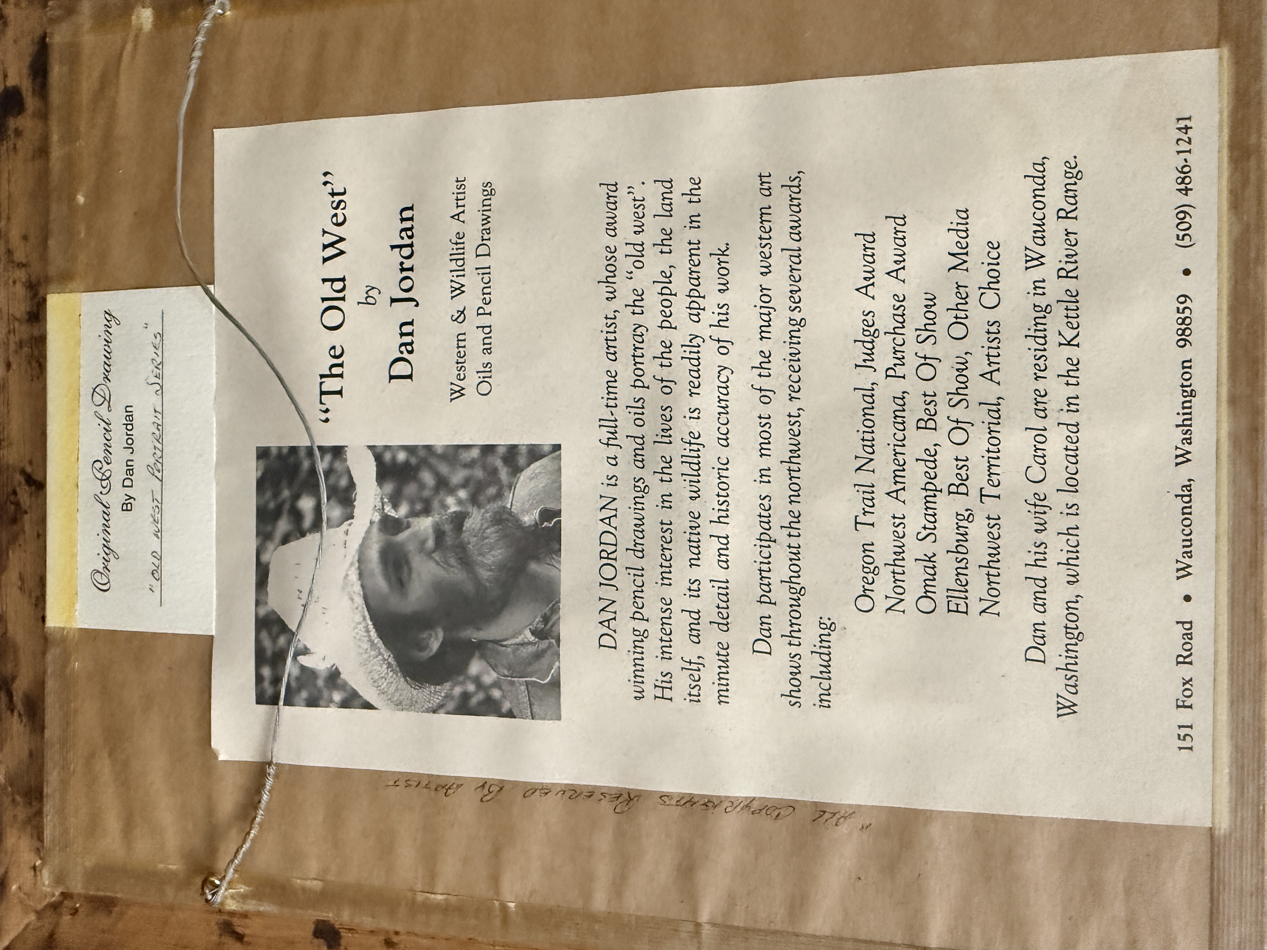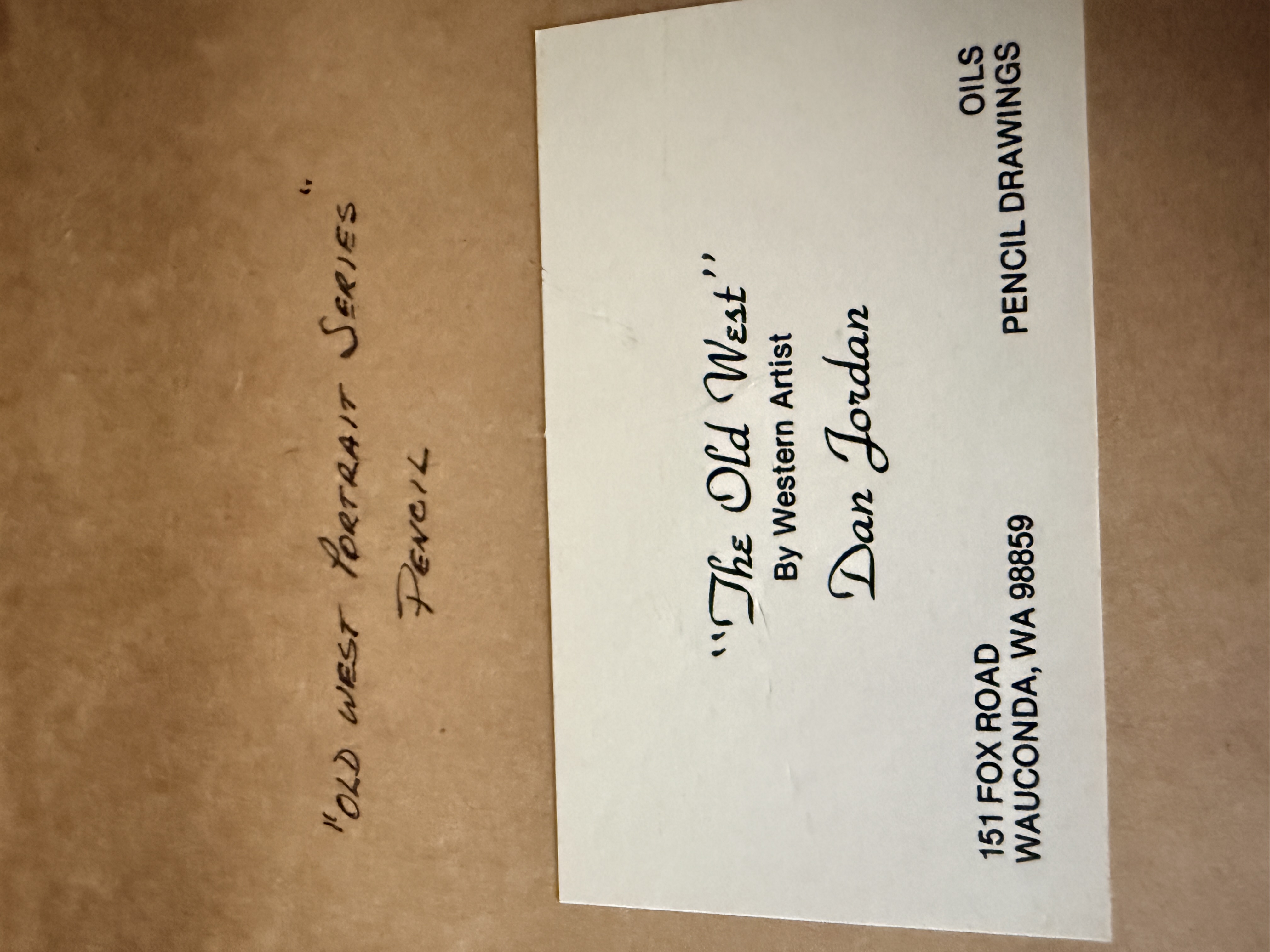 A collection of original pencil drawings on paper by Western artist Dan Jordan, from The Old West portrait series. The works consist of character studies depicting men in historical frontier attire, including a figure in a top hat, a figure in a wide-brimmed hat, a figure with a headband, and a figure wearing a fur hat with a grizzly claw necklace. Each drawing is signed and dated by the artist, with visible dates including 1976, 1983, 1984, and 1986. The drawings are professionally matted using a triple-mat system featuring a red-accented white mat and a secondary black velvet mat. The collection is housed in stepped oak-finish wood frames under glass. The reverse of the frames includes printed biographical information about the artist and series labels identifying the works as part of the Old West Portrait Series.