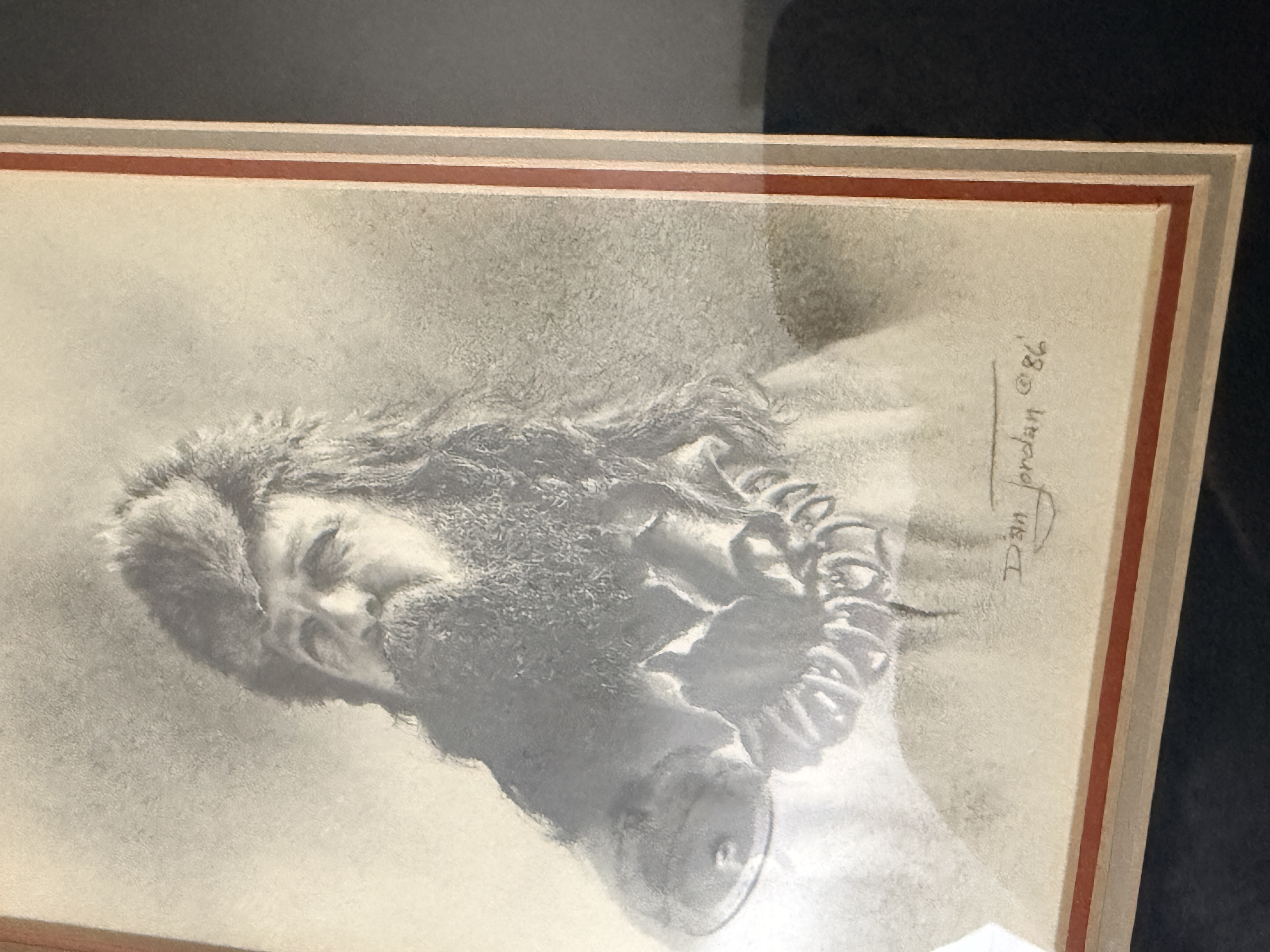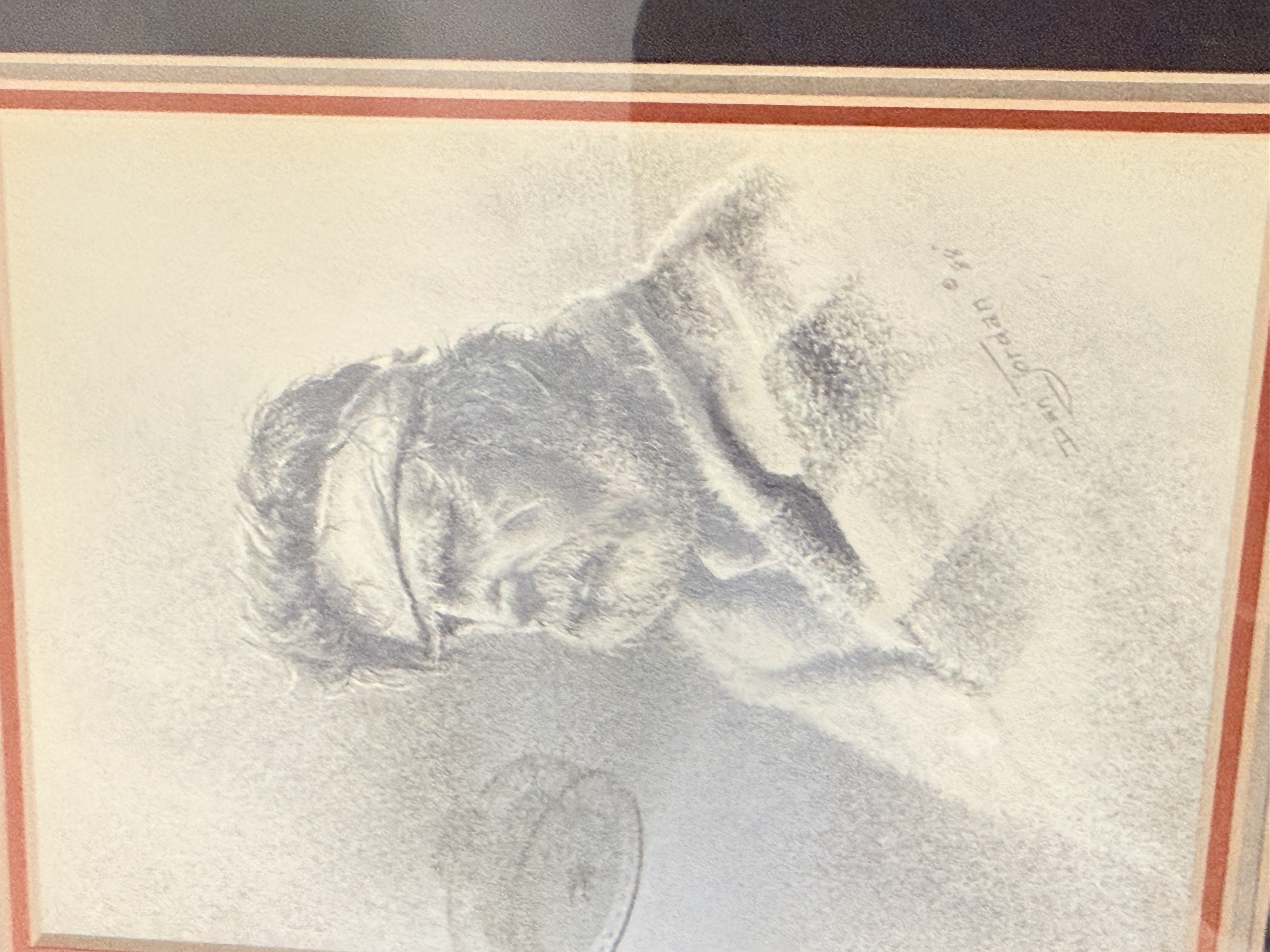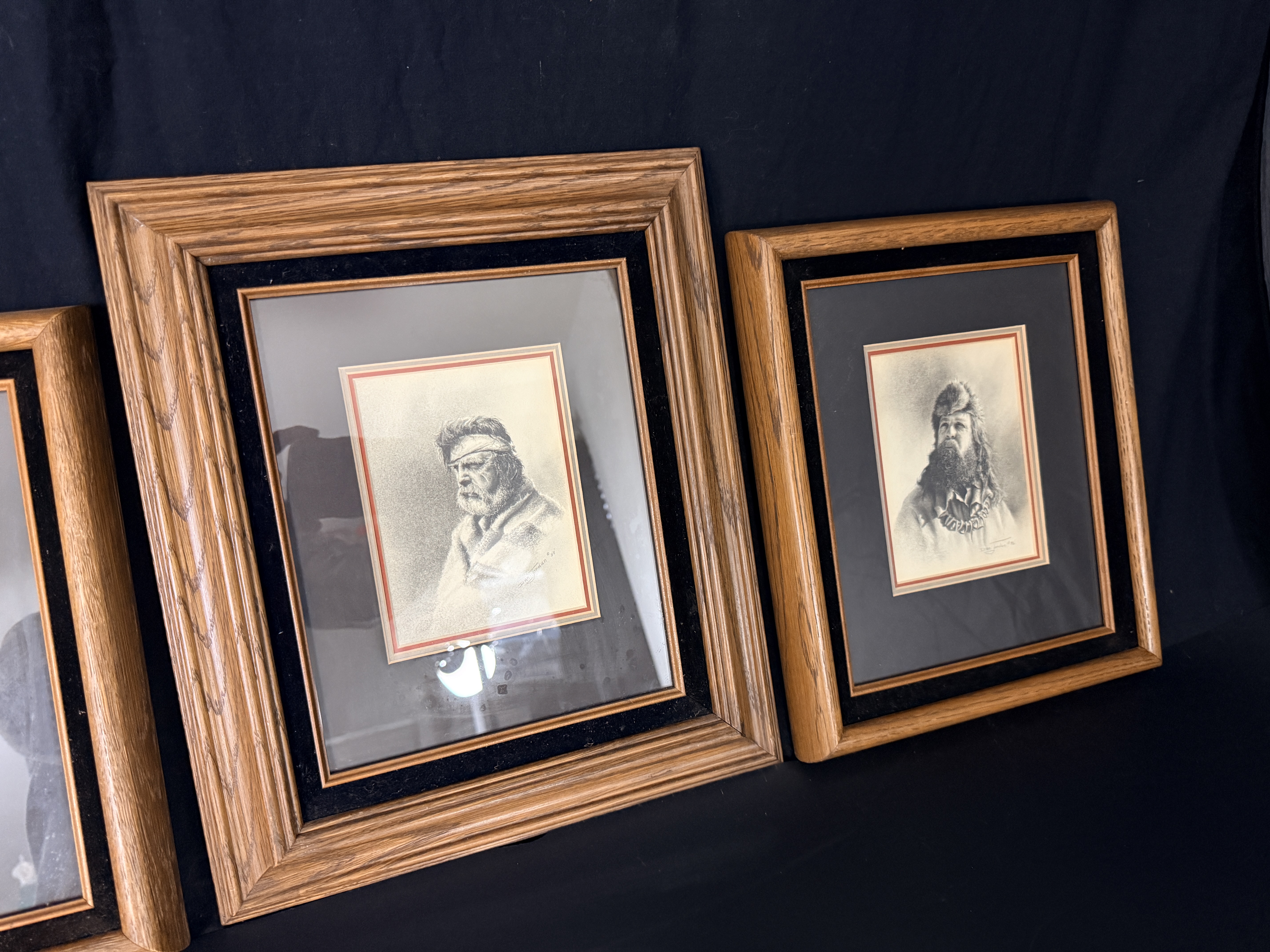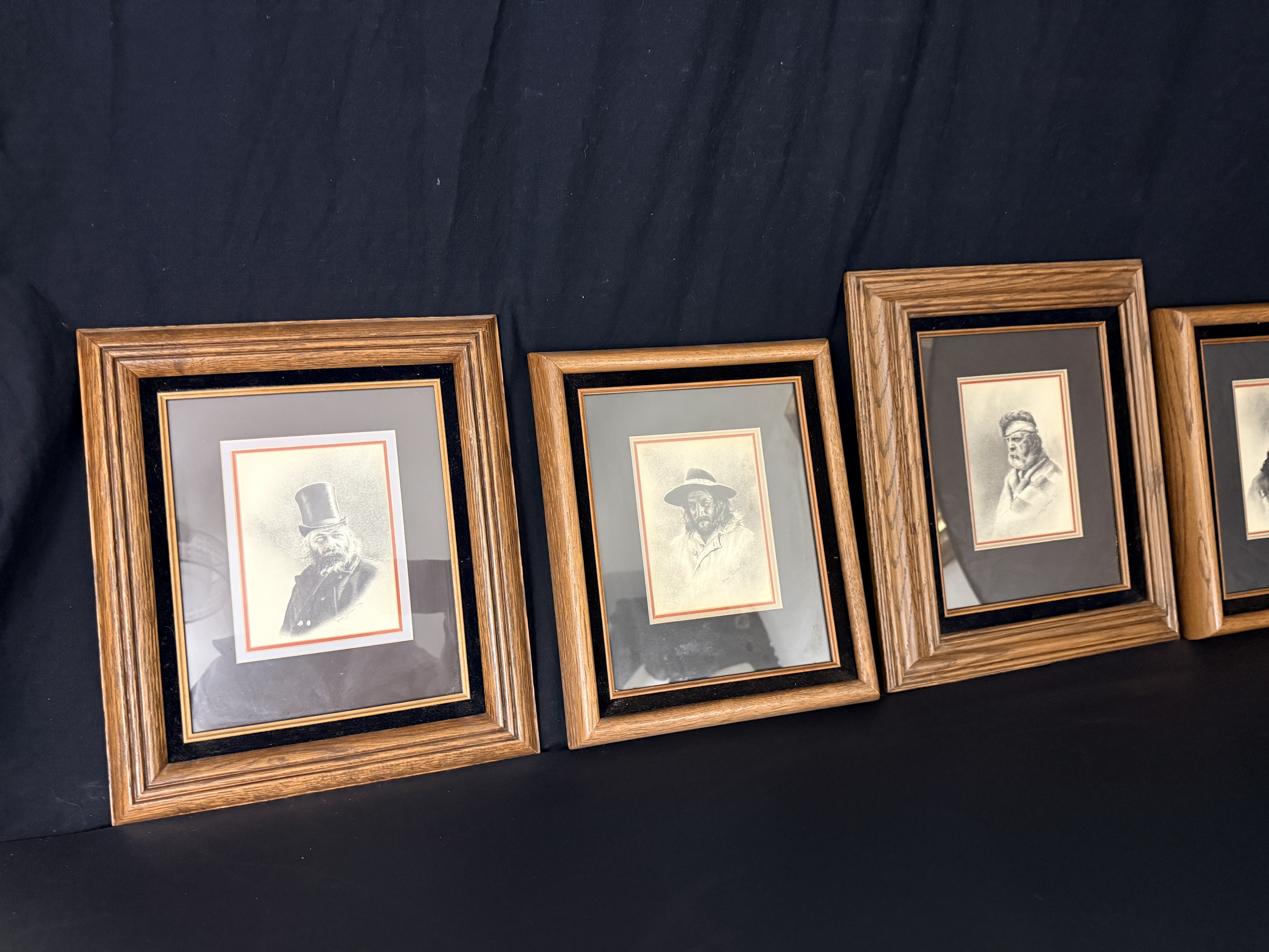 The collection is in good overall condition. The drawings and mats appear well-preserved under glass. The wood frames show minor surface wear and light scuffing consistent with age. The paper dust covers on the reverse of the frames exhibit some minor tearing and shelf wear. Art is from a clean smoke free home.