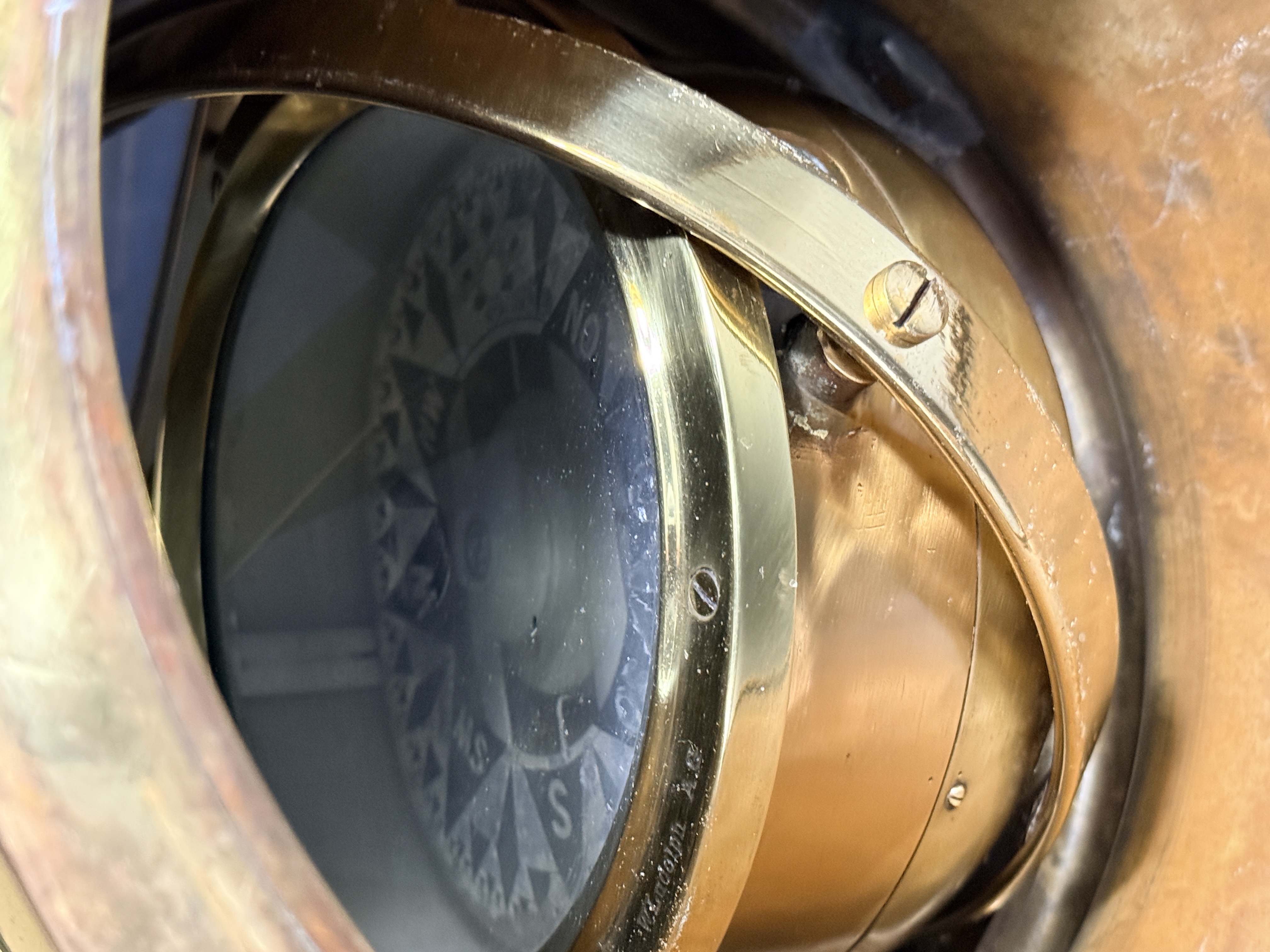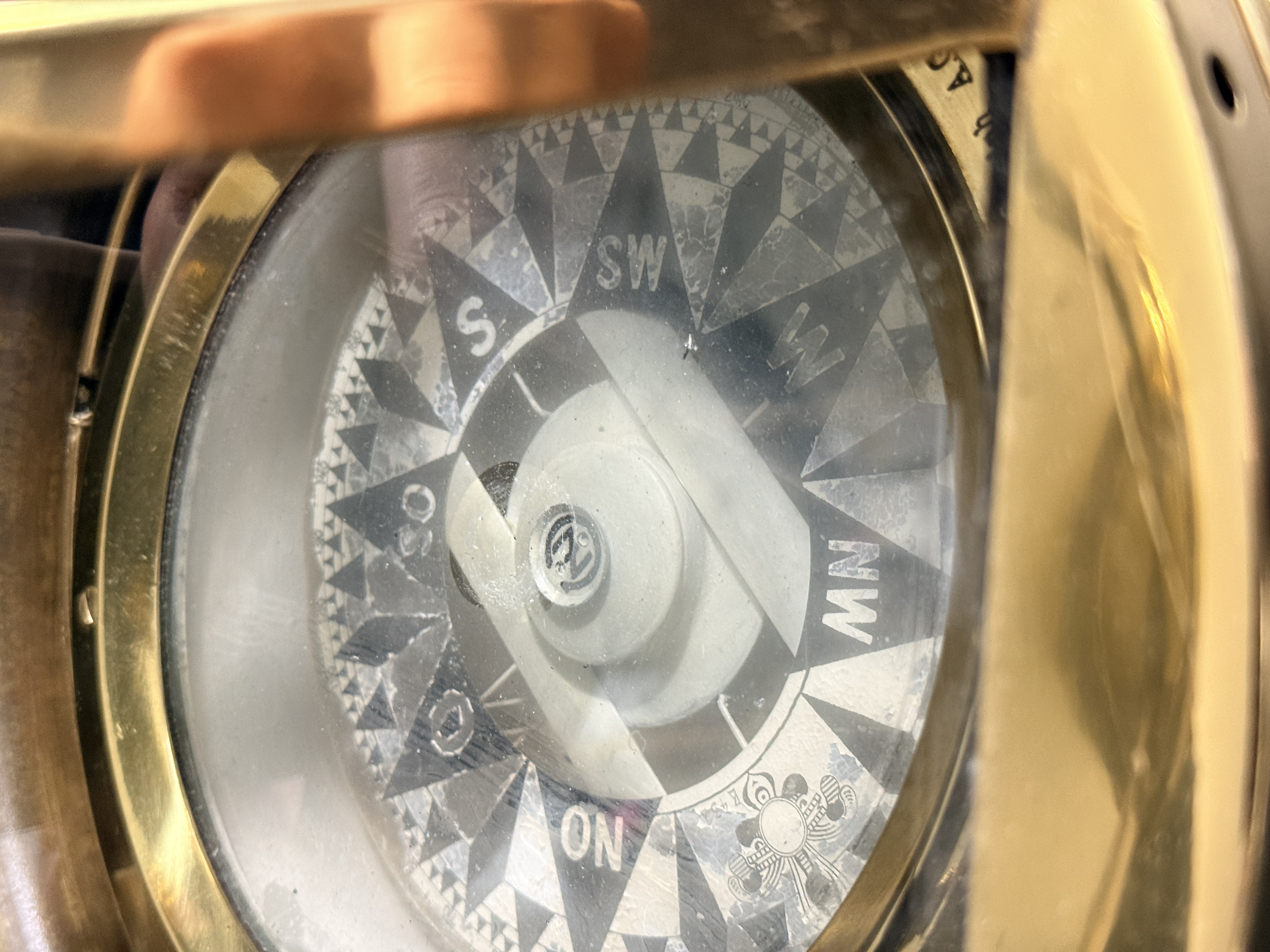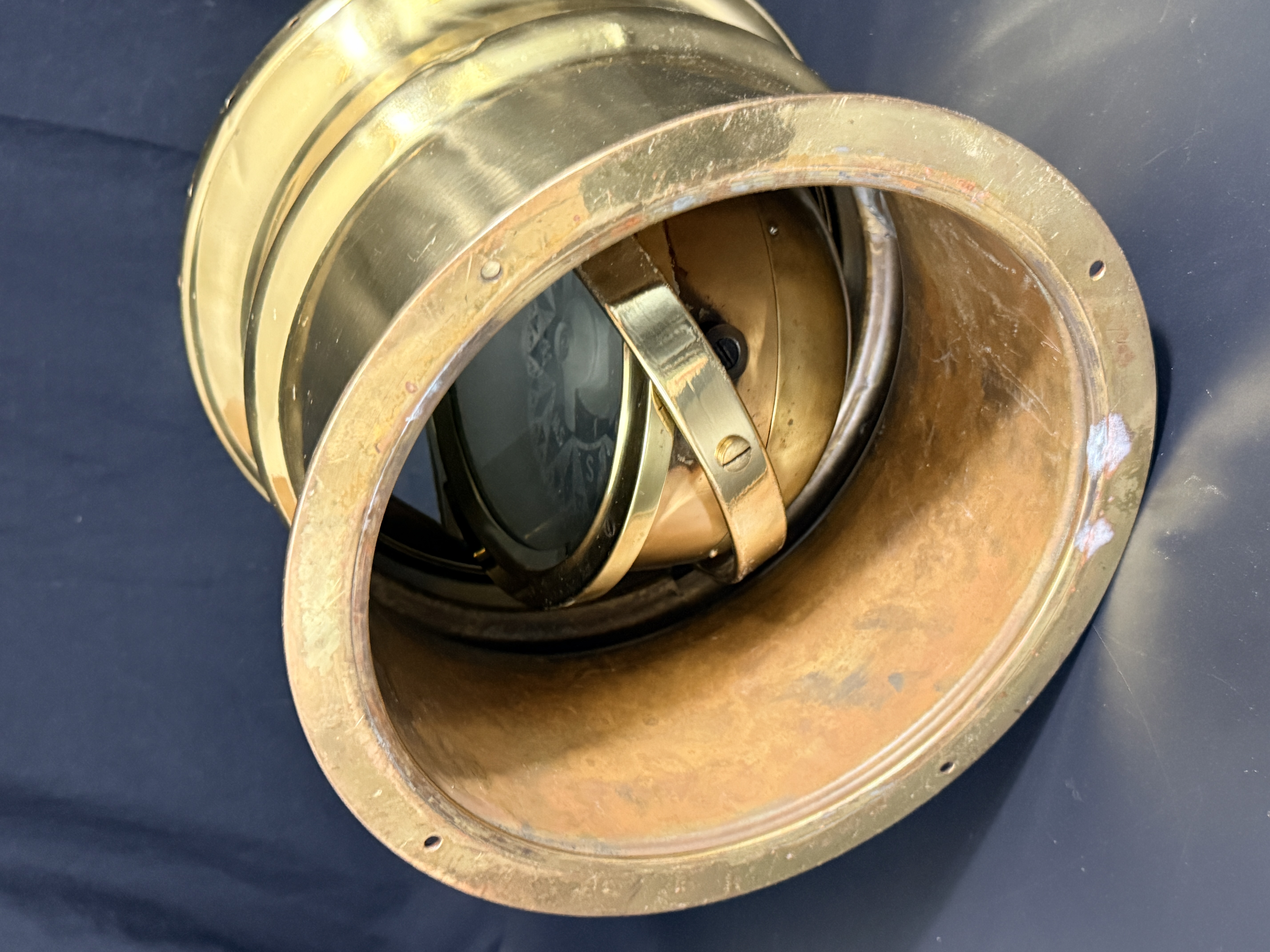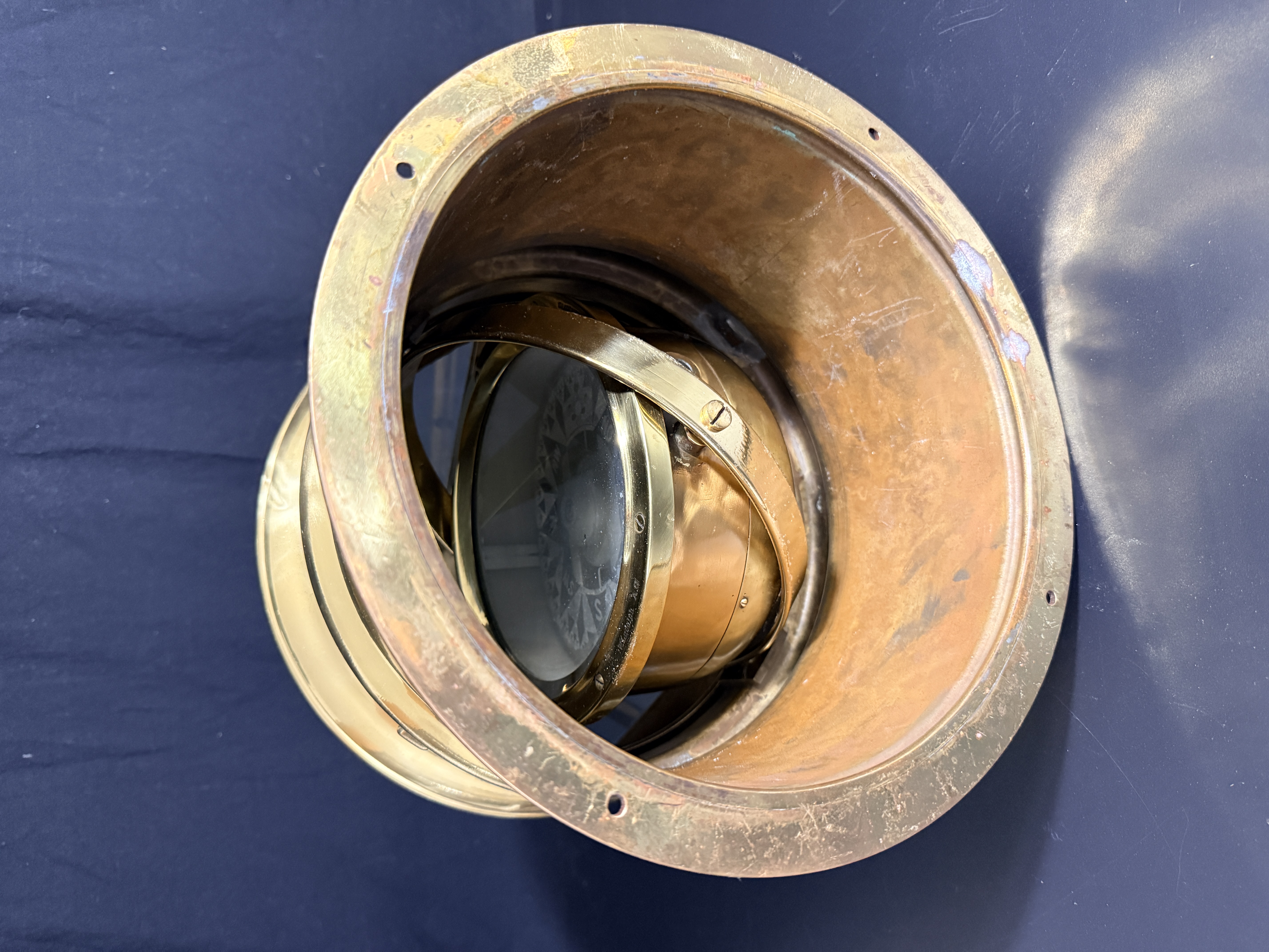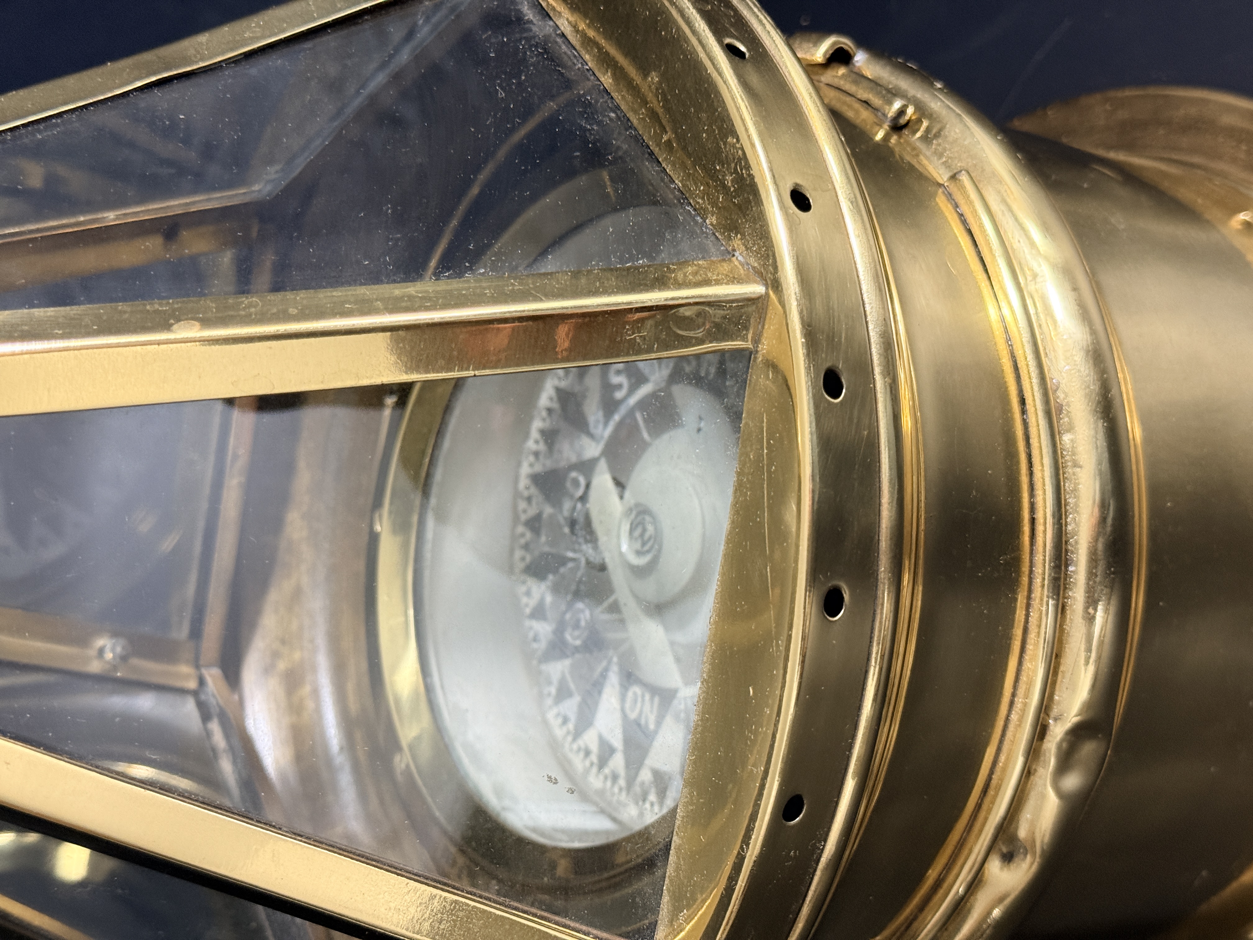 The binnacle is in good condition with a highly polished exterior finish. Minor surface dents are visible on the brass housing. The interior shows signs of oxidation. The compass card exhibits crazing and surface wear consistent with age and maritime use.
