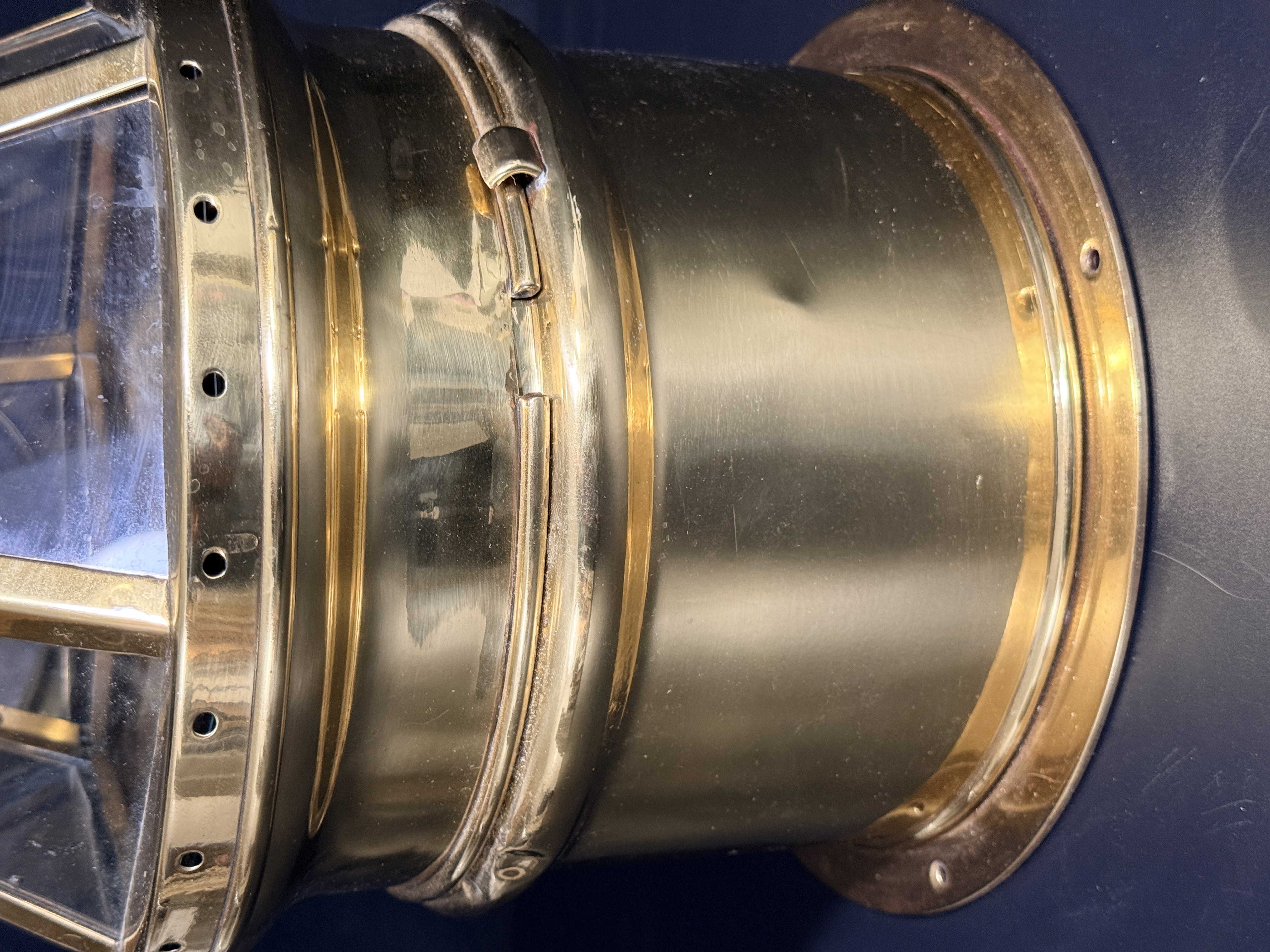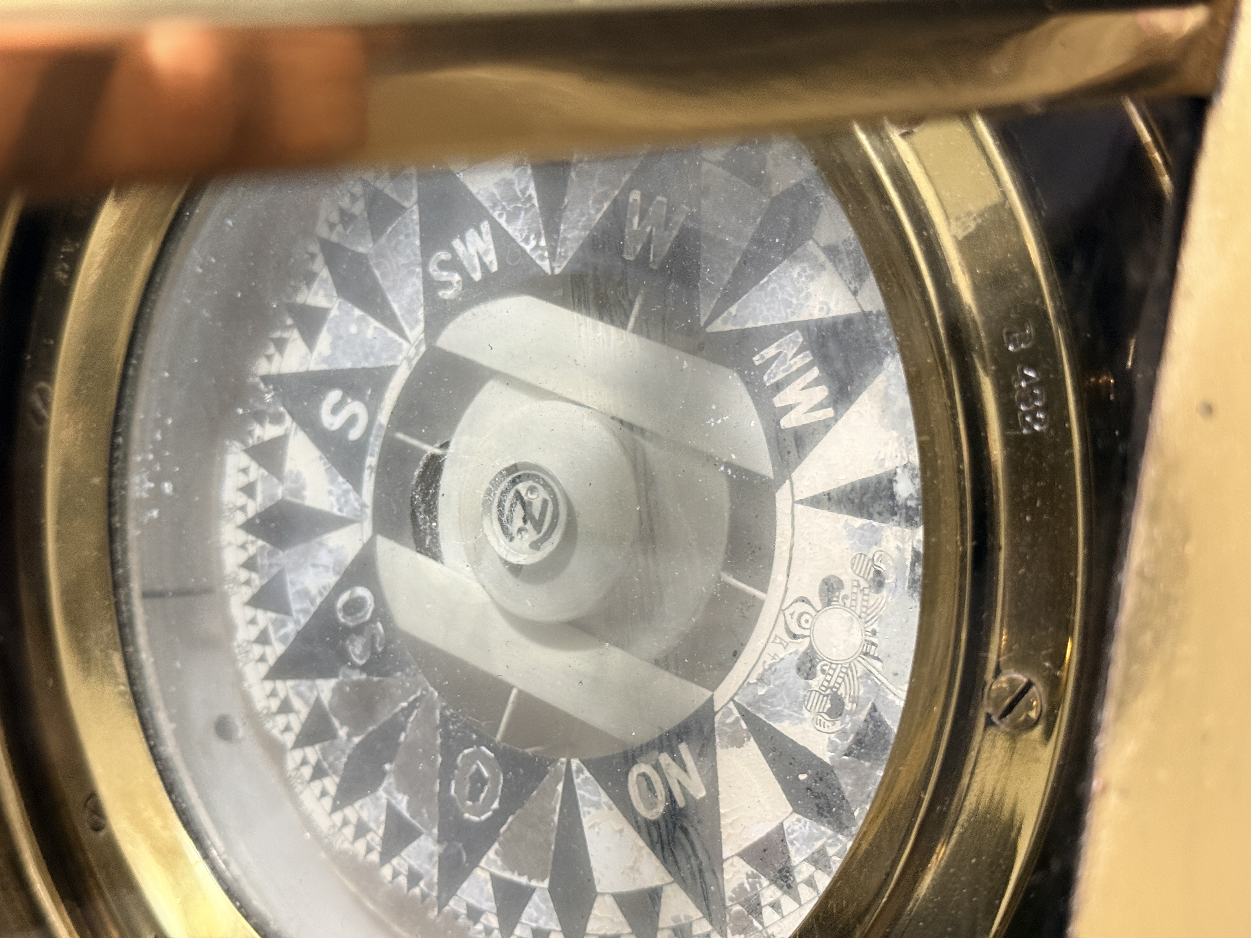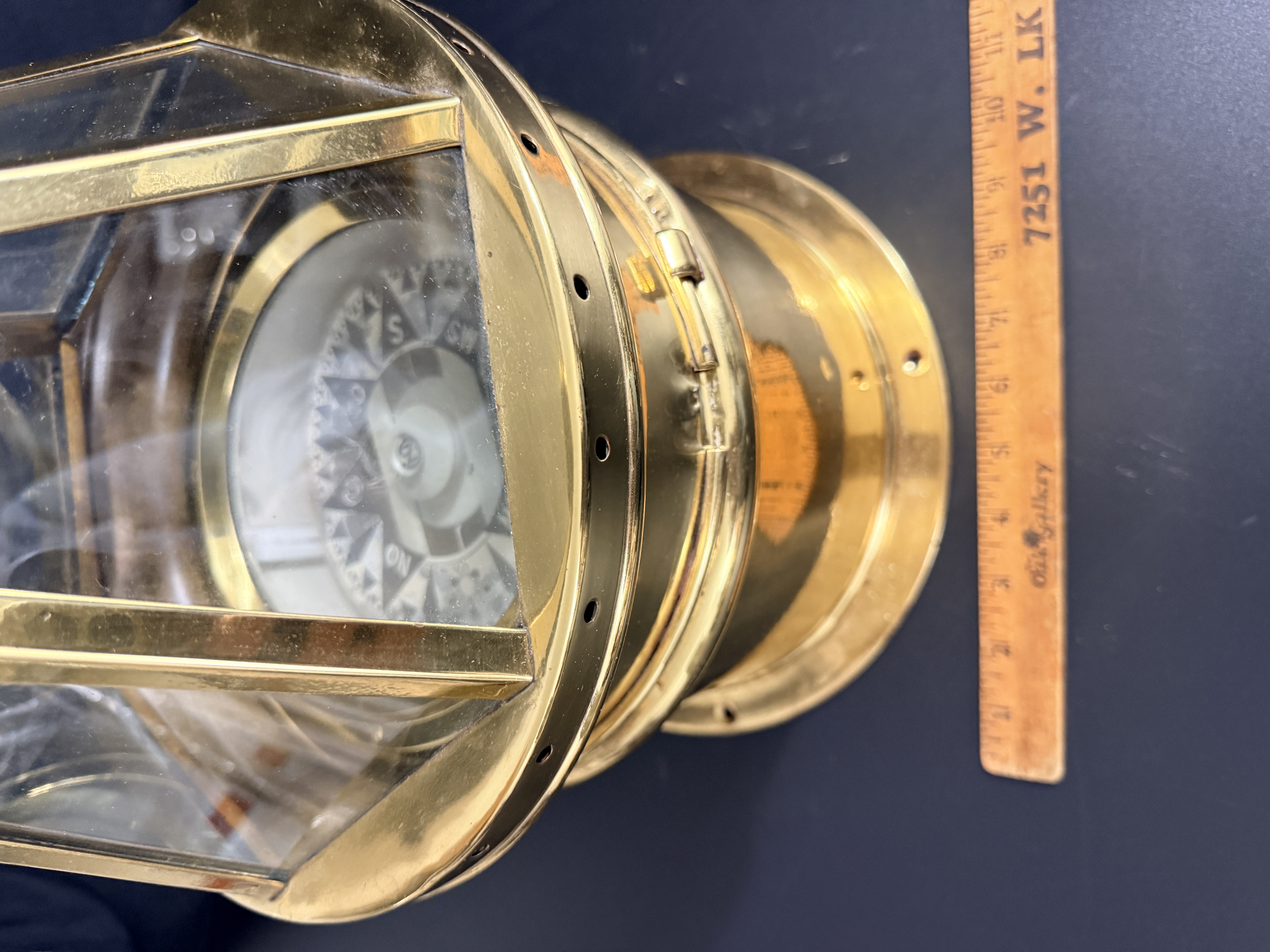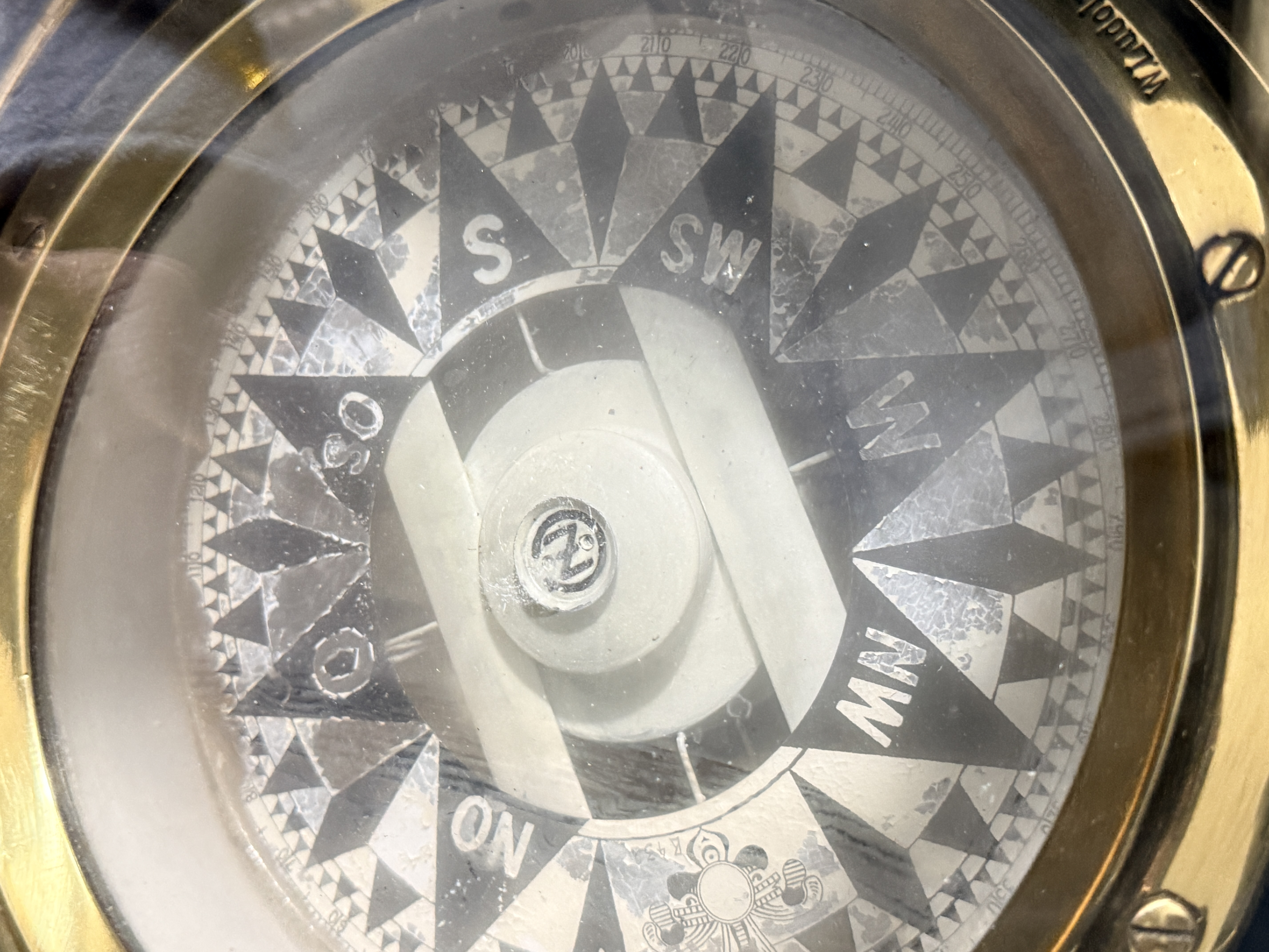 The binnacle is in good condition with a highly polished exterior finish. Minor surface dents are visible on the brass housing. The interior shows signs of oxidation. The compass card exhibits crazing and surface wear consistent with age and maritime use.