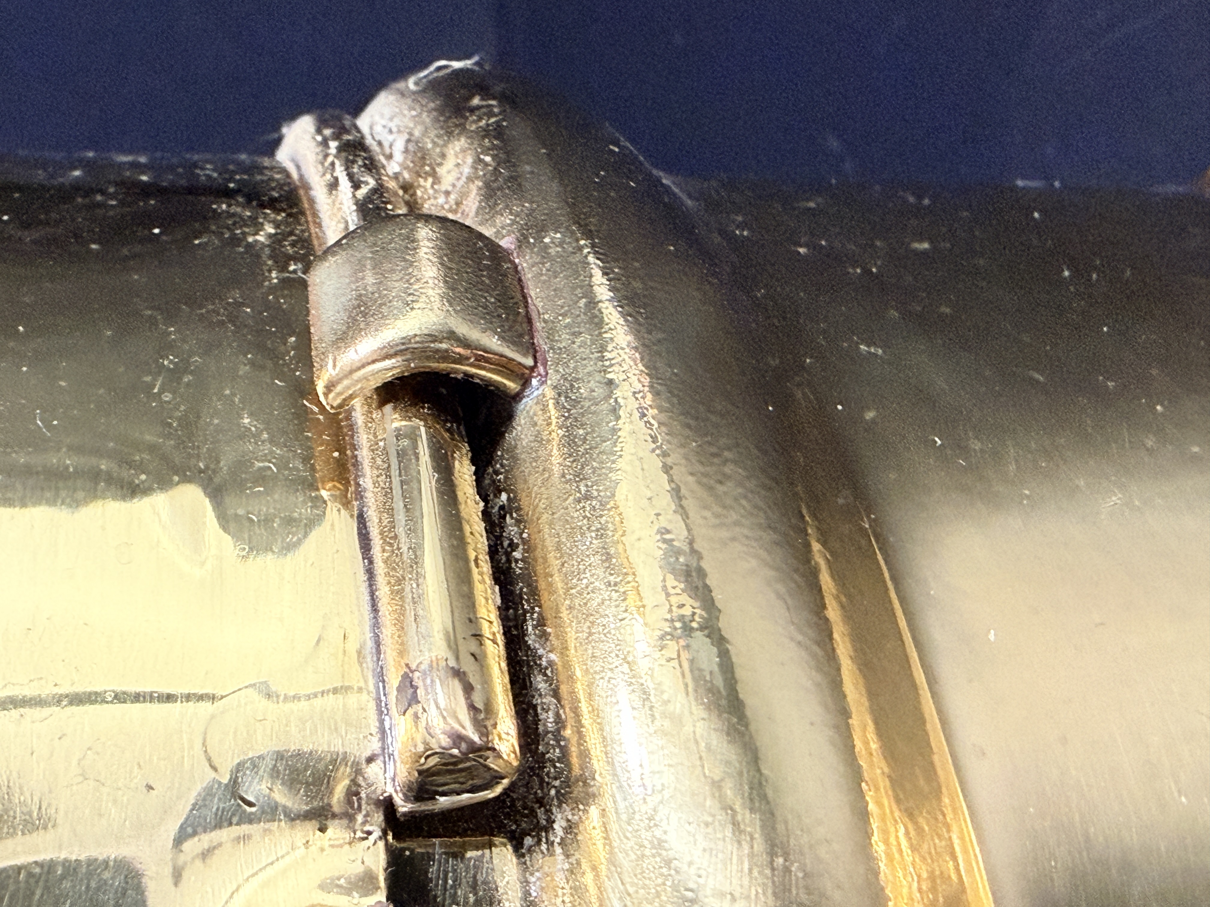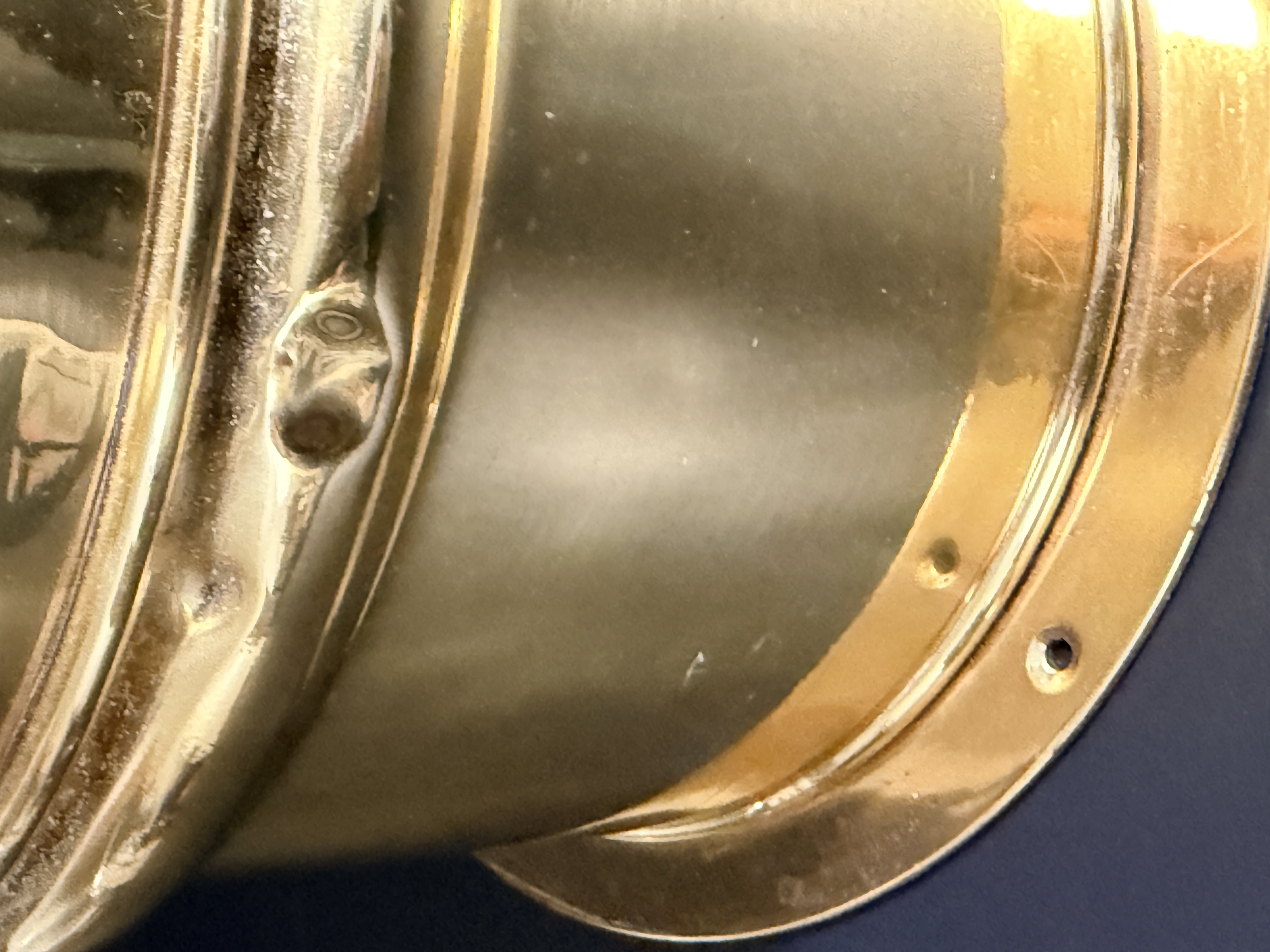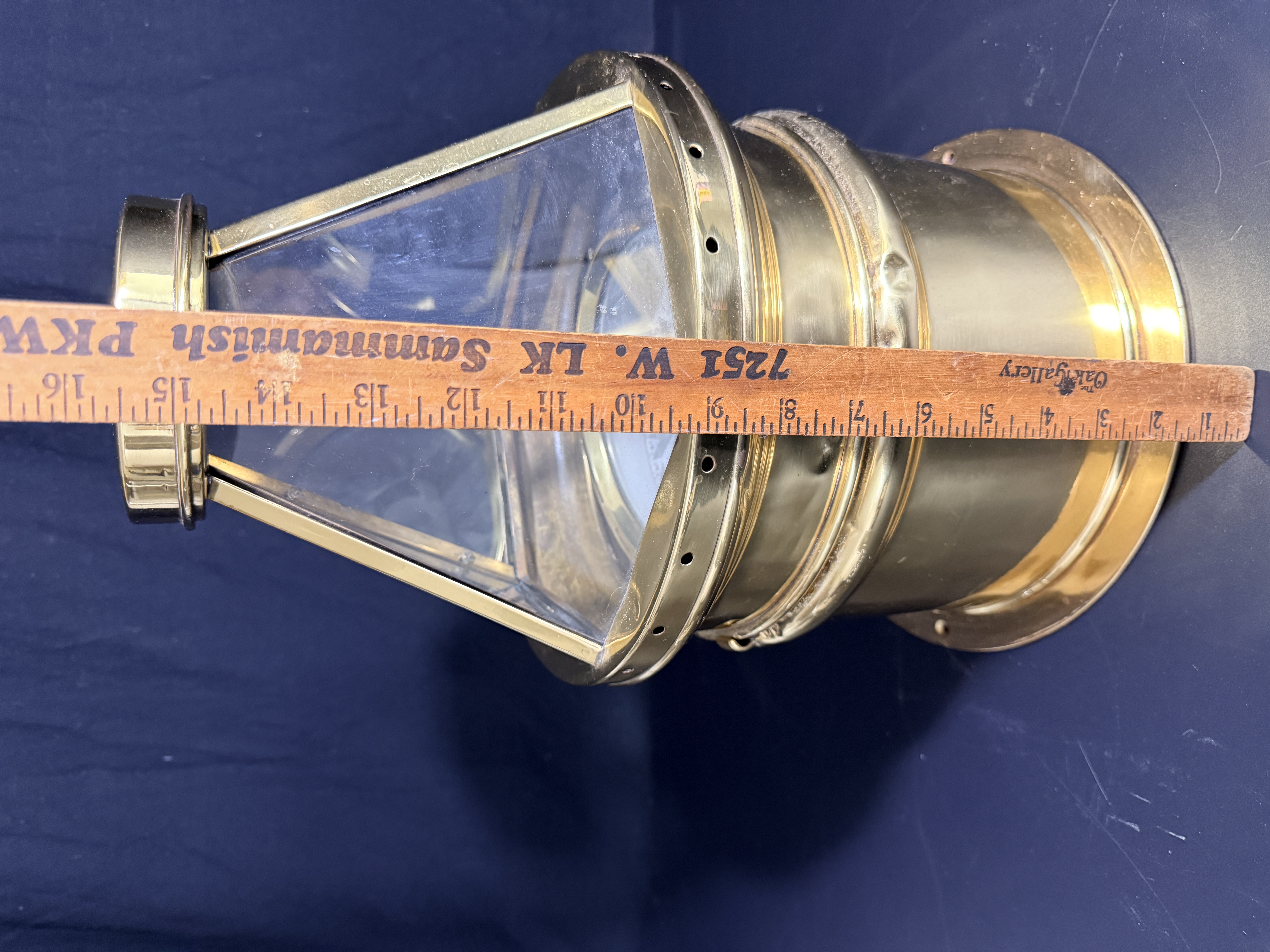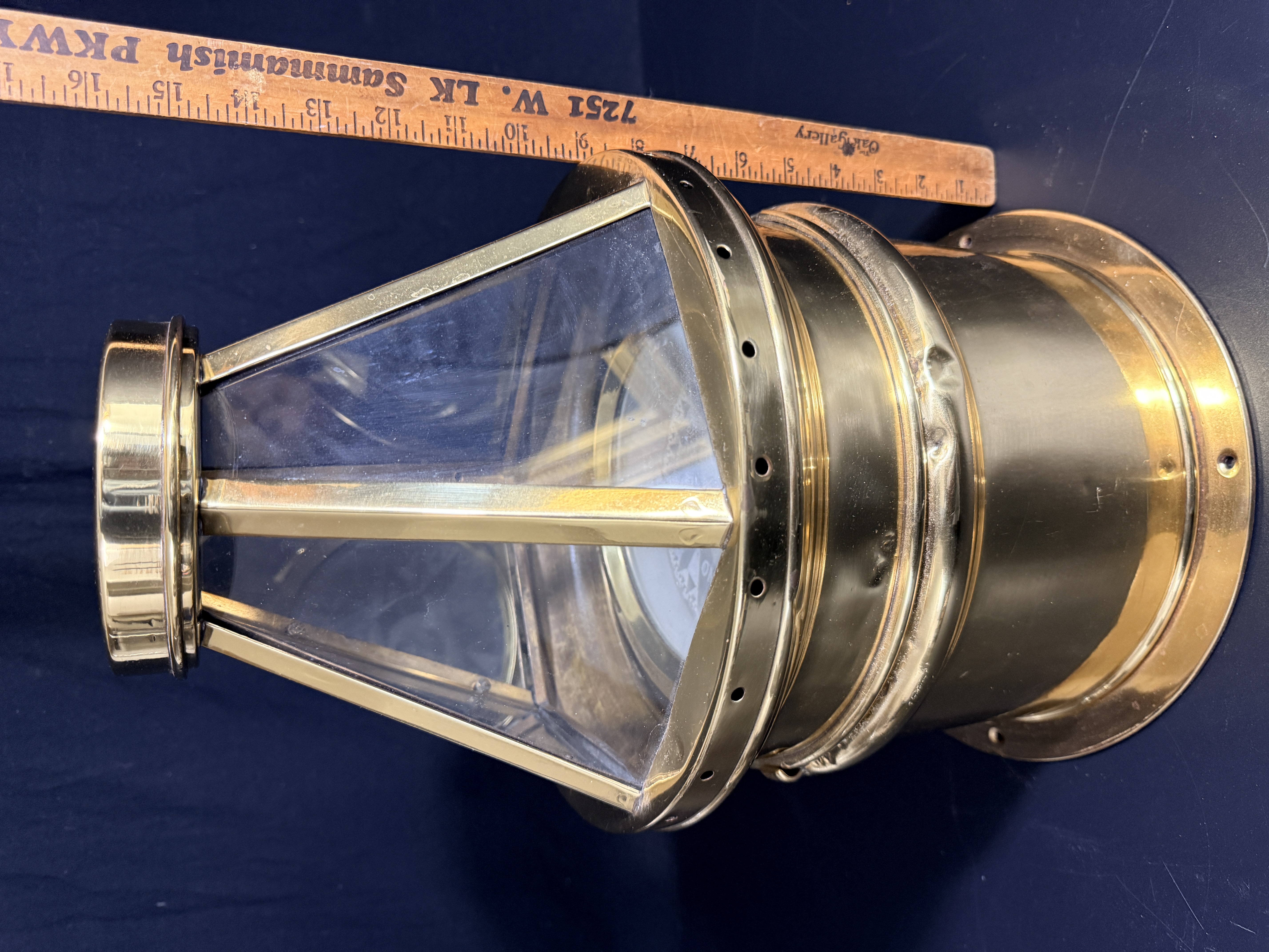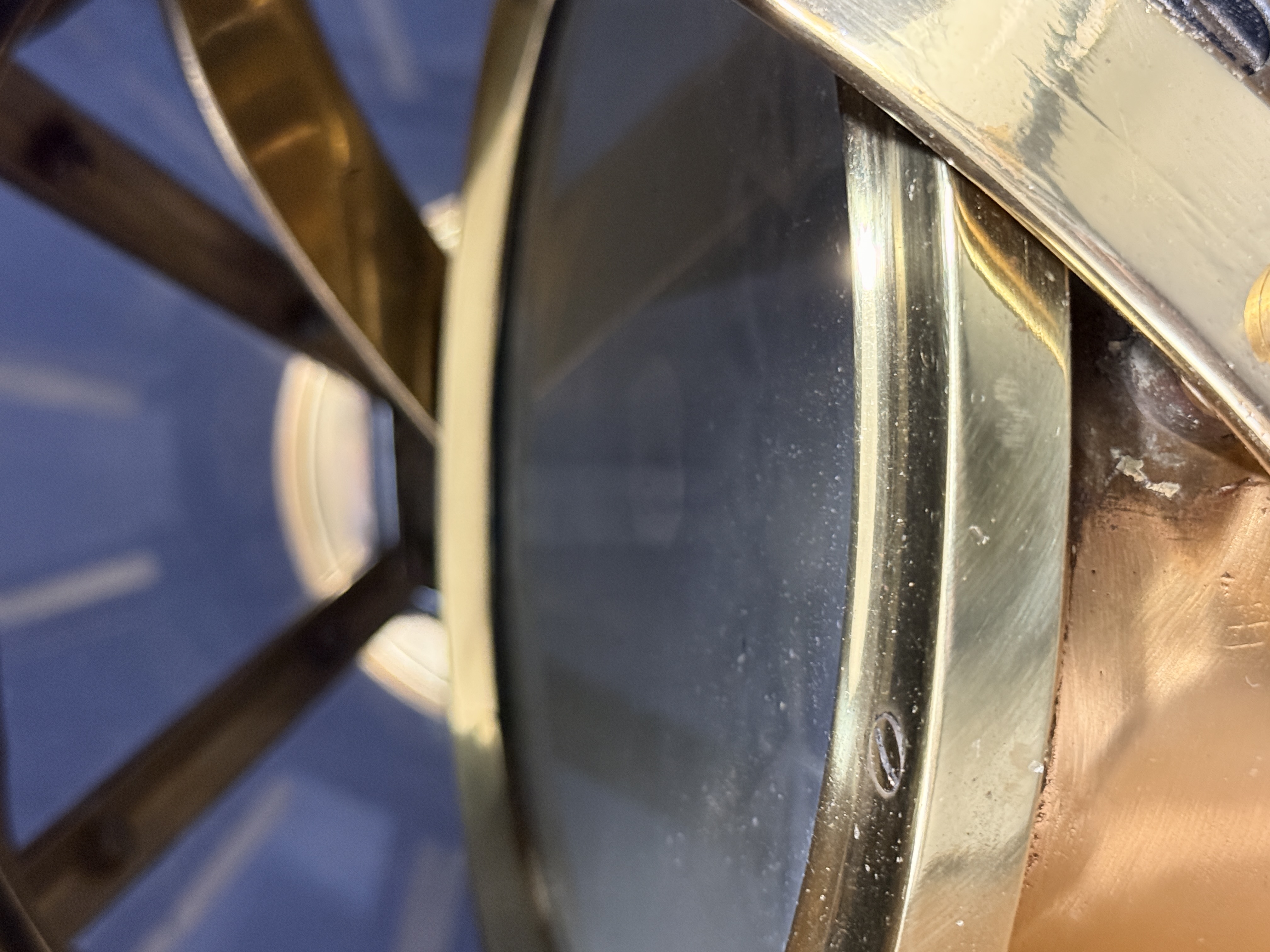 The binnacle is in good condition with a highly polished exterior finish. Minor surface dents are visible on the brass housing. The interior shows signs of oxidation. The compass card exhibits crazing and surface wear consistent with age and maritime use.