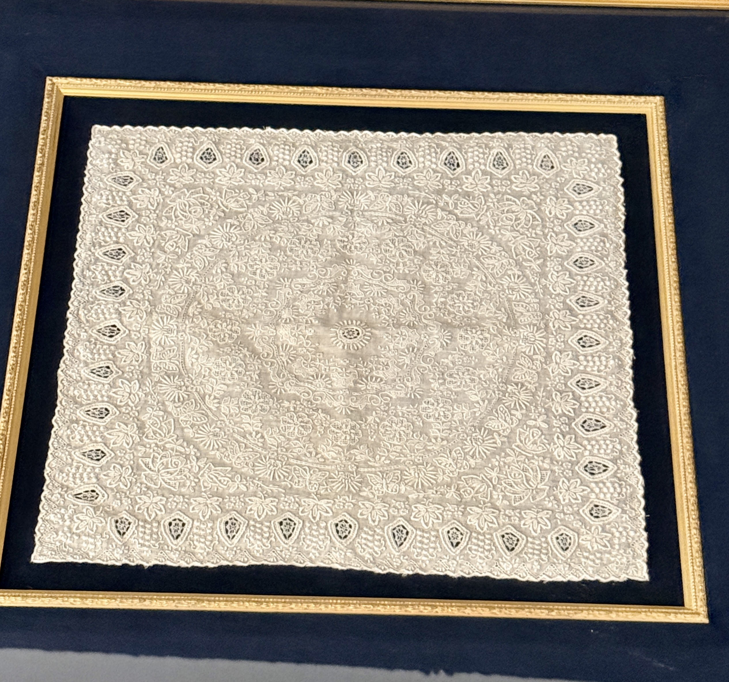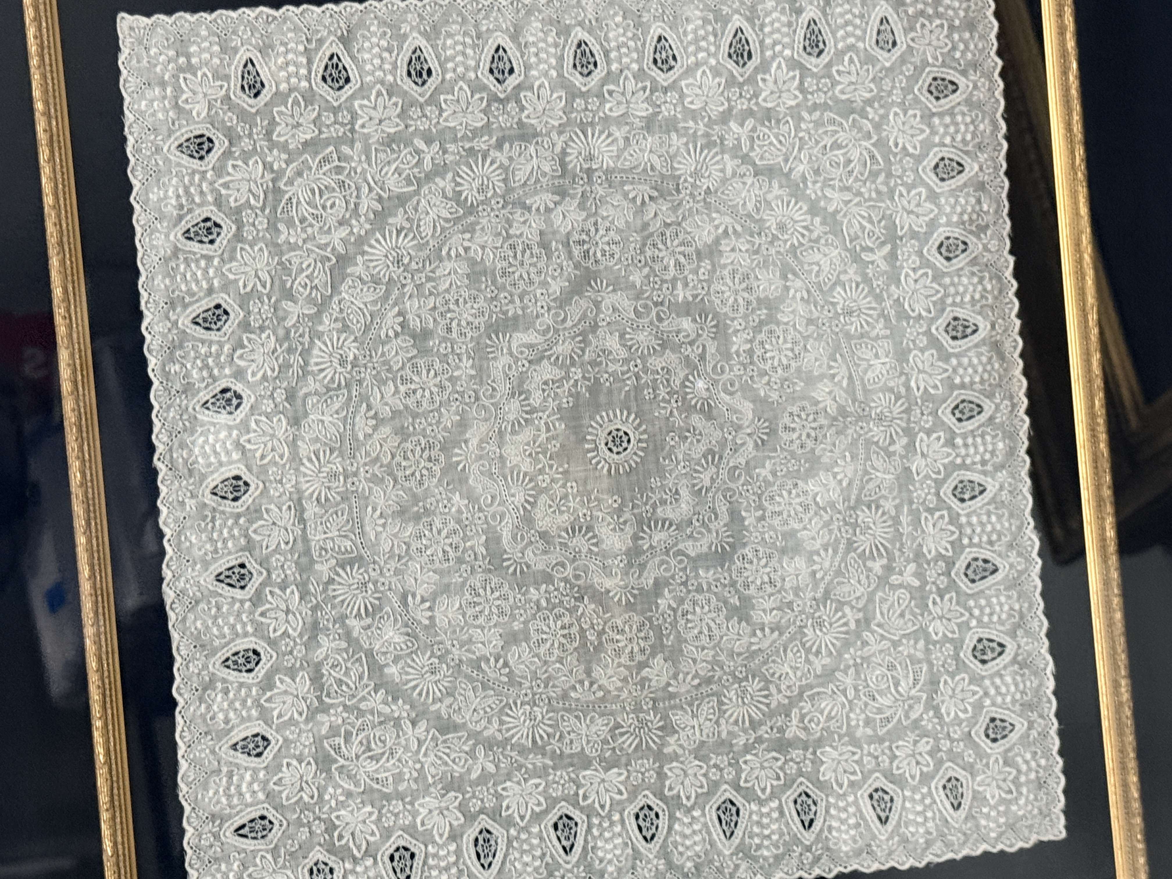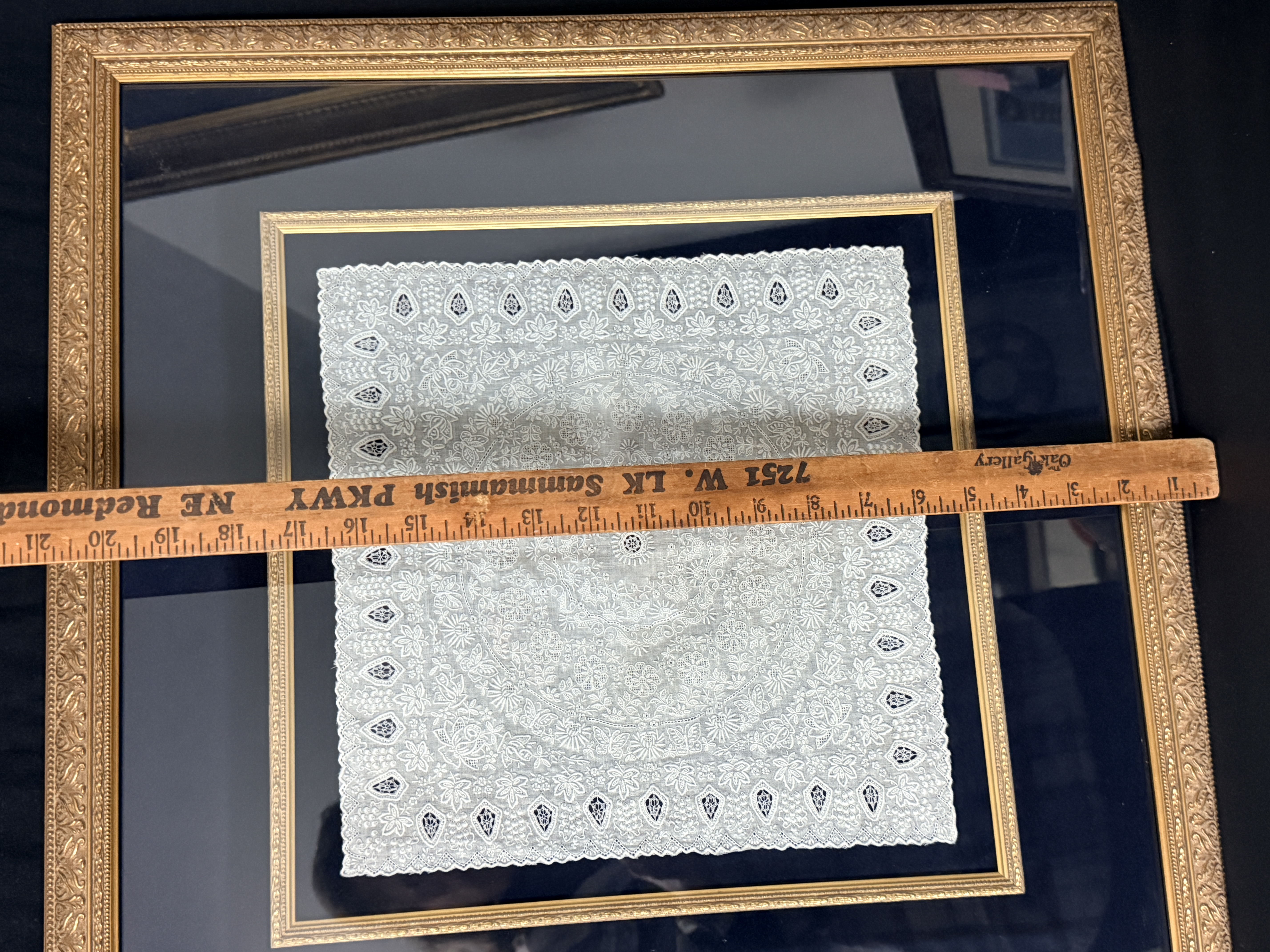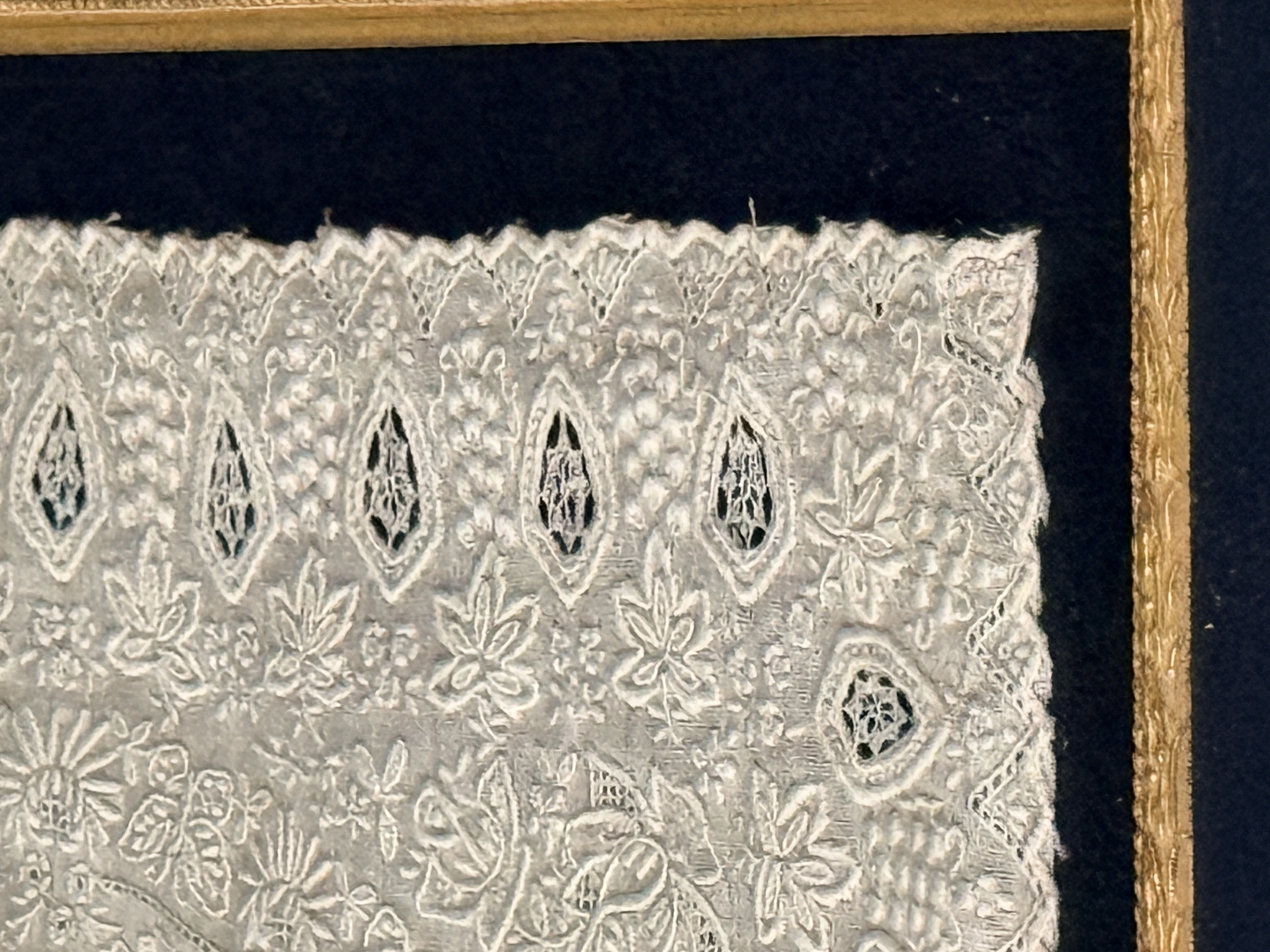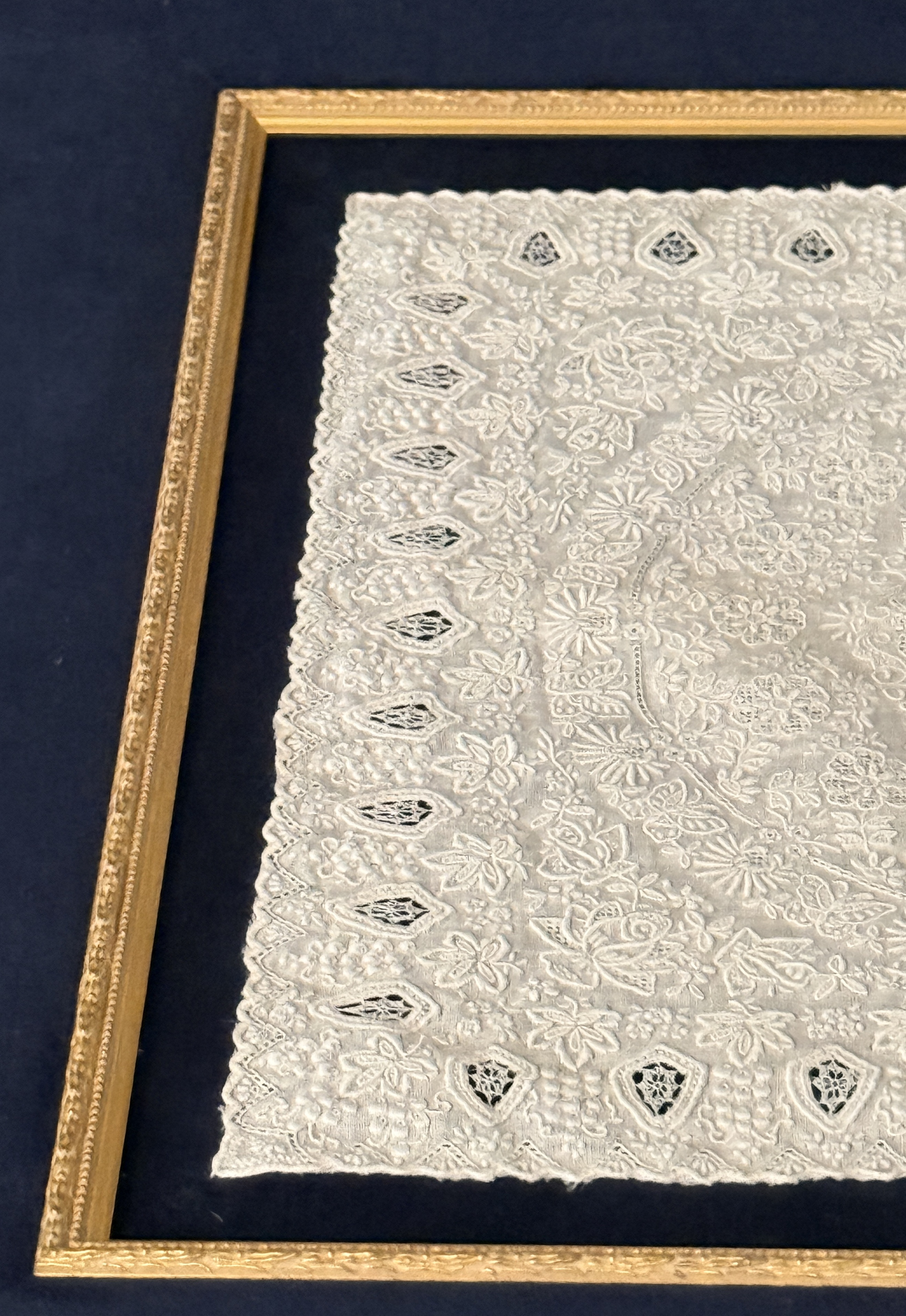 This white-on-white textile is a Chinese Swatow embroidered handkerchief featuring elaborate floral and foliate motifs. The design is organized in concentric circular patterns with intricate needle lace and drawn-thread openwork inserts located in the center and along the scalloped borders. The piece is professionally mounted on a black mat and double-framed within two tiers of ornate gilded wood frames. It is protected by Tru Vue conservation glass. The reverse side includes a gallery label from Howard/Mandville Gallery and a conservation glass sticker.
