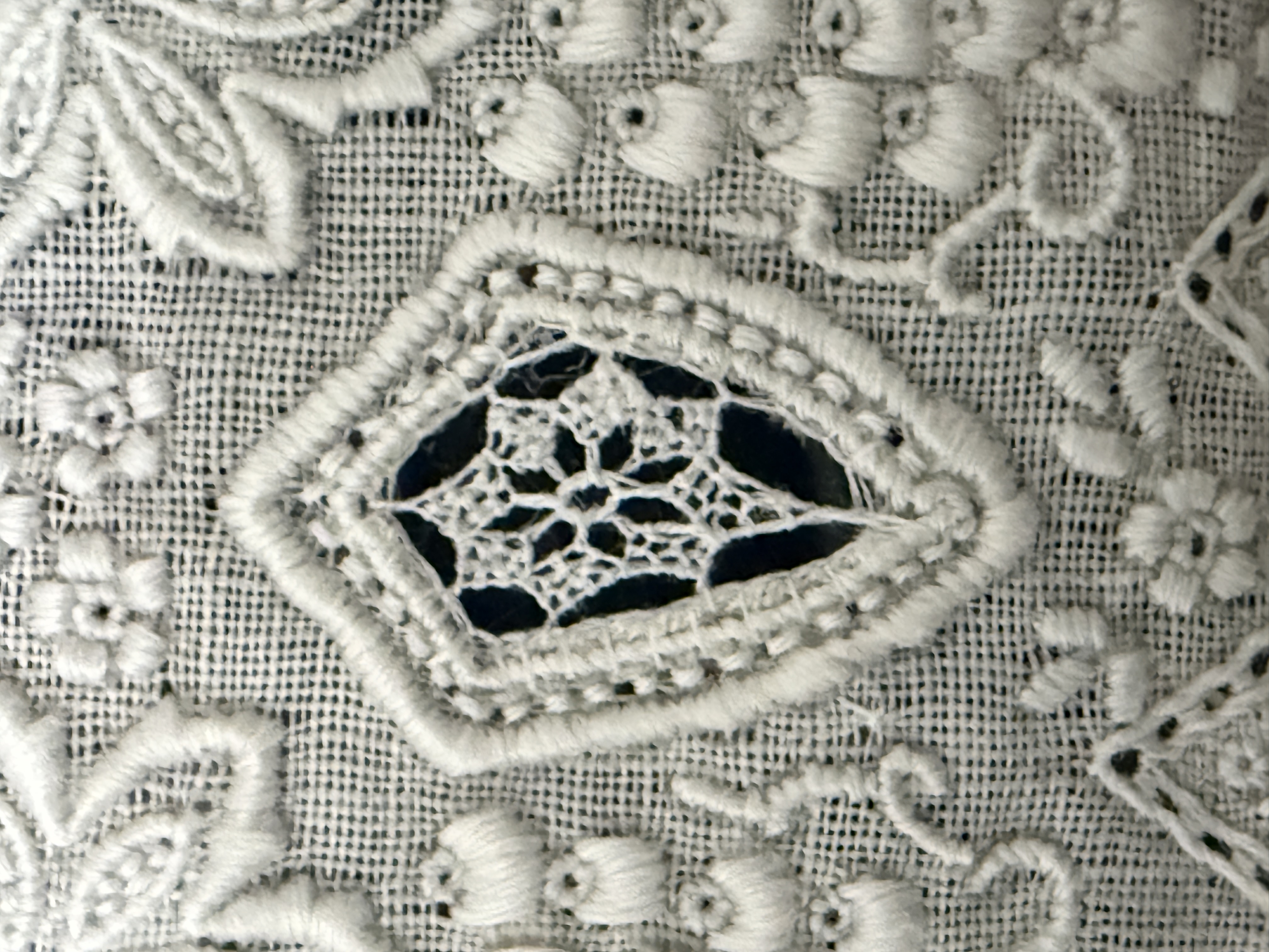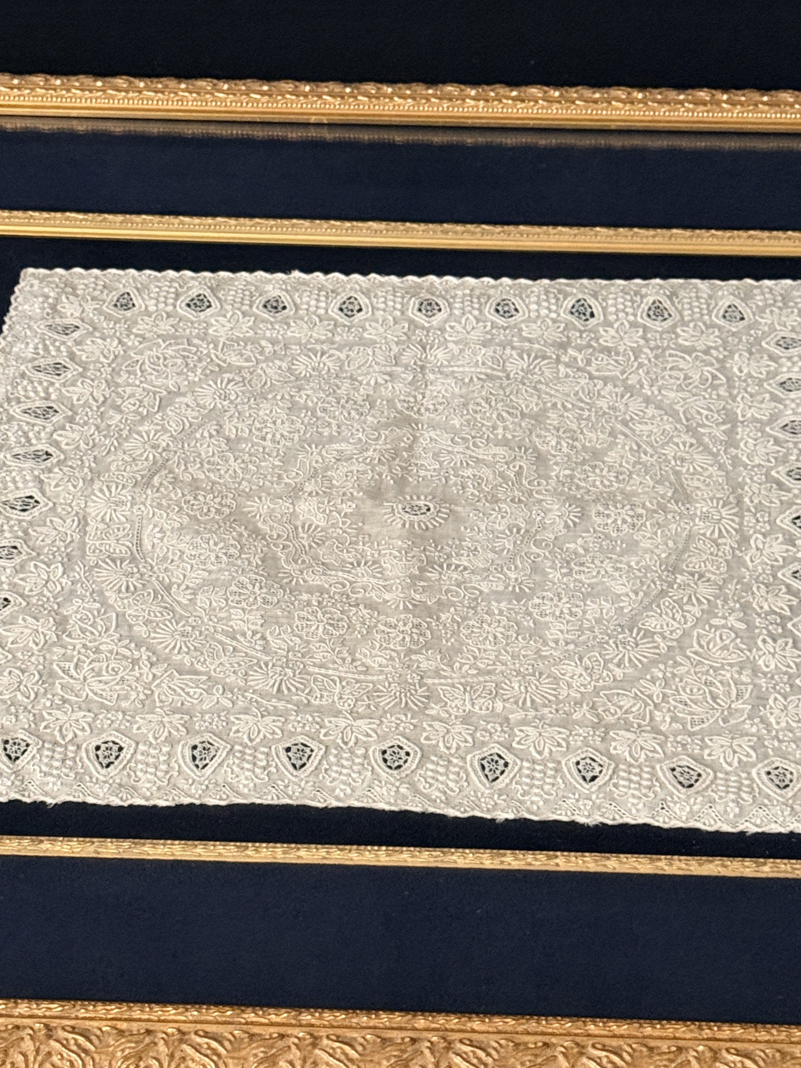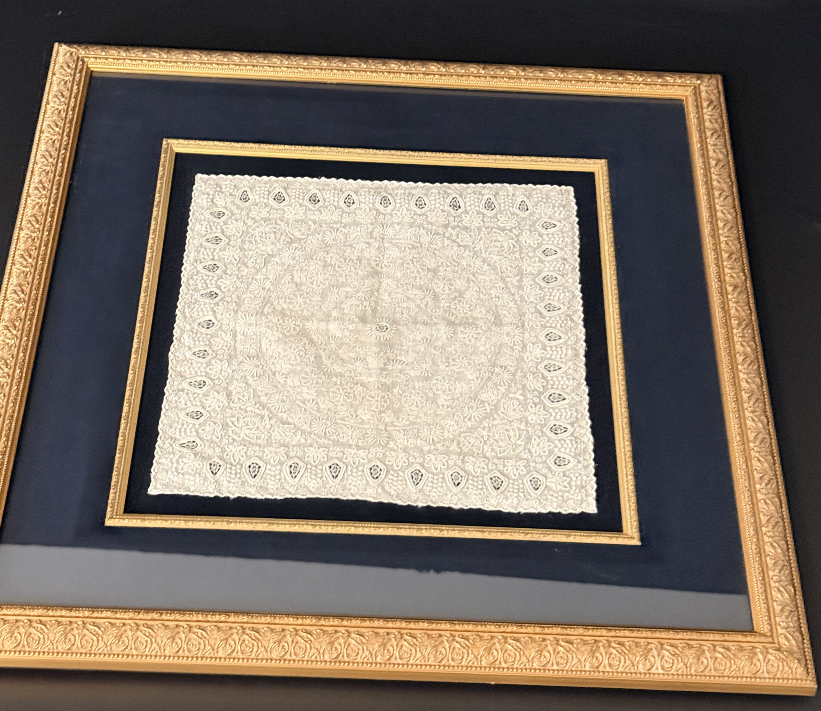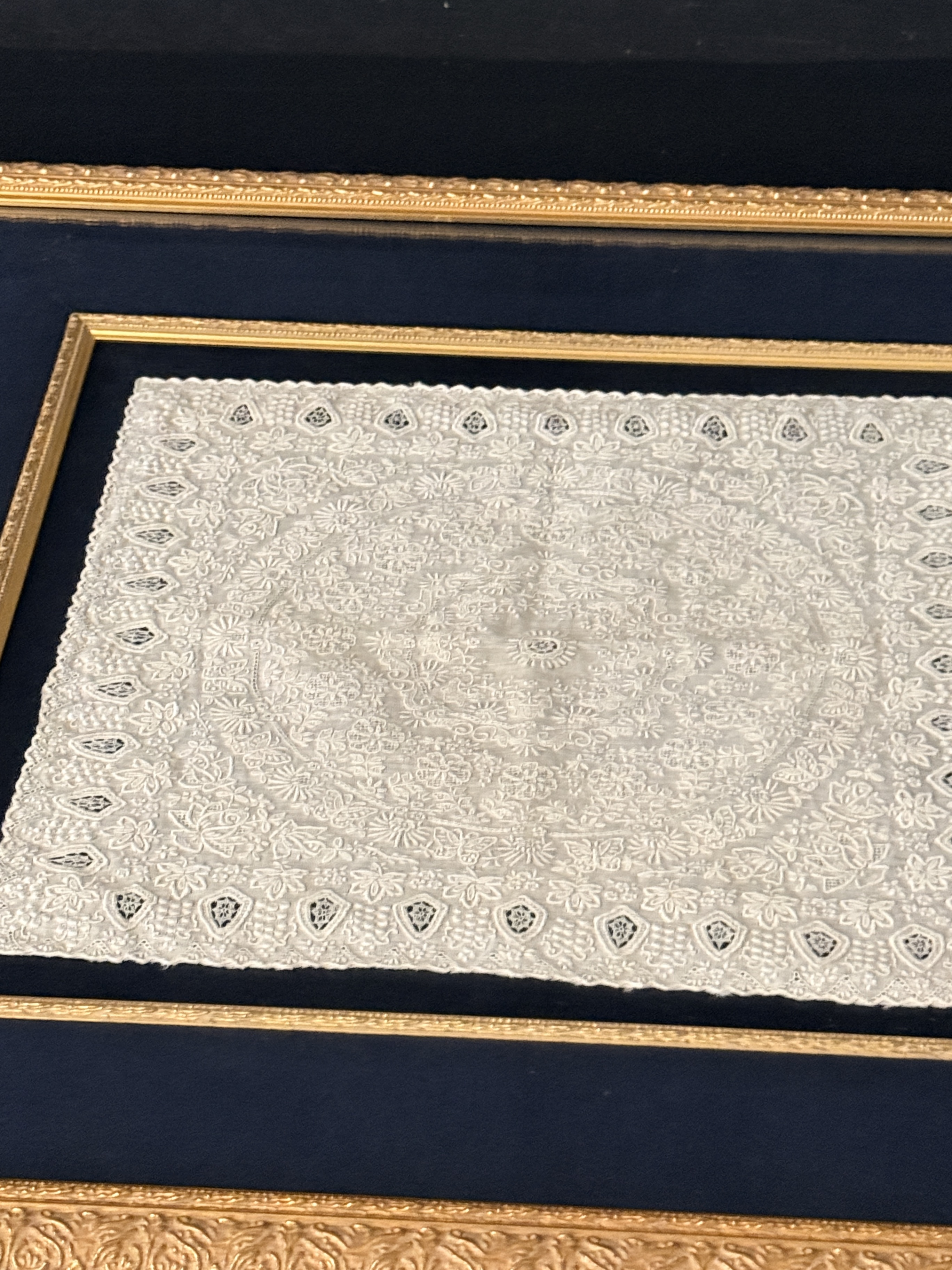 This white-on-white textile is a Chinese Swatow embroidered handkerchief featuring elaborate floral and foliate motifs. The design is organized in concentric circular patterns with intricate needle lace and drawn-thread openwork inserts located in the center and along the scalloped borders. The piece is professionally mounted on a black mat and double-framed within two tiers of ornate gilded wood frames. It is protected by Tru Vue conservation glass. The reverse side includes a gallery label from Howard/Mandville Gallery and a conservation glass sticker.