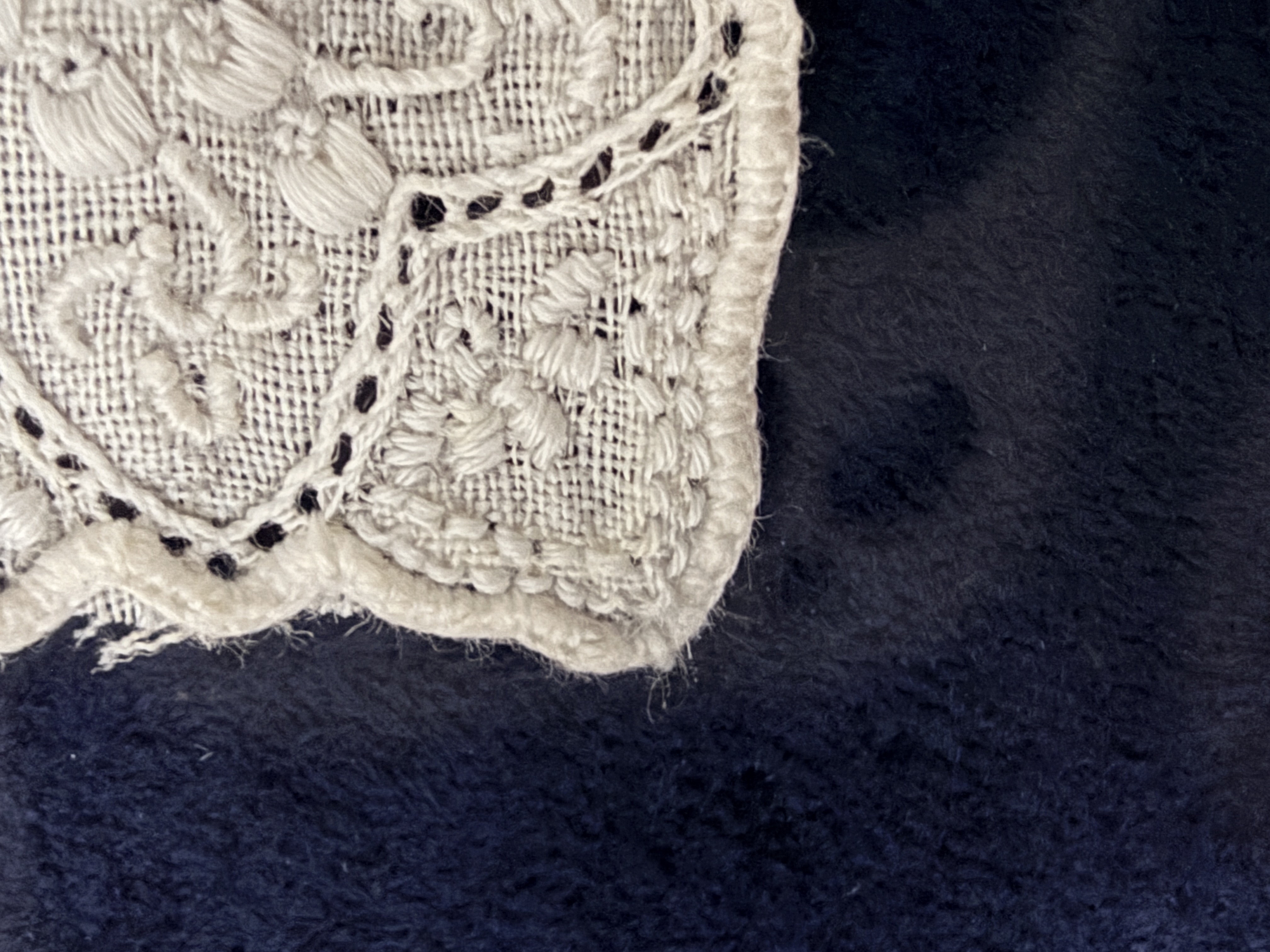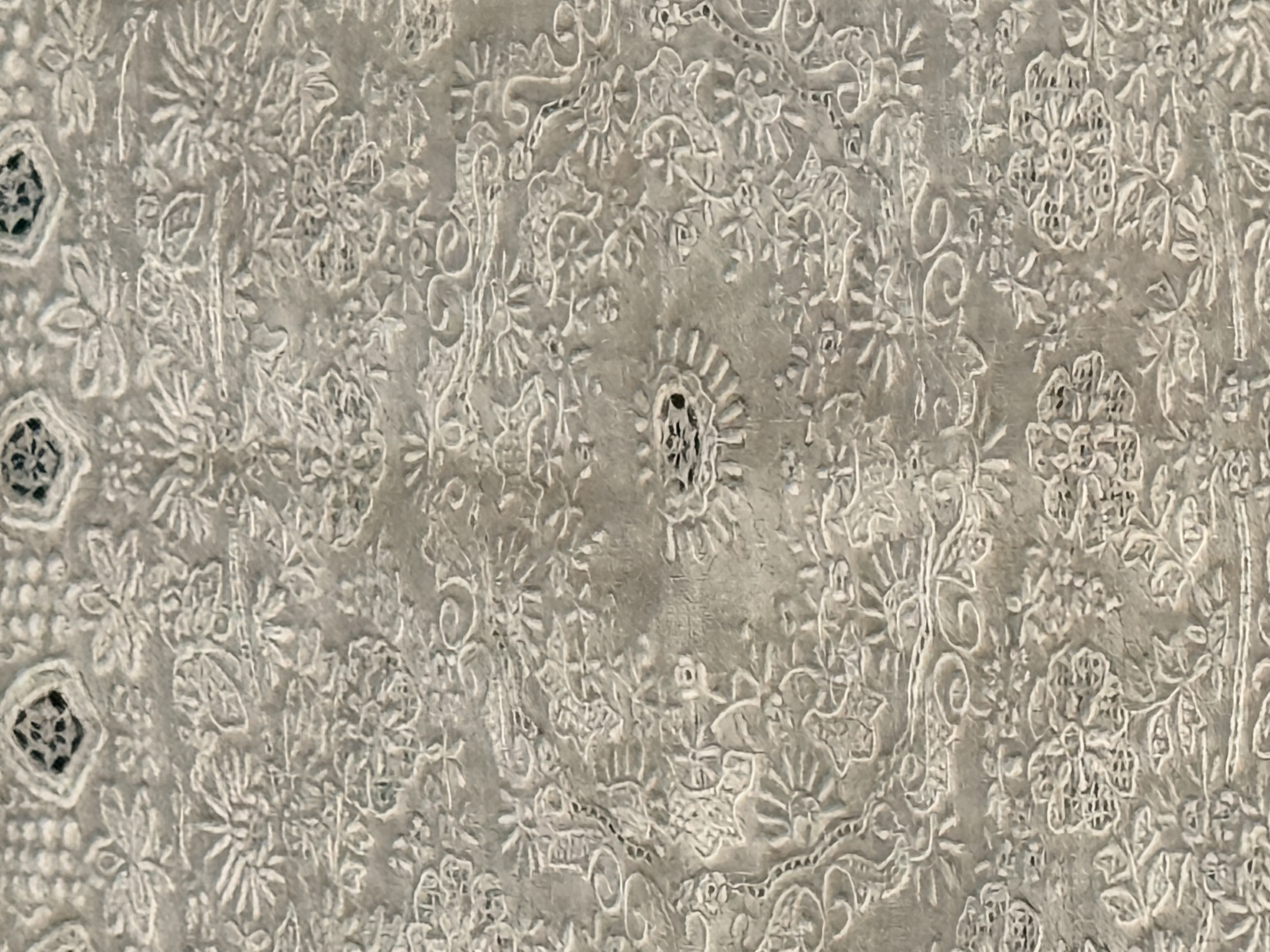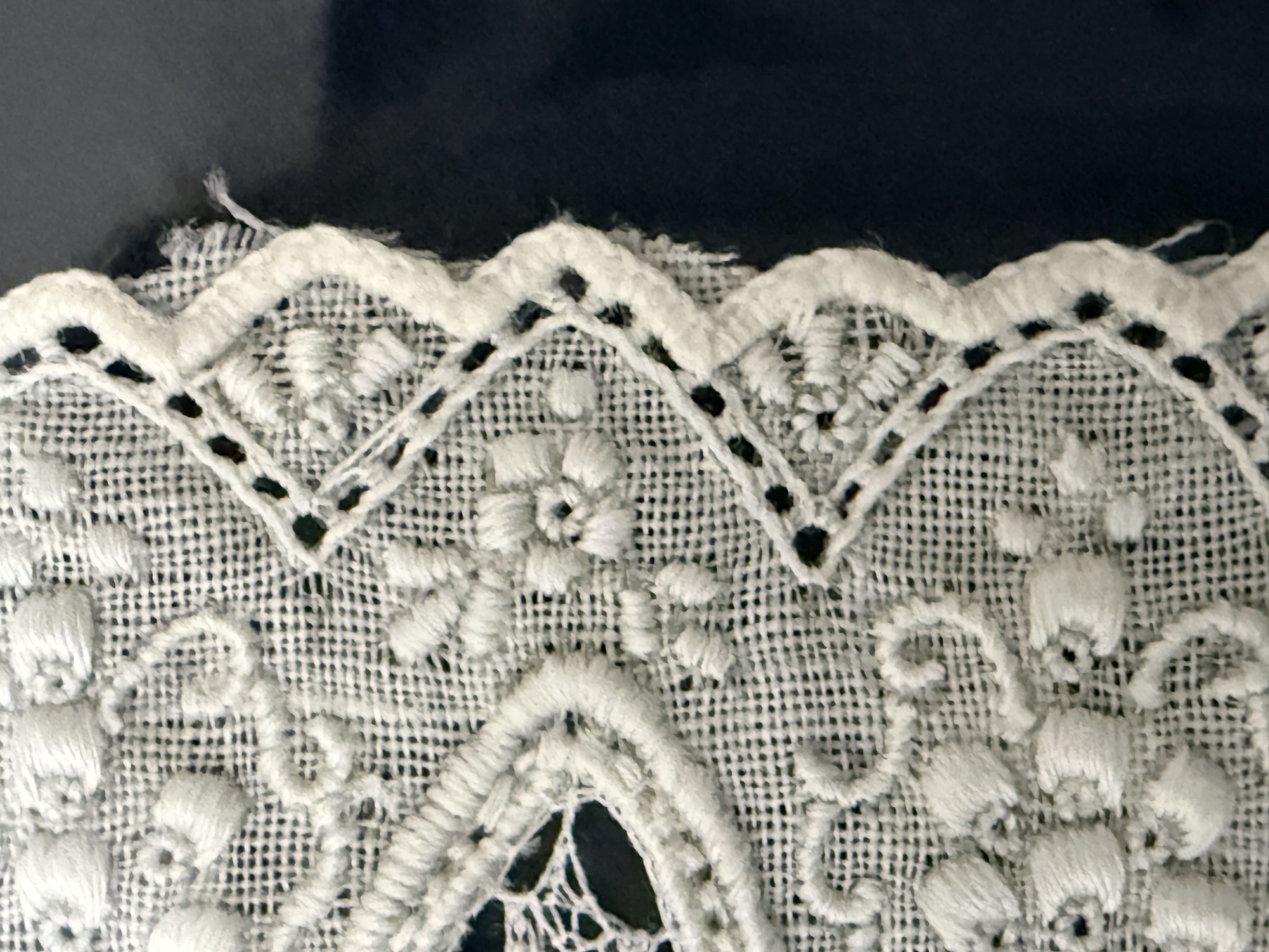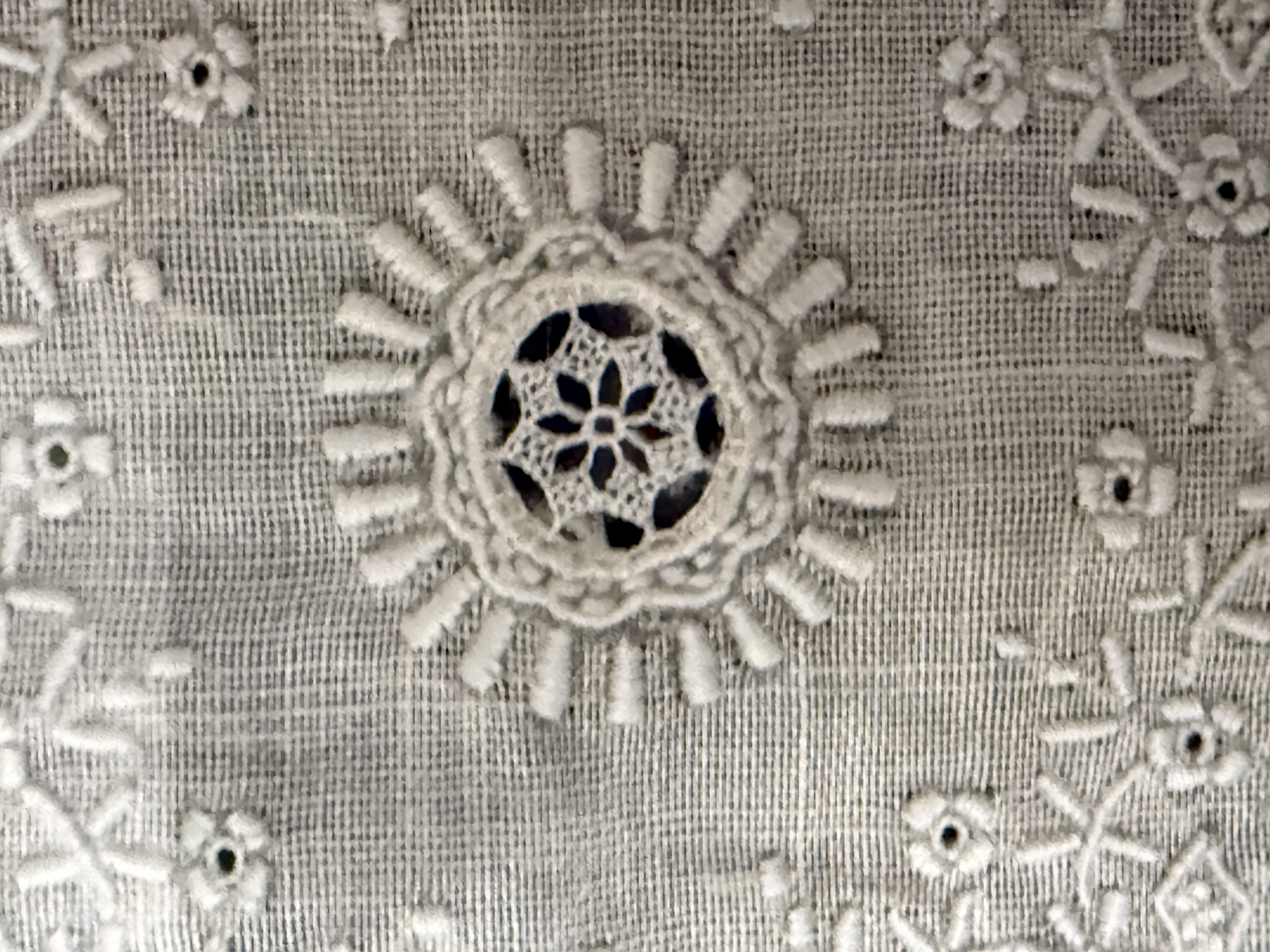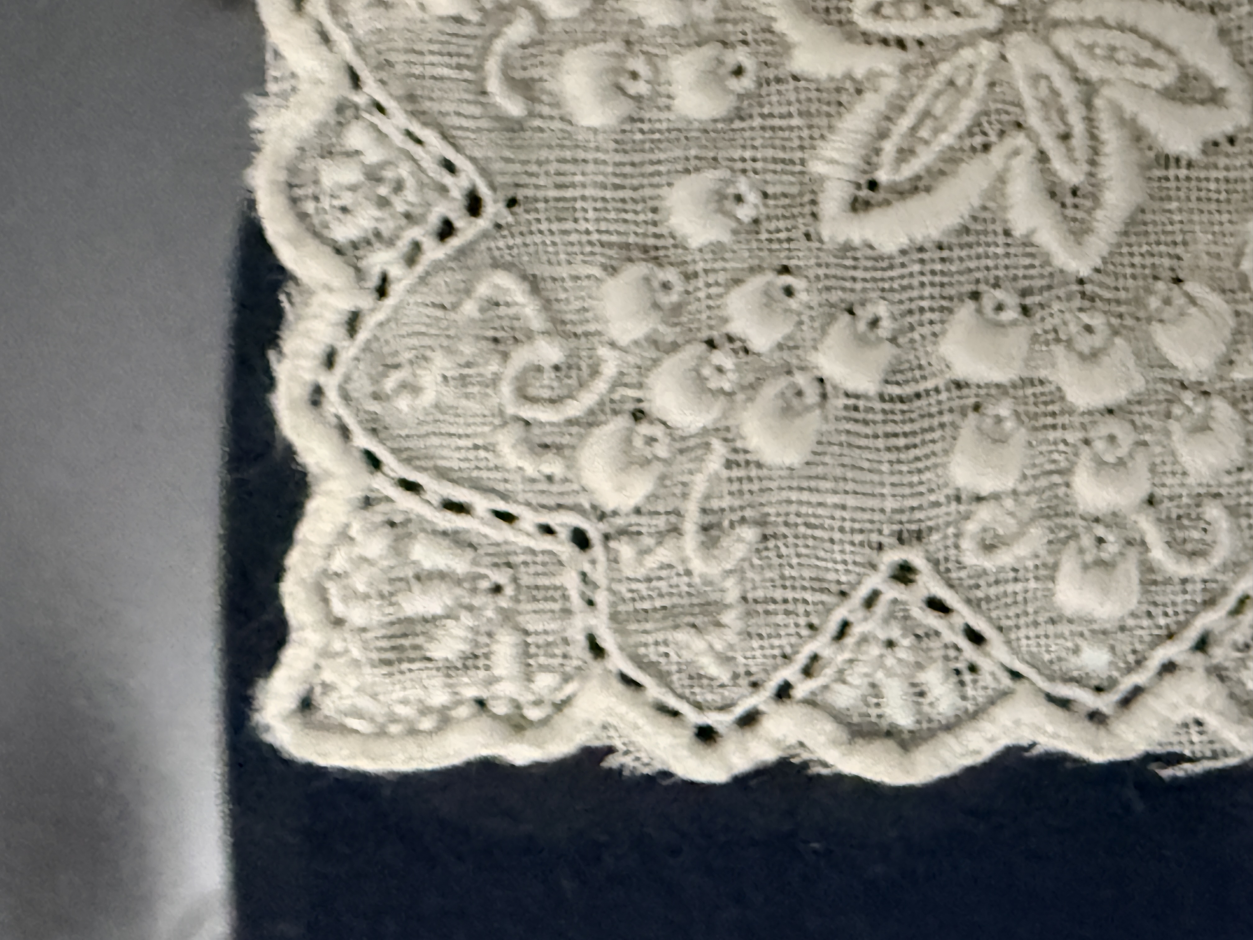 This white-on-white textile is a Chinese Swatow embroidered handkerchief featuring elaborate floral and foliate motifs. The design is organized in concentric circular patterns with intricate needle lace and drawn-thread openwork inserts located in the center and along the scalloped borders. The piece is professionally mounted on a black mat and double-framed within two tiers of ornate gilded wood frames. It is protected by Tru Vue conservation glass. The reverse side includes a gallery label from Howard/Mandville Gallery and a conservation glass sticker.