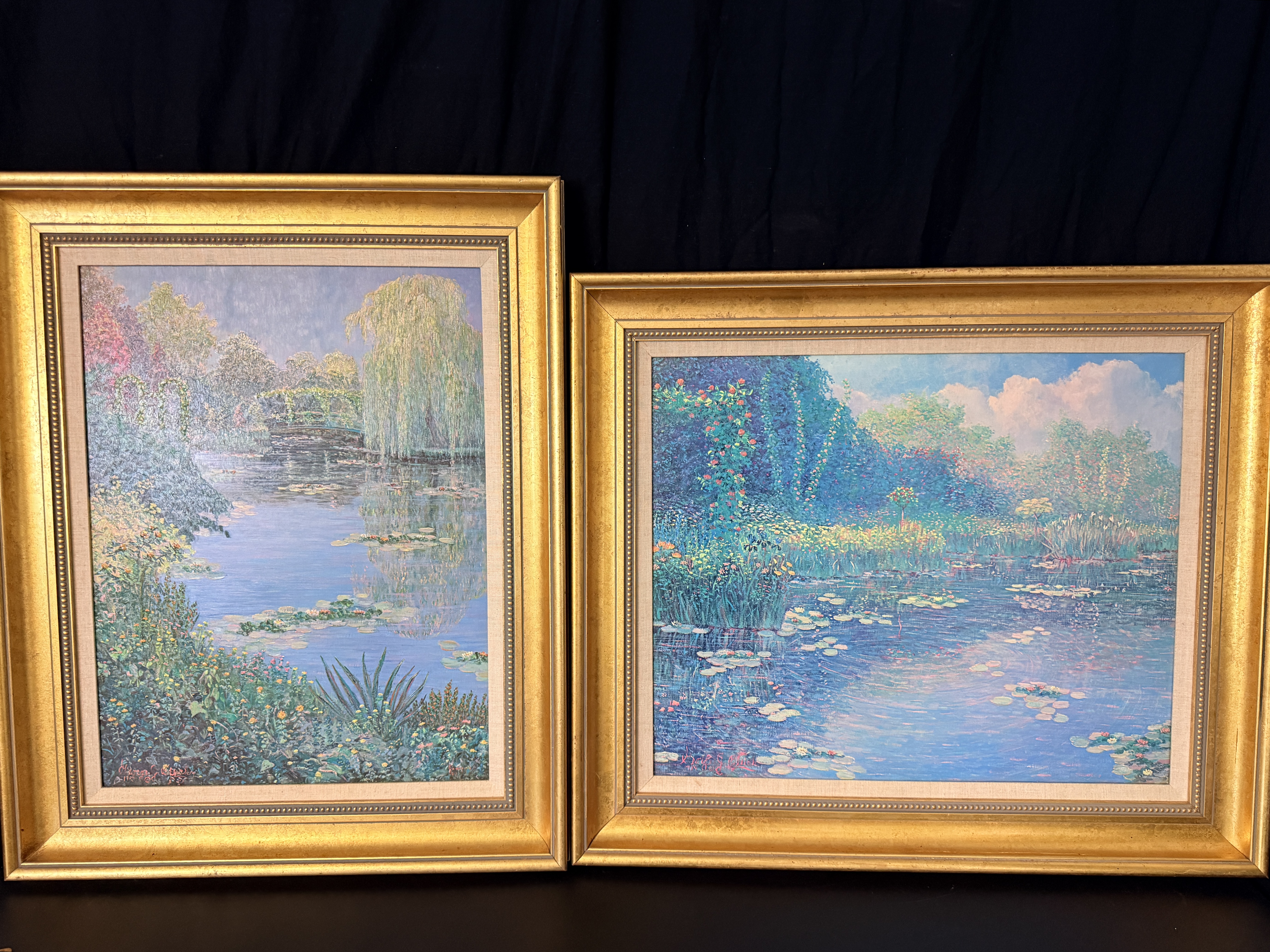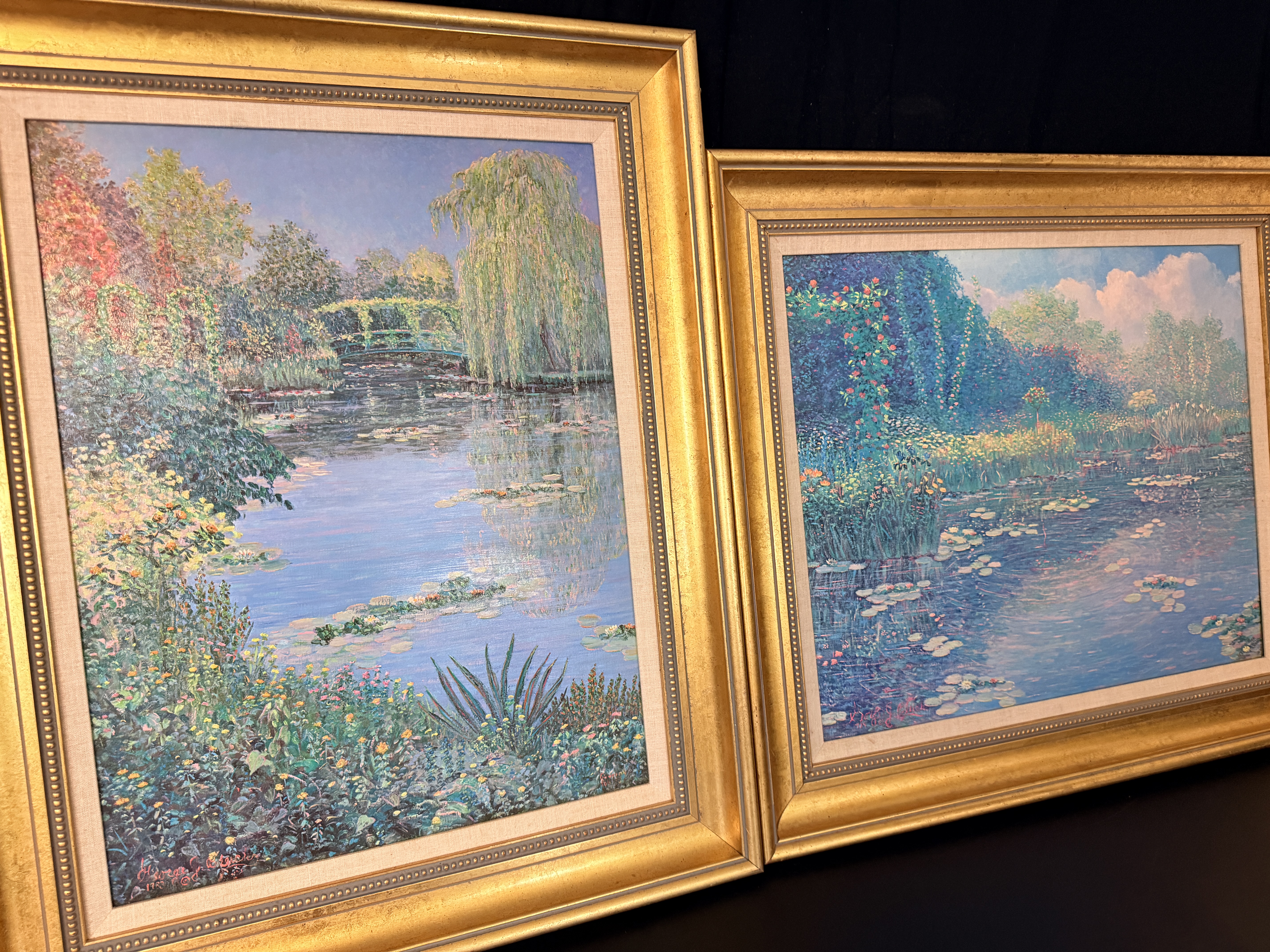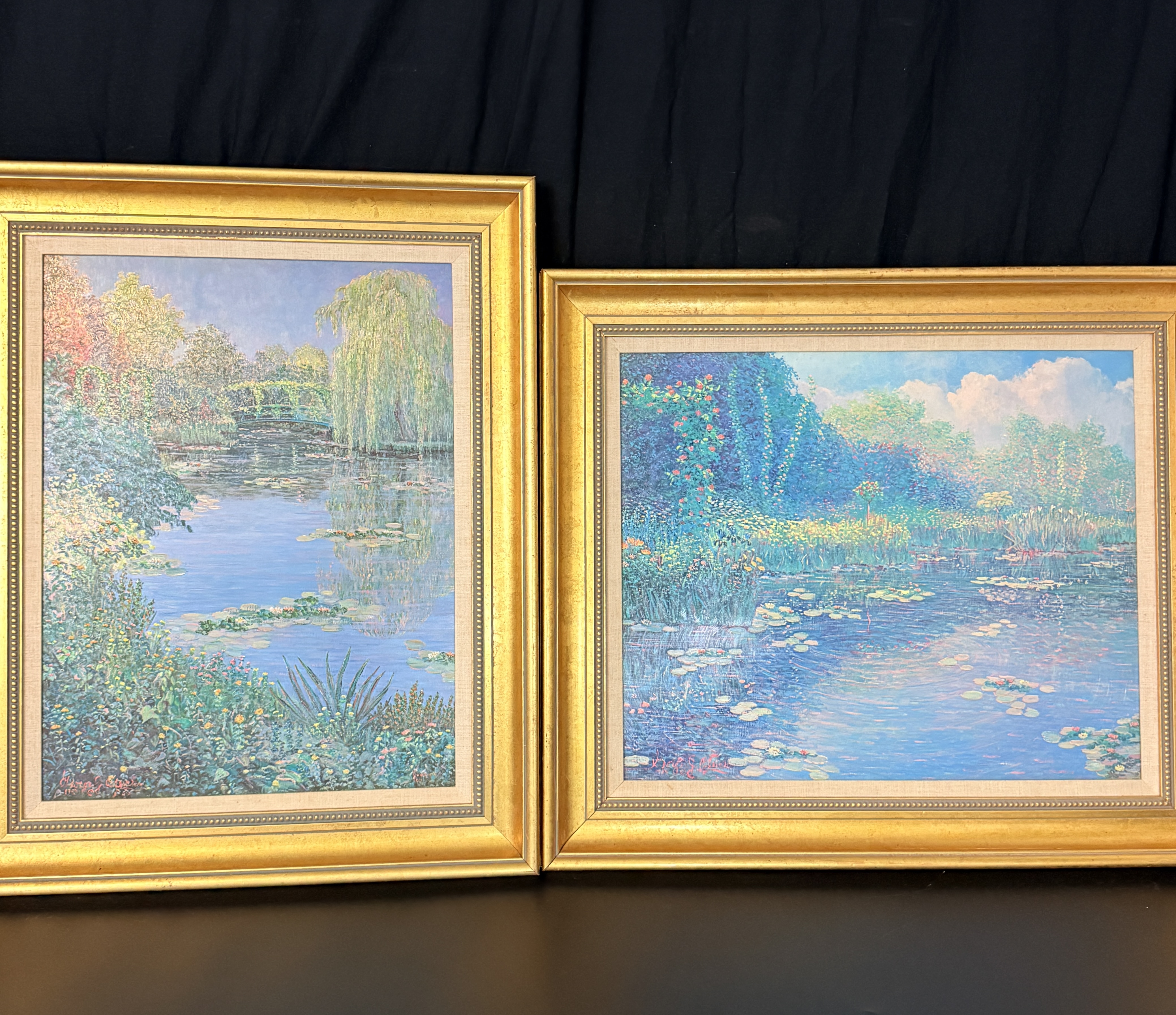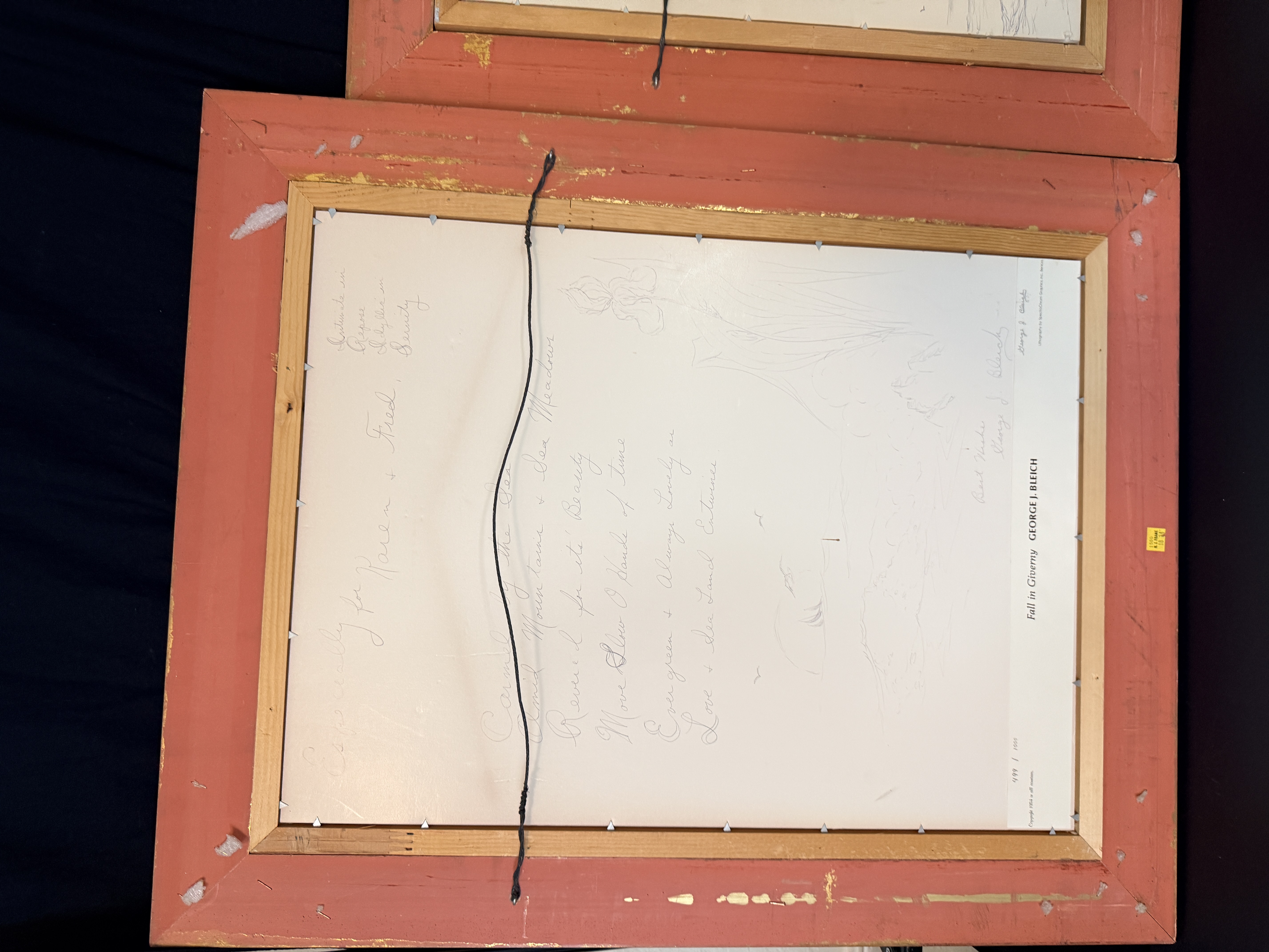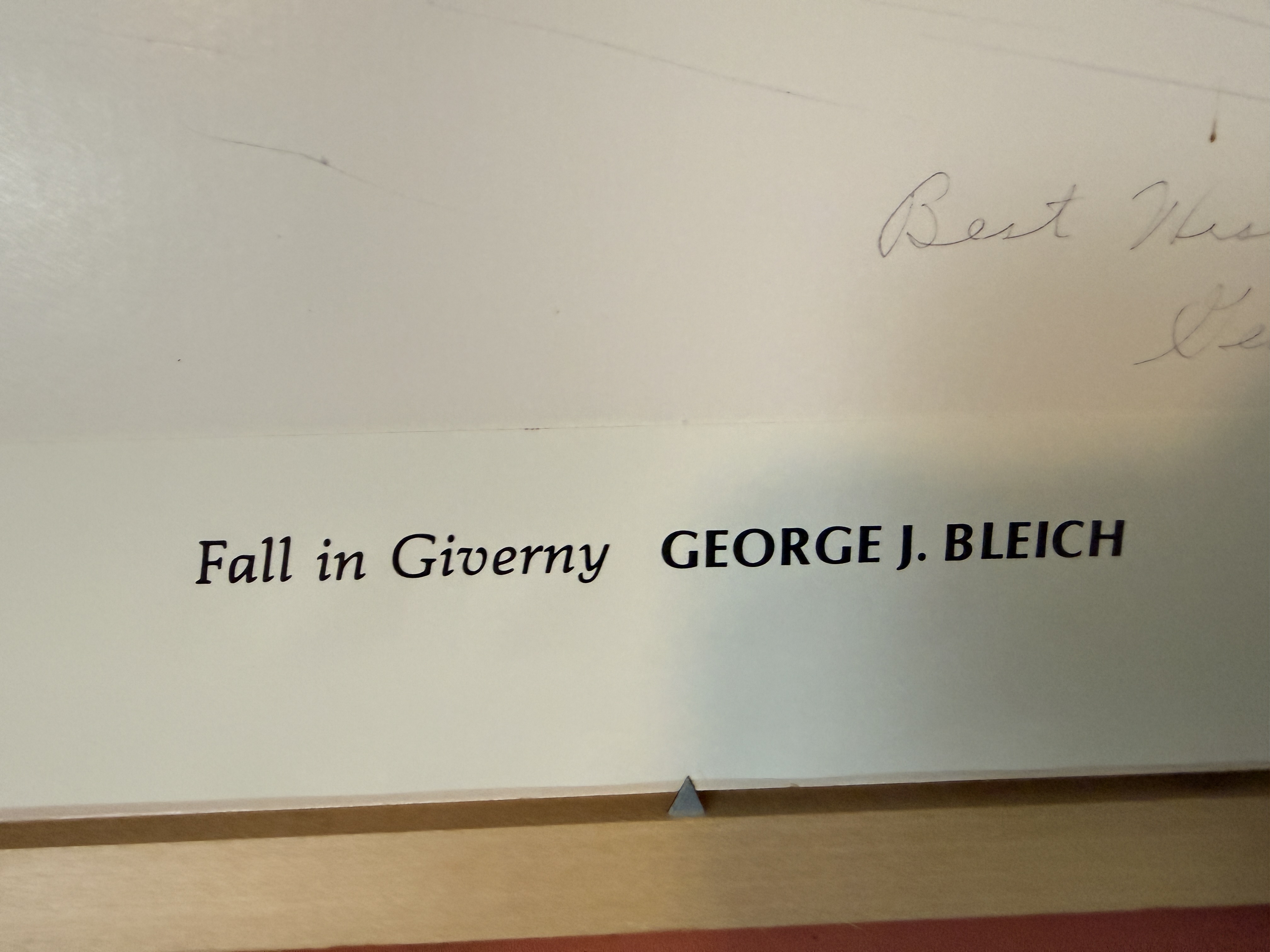 A pair of framed lithographic prints by American artist George J. Bleich depicting Impressionist-style landscapes of Claude Monet’s gardens at Giverny. The scenes include a Japanese footbridge, lily ponds, and weeping willows. Each work is signed and dated by the artist in the lower corner, with dates of 1983 and 1984. One print is titled Fall in Giverny and is marked as edition 499/1000 with a 1984 copyright. The reverse of each piece contains extensive hand-written inscriptions by the artist, including poetry, personal dedications, references to Carmel By The Sea and original sketches of floral and coastal motifs. The prints are presented in ornate gold-toned frames with beaded inner borders and fabric-textured mats.
