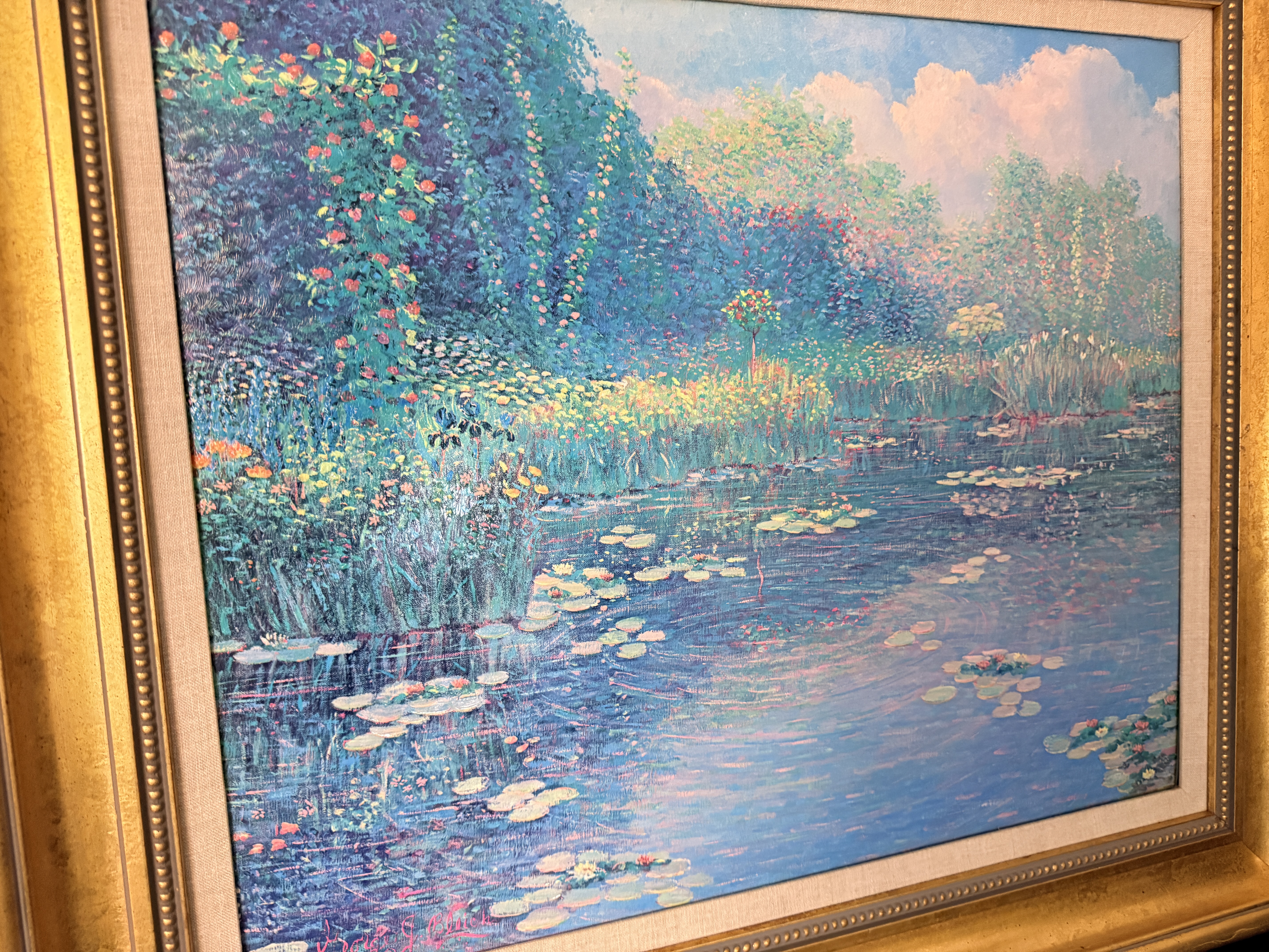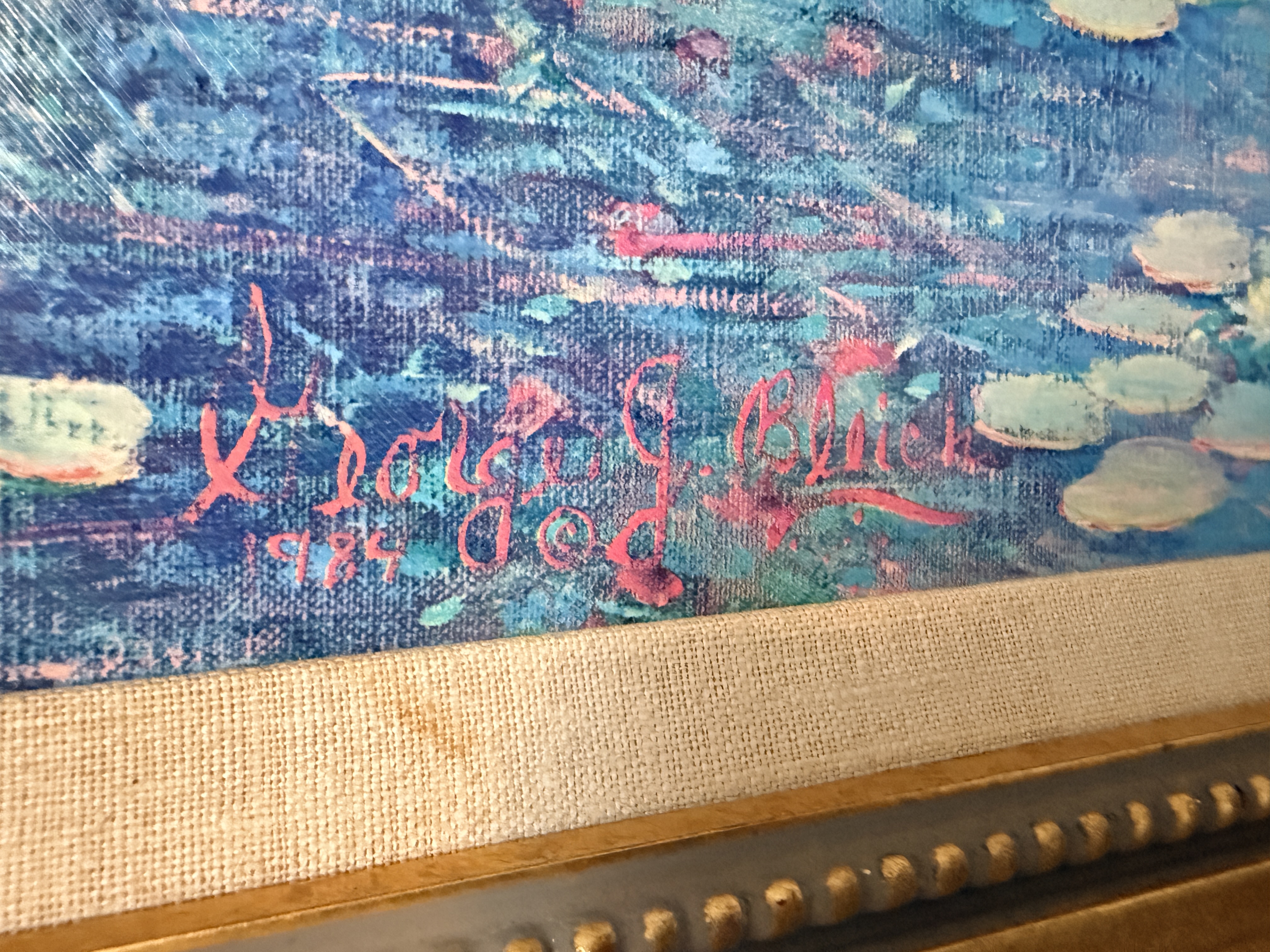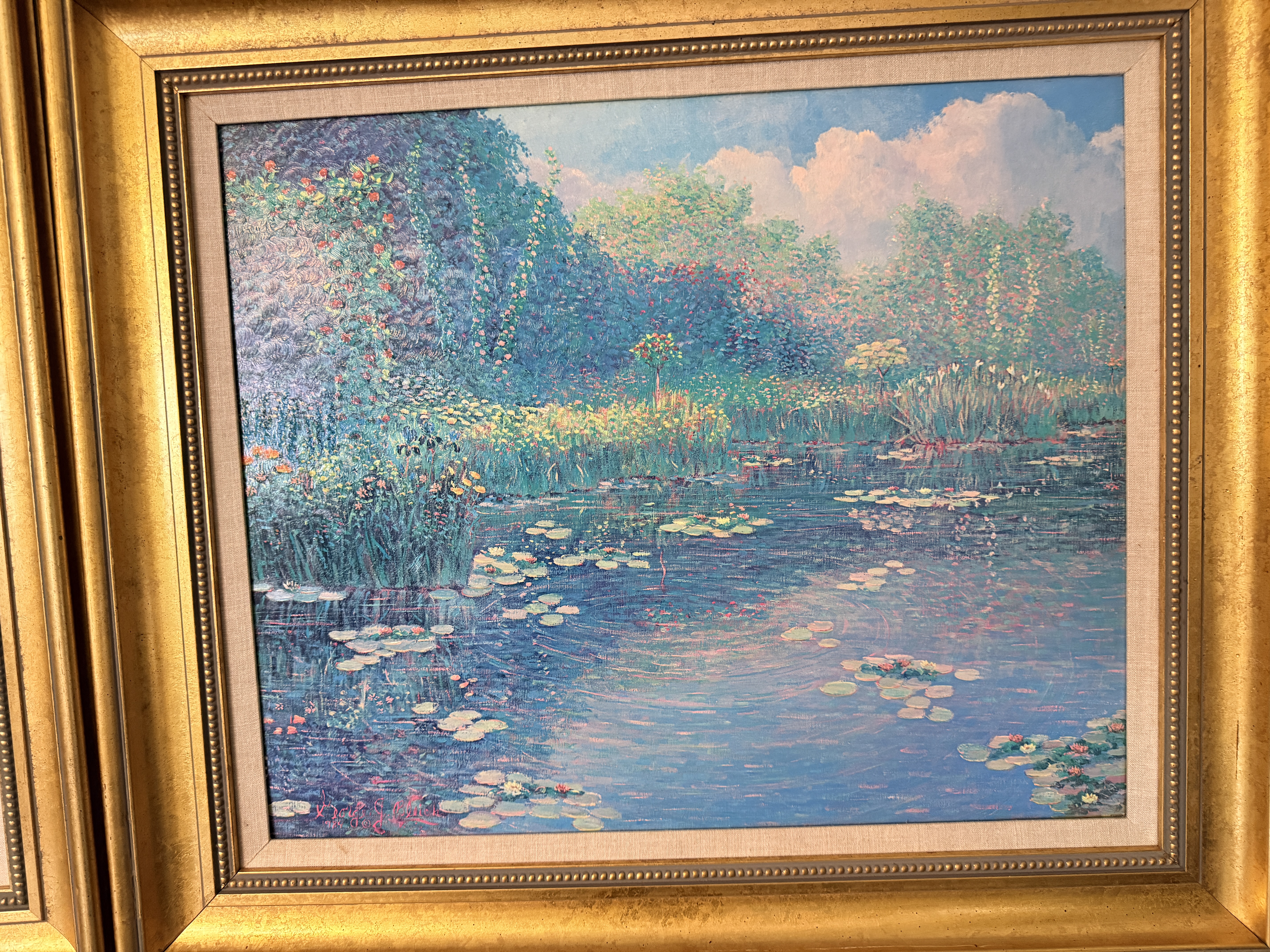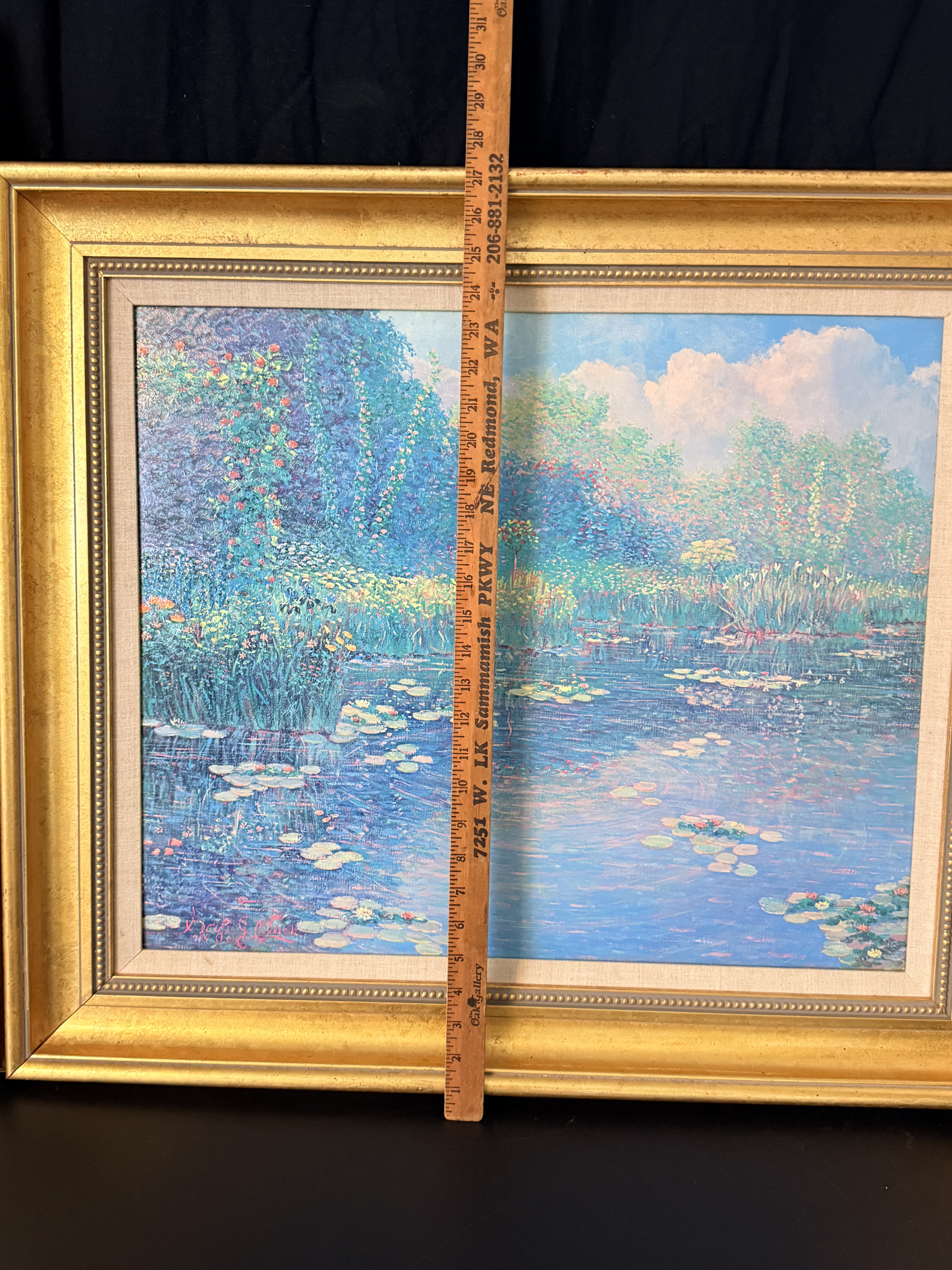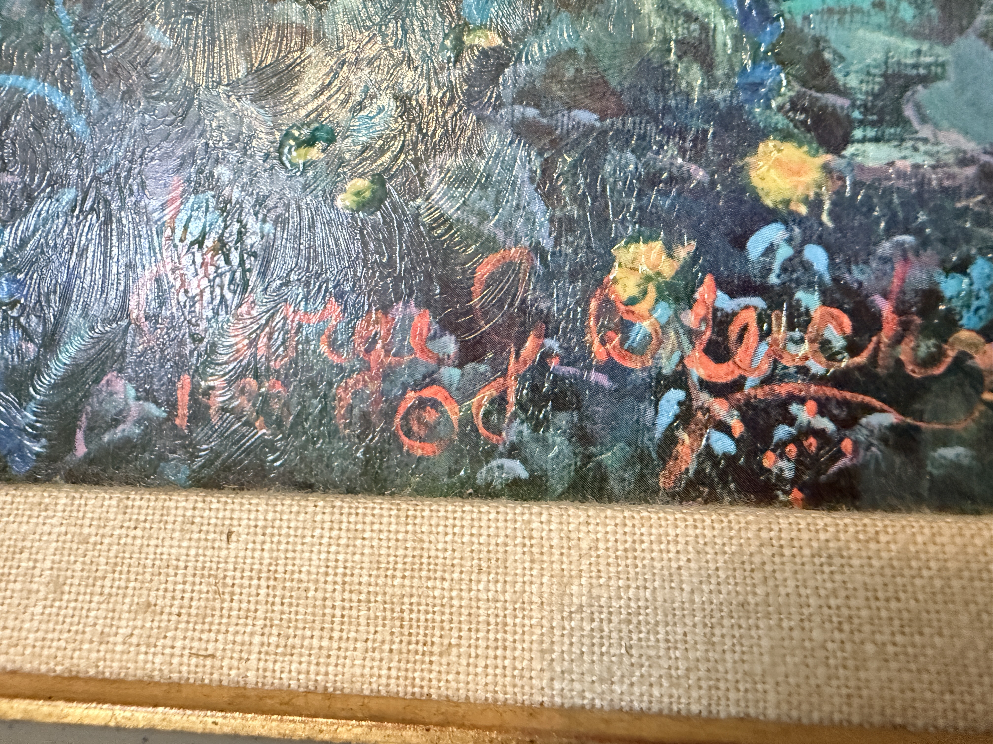 A pair of framed lithographic prints by American artist George J. Bleich depicting Impressionist-style landscapes of Claude Monet’s gardens at Giverny. The scenes include a Japanese footbridge, lily ponds, and weeping willows. Each work is signed and dated by the artist in the lower corner, with dates of 1983 and 1984. One print is titled Fall in Giverny and is marked as edition 499/1000 with a 1984 copyright. The reverse of each piece contains extensive hand-written inscriptions by the artist, including poetry, personal dedications, references to Carmel By The Sea and original sketches of floral and coastal motifs. The prints are presented in ornate gold-toned frames with beaded inner borders and fabric-textured mats.