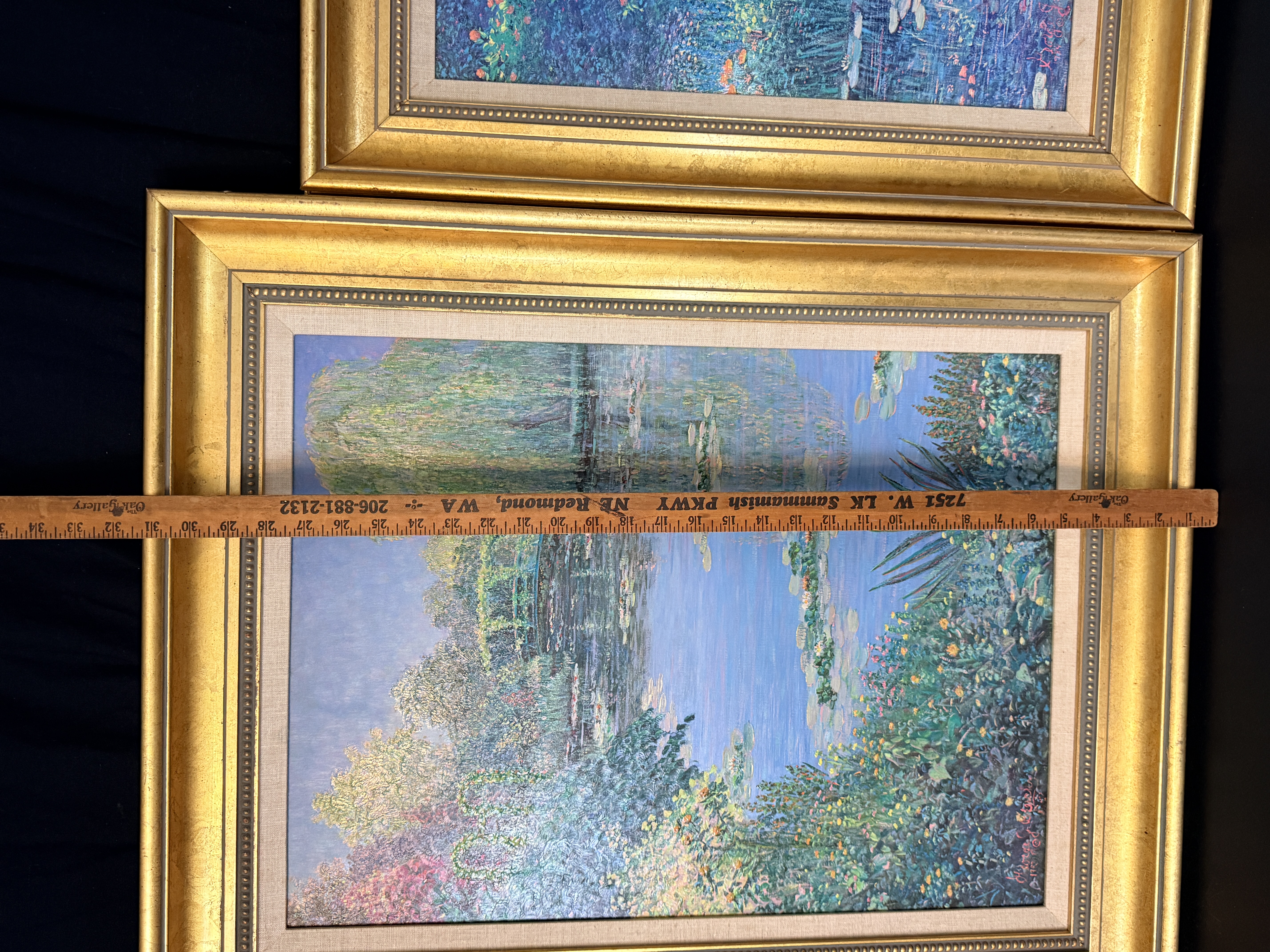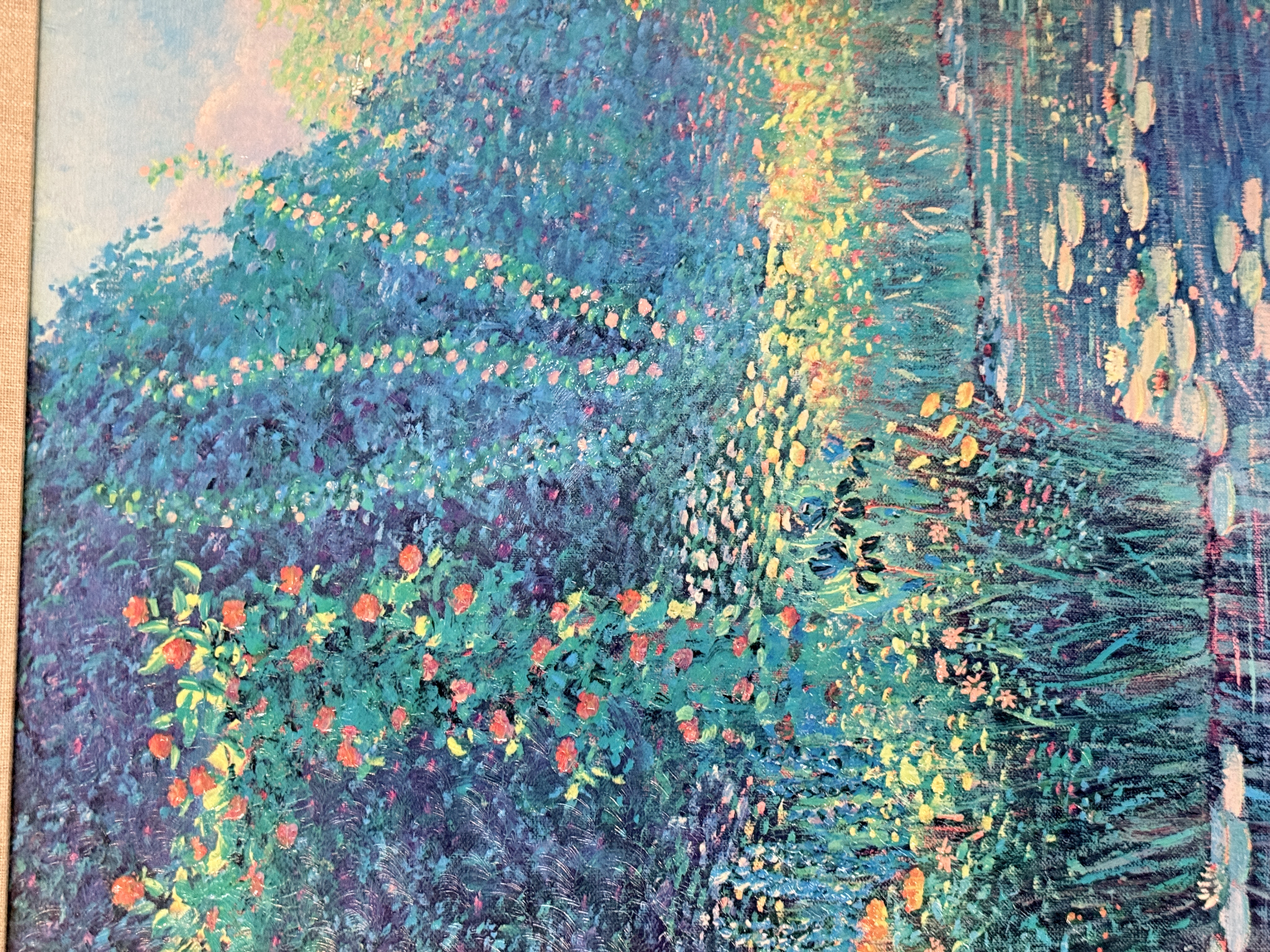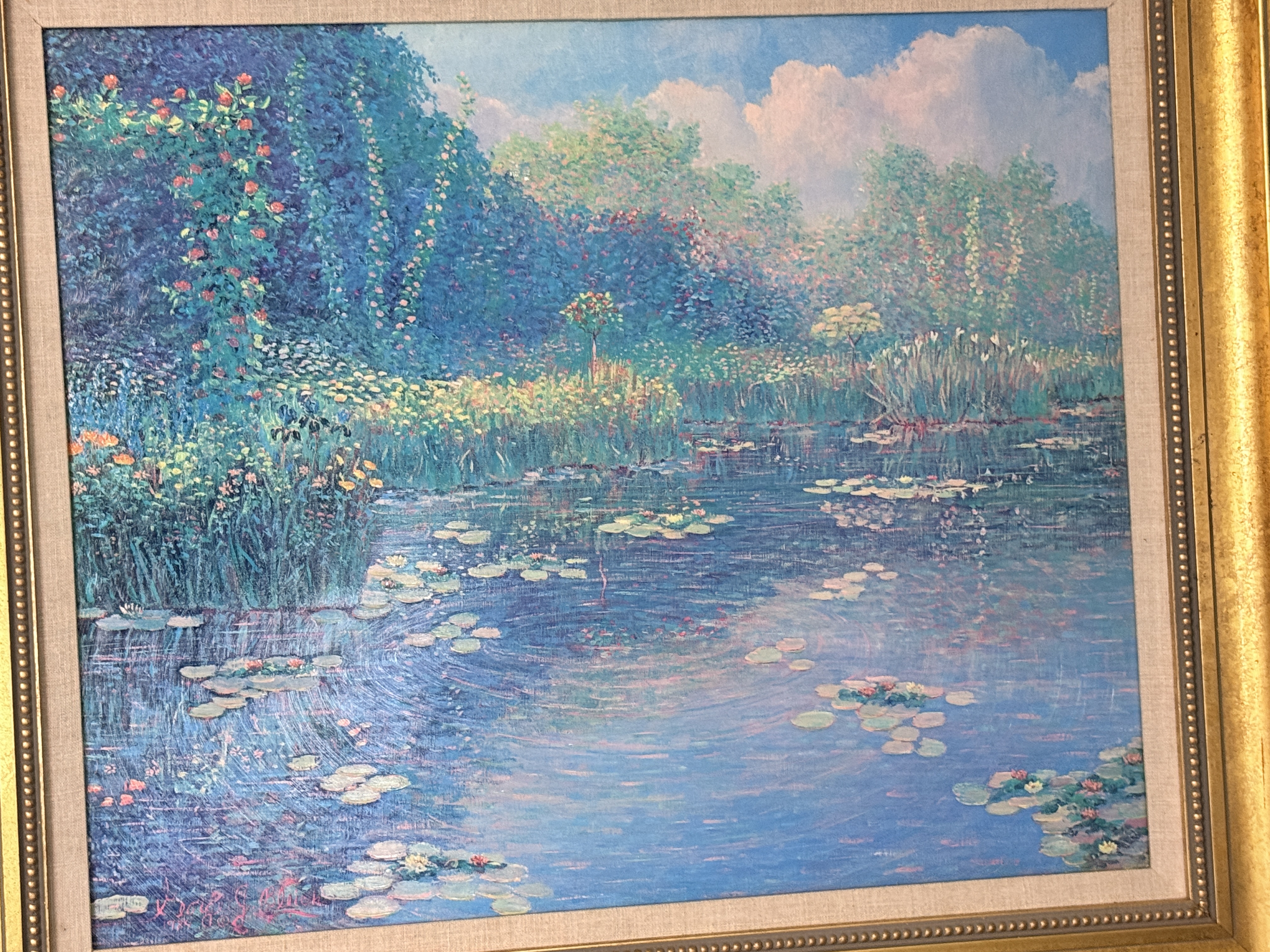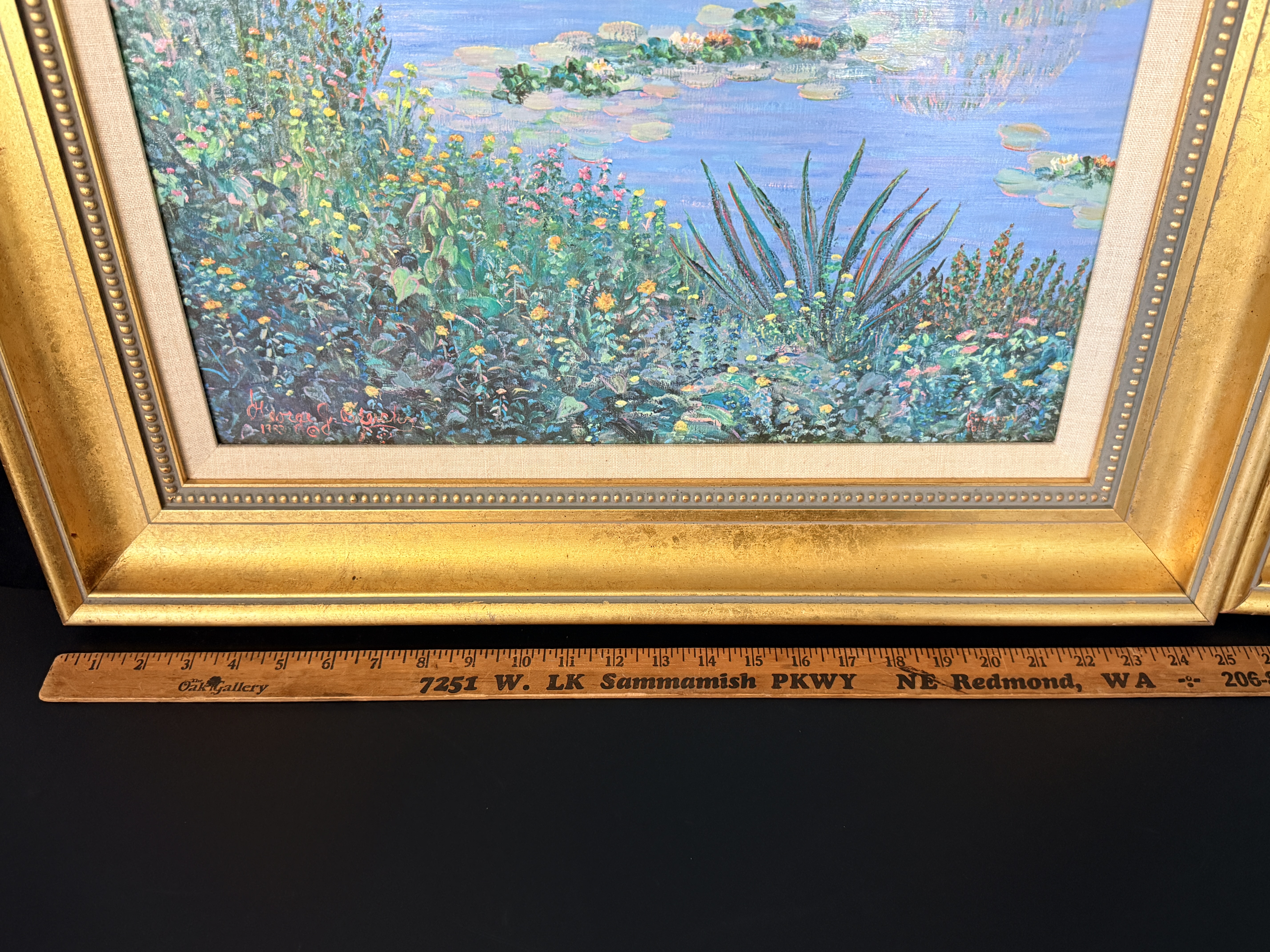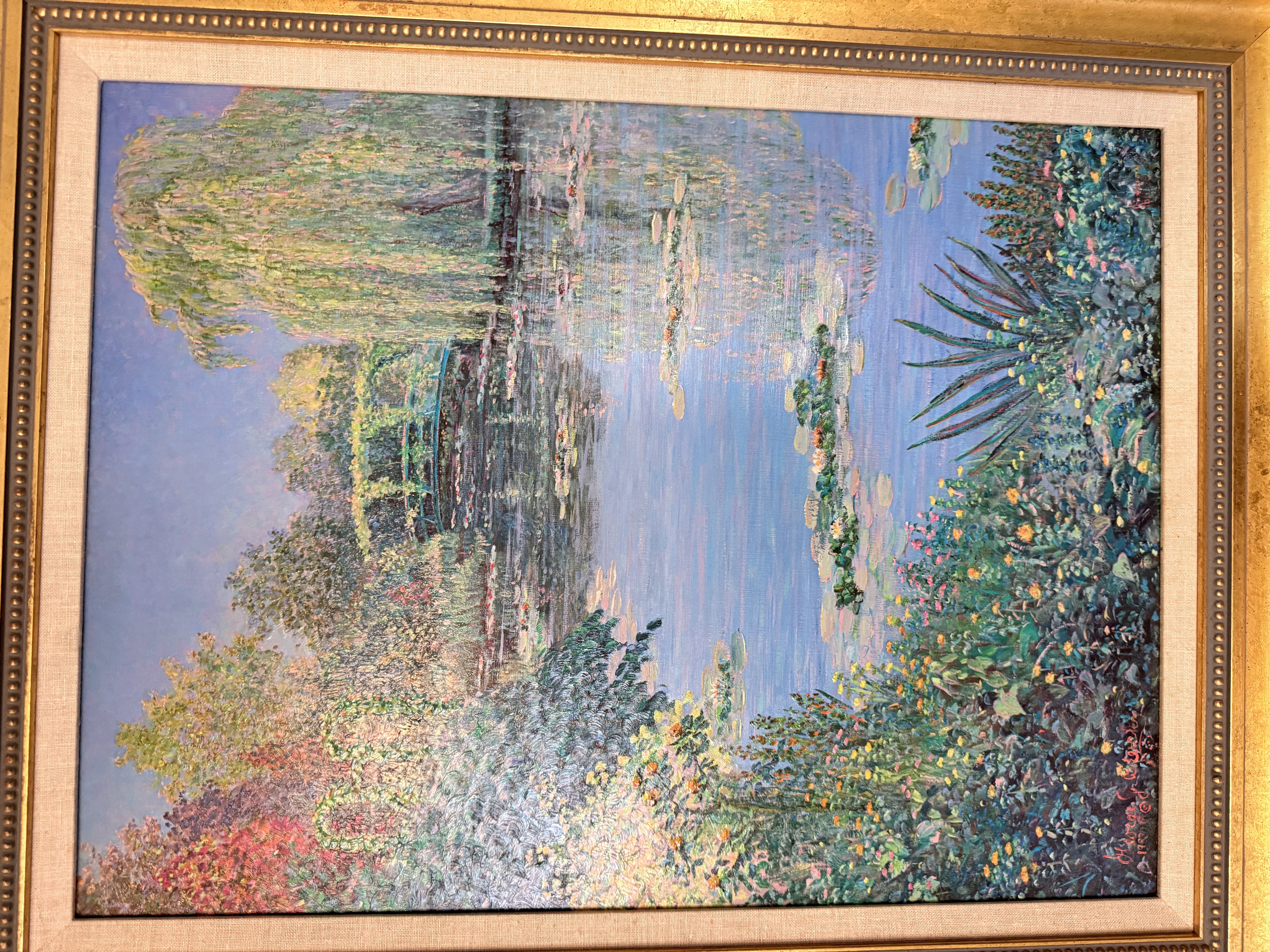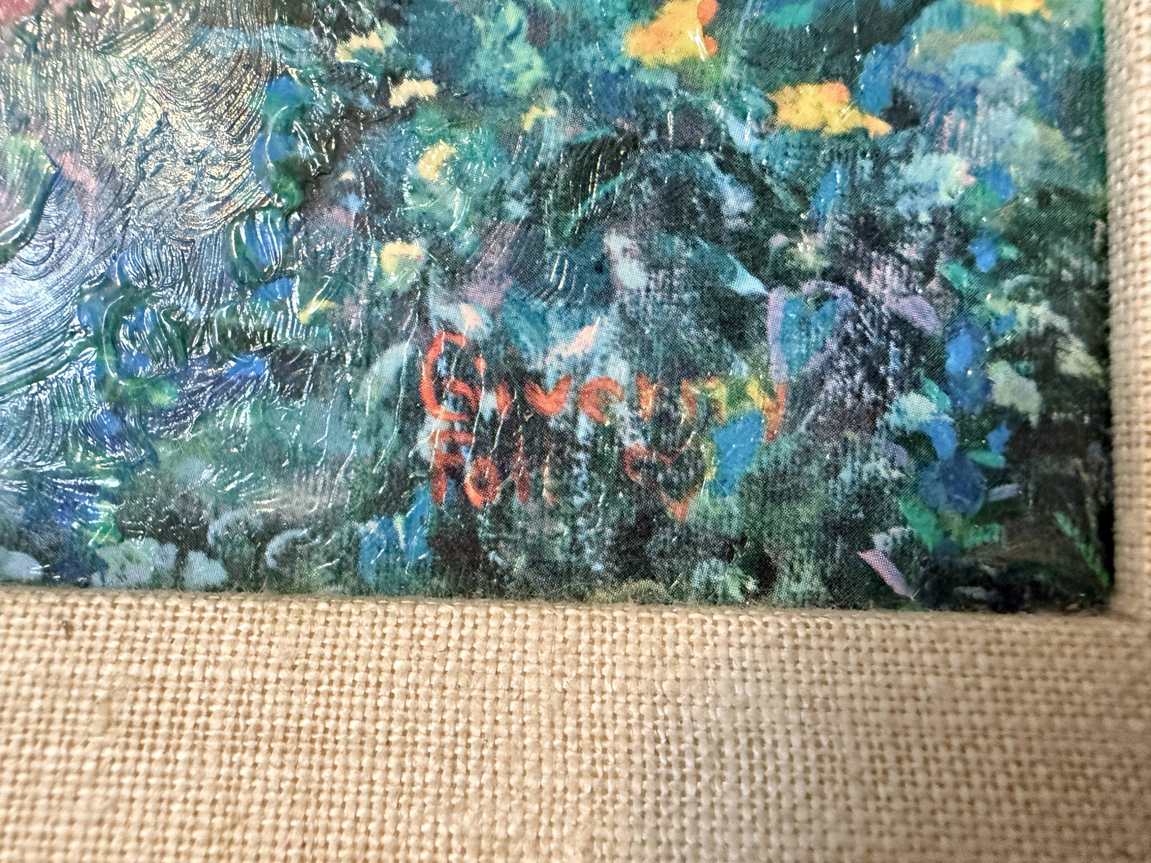 A pair of framed lithographic prints by American artist George J. Bleich depicting Impressionist-style landscapes of Claude Monet’s gardens at Giverny. The scenes include a Japanese footbridge, lily ponds, and weeping willows. Each work is signed and dated by the artist in the lower corner, with dates of 1983 and 1984. One print is titled Fall in Giverny and is marked as edition 499/1000 with a 1984 copyright. The reverse of each piece contains extensive hand-written inscriptions by the artist, including poetry, personal dedications, references to Carmel By The Sea and original sketches of floral and coastal motifs. The prints are presented in ornate gold-toned frames with beaded inner borders and fabric-textured mats.