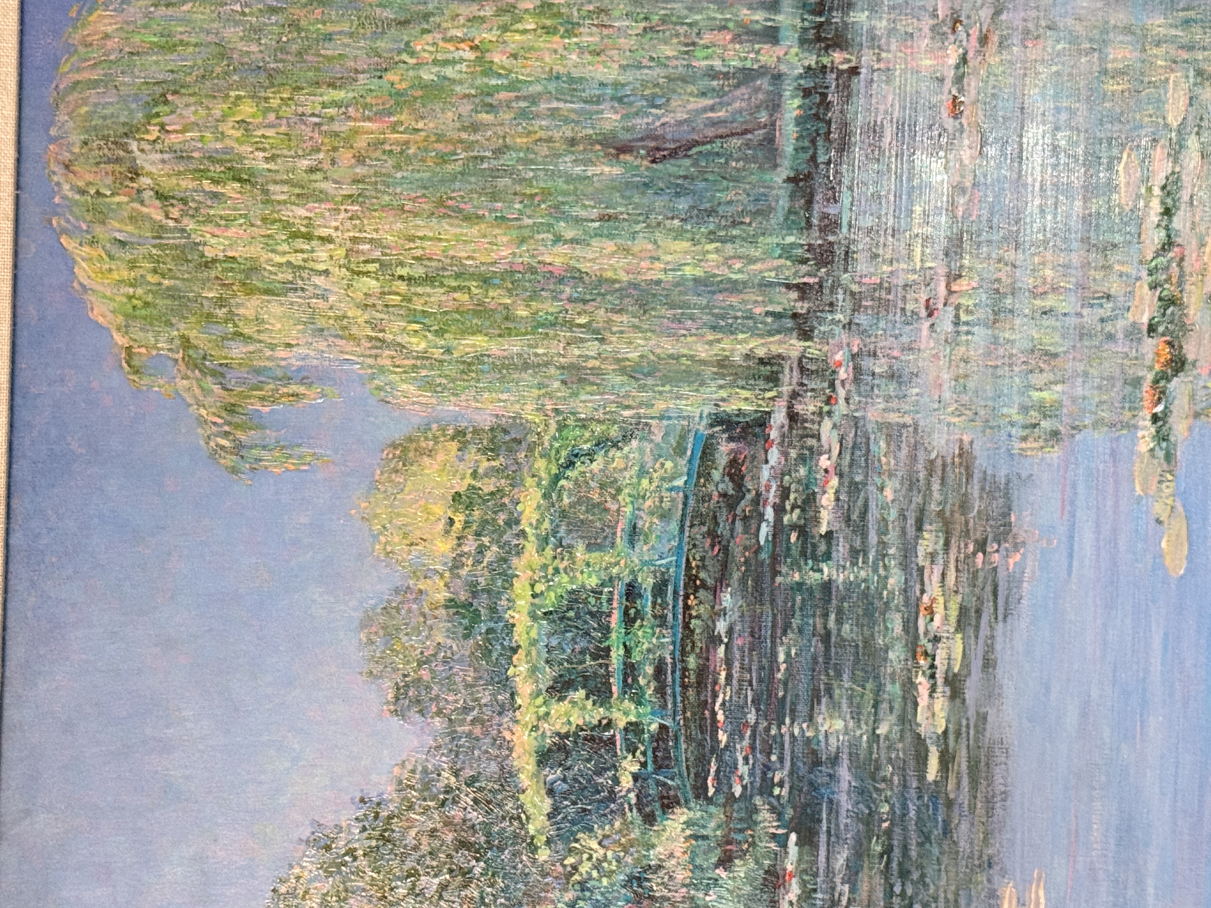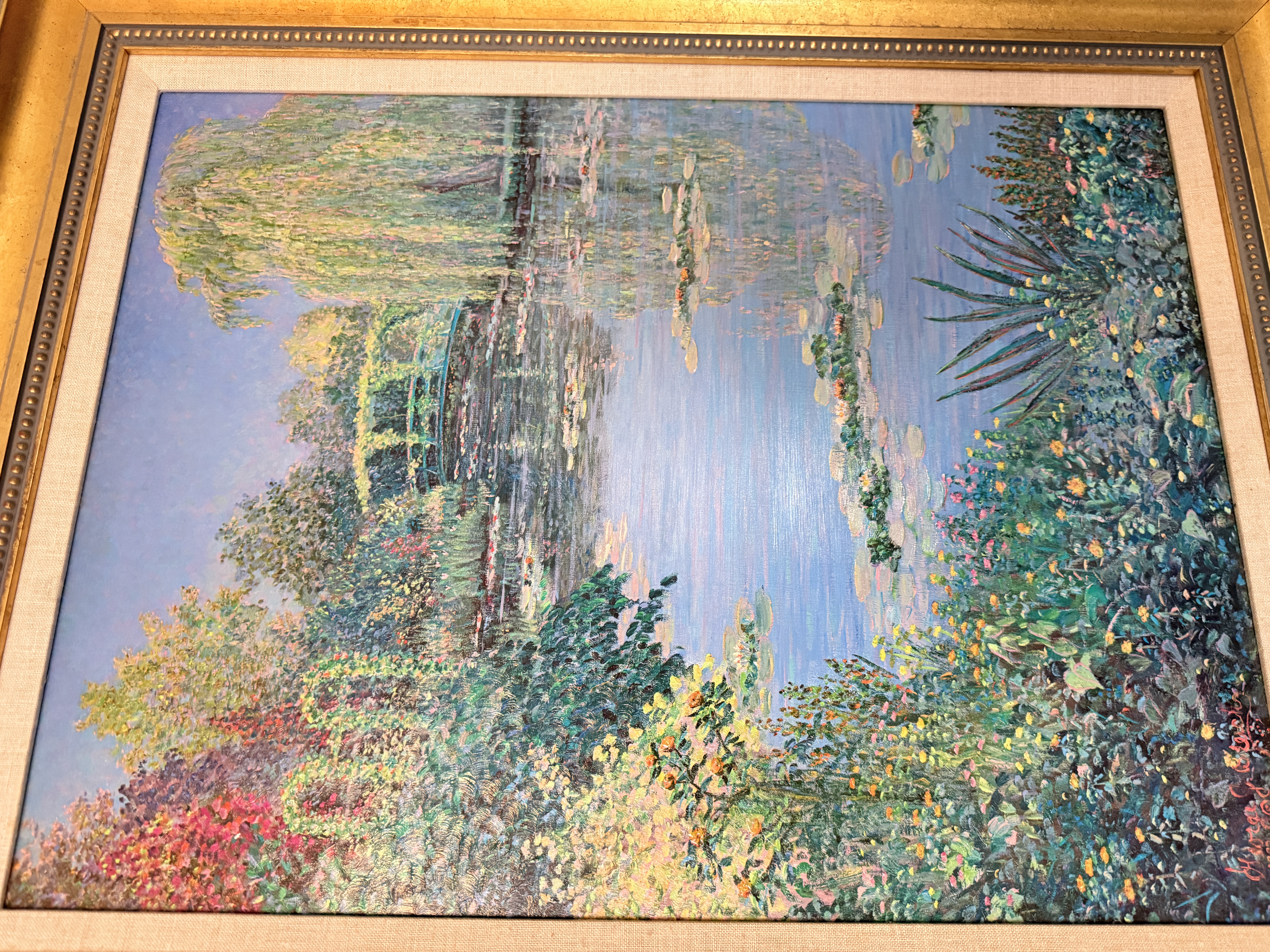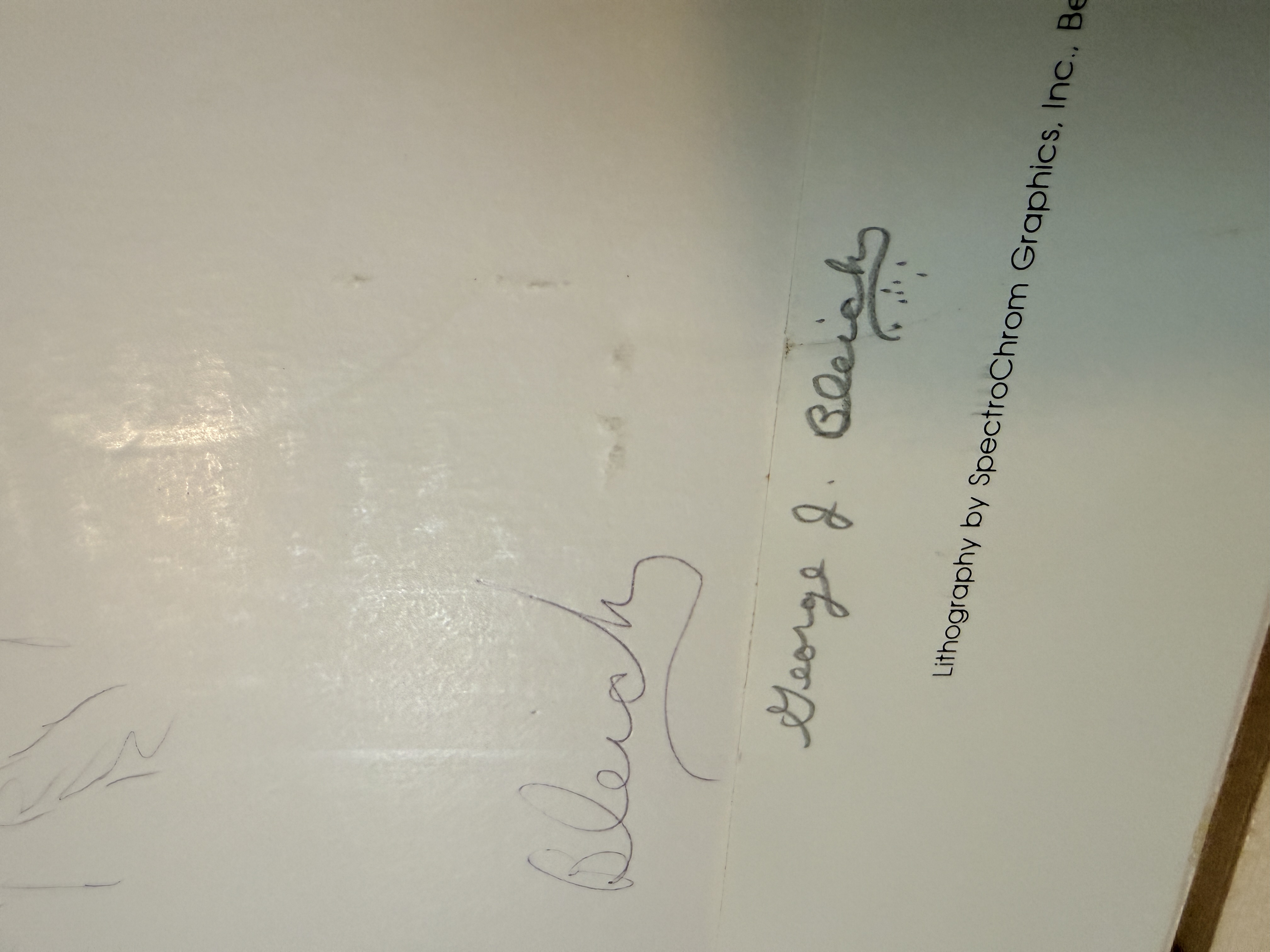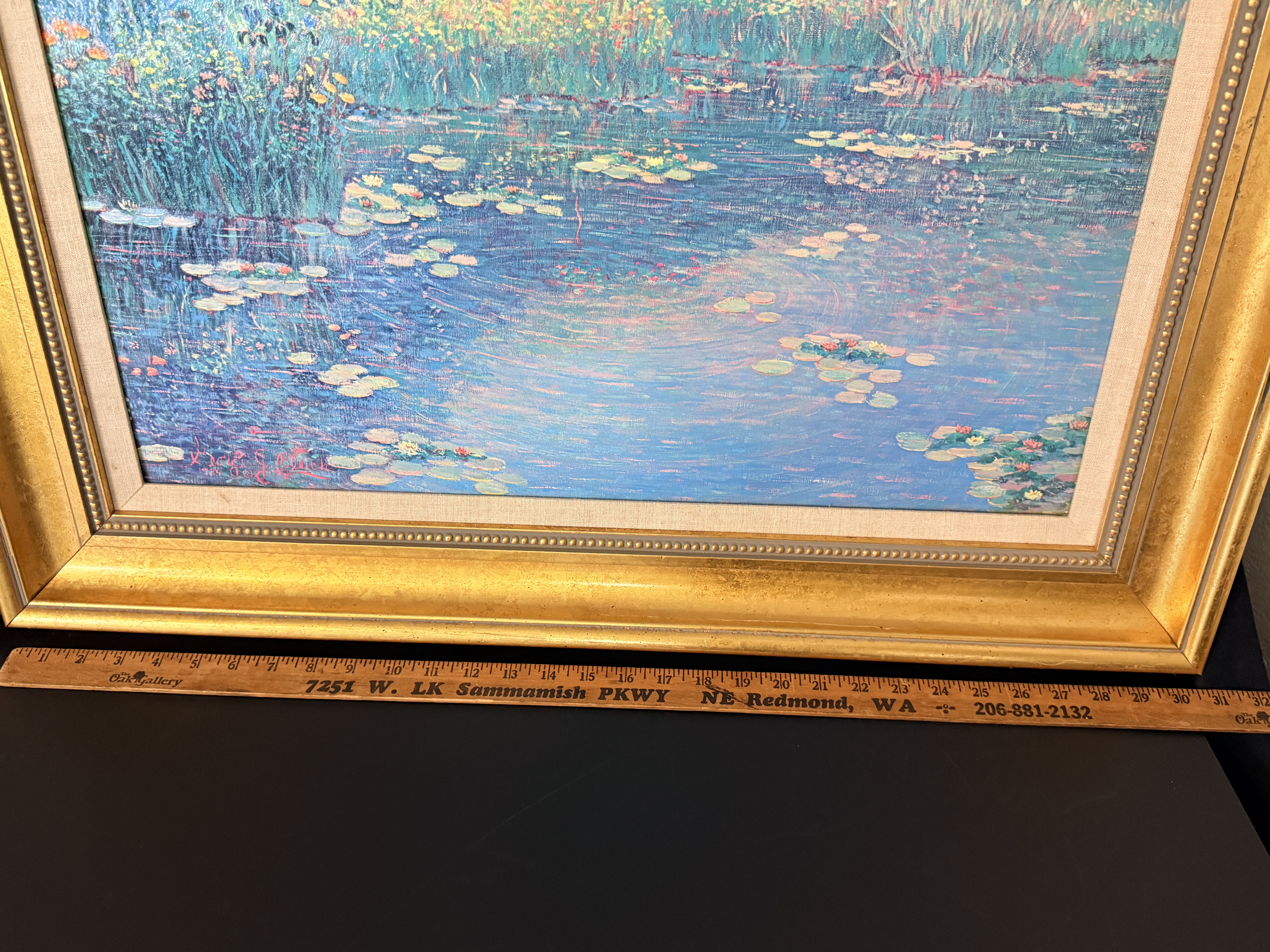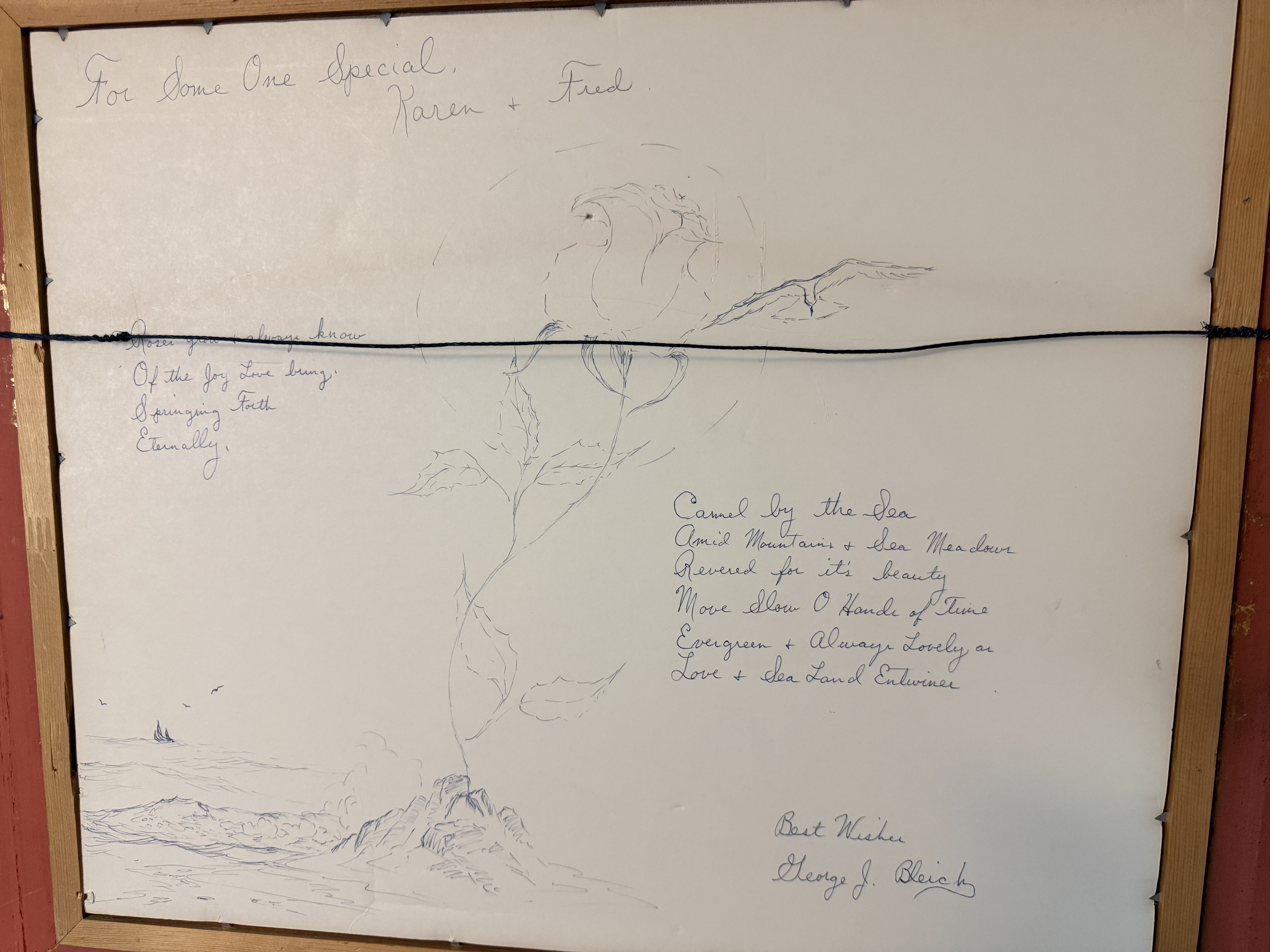A pair of framed lithographic prints by American artist George J. Bleich depicting Impressionist-style landscapes of Claude Monet’s gardens at Giverny. The scenes include a Japanese footbridge, lily ponds, and weeping willows. Each work is signed and dated by the artist in the lower corner, with dates of 1983 and 1984. One print is titled Fall in Giverny and is marked as edition 499/1000 with a 1984 copyright. The reverse of each piece contains extensive hand-written inscriptions by the artist, including poetry, personal dedications, references to Carmel By The Sea and original sketches of floral and coastal motifs. The prints are presented in ornate gold-toned frames with beaded inner borders and fabric-textured mats.
