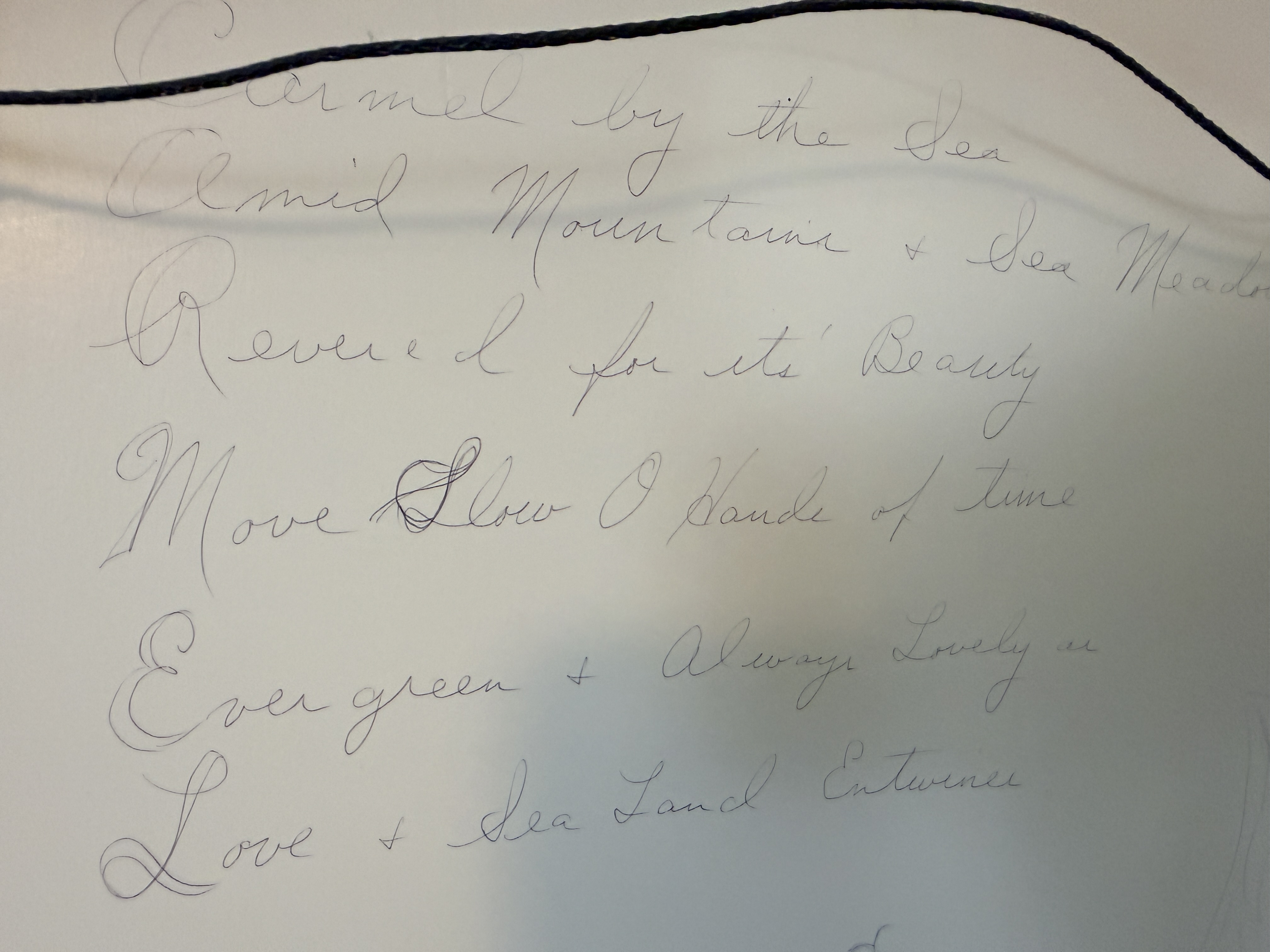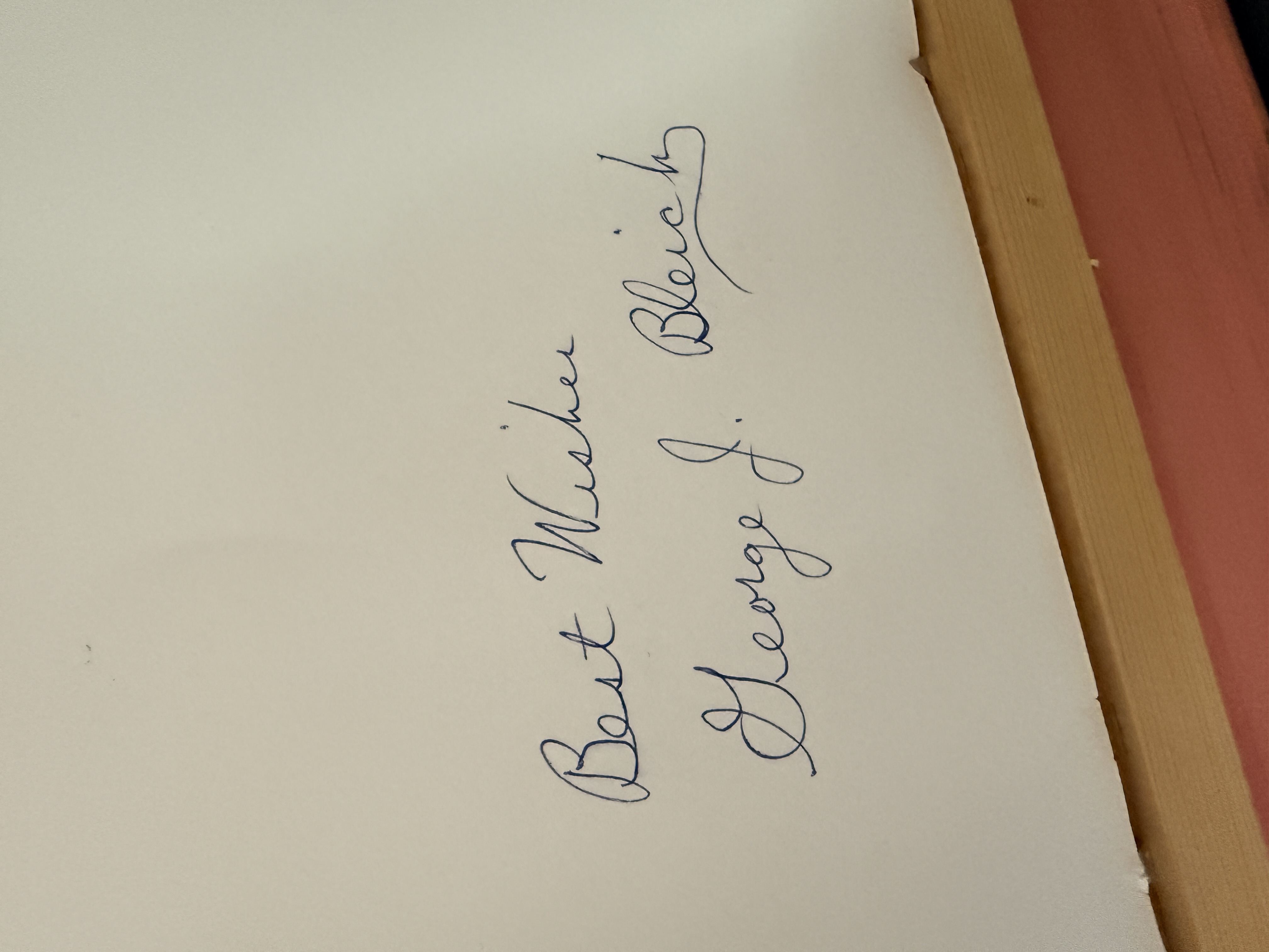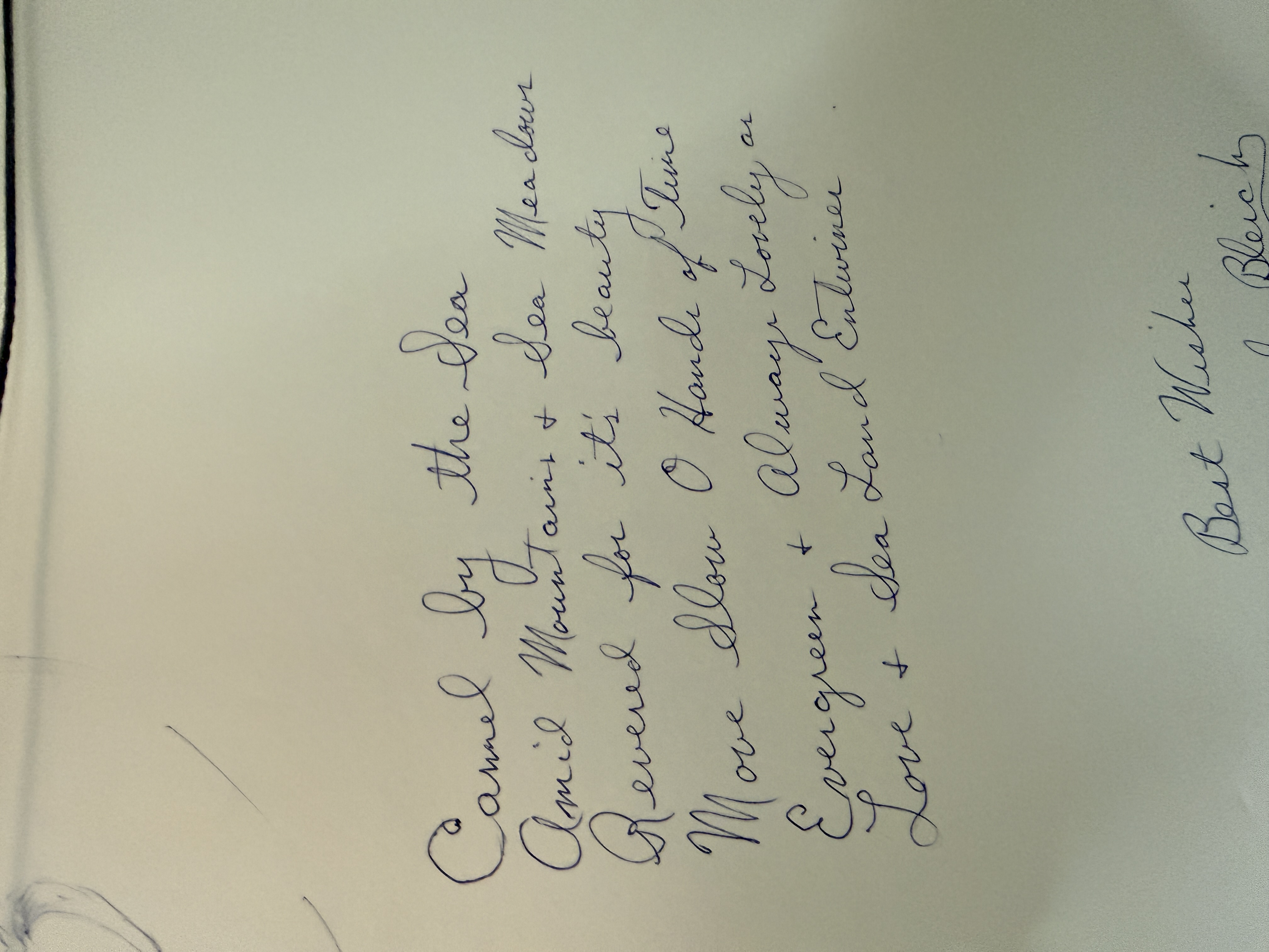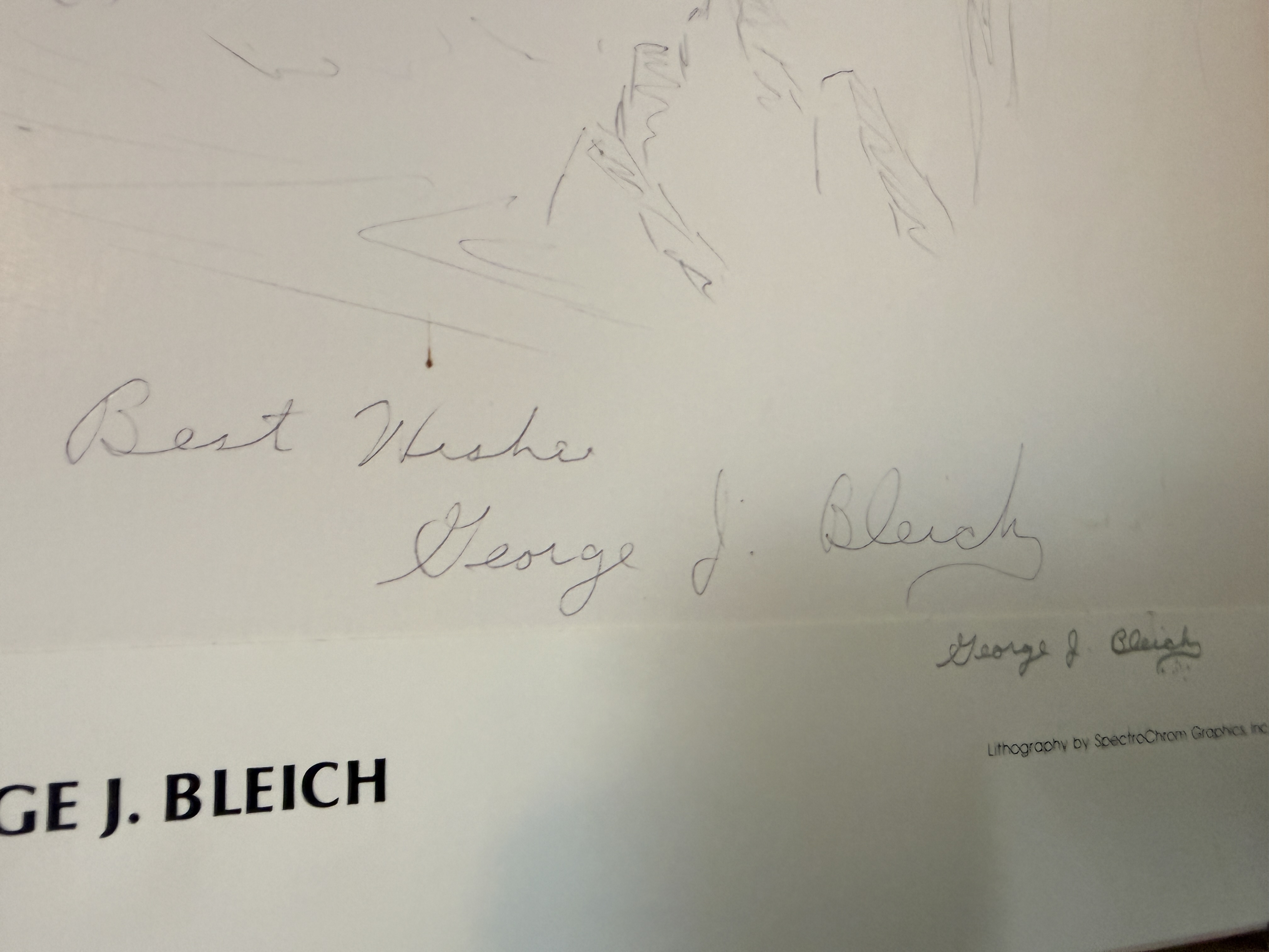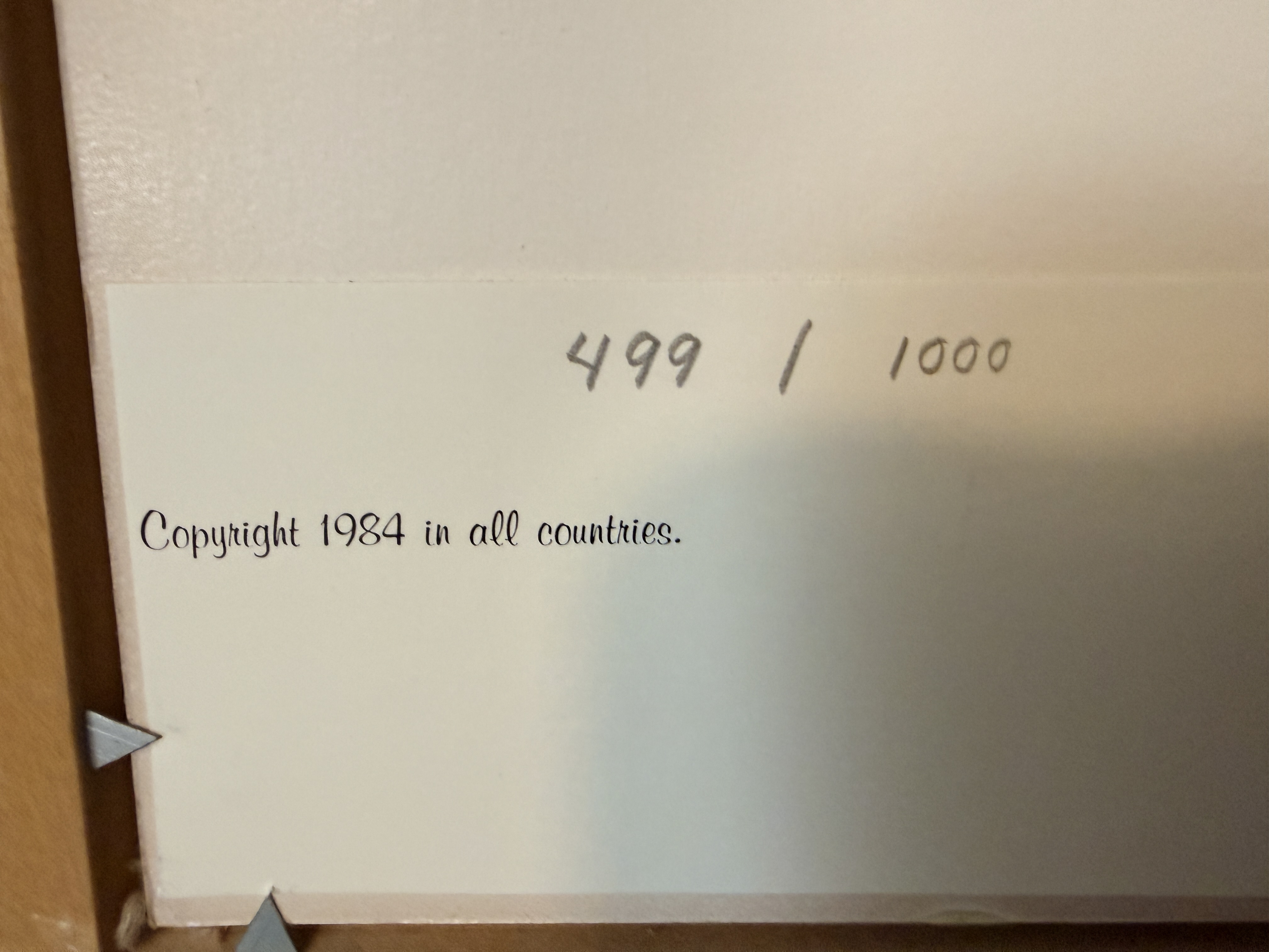 A pair of framed lithographic prints by American artist George J. Bleich depicting Impressionist-style landscapes of Claude Monet’s gardens at Giverny. The scenes include a Japanese footbridge, lily ponds, and weeping willows. Each work is signed and dated by the artist in the lower corner, with dates of 1983 and 1984. One print is titled Fall in Giverny and is marked as edition 499/1000 with a 1984 copyright. The reverse of each piece contains extensive hand-written inscriptions by the artist, including poetry, personal dedications, references to Carmel By The Sea and original sketches of floral and coastal motifs. The prints are presented in ornate gold-toned frames with beaded inner borders and fabric-textured mats.