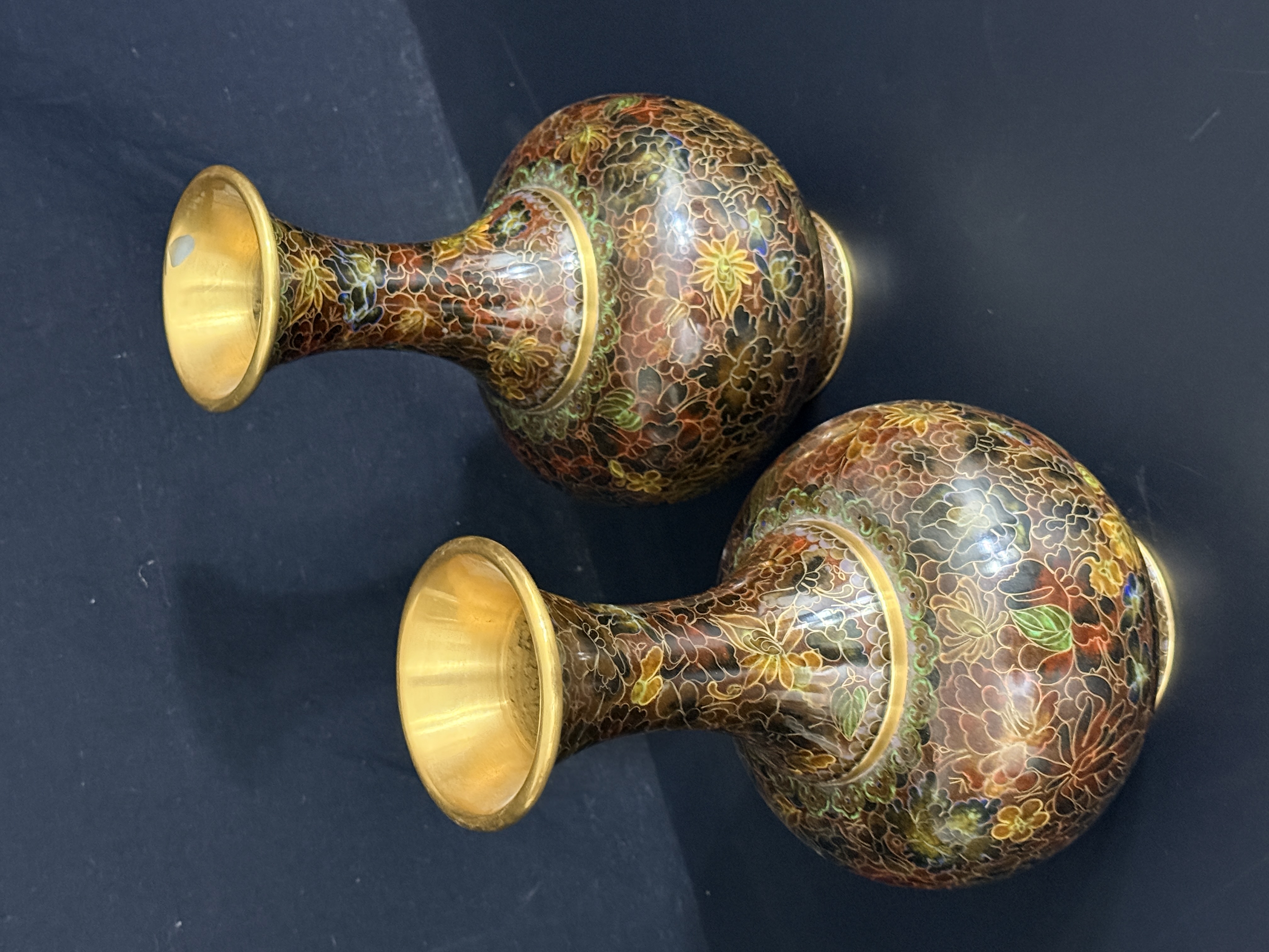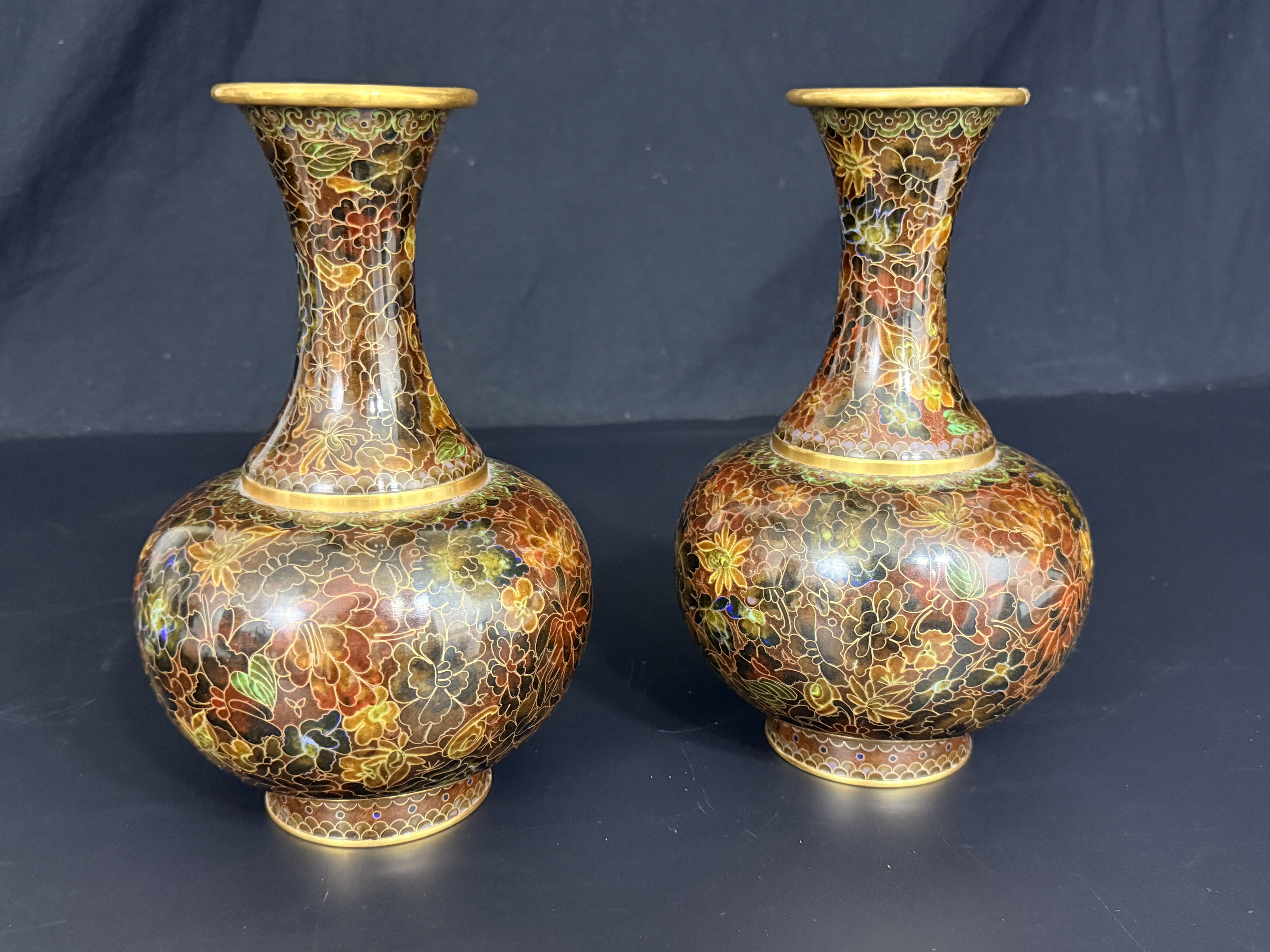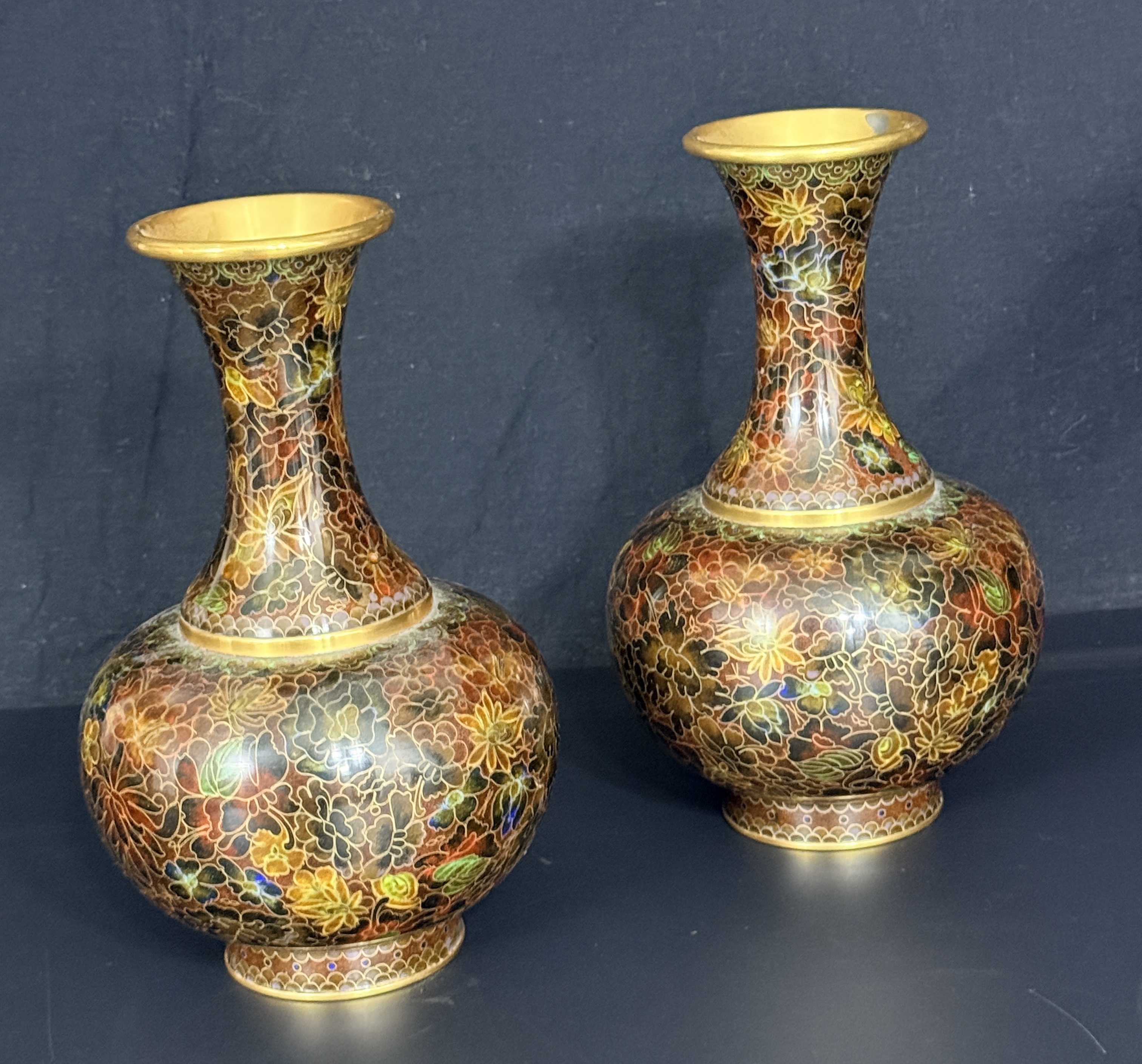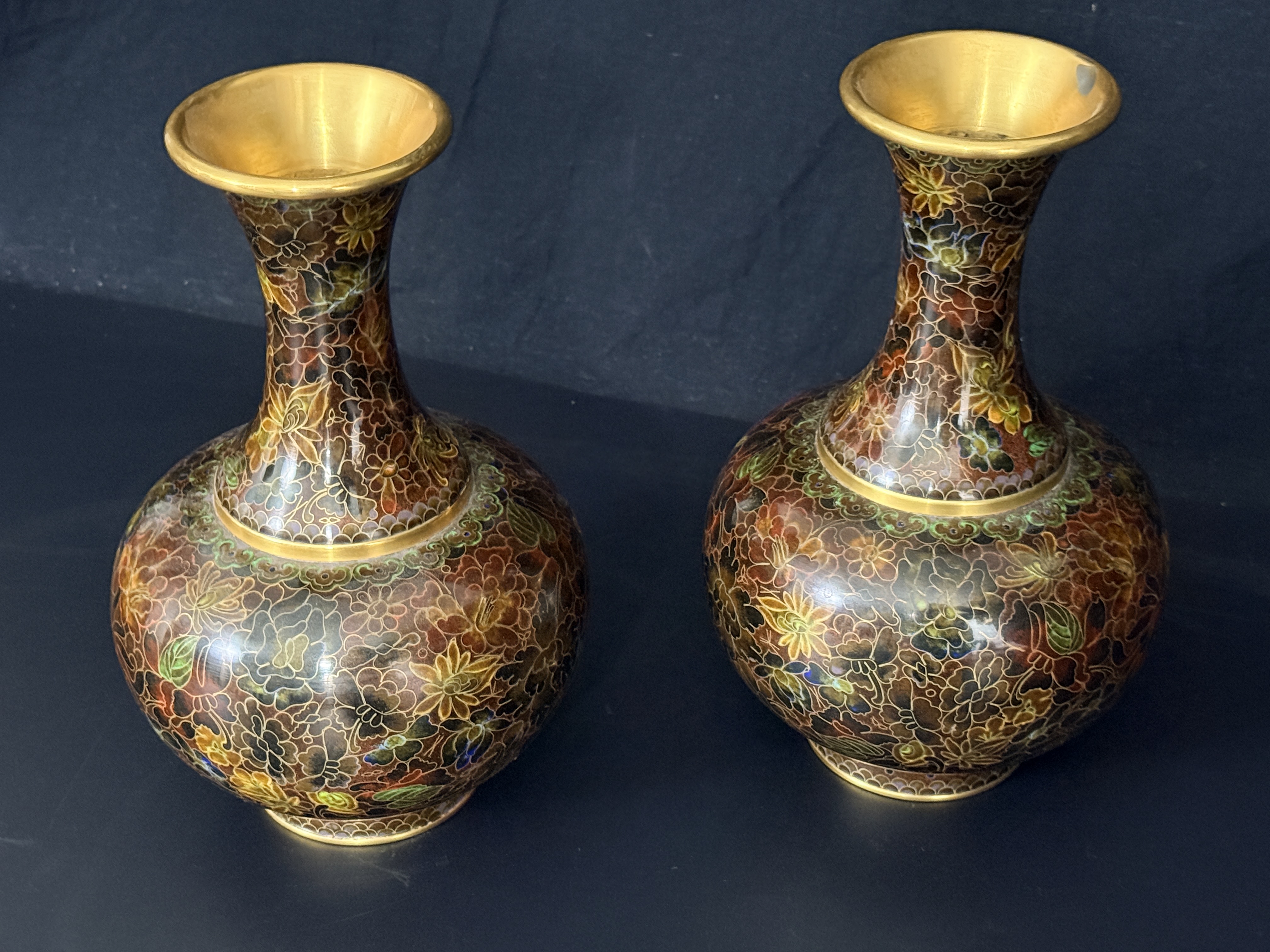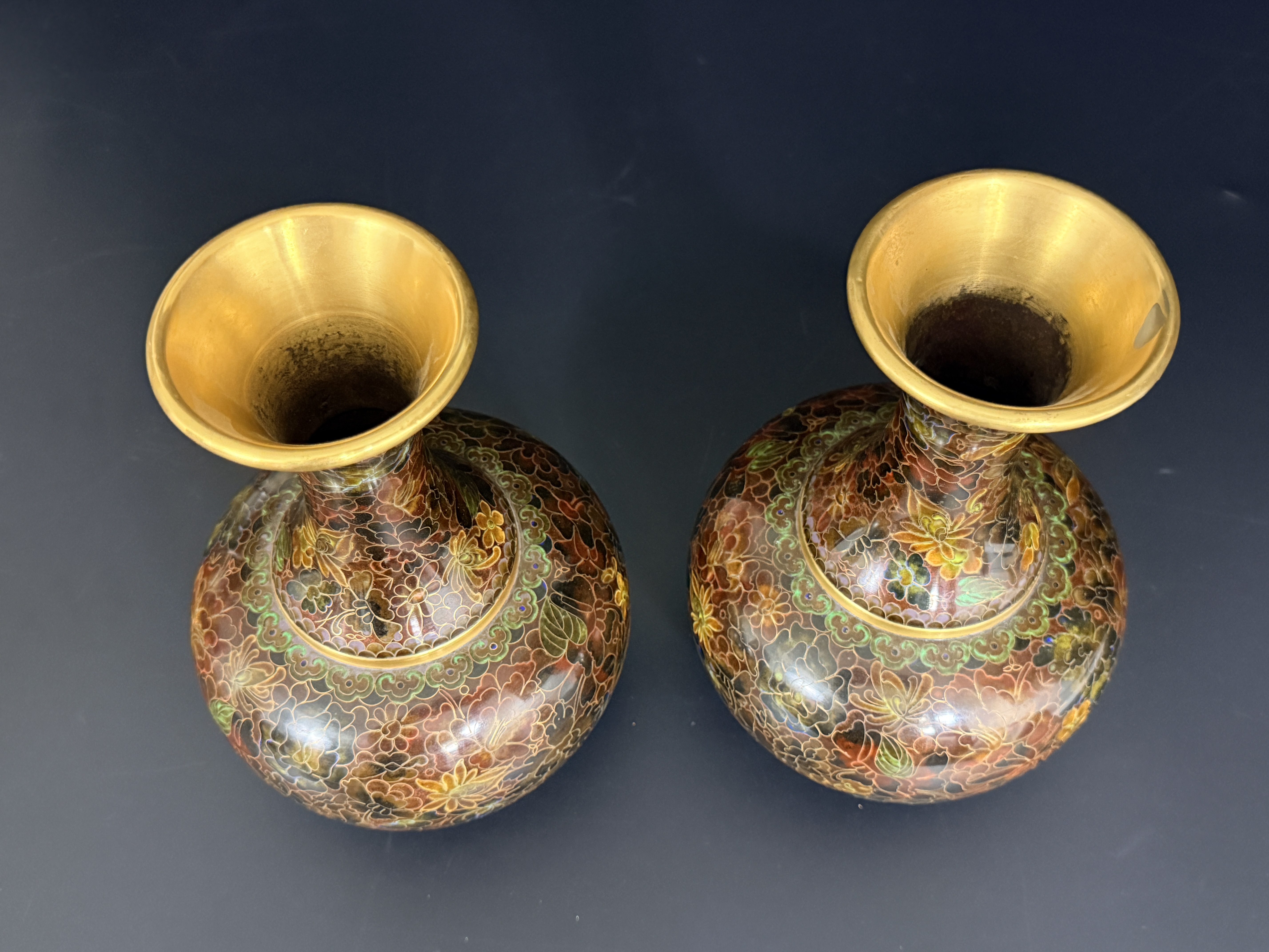 A pair of Chinese cloisonne enamel vases featuring a dense thousand flowers motif. Each vase is designed with a bulbous body, a slender tapering neck, and a wide flared rim, supported by a short circular foot. The decorative scheme consists of a multi-colored palette including red, yellow, green, and brown floral elements on a dark ground. The interior of the necks and the rims exhibit a polished brass finish. The undersides of the bases are finished in cobalt blue enamel. No maker’s marks or signatures are visible.