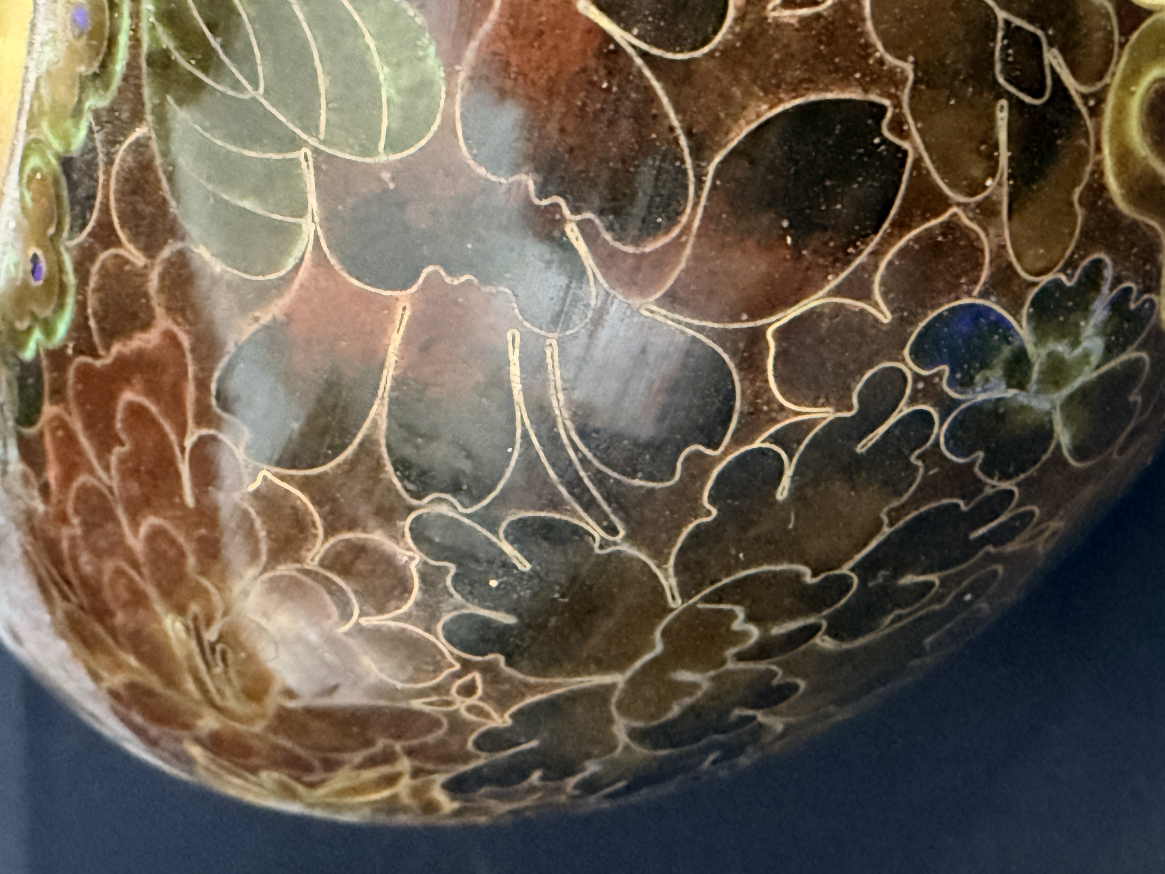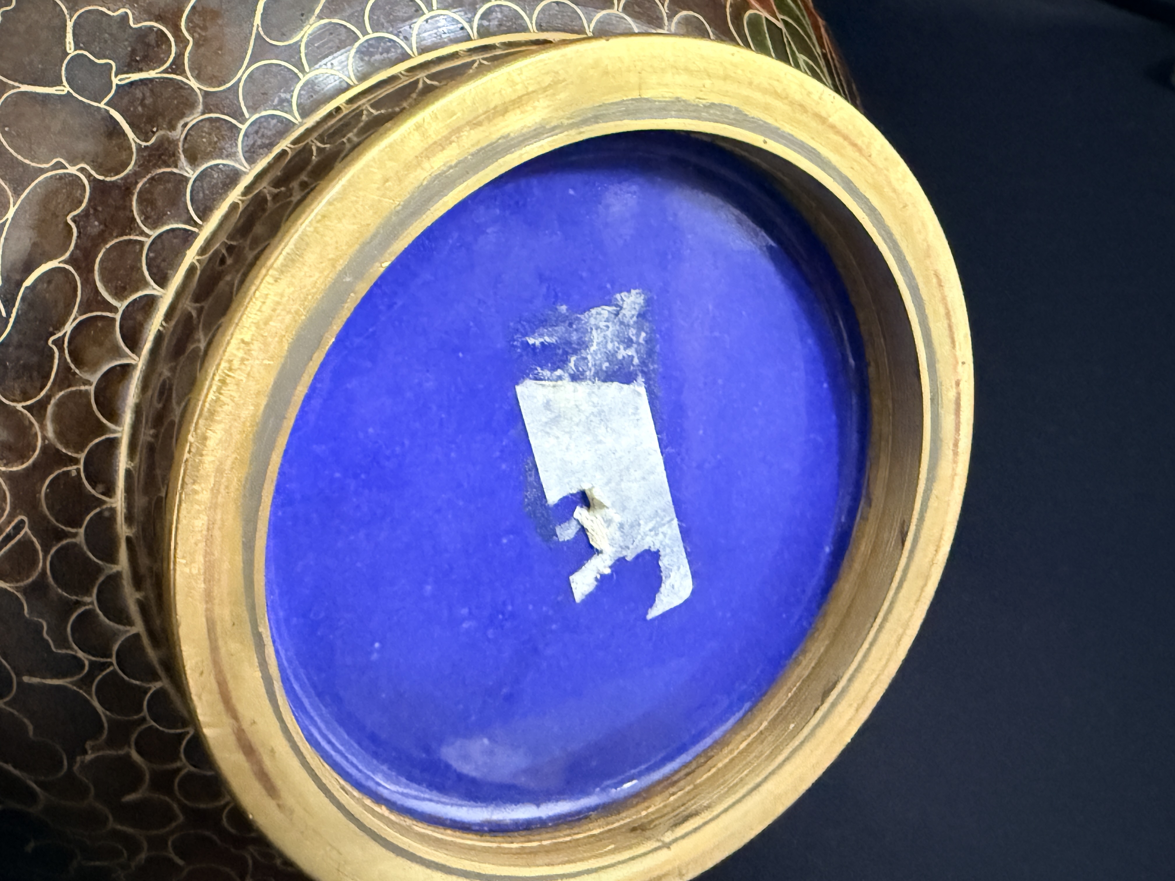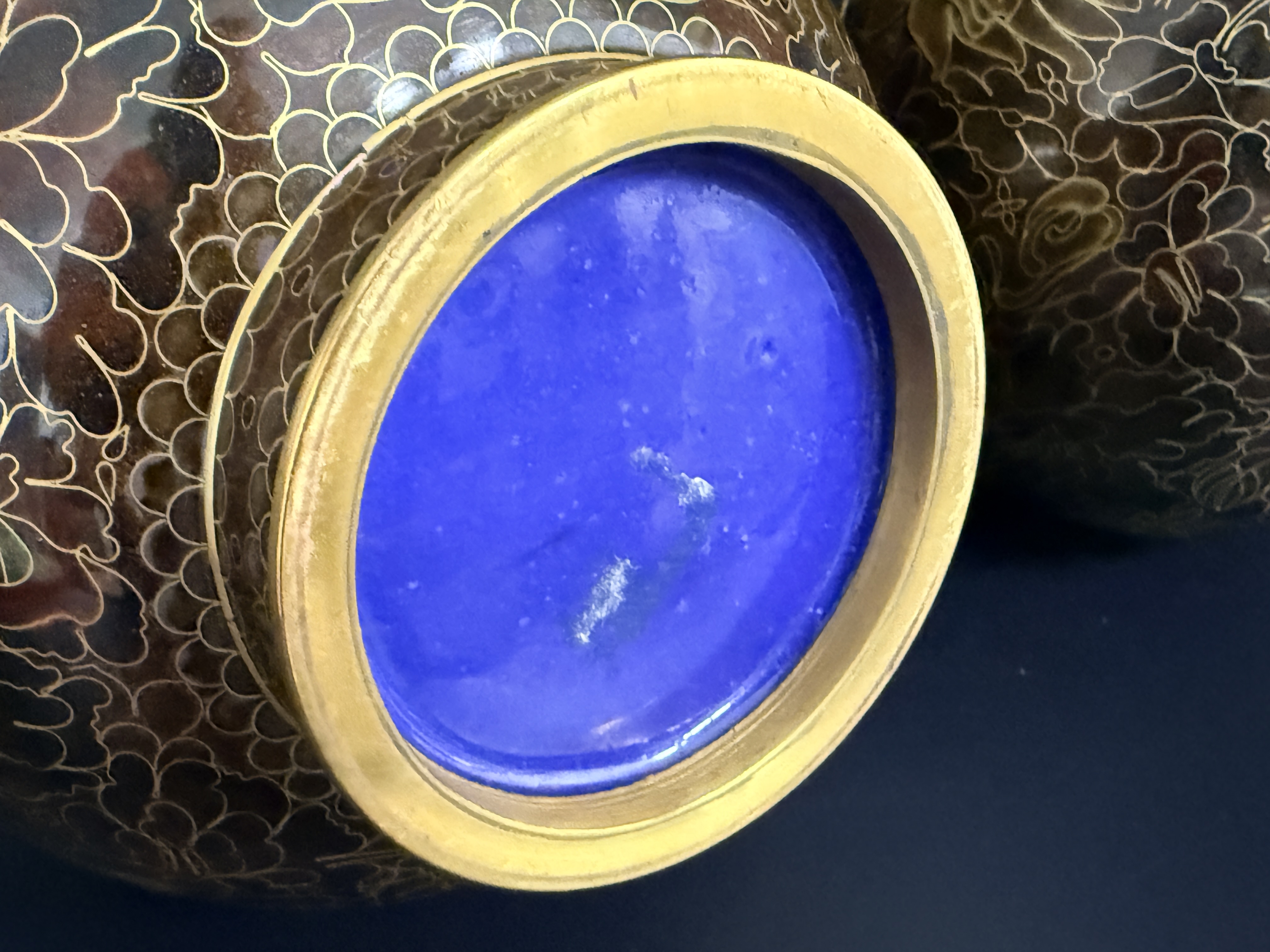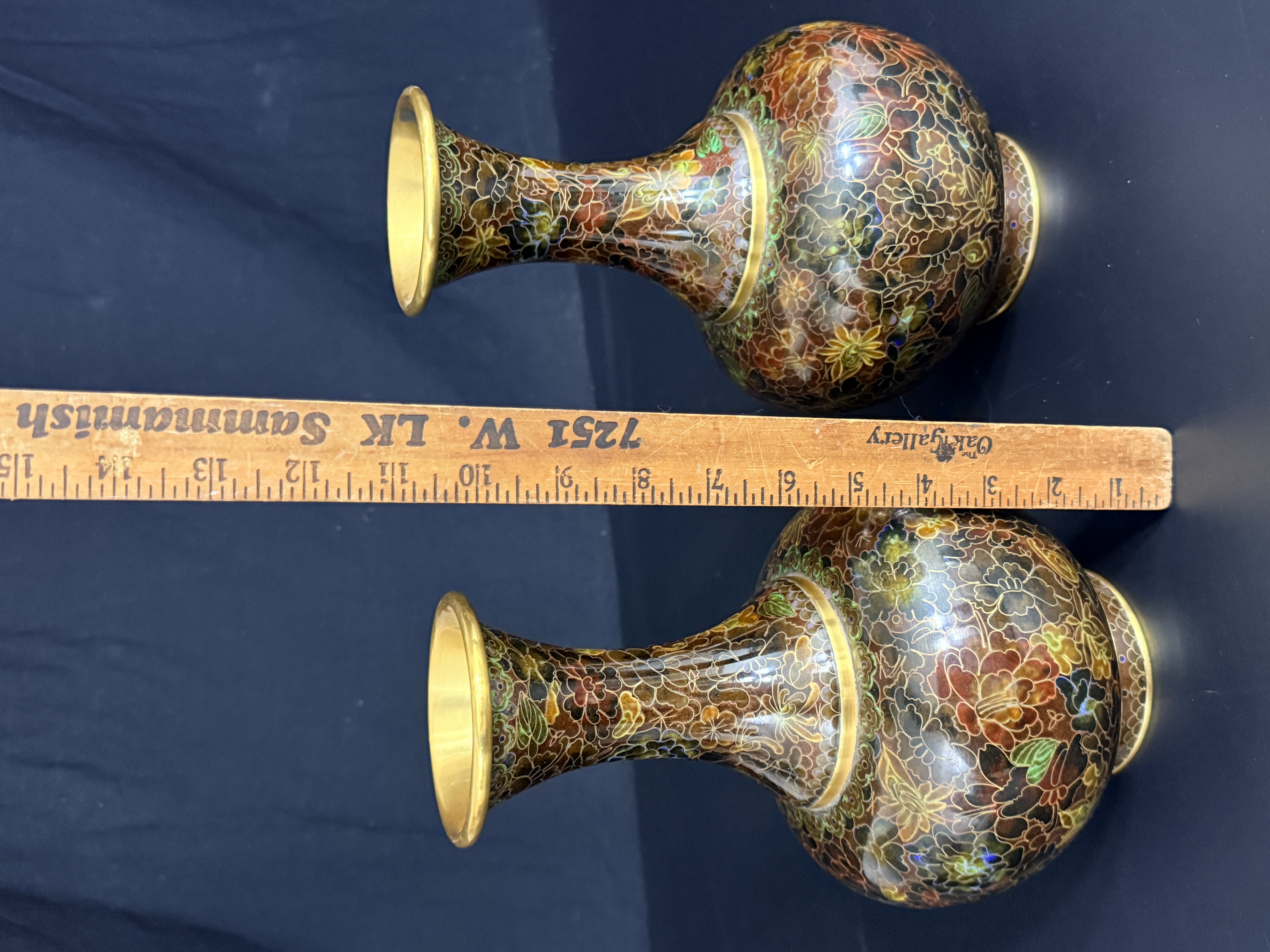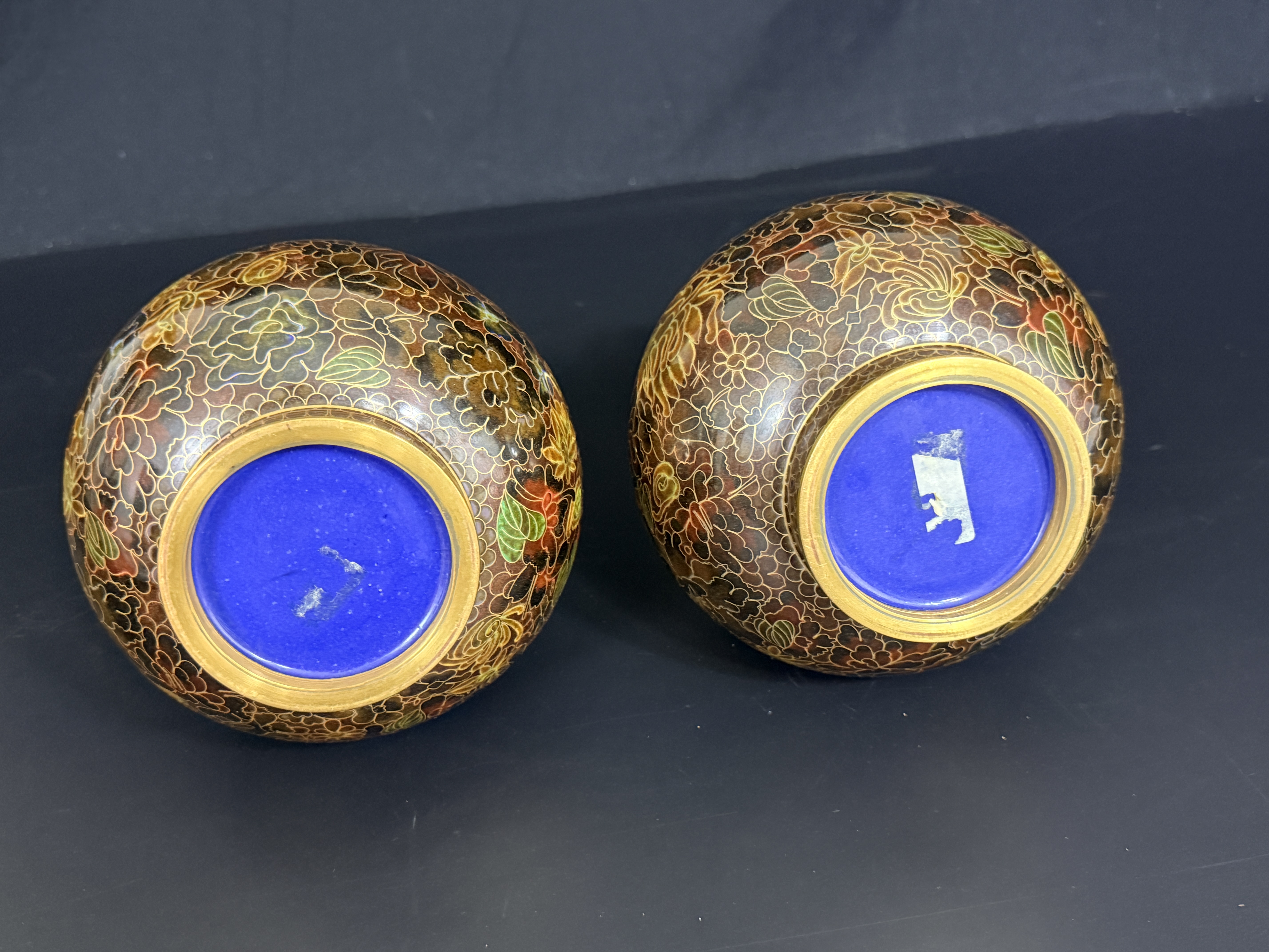 A pair of Chinese cloisonne enamel vases featuring a dense thousand flowers motif. Each vase is designed with a bulbous body, a slender tapering neck, and a wide flared rim, supported by a short circular foot. The decorative scheme consists of a multi-colored palette including red, yellow, green, and brown floral elements on a dark ground. The interior of the necks and the rims exhibit a polished brass finish. The undersides of the bases are finished in cobalt blue enamel. No maker’s marks or signatures are visible.