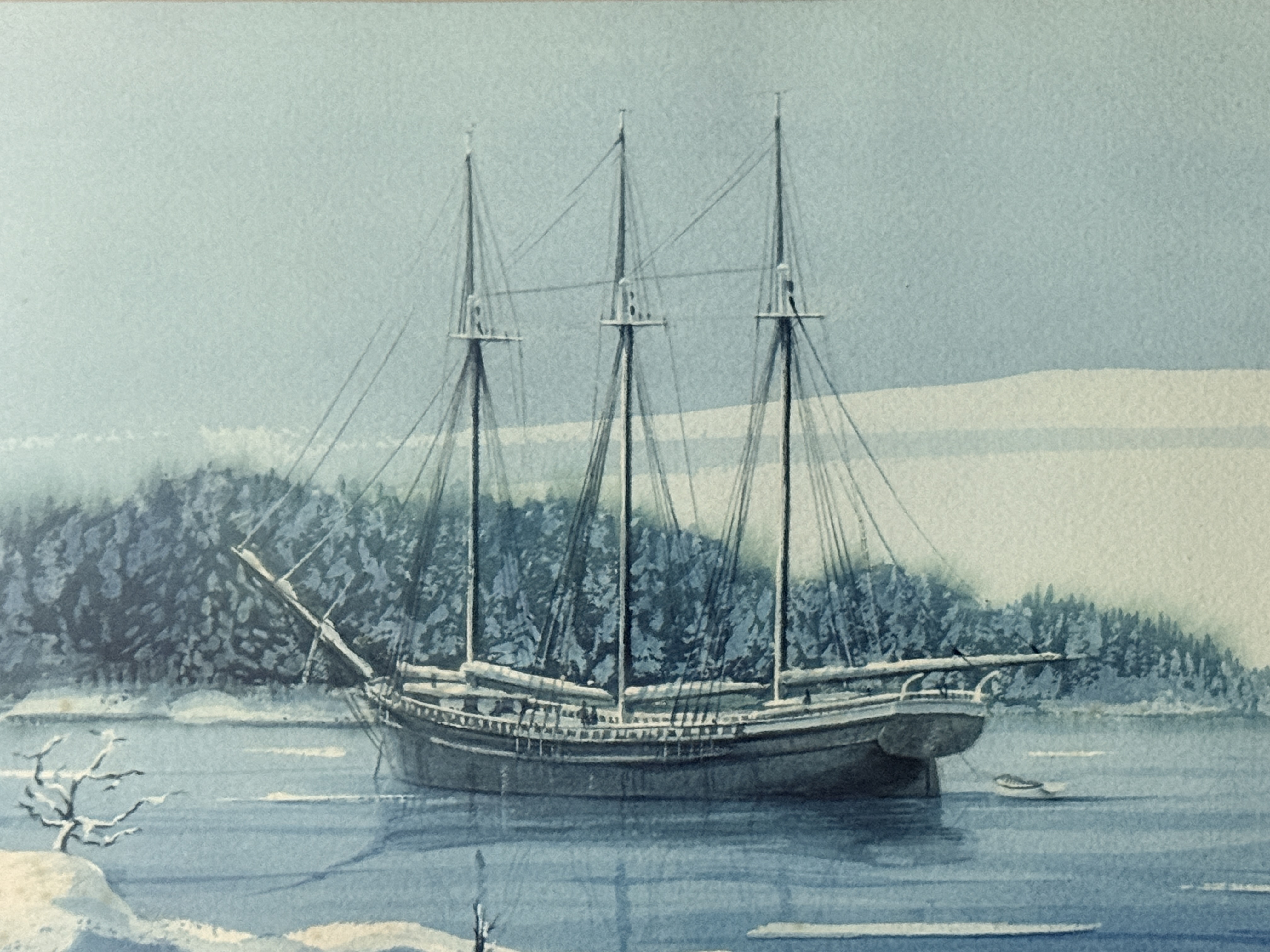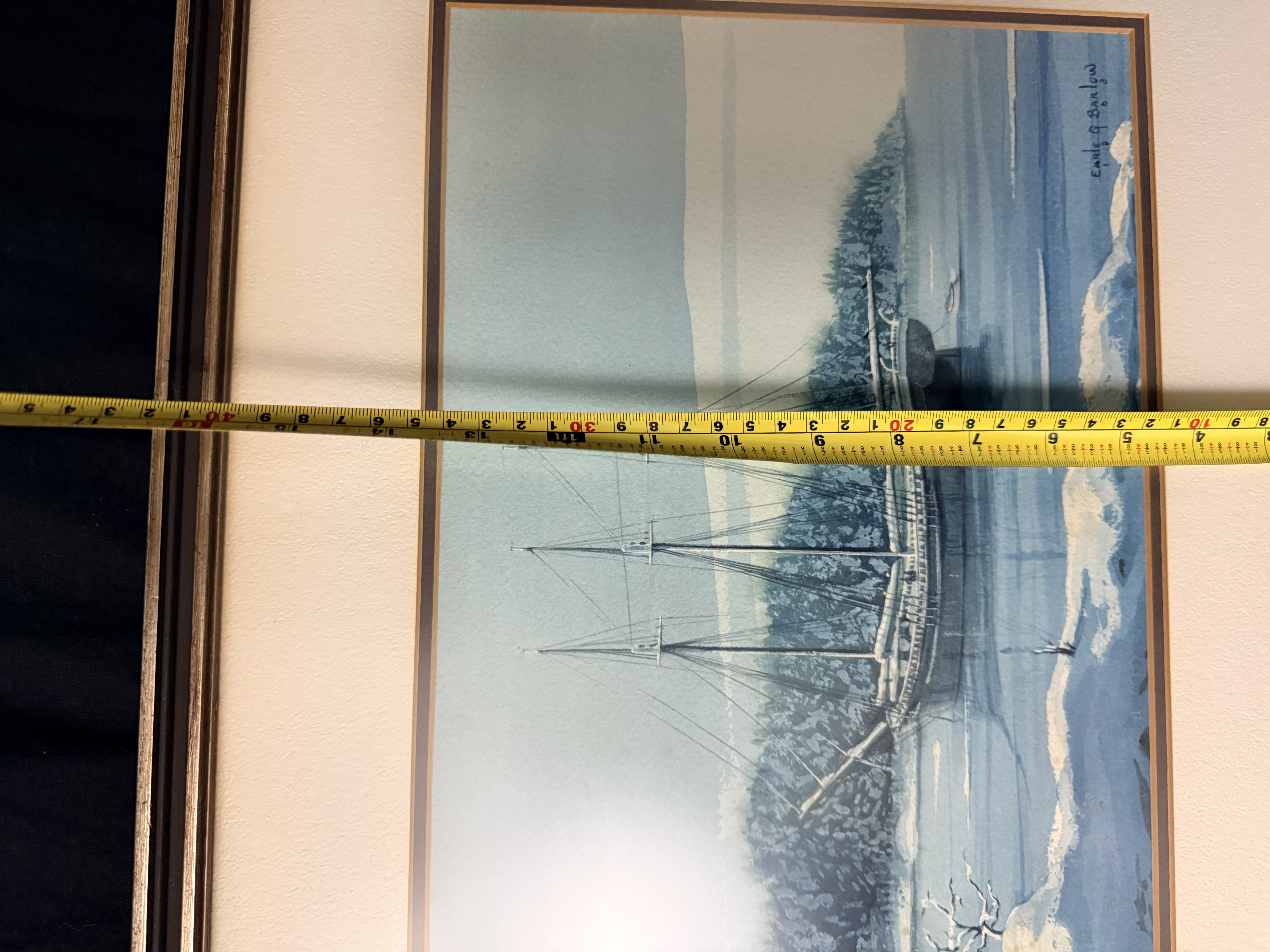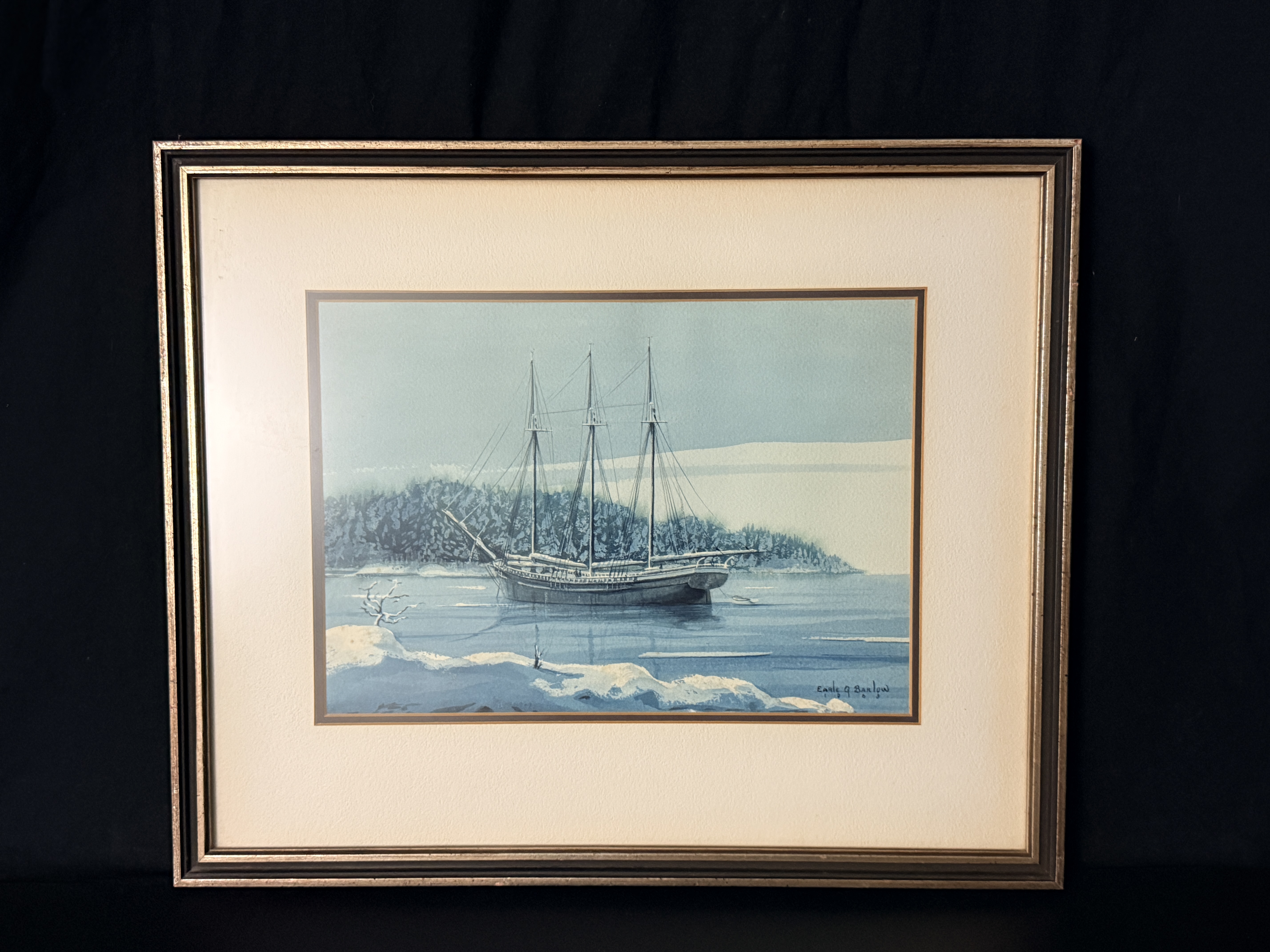 This original watercolor painting on paper is by the artist Earle G. Barlow. The work depicts a three-masted schooner at anchor in a winter maritime setting, featuring a snow-covered shoreline and a pine forest in the background. The piece is signed Earle G. Barlow and dated 1963 in the lower right corner. The artwork is presented within a double mat and protected by glass, housed in a dark wooden frame with a silver-toned finish. The reverse is finished with a paper backing and includes a hanging wire.