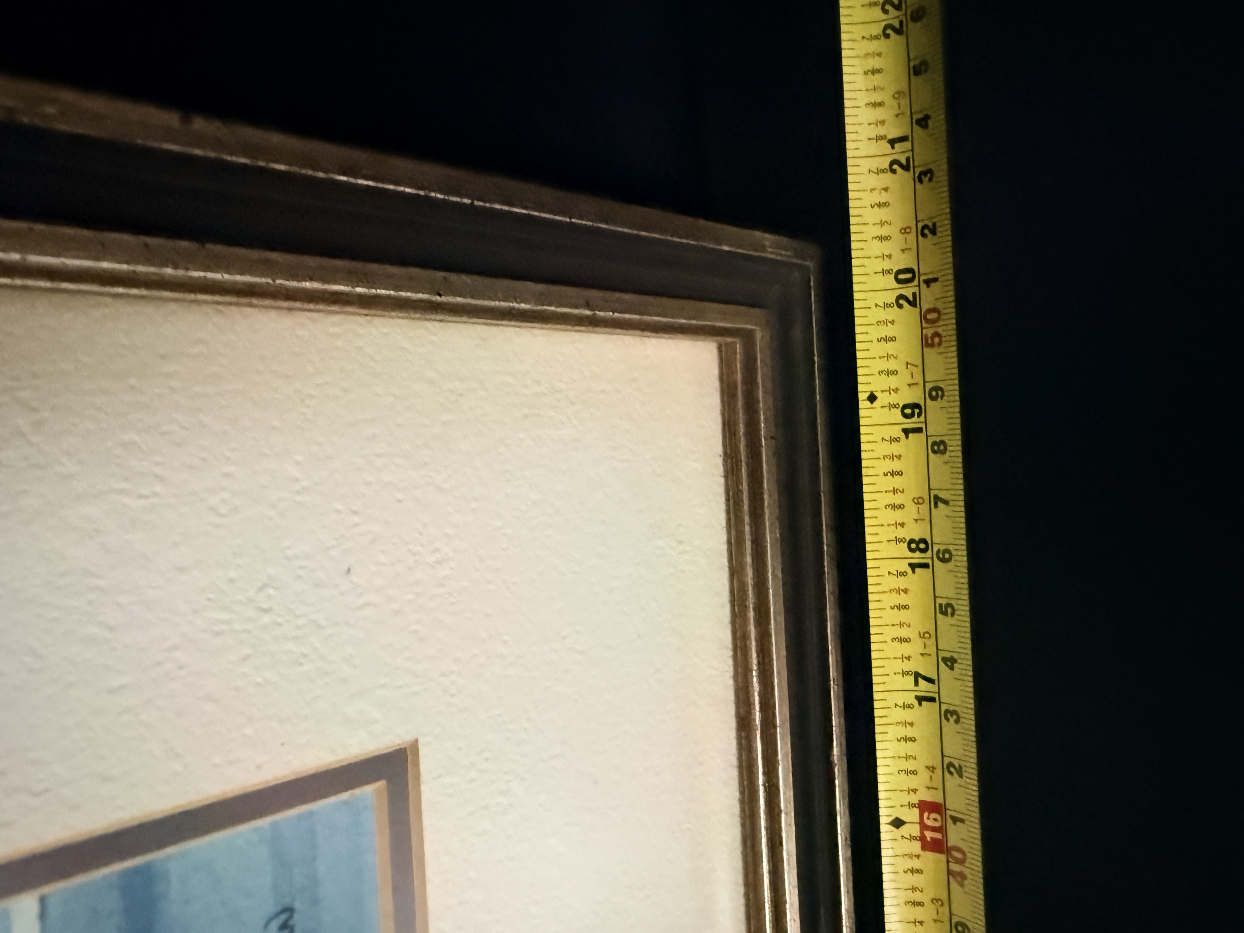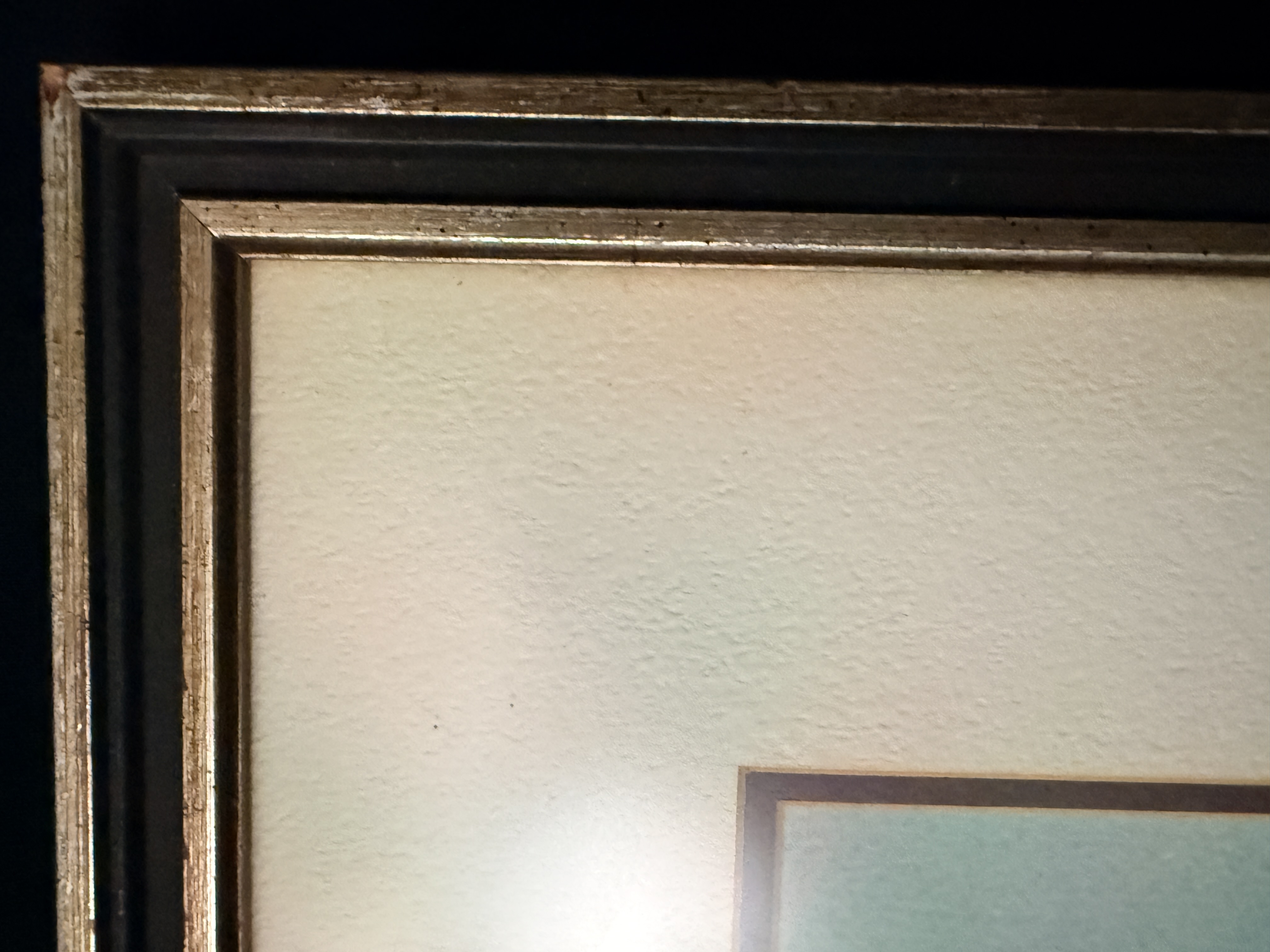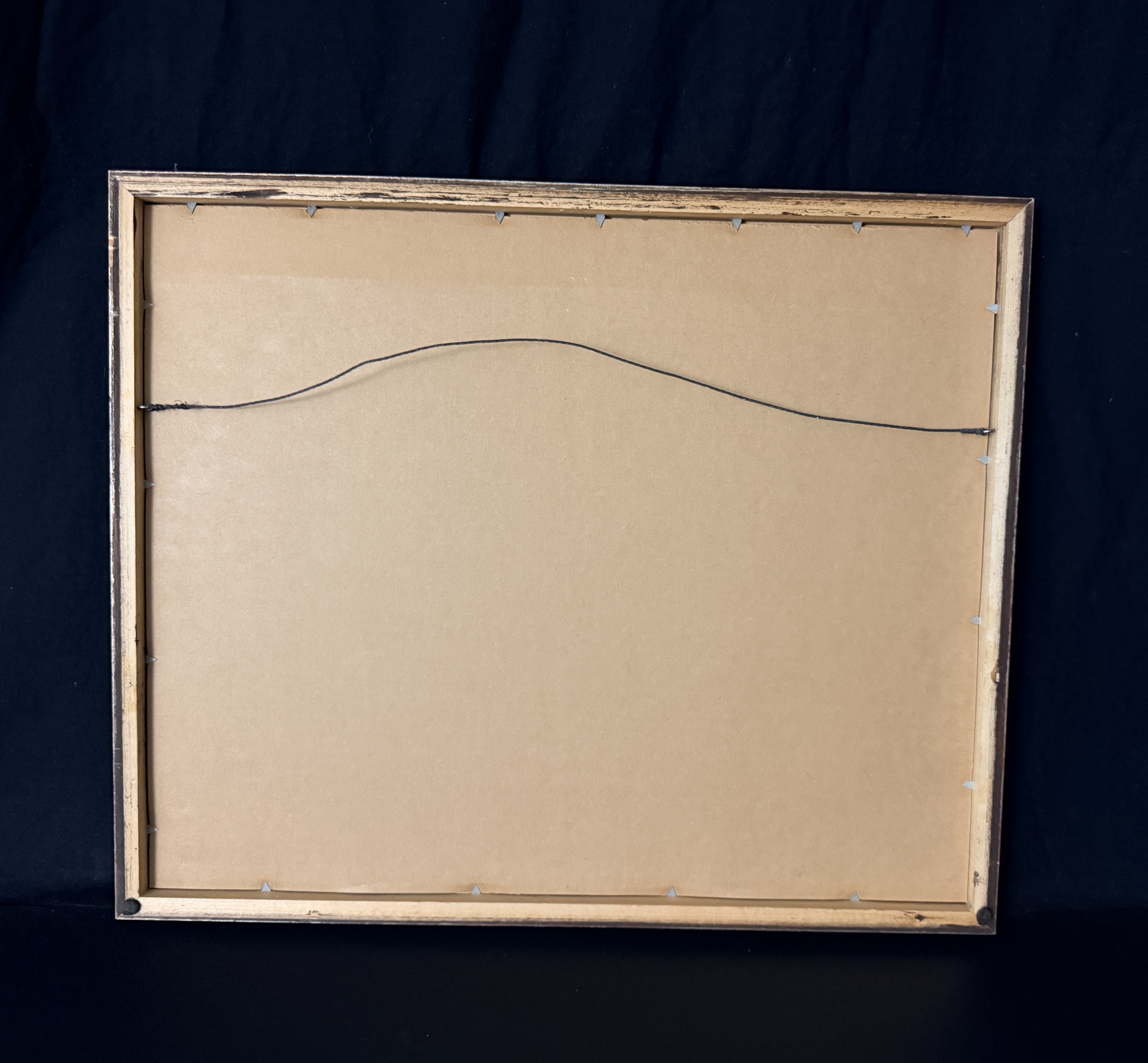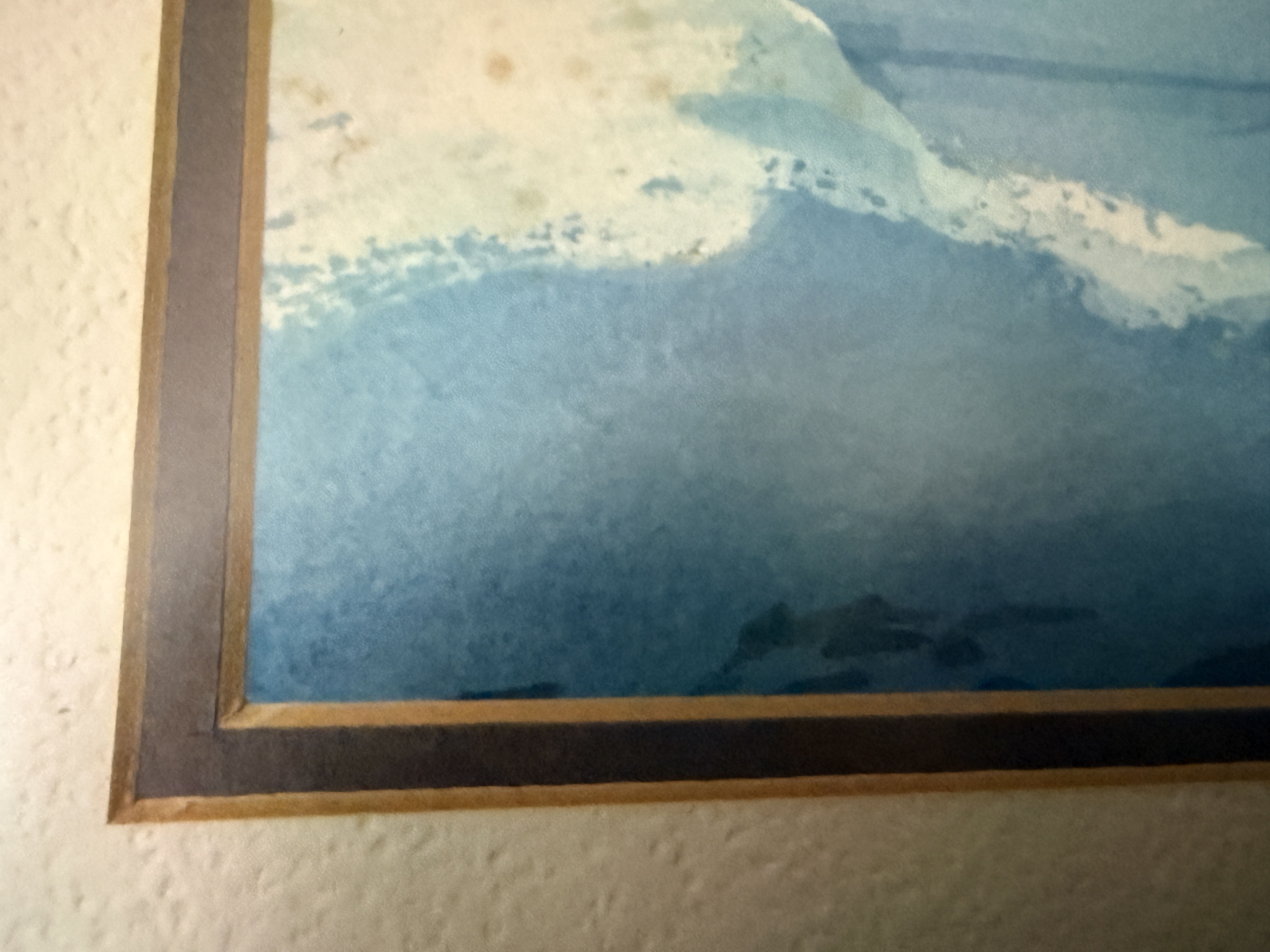 Minor foxing is visible on the upper-left portion of the matting. The frame exhibits light surface wear and small scuffs to the edges. The watercolor itself appears to be in stable condition. Art is from a clean smoke free home.