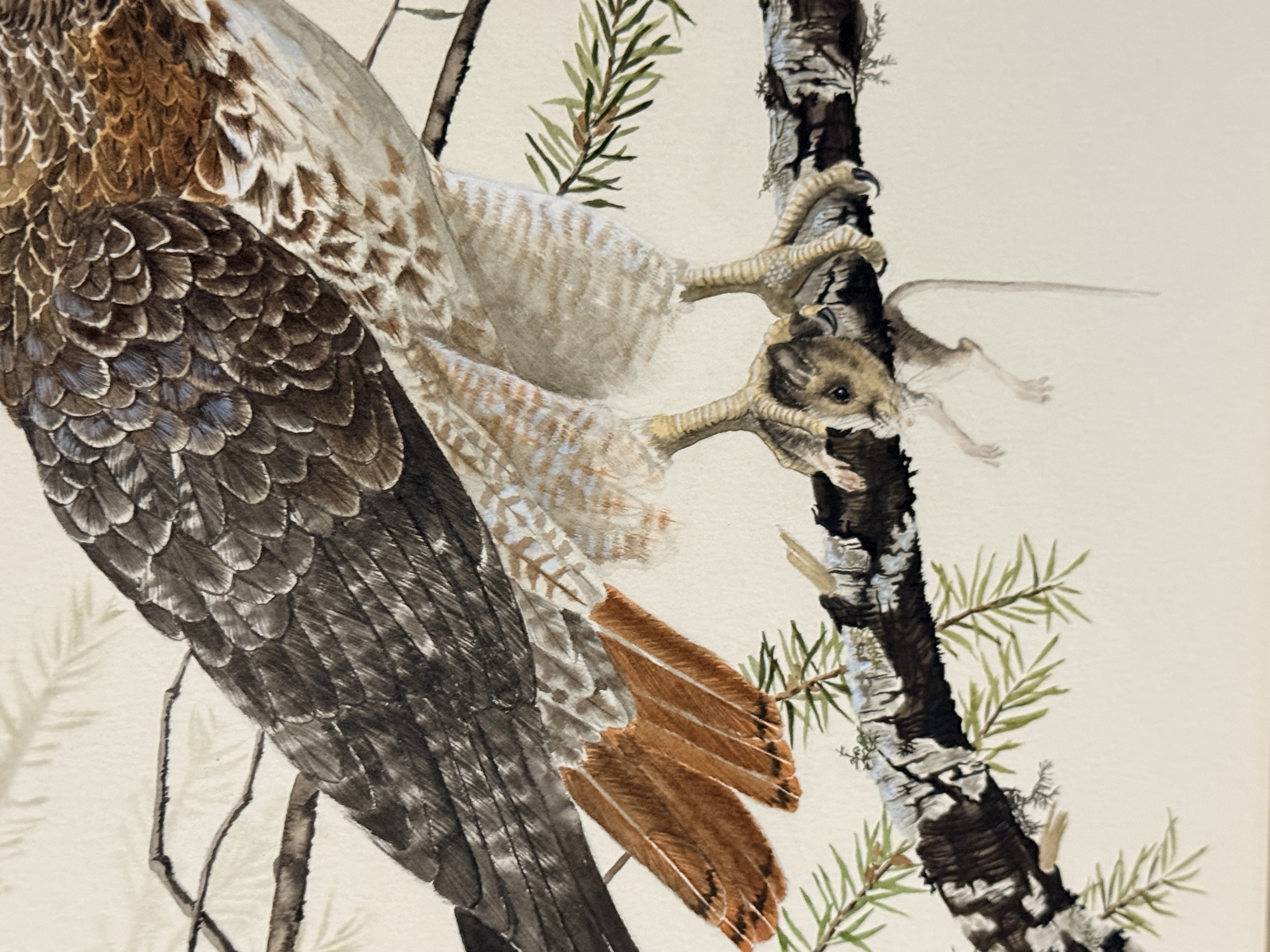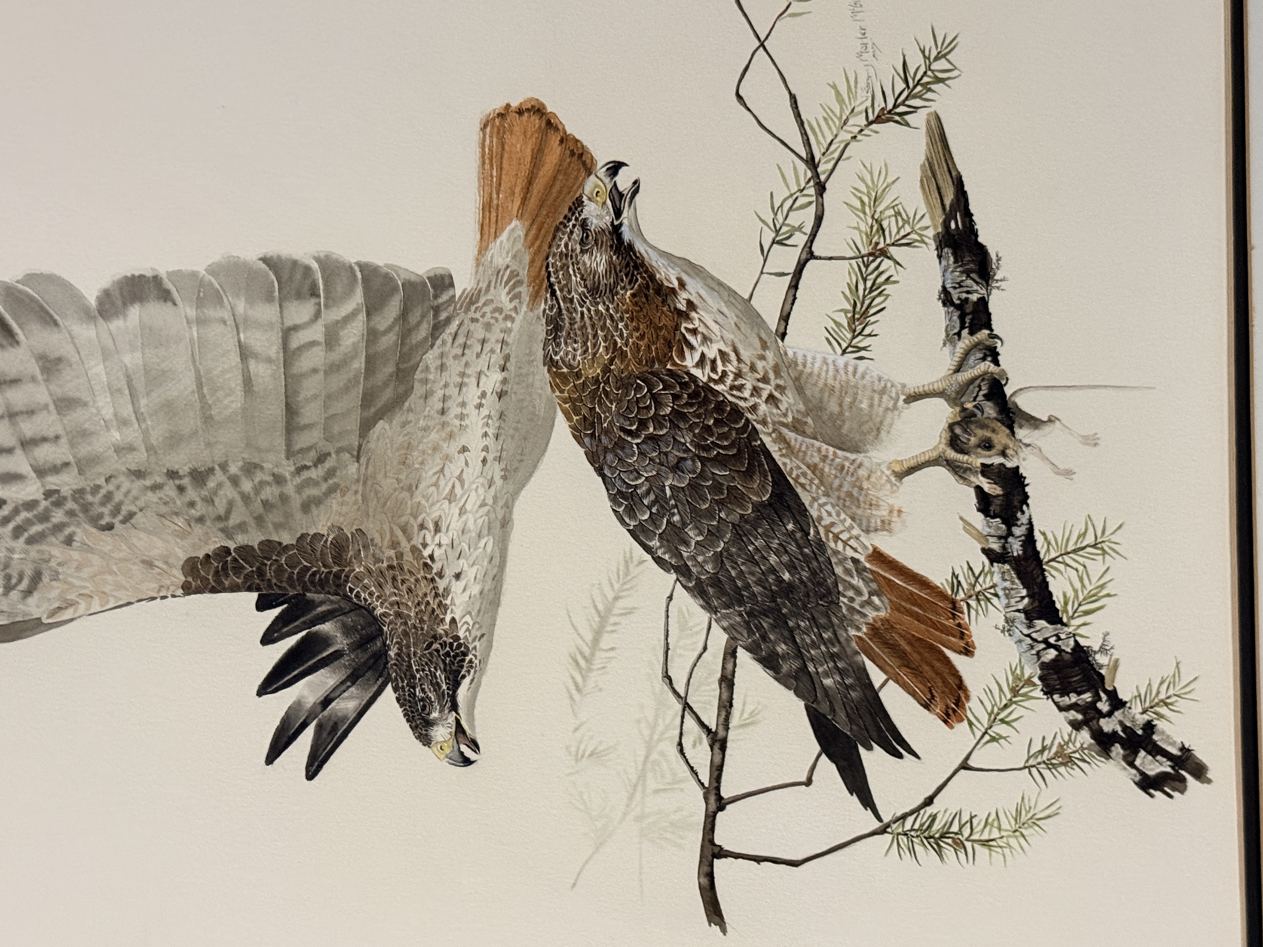 This naturalist illustration, executed in watercolor and gouache on paper, depicts two Red-tailed hawks in a dynamic composition. One hawk is shown perched on a lichen-covered pine branch clutching a small rodent, while the second hawk is captured in mid-flight with its wings fully extended. The artwork is signed and dated Marler McGinnis 87 in the lower right quadrant. The composition is visually identical to the work titled Redtail Landing. The piece is mounted on a white mat.