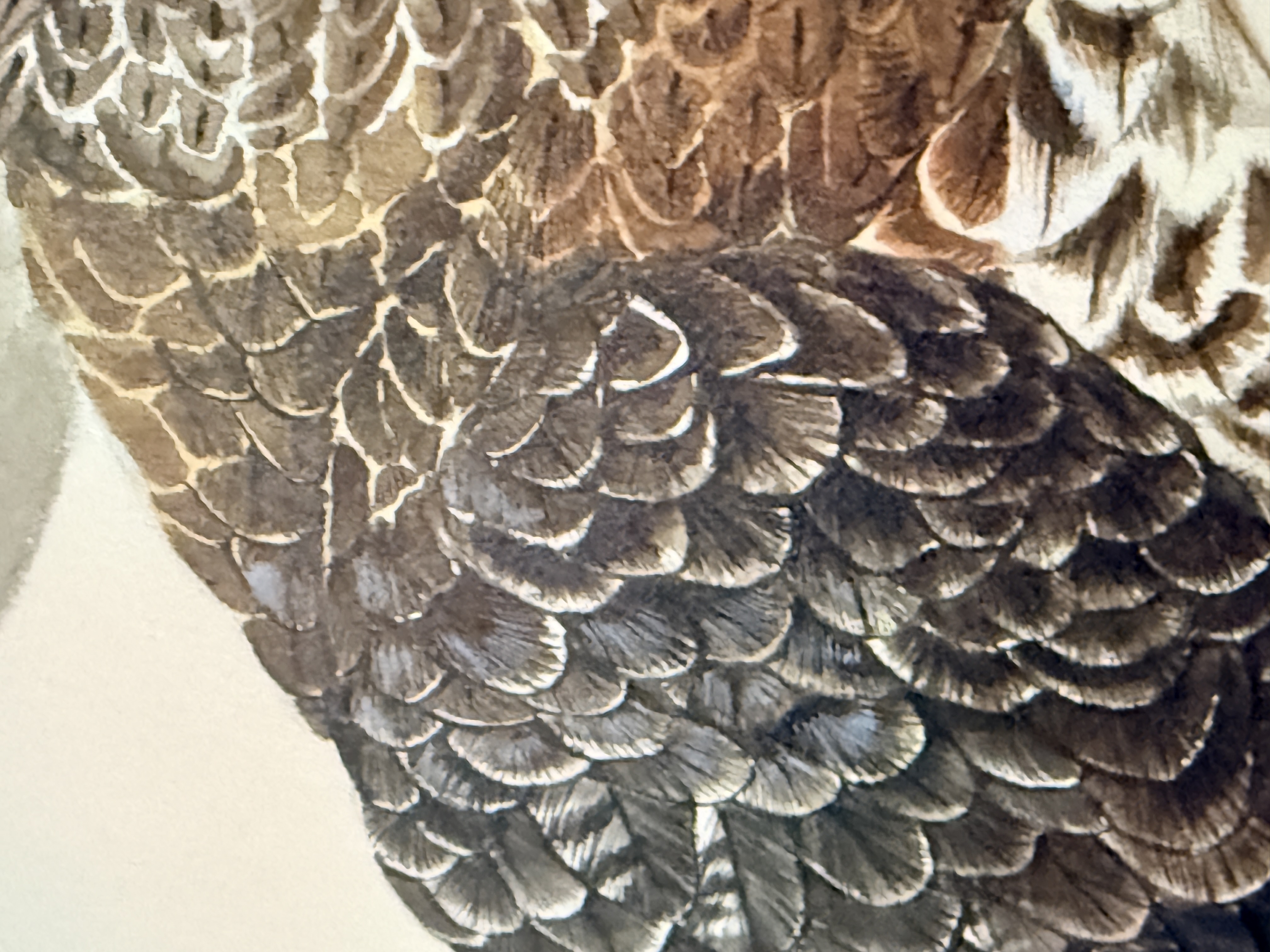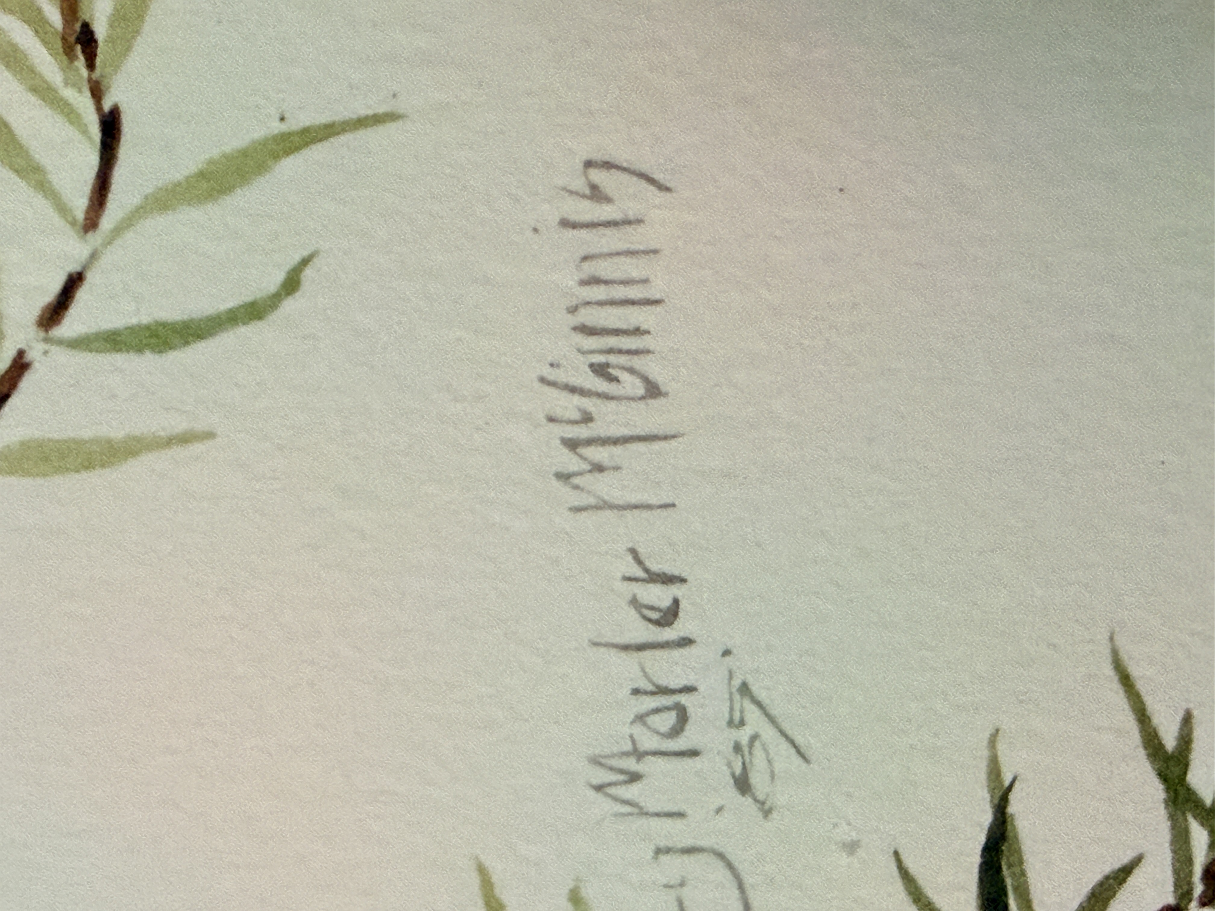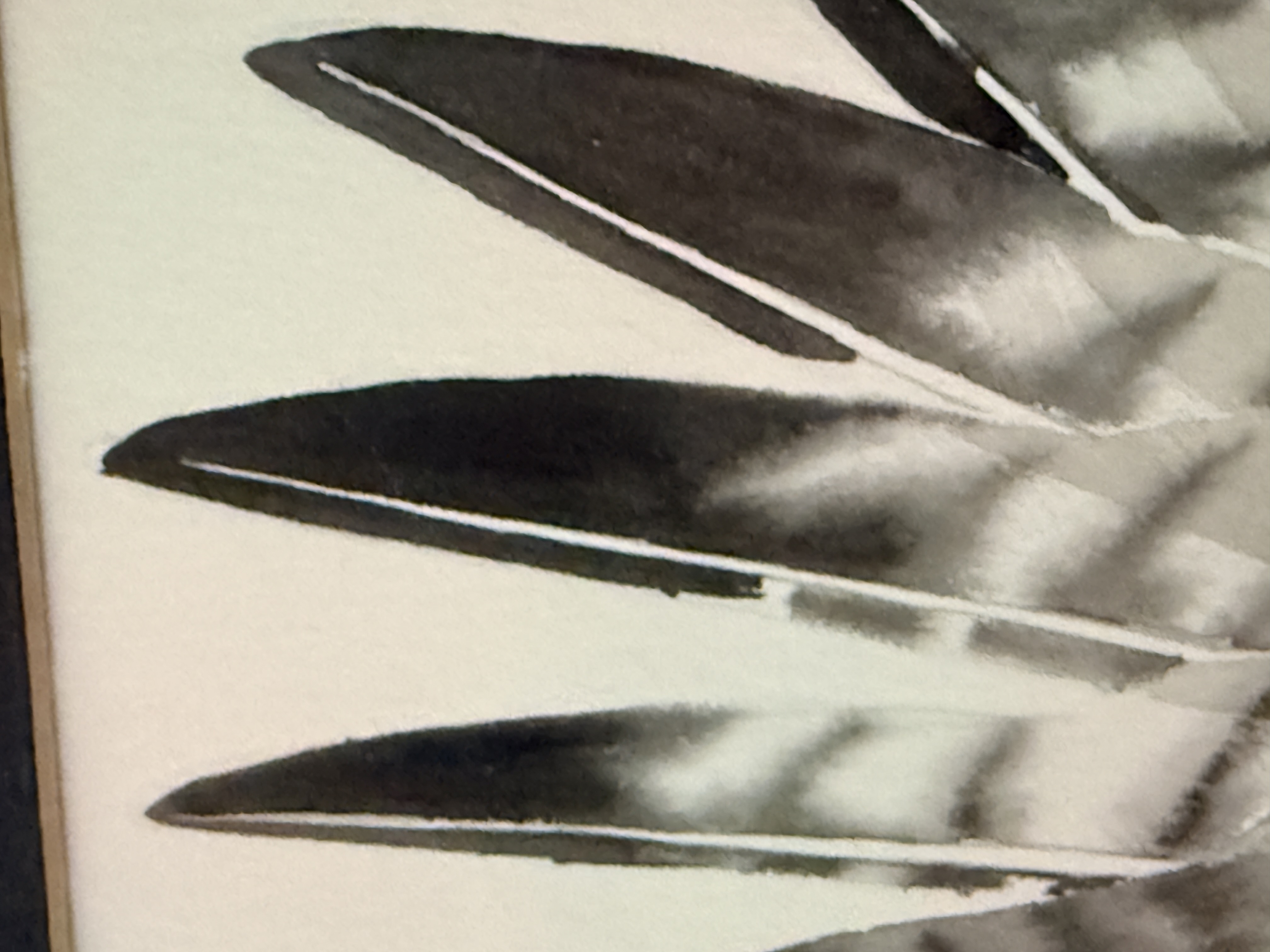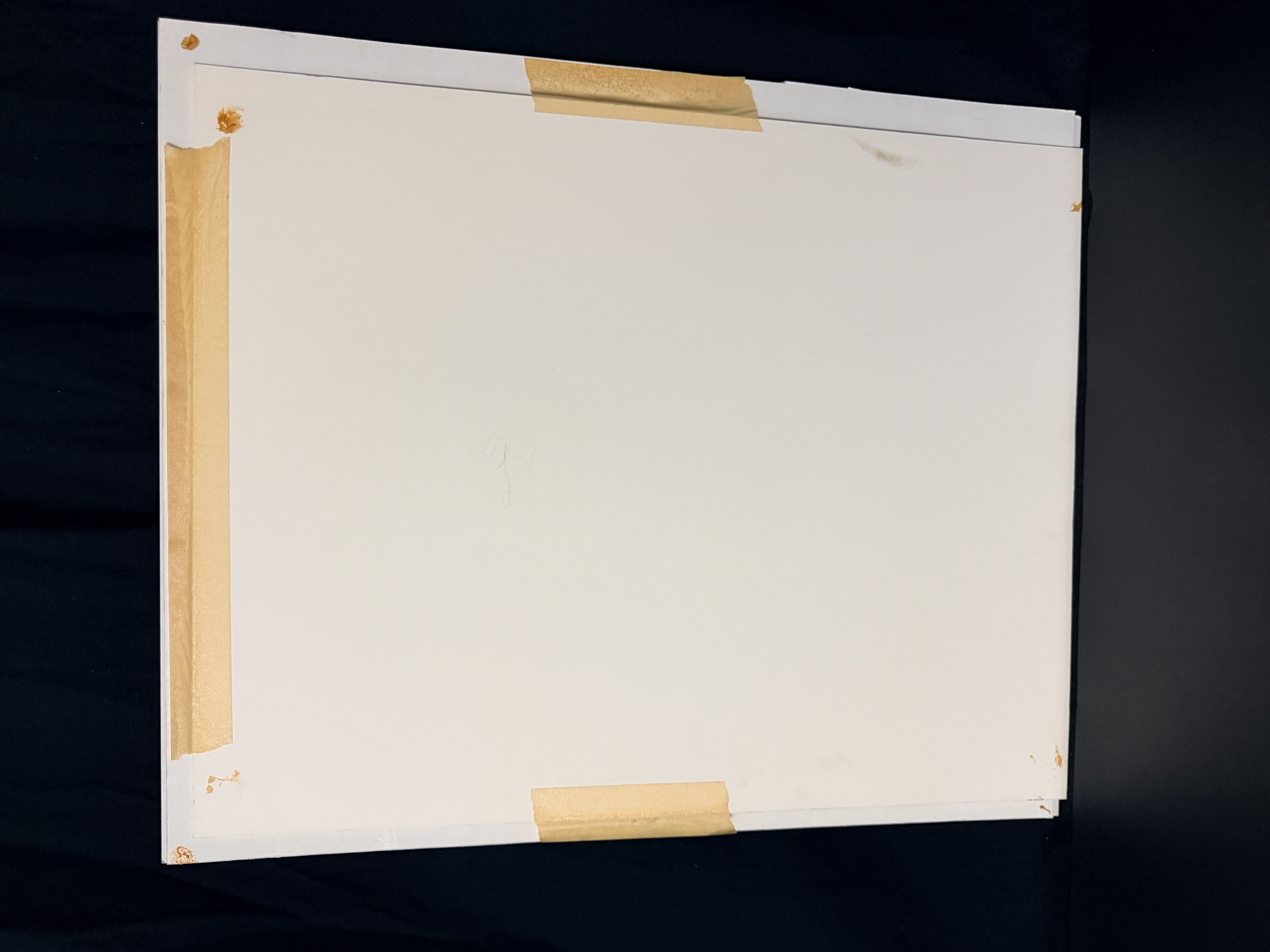 The artwork is in good condition with no visible foxing or tears to the primary surface. The supporting mat and the reverse of the piece exhibit adhesive residue, tape remnants, and minor staining along the edges. Art is from a clean smoke free home.