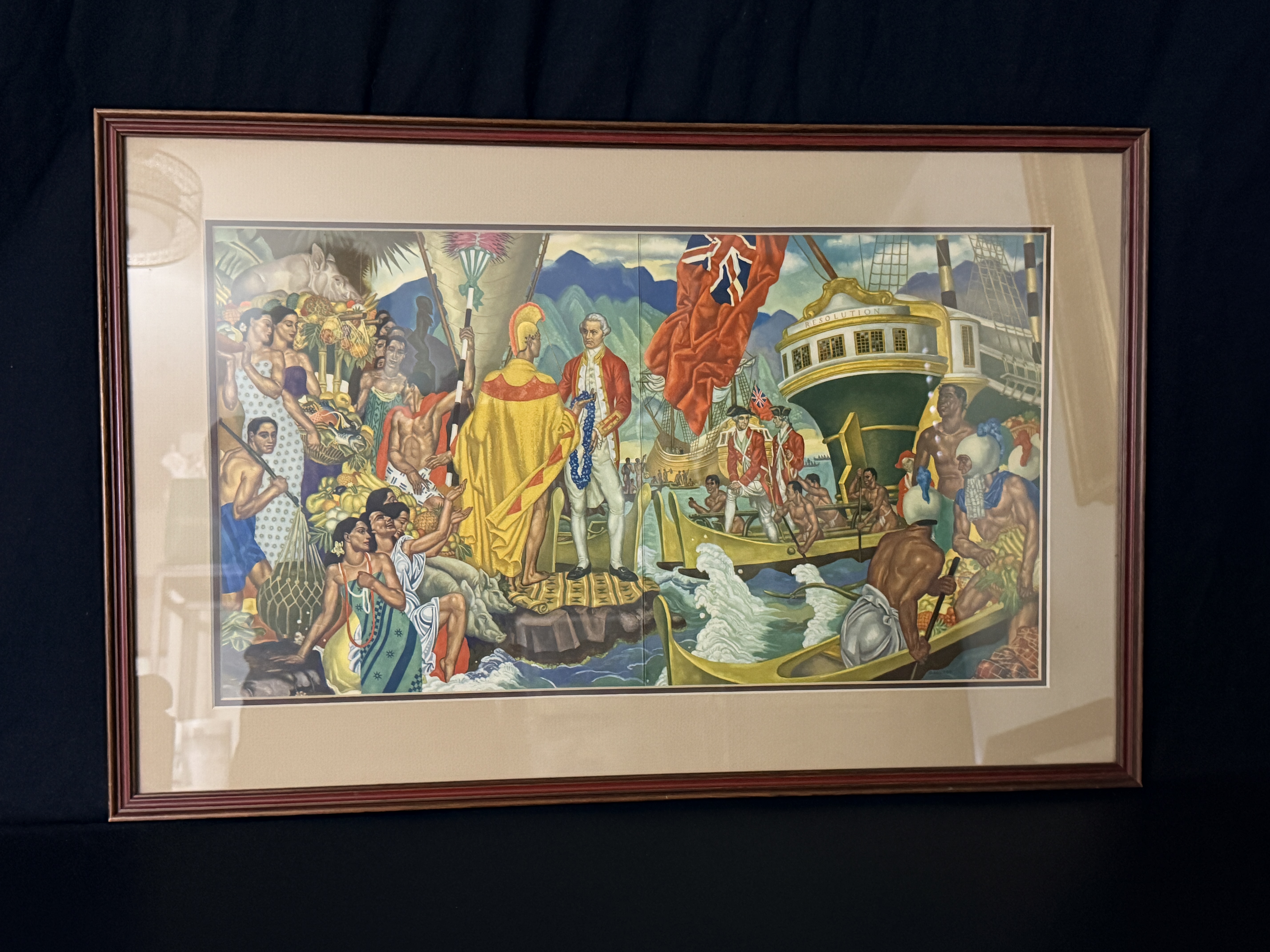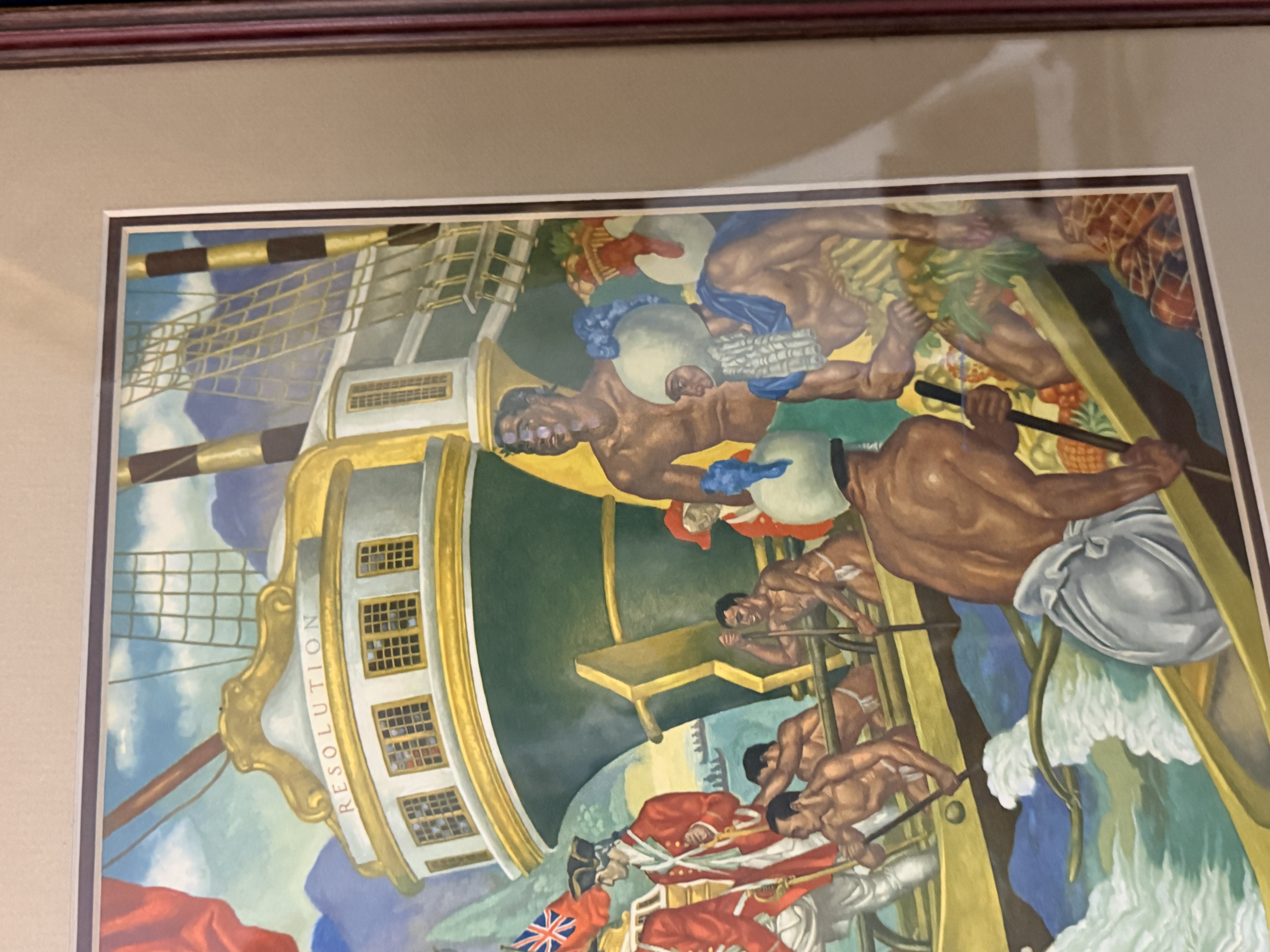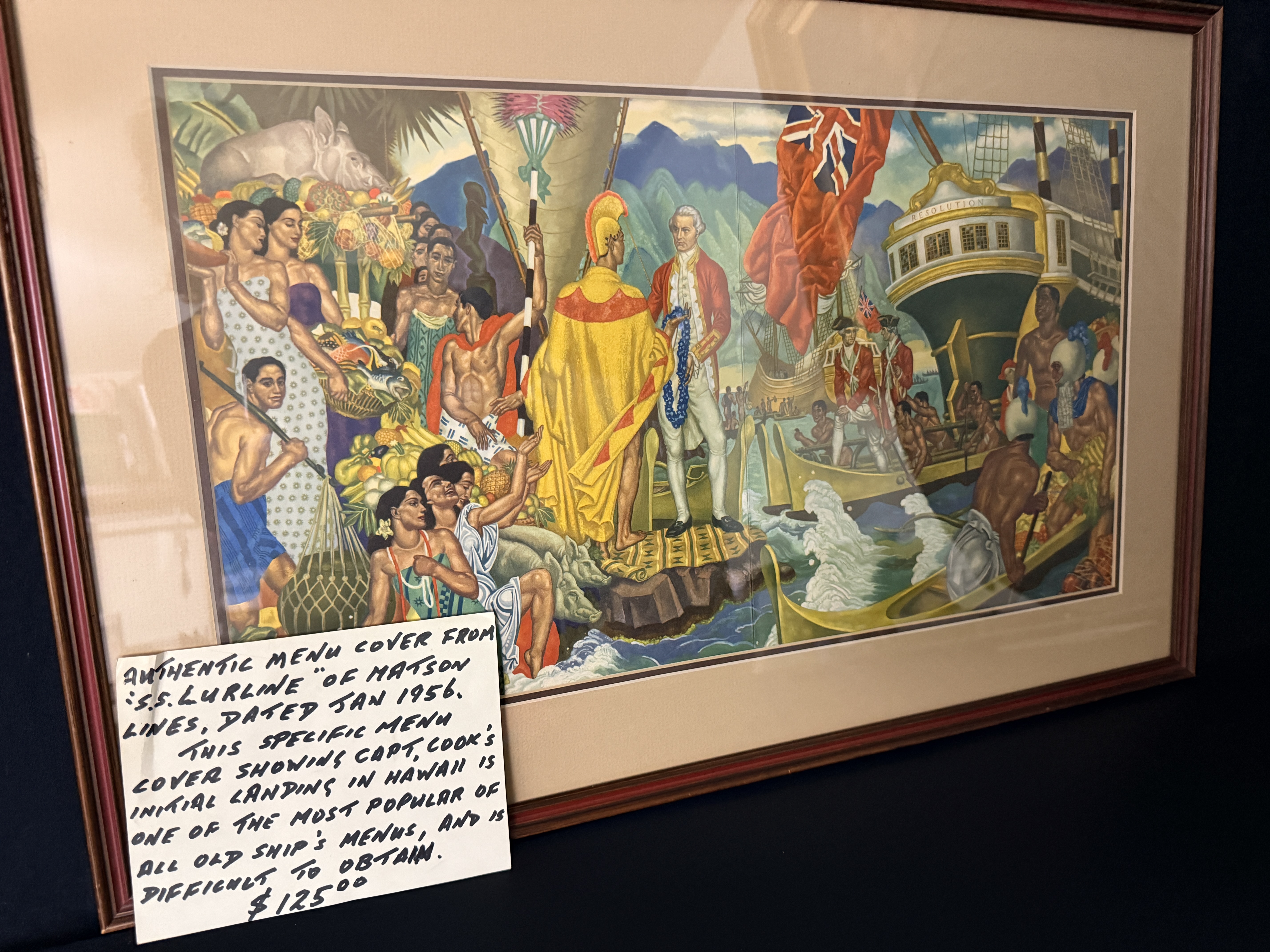 This lot features a framed and matted vintage menu cover from the Matson Lines S.S. Lurline, dated to approximately 1956. Estate said this is from Trader Vics. The illustration is attributed to Eugene Savage and is titled A God Appears or Hawaii’s Decisive Moment. The mid-century stylized composition depicts the landing of Captain Cook in Hawaii, showing British naval officers interacting with Native Hawaiians. The scene includes various tropical fruits, livestock, and the HMS Resolution positioned in the background. The artwork is presented in a reddish-brown wooden frame with a neutral mat. A vertical crease is visible down the center of the sheet, which is consistent with its original manufacture and use as a folded menu.