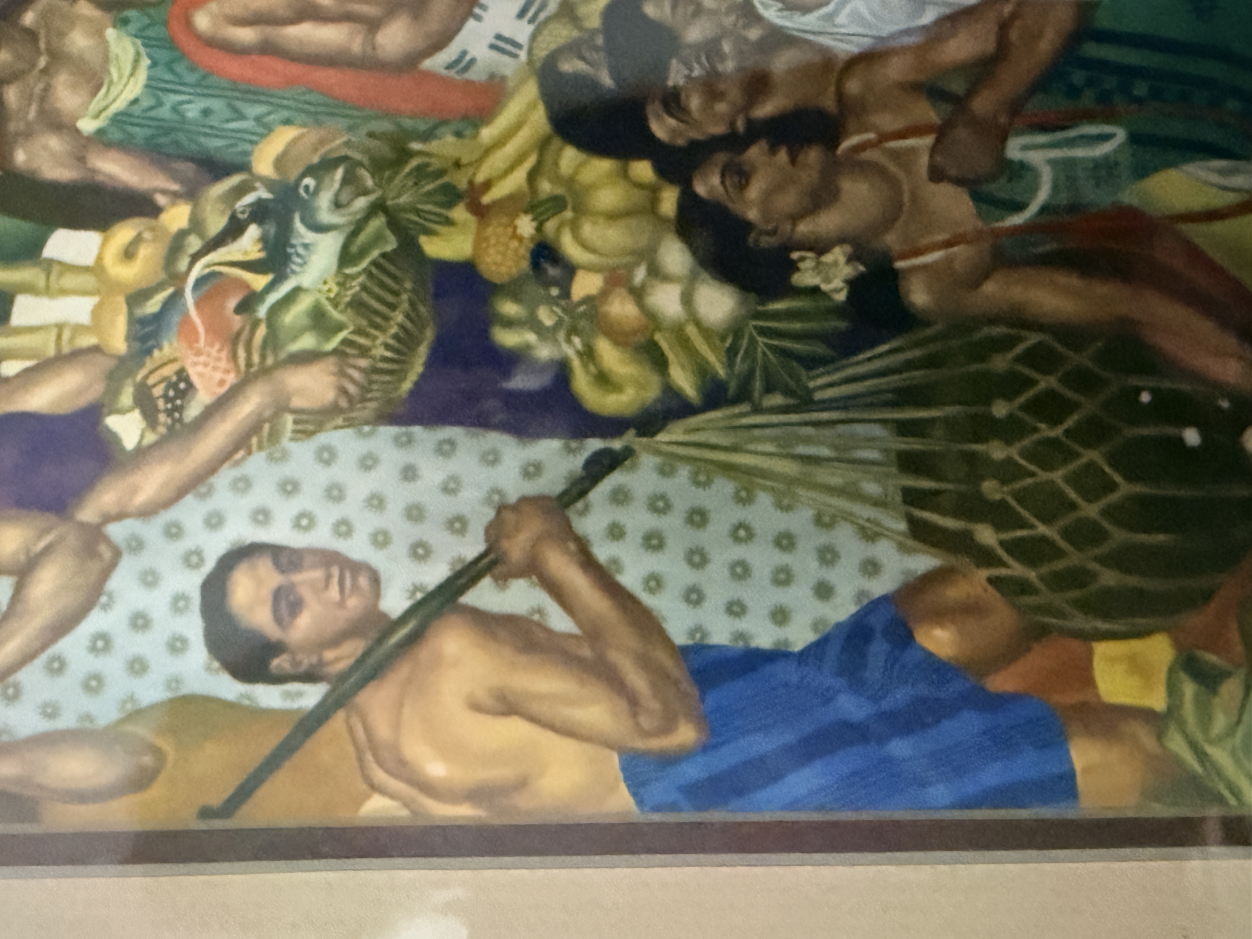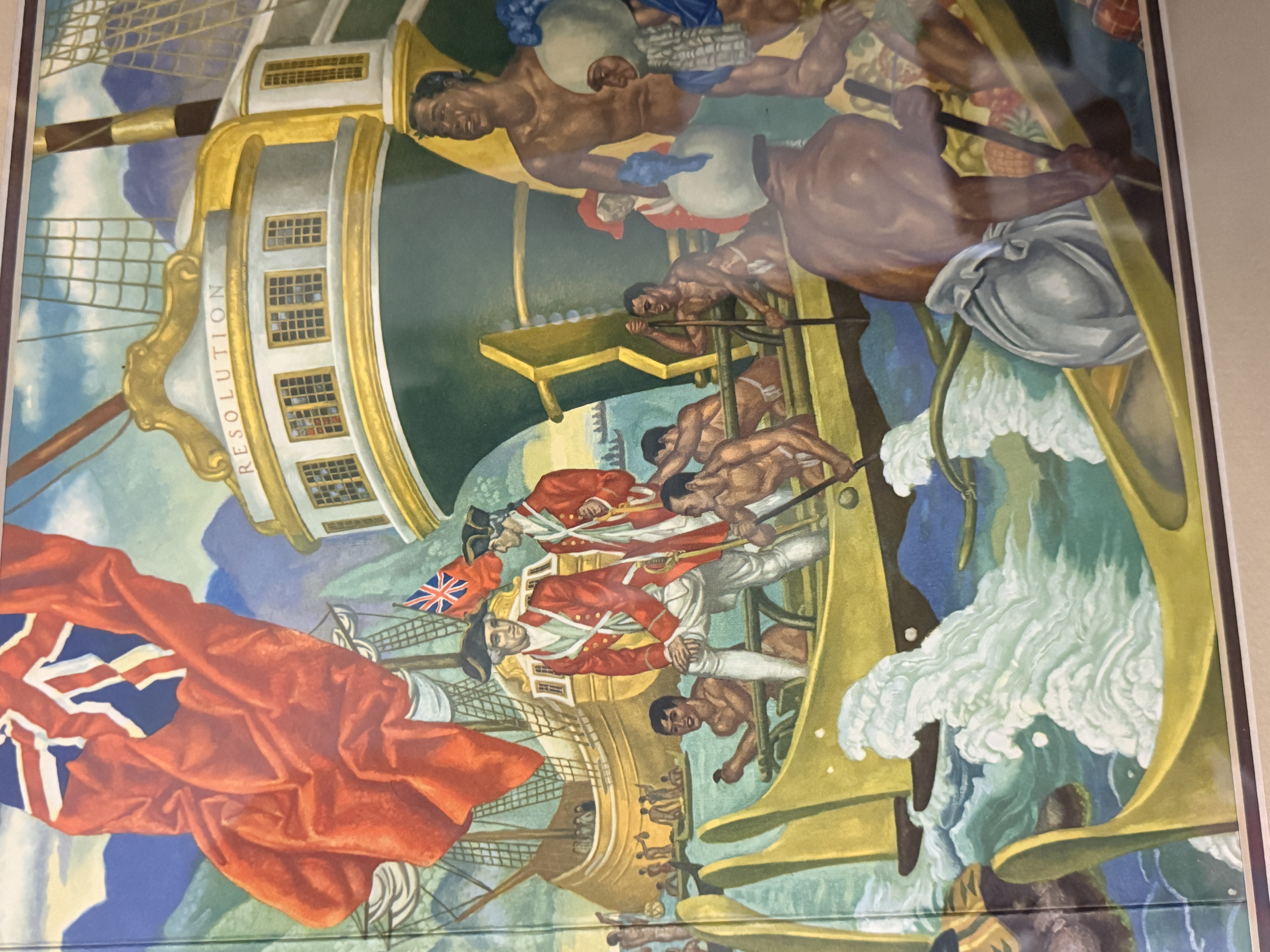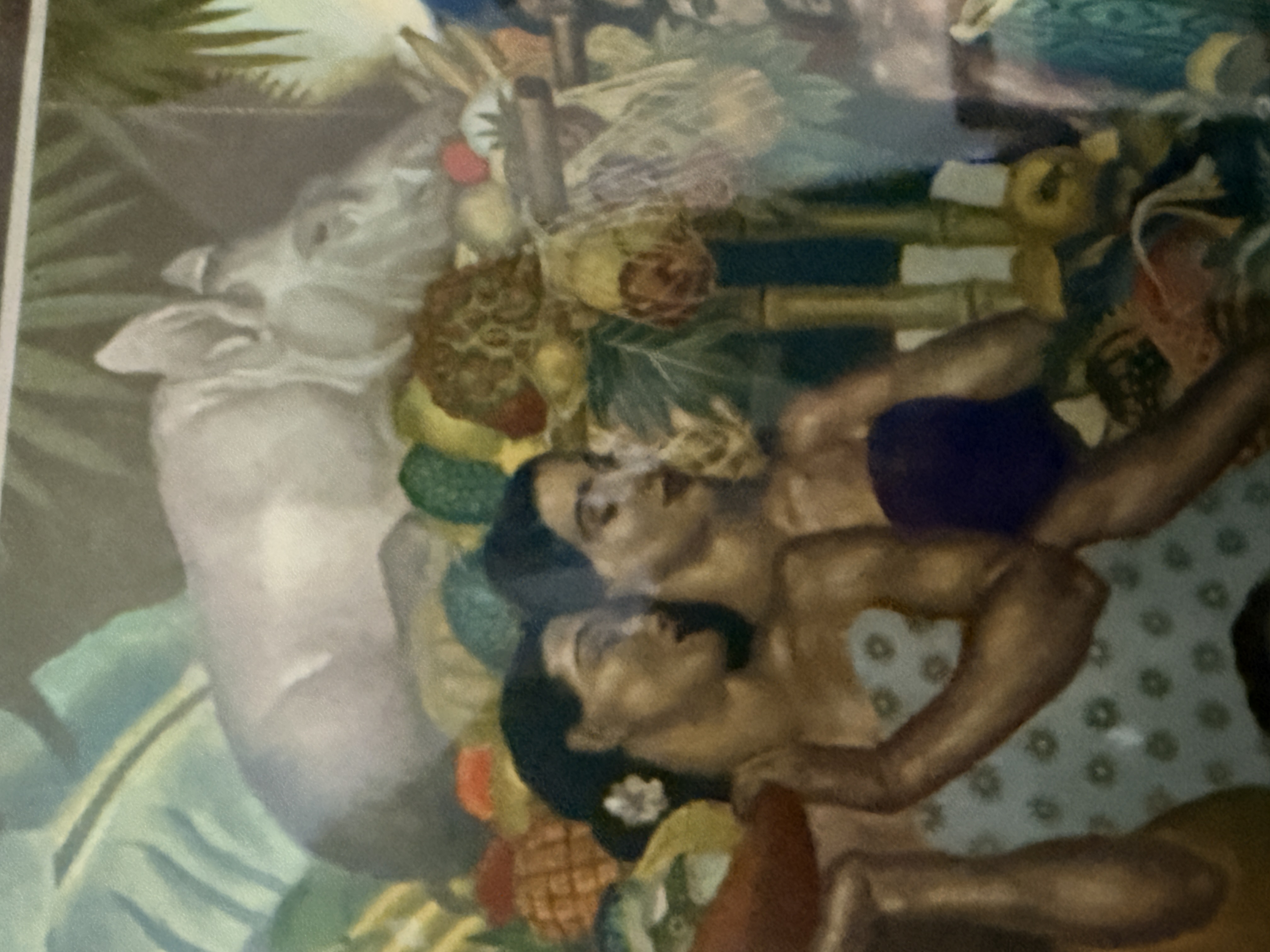 This lot features a framed and matted vintage menu cover from the Matson Lines S.S. Lurline, dated to approximately 1956. Estate said this is from Trader Vics. The illustration is attributed to Eugene Savage and is titled A God Appears or Hawaii’s Decisive Moment. The mid-century stylized composition depicts the landing of Captain Cook in Hawaii, showing British naval officers interacting with Native Hawaiians. The scene includes various tropical fruits, livestock, and the HMS Resolution positioned in the background. The artwork is presented in a reddish-brown wooden frame with a neutral mat. A vertical crease is visible down the center of the sheet, which is consistent with its original manufacture and use as a folded menu.