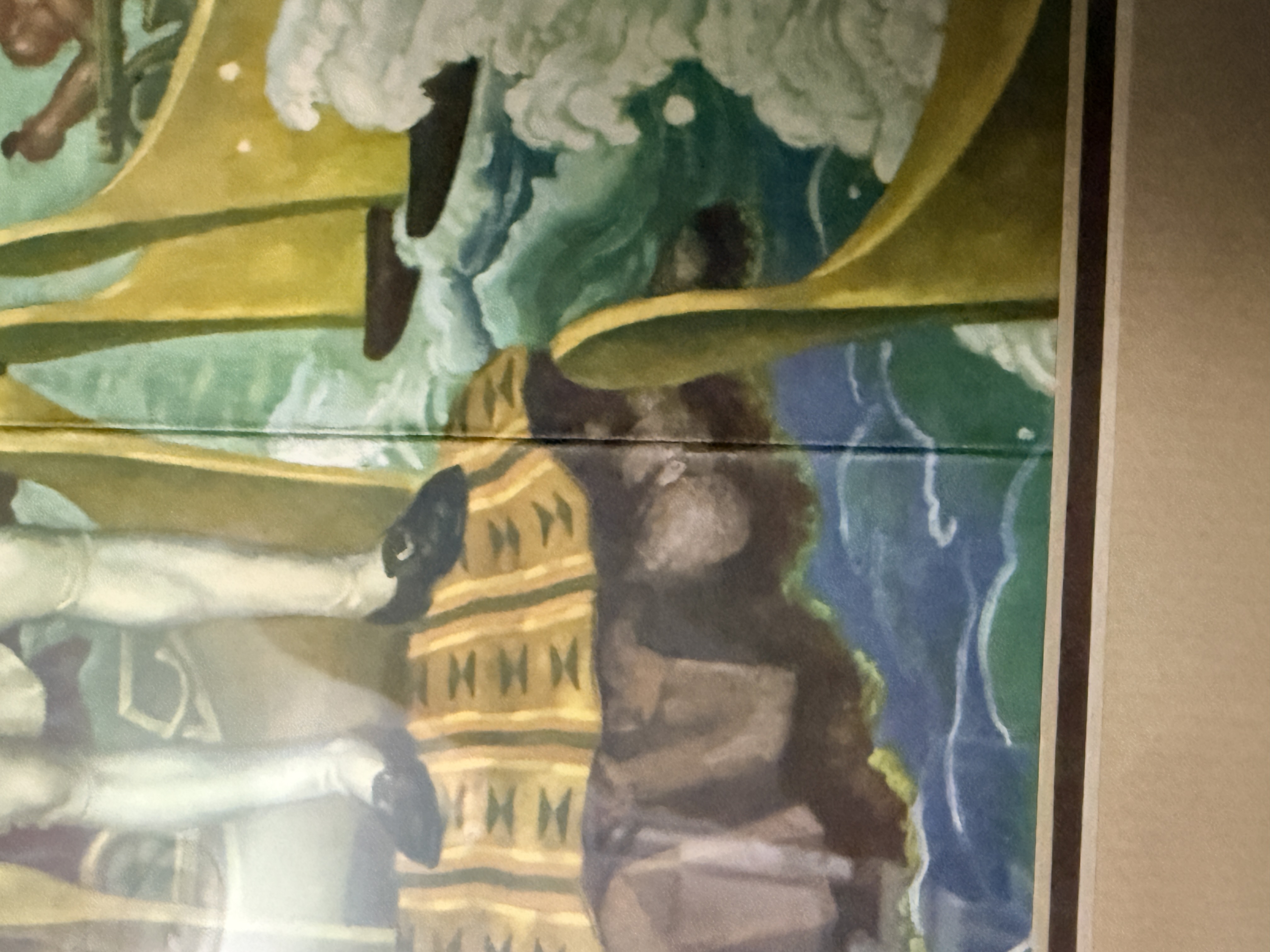The piece is in good vintage condition. A prominent vertical crease is present through the center of the paper as issued. The frame shows minor surface wear and light scuffing consistent with age. The item has not been examined out of the frame. Art is from a clean smoke free home.