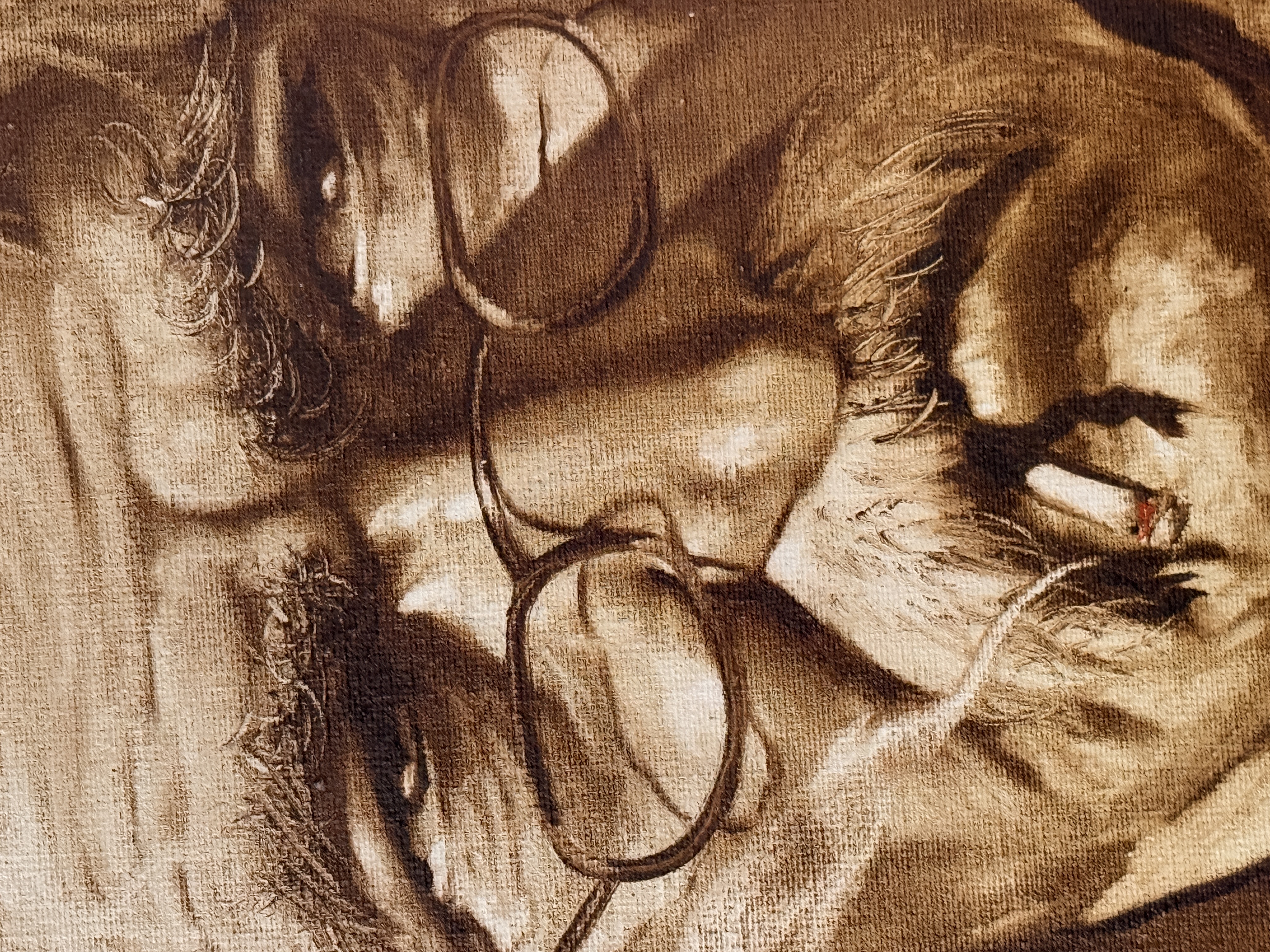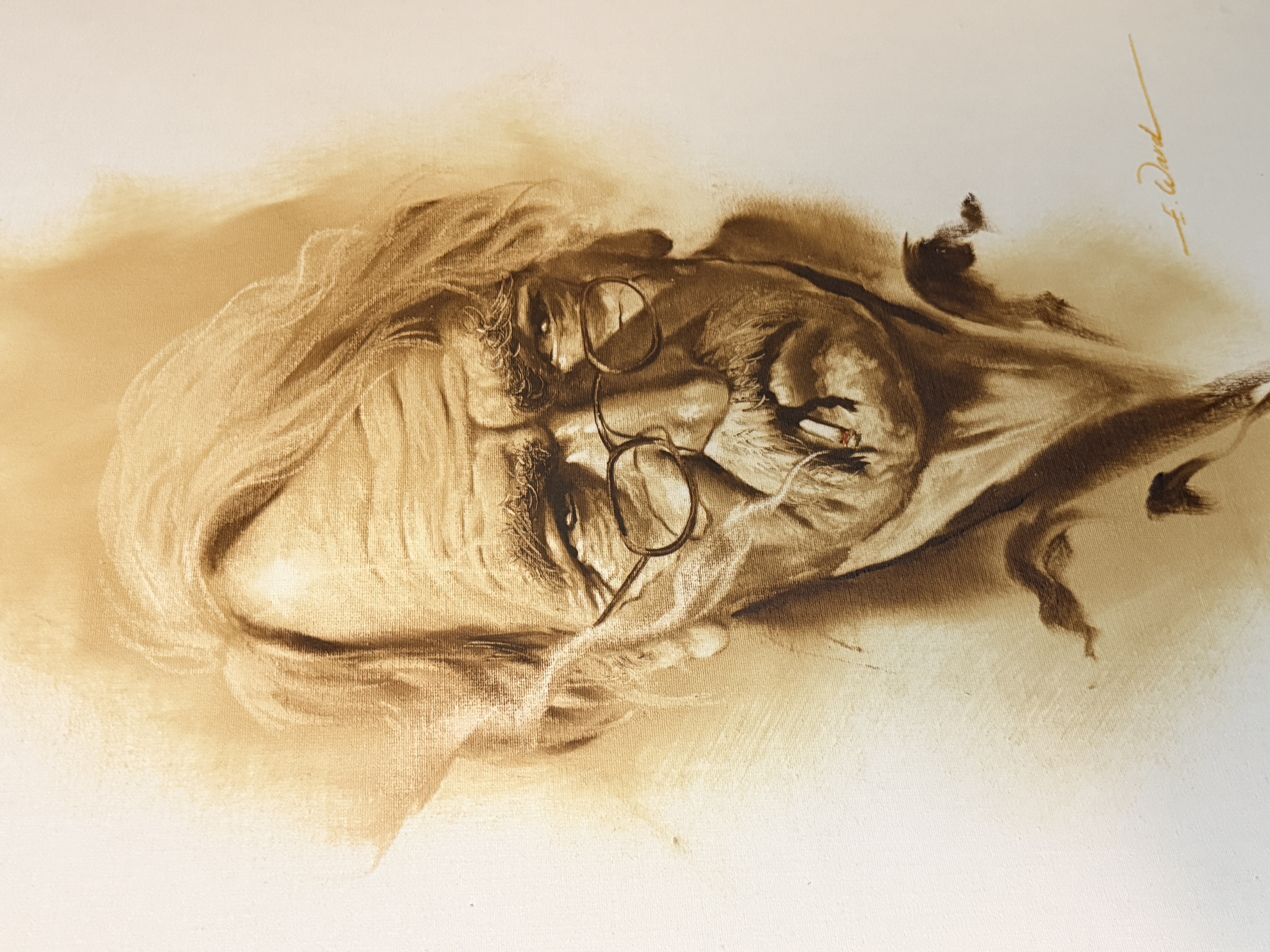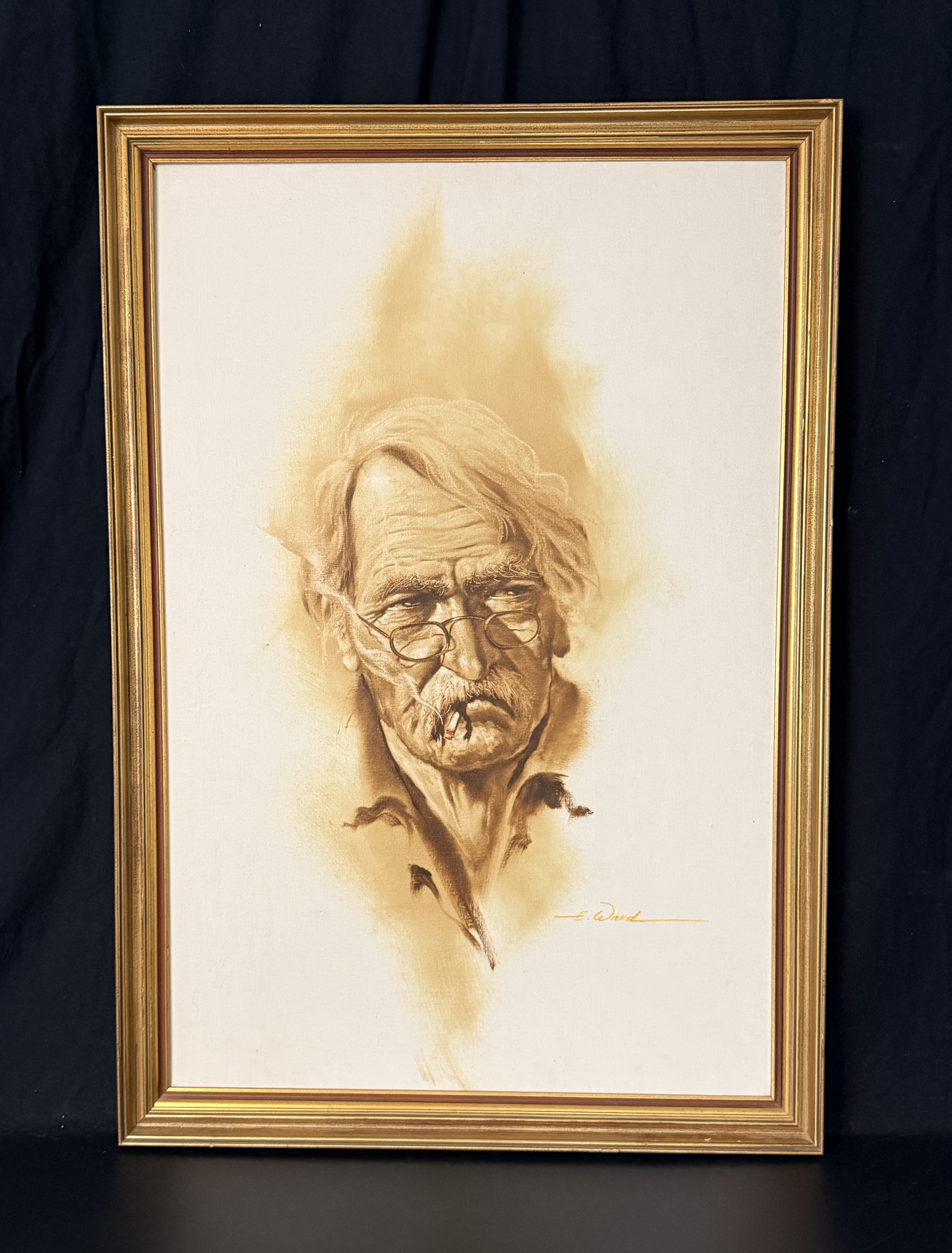 A monochromatic portrait painting on canvas depicting an elderly man with spectacles and a mustache, shown in a head-and-shoulders view while smoking a cigarette. The work is executed in a realistic style using sepia-toned pigments against a white background. The piece is signed – E. Ward – in the lower right. The painting is housed in a gold-toned wooden frame with a tiered profile and a reddish-brown inner border. On the reverse, the canvas is stapled to a wooden stretcher and fitted with a wire hanging assembly. A red numeric inscription reading #7053 810 is present on the back of the canvas.