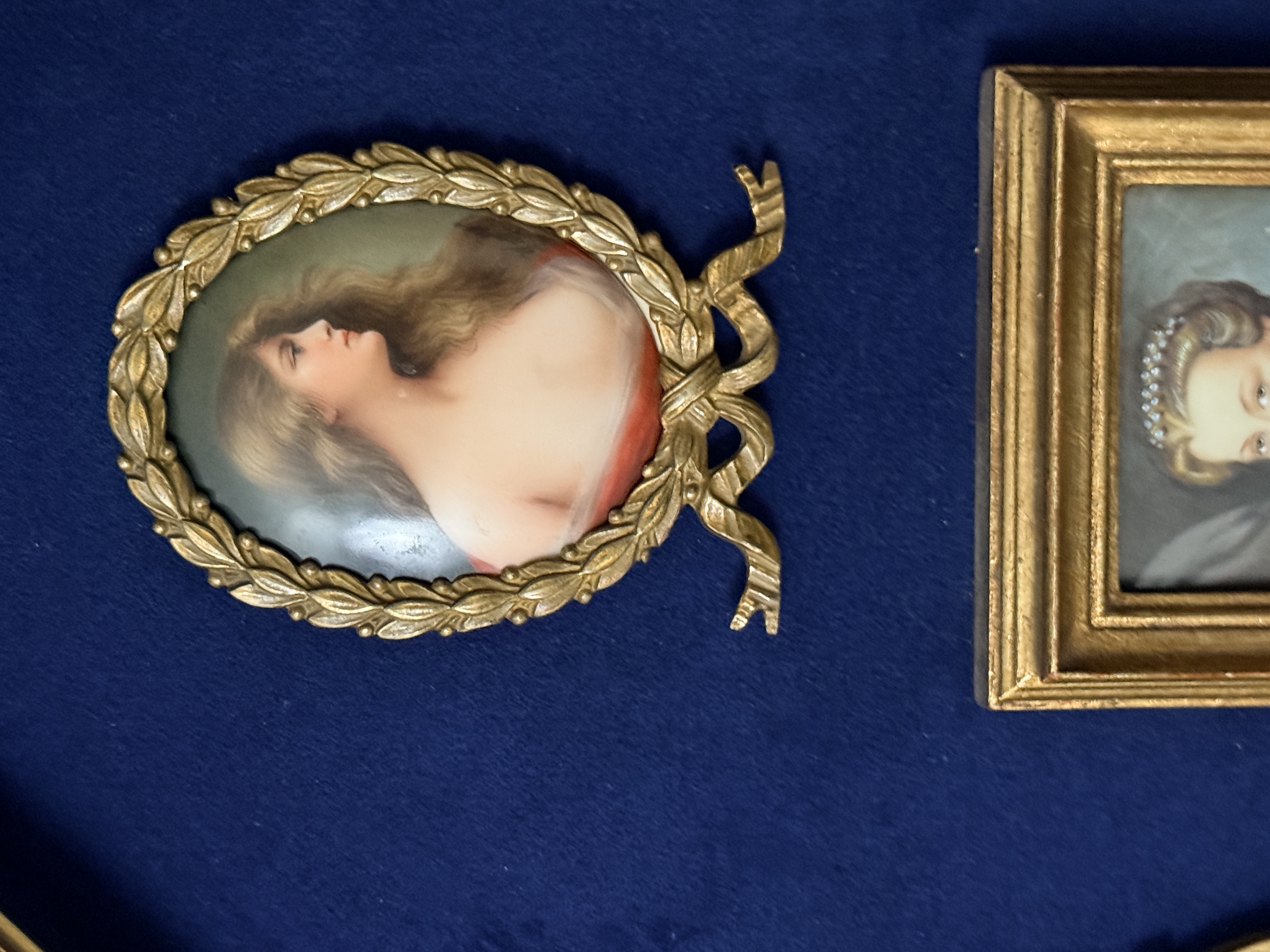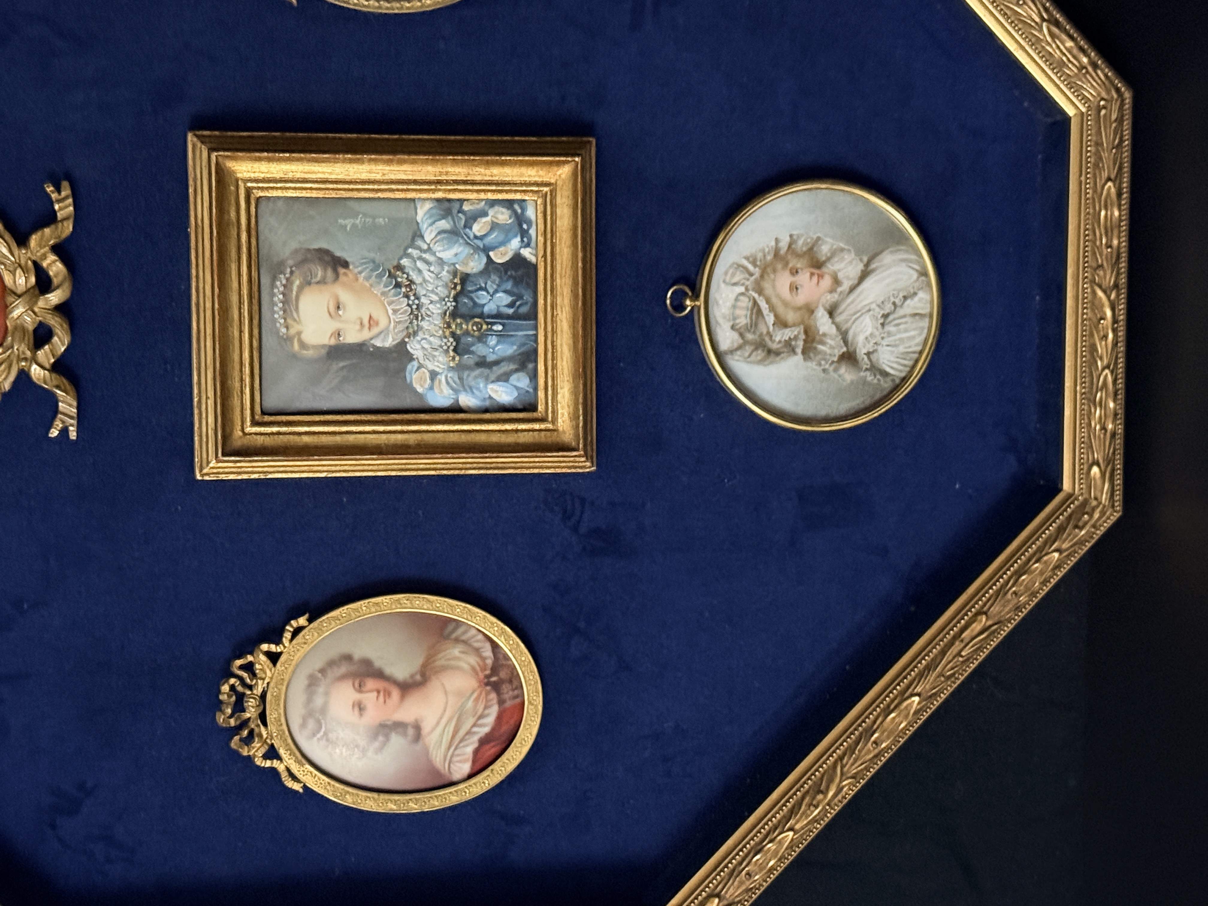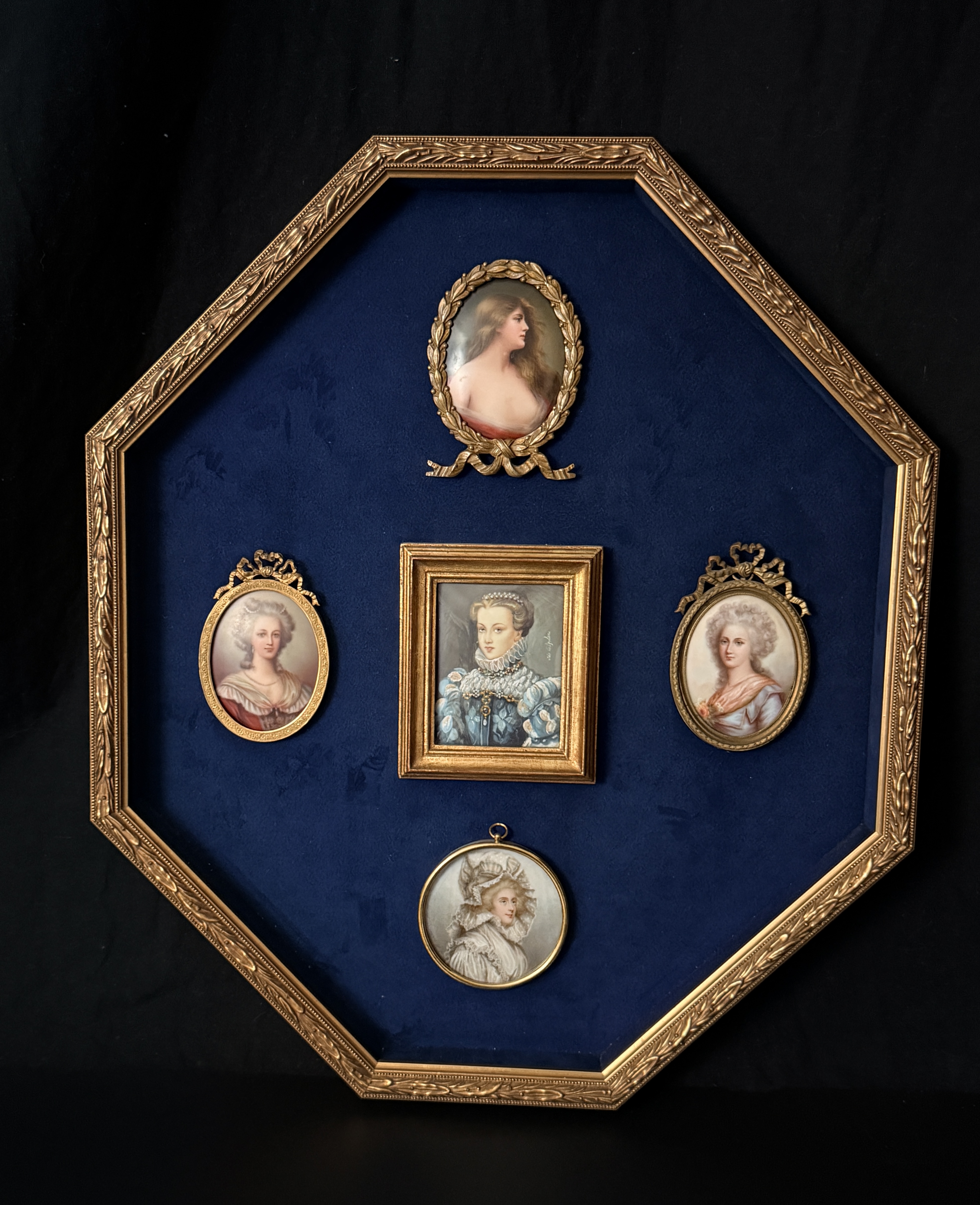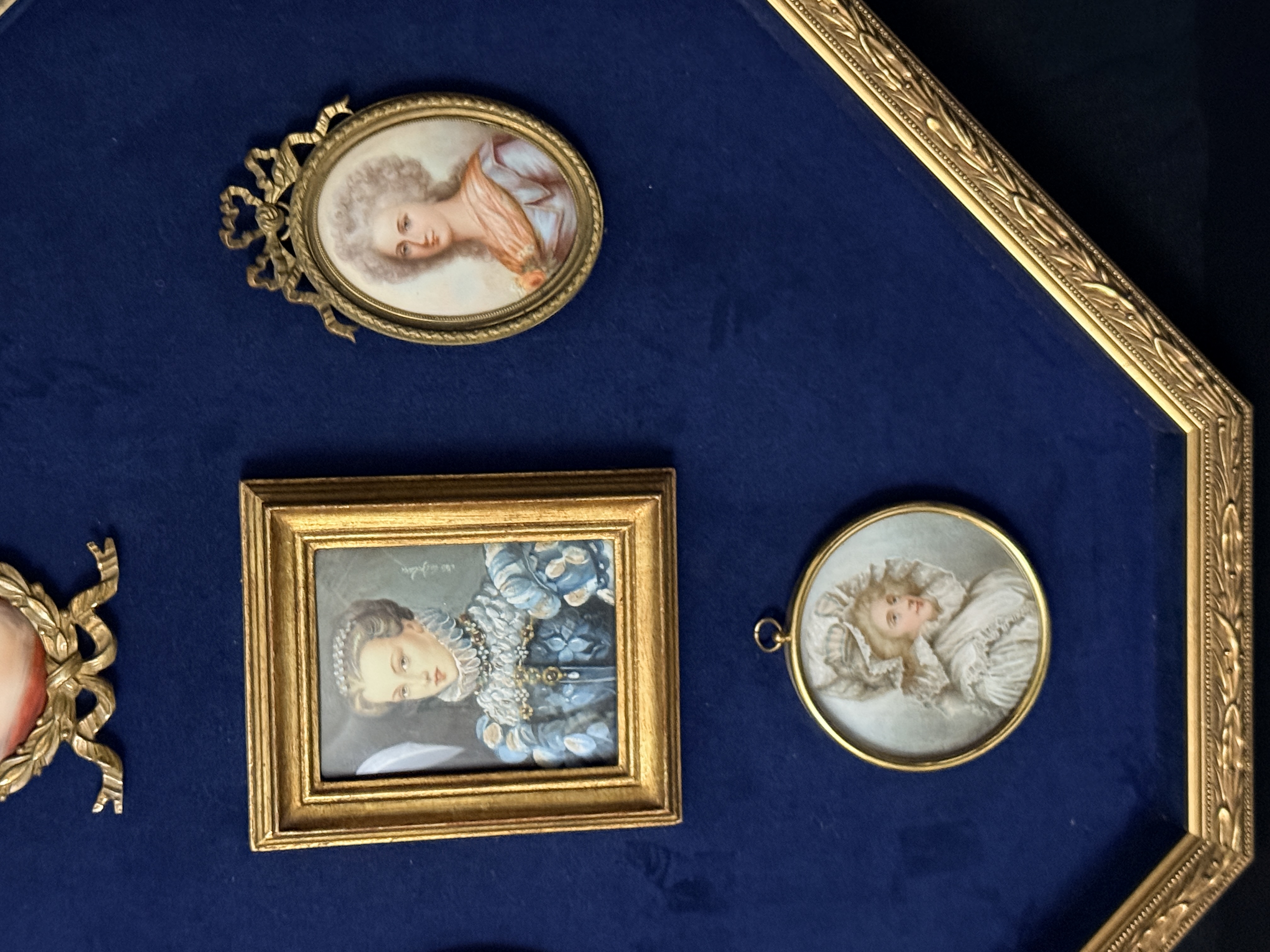 The assembly is in very good condition. The miniatures appear well-preserved with no visible loss to the painted surfaces. The individual frames and the primary octagonal frame show minor surface wear and light oxidation consistent with age. The velvet lining is intact and free of significant fading or staining. Art is from a clean smoke free home.