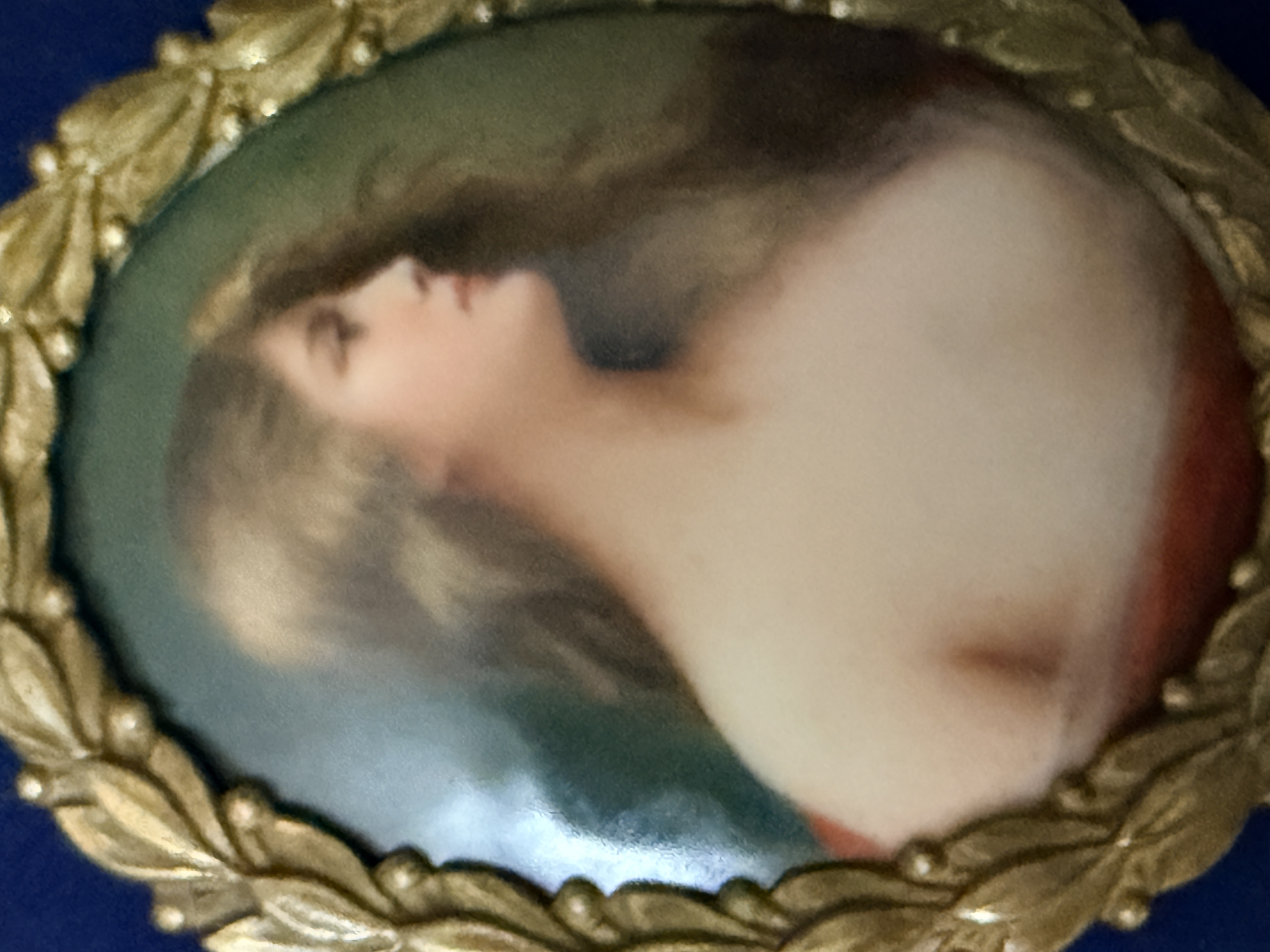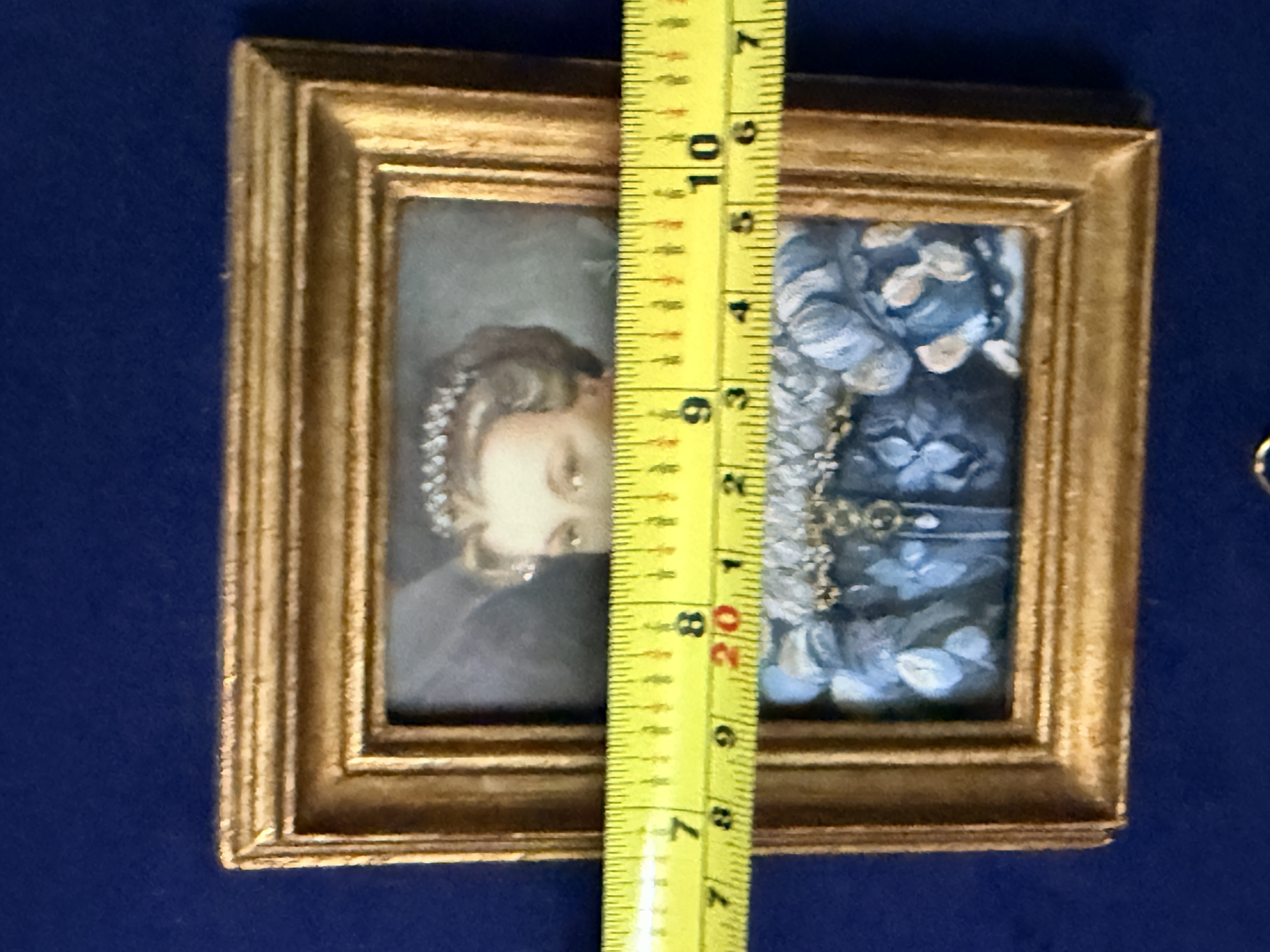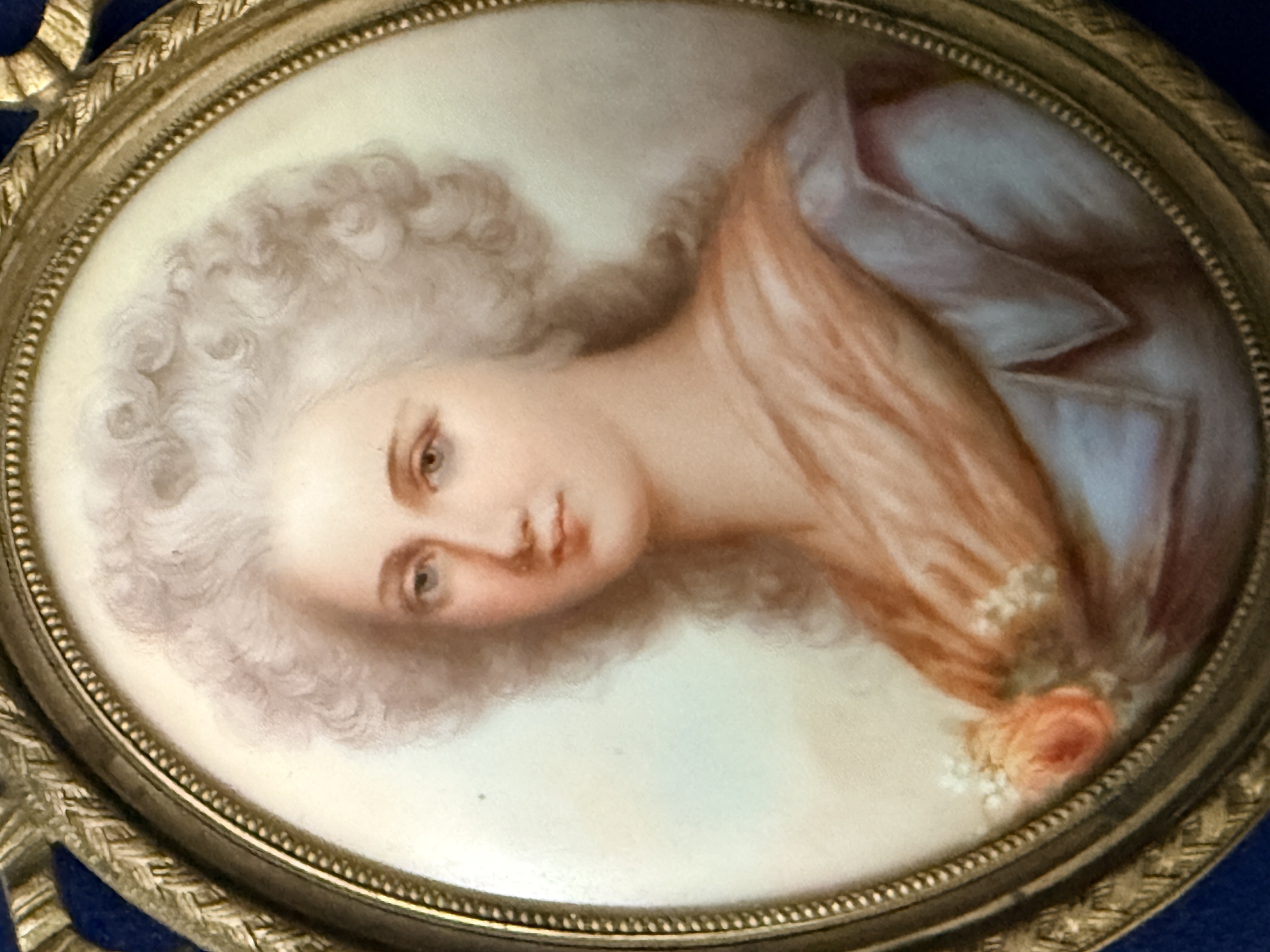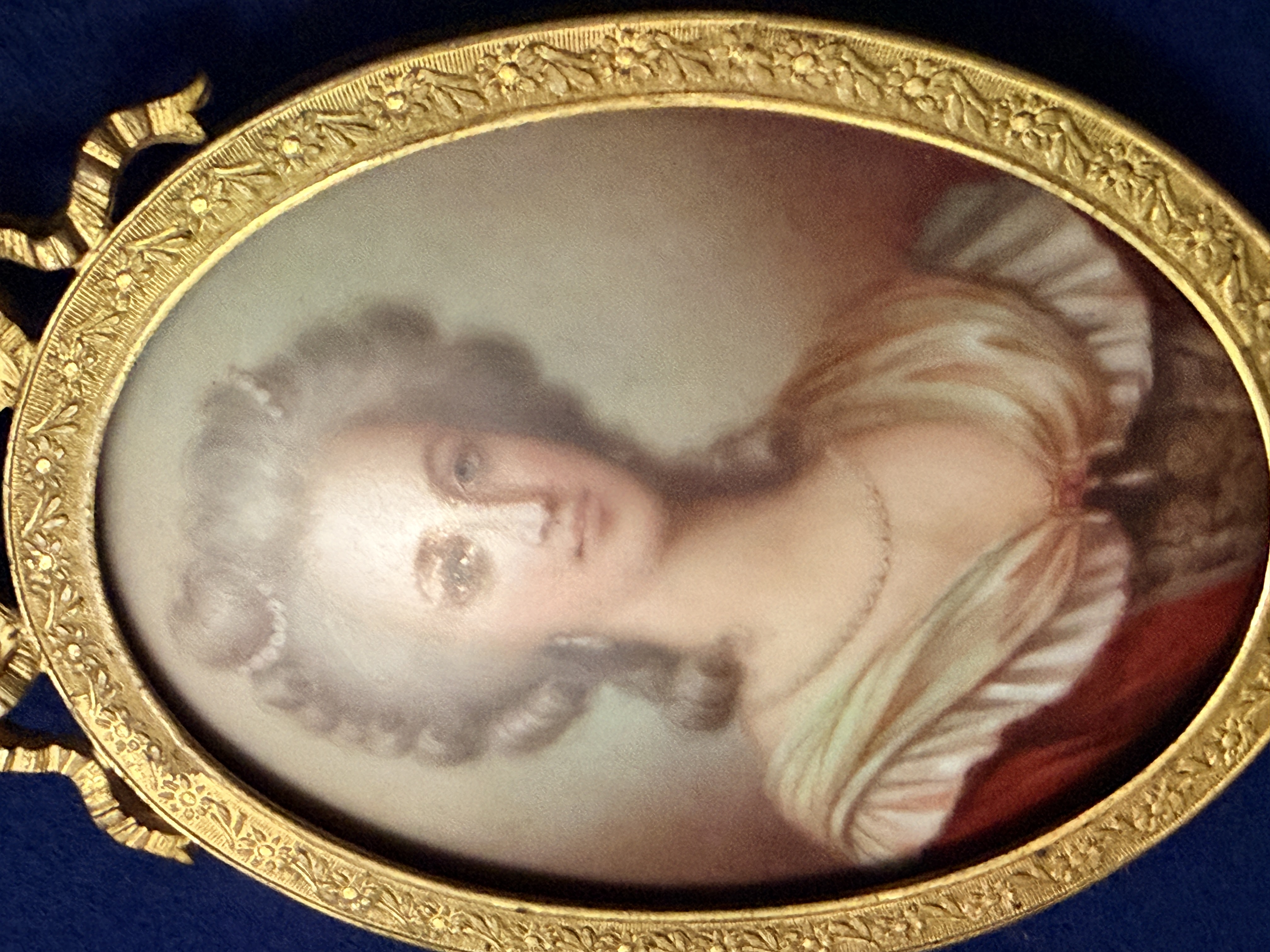 The assembly is in very good condition. The miniatures appear well-preserved with no visible loss to the painted surfaces. The individual frames and the primary octagonal frame show minor surface wear and light oxidation consistent with age. The velvet lining is intact and free of significant fading or staining. Art is from a clean smoke free home.