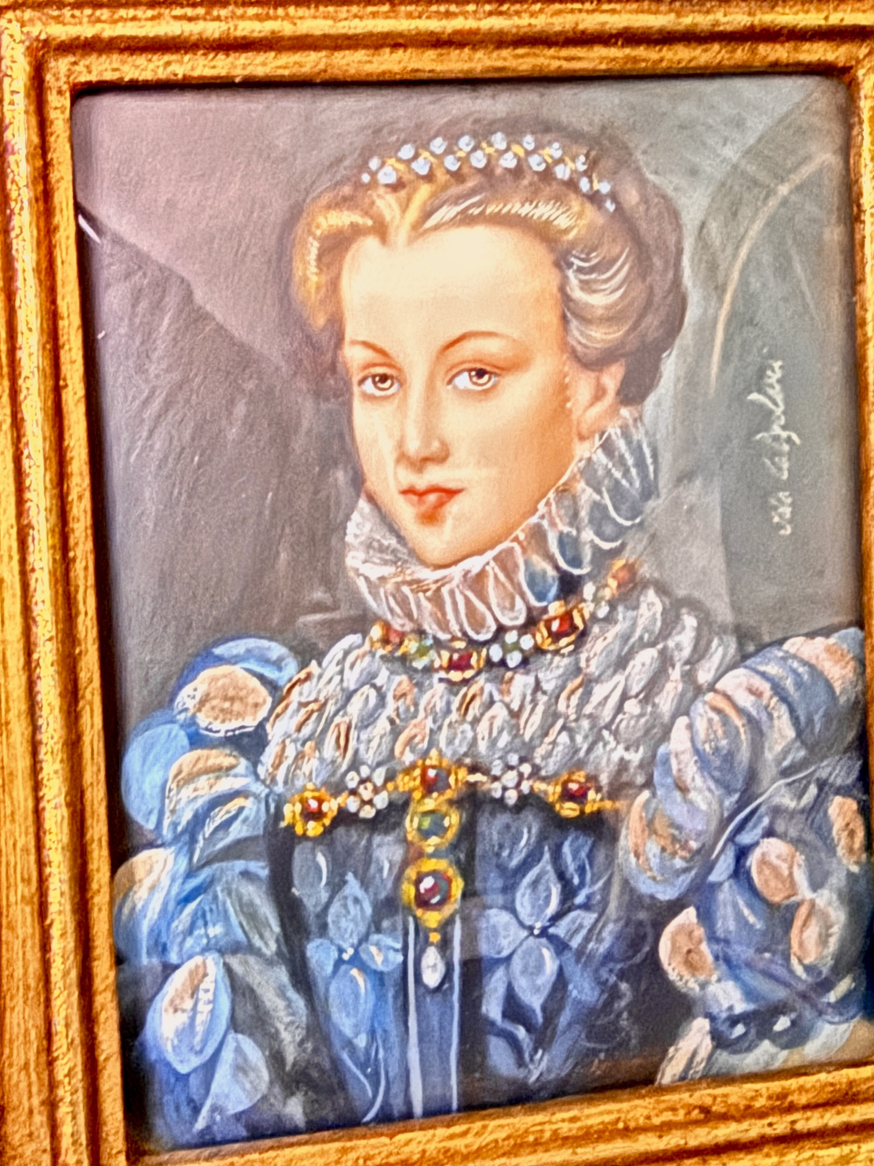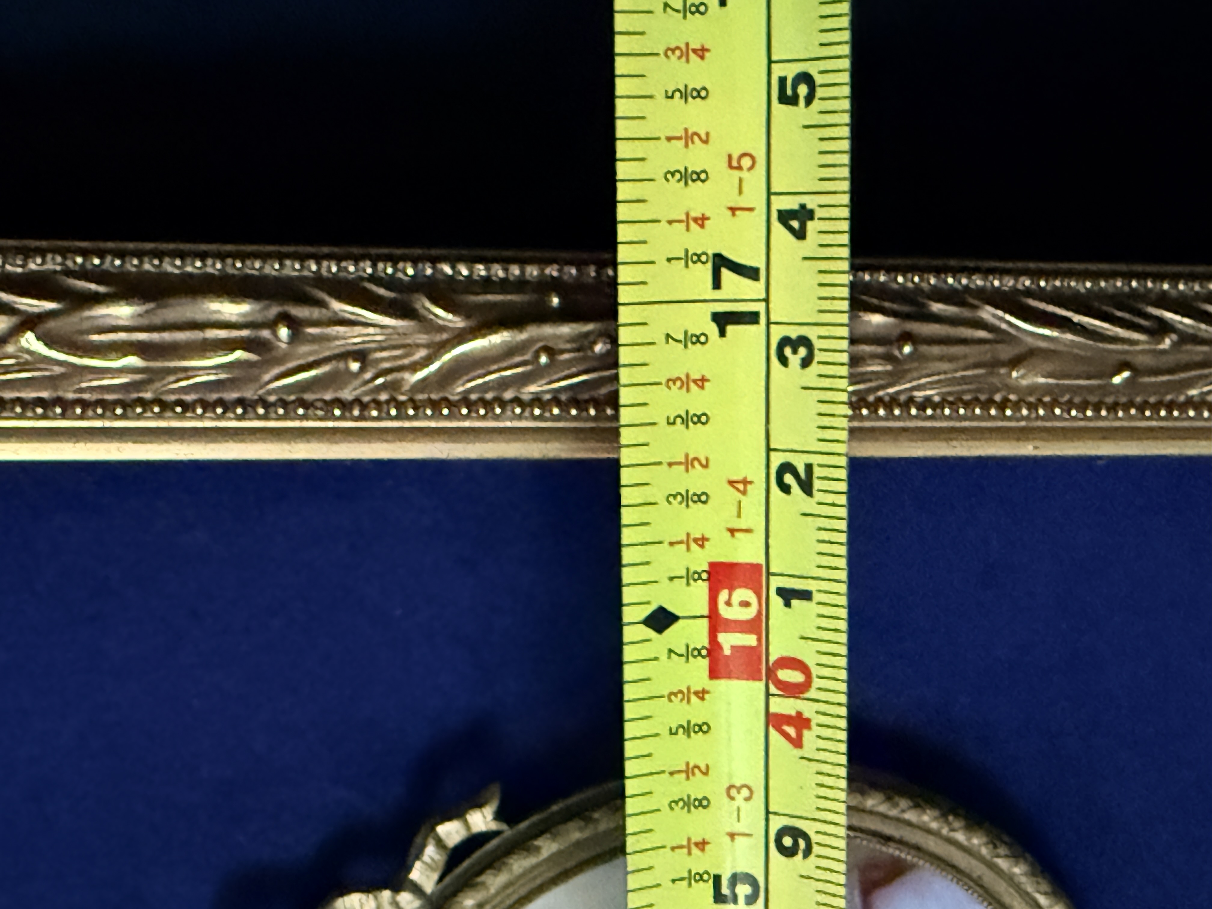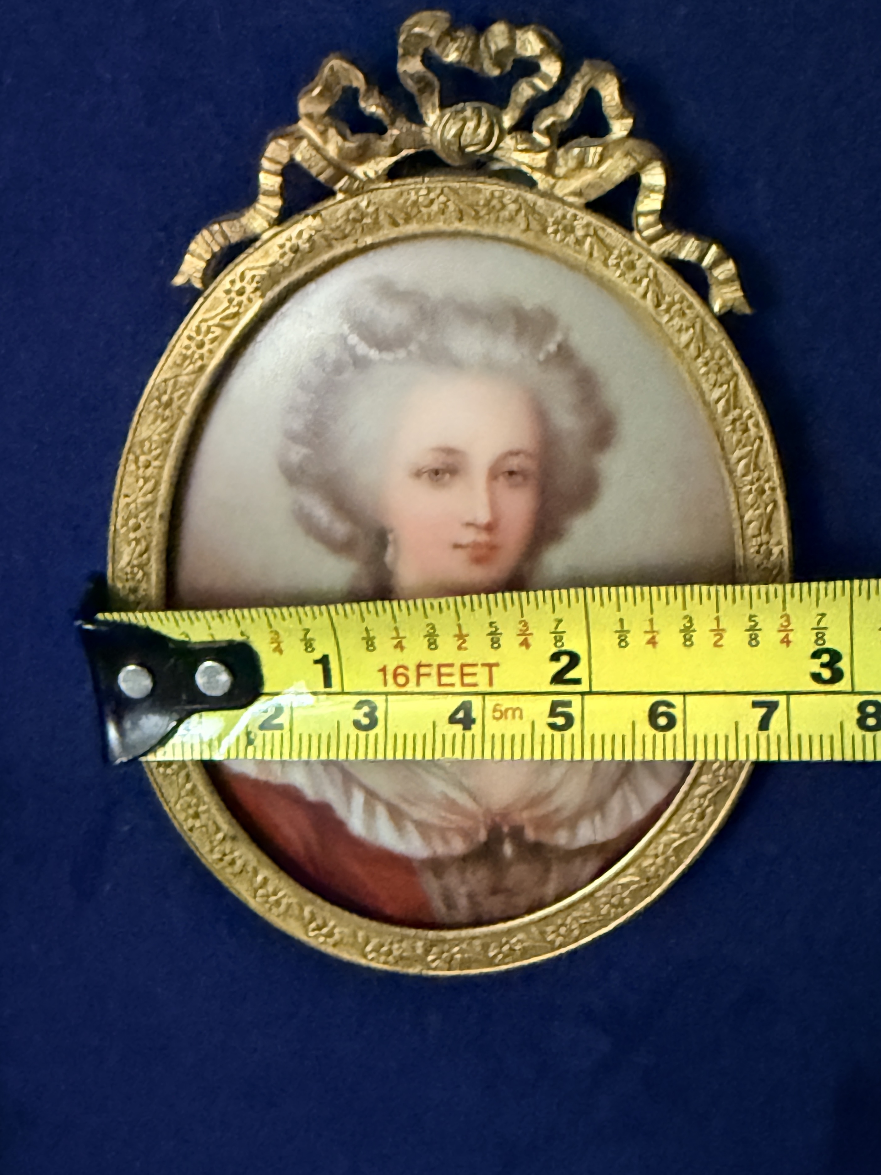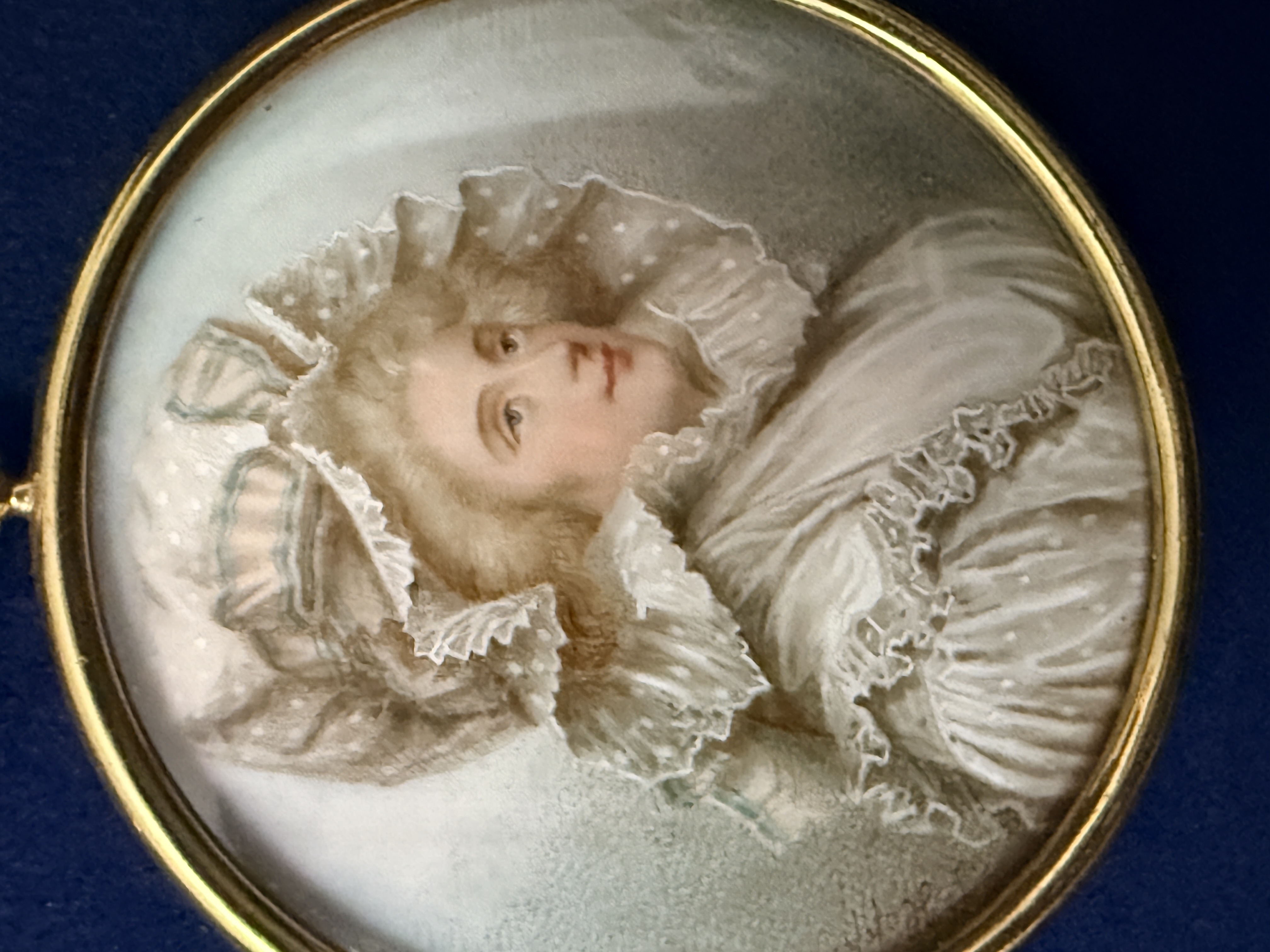 The assembly is in very good condition. The miniatures appear well-preserved with no visible loss to the painted surfaces. The individual frames and the primary octagonal frame show minor surface wear and light oxidation consistent with age. The velvet lining is intact and free of significant fading or staining. Art is from a clean smoke free home.
