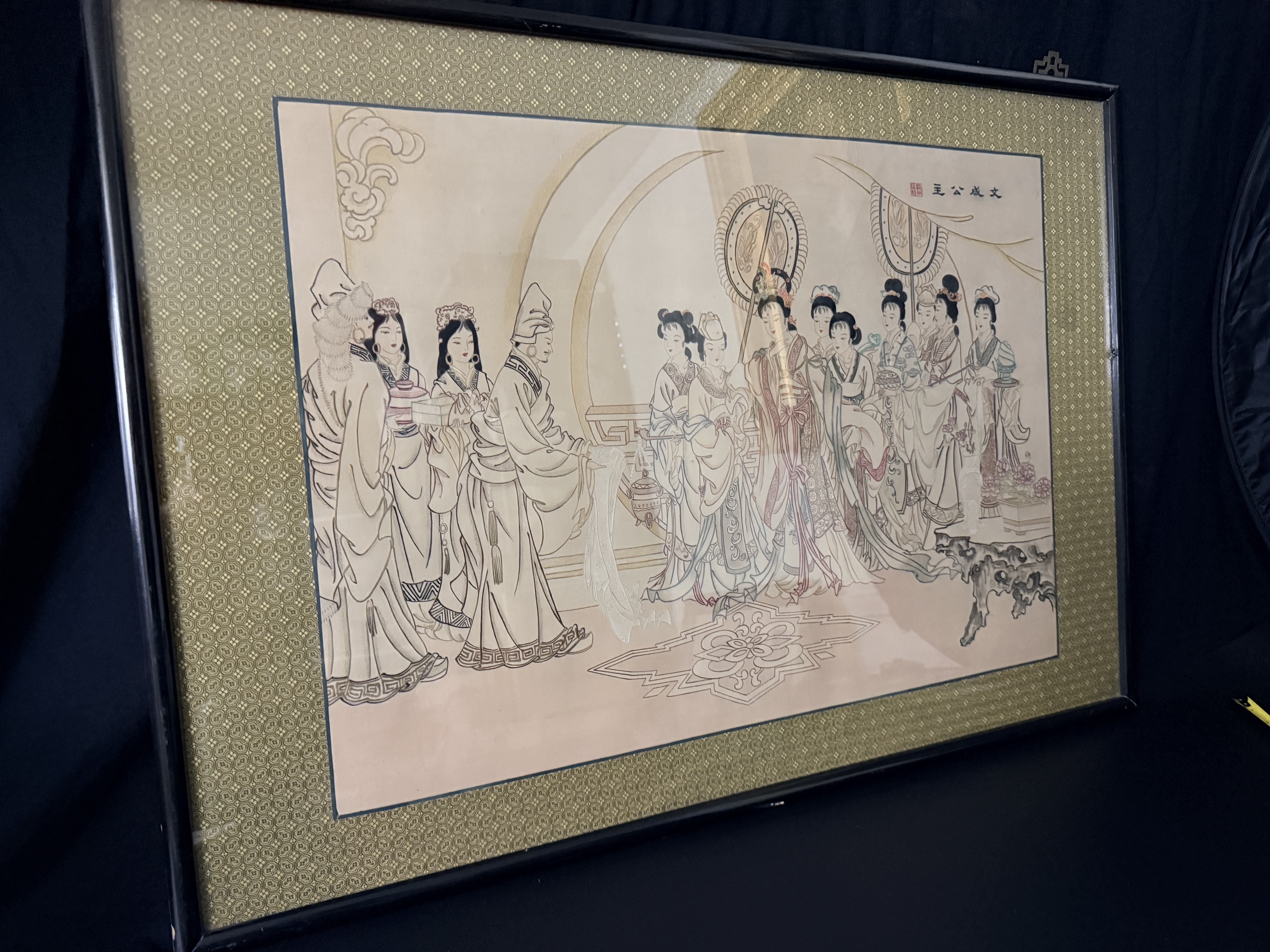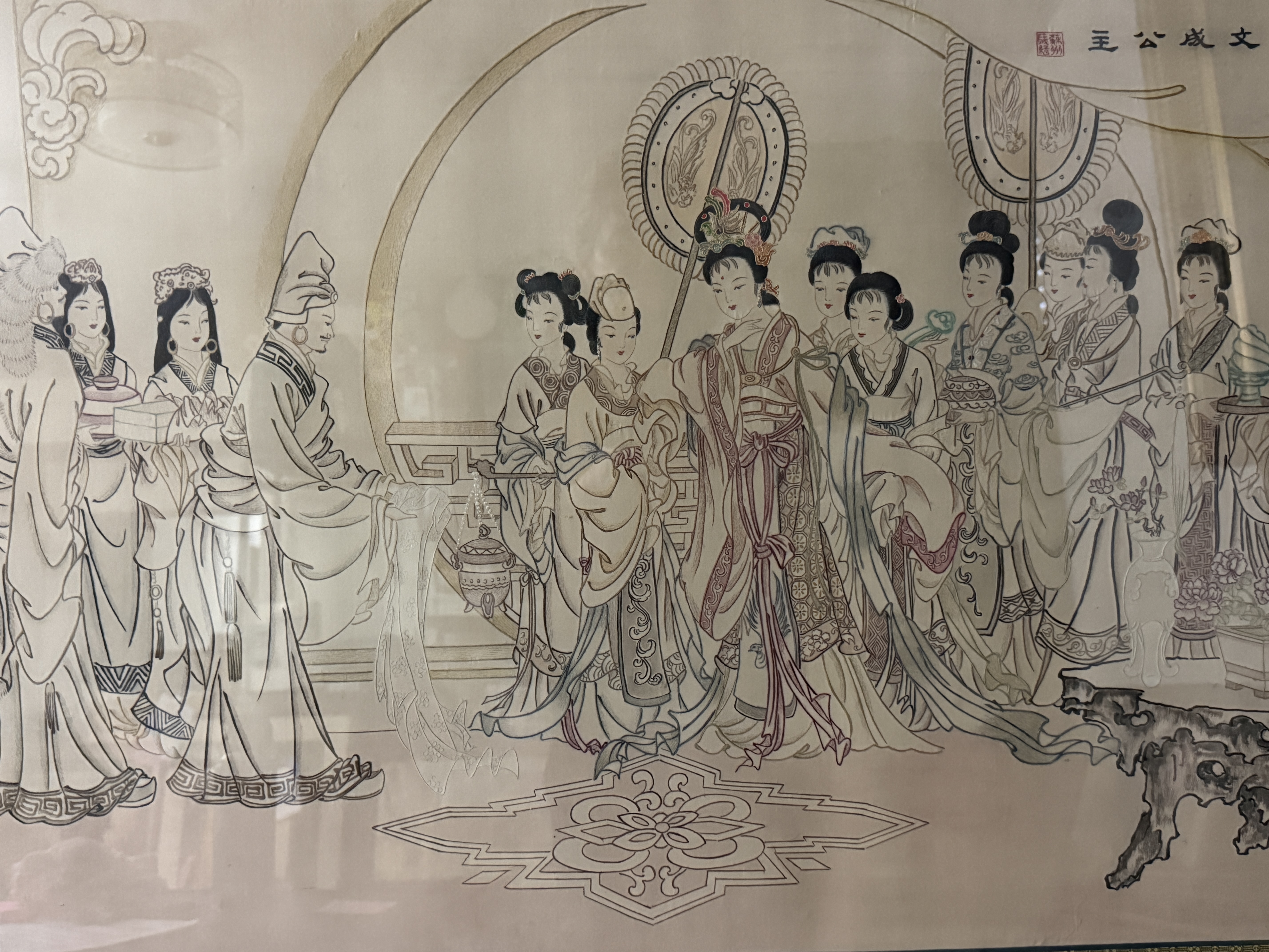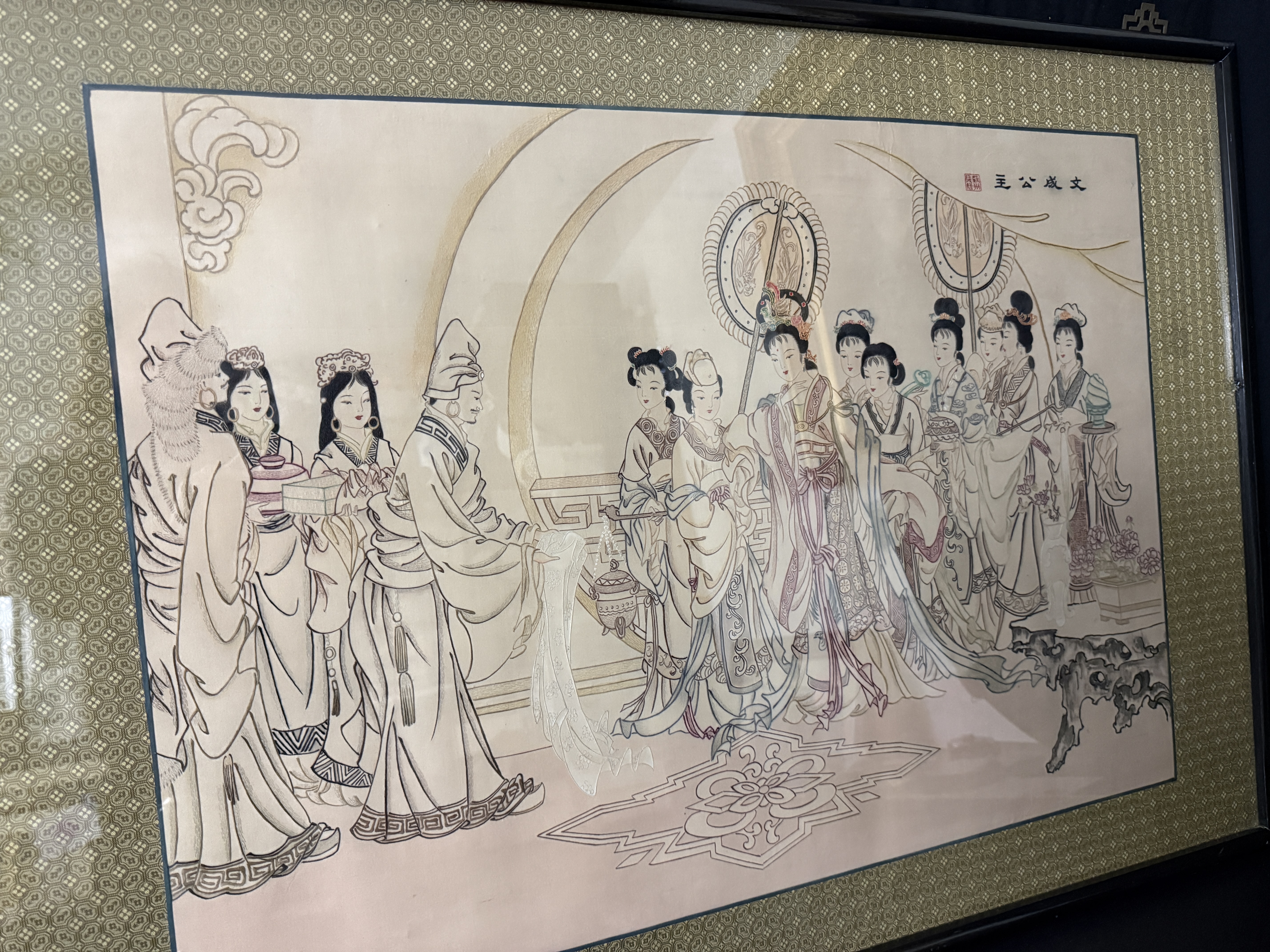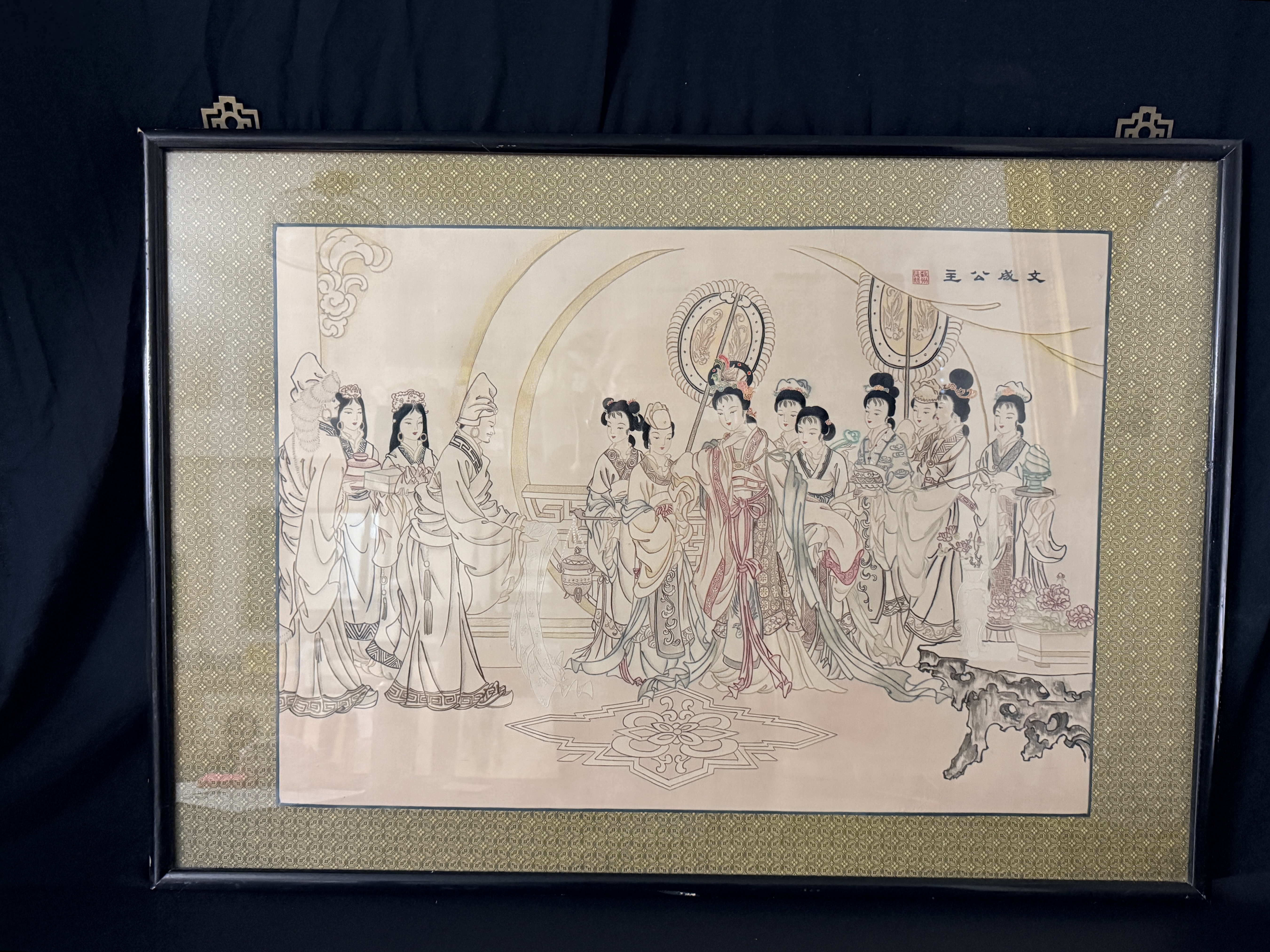 This framed Chinese embroidery is executed in the traditional human hair embroidery technique known as Moxiu. The central scene depicts Princess Wencheng and her attendants in courtly attire, rendered with fine line work. A calligraphic inscription at the upper right identifies the subject as Princess Wencheng, accompanied by a red artist seal. The composition and figure style are in the manner of the Eighty-Seven Immortals, a work traditionally attributed to the Tang dynasty artist Wu Daozi. The embroidery is mounted within a patterned gold-tone silk mat and housed in a dark-lacquered wood frame featuring decorative brass-tone hangers. The reverse includes a handwritten label identifying the medium as human hair and a printed label stating Made in China.