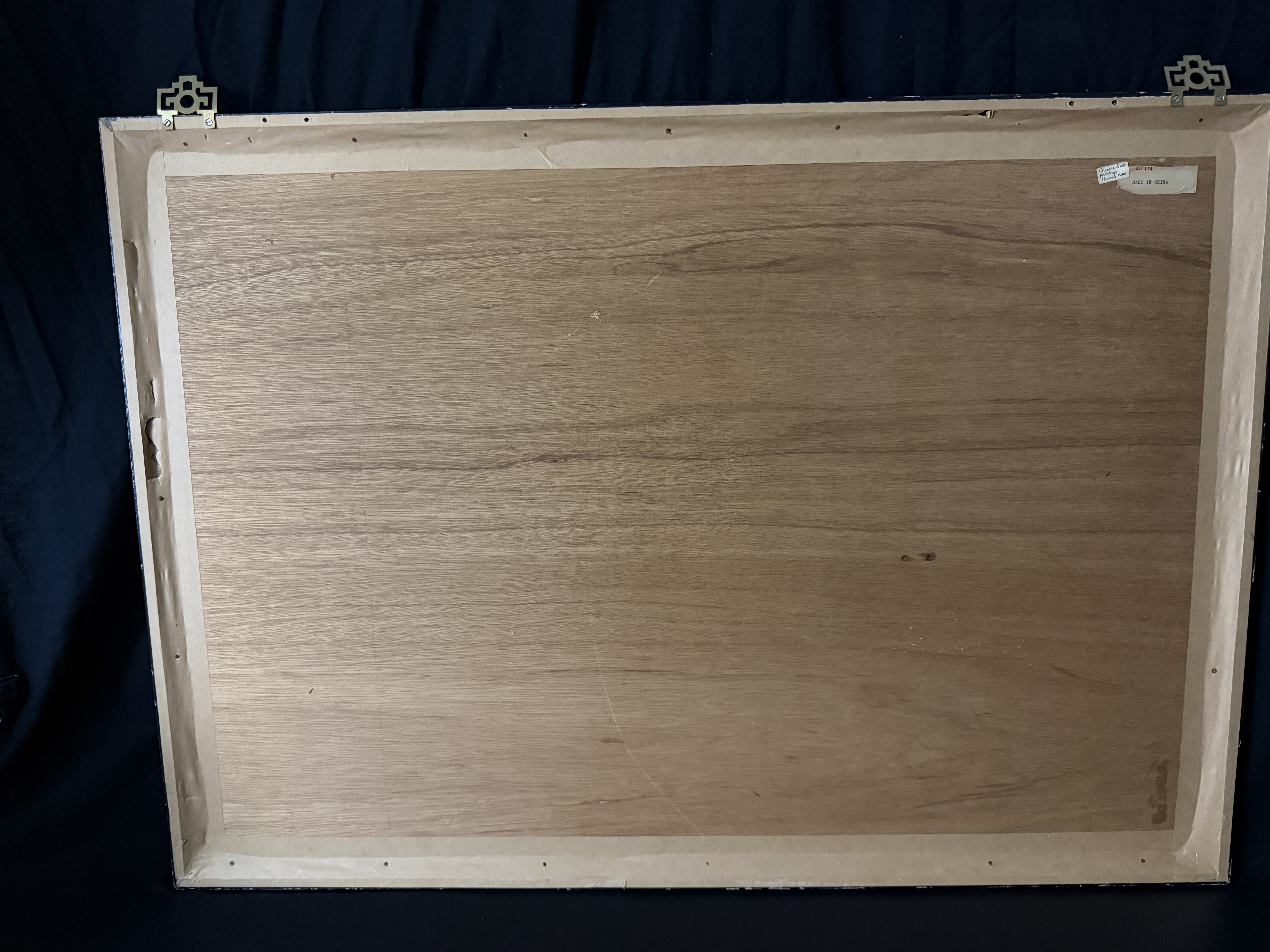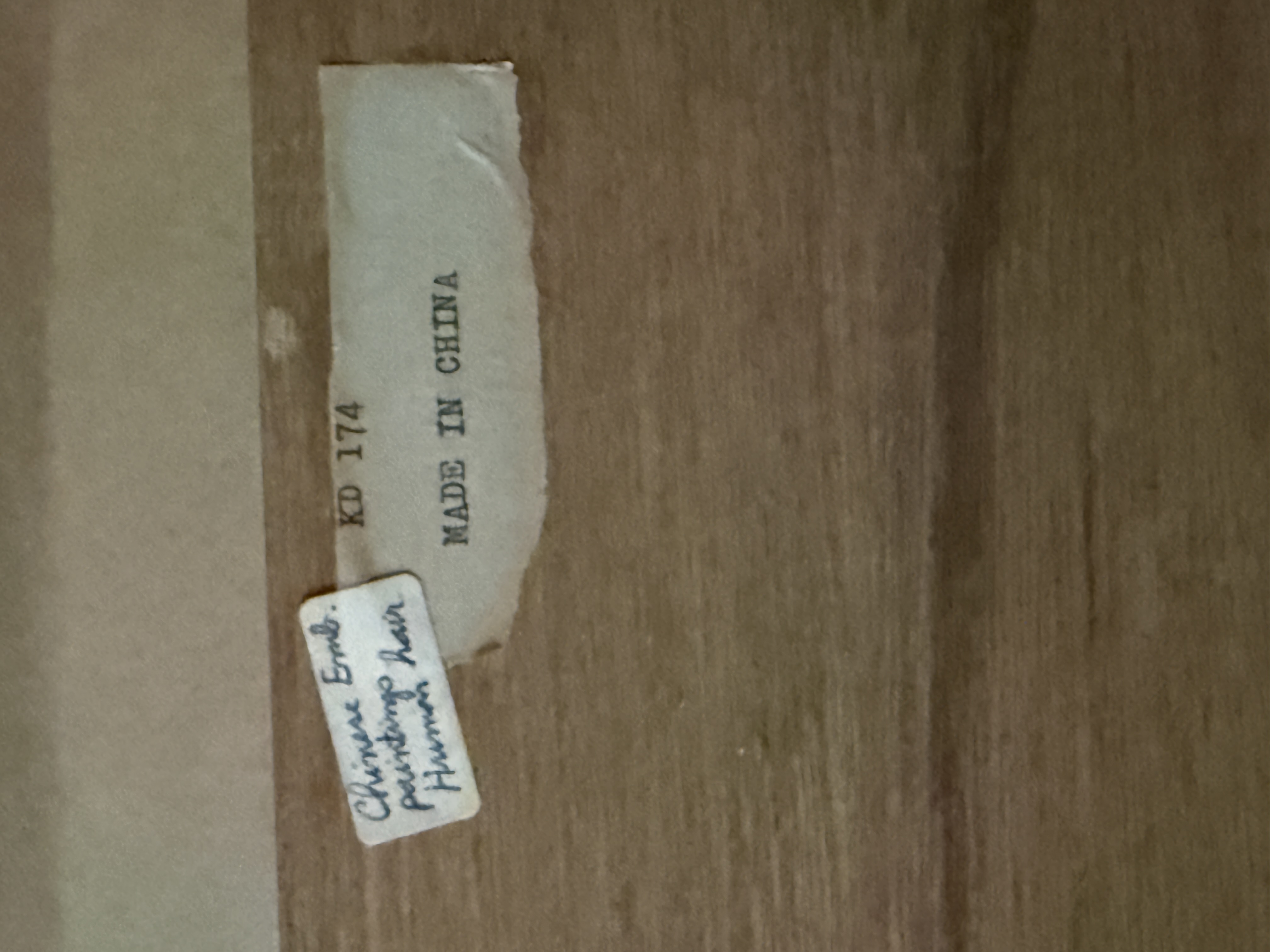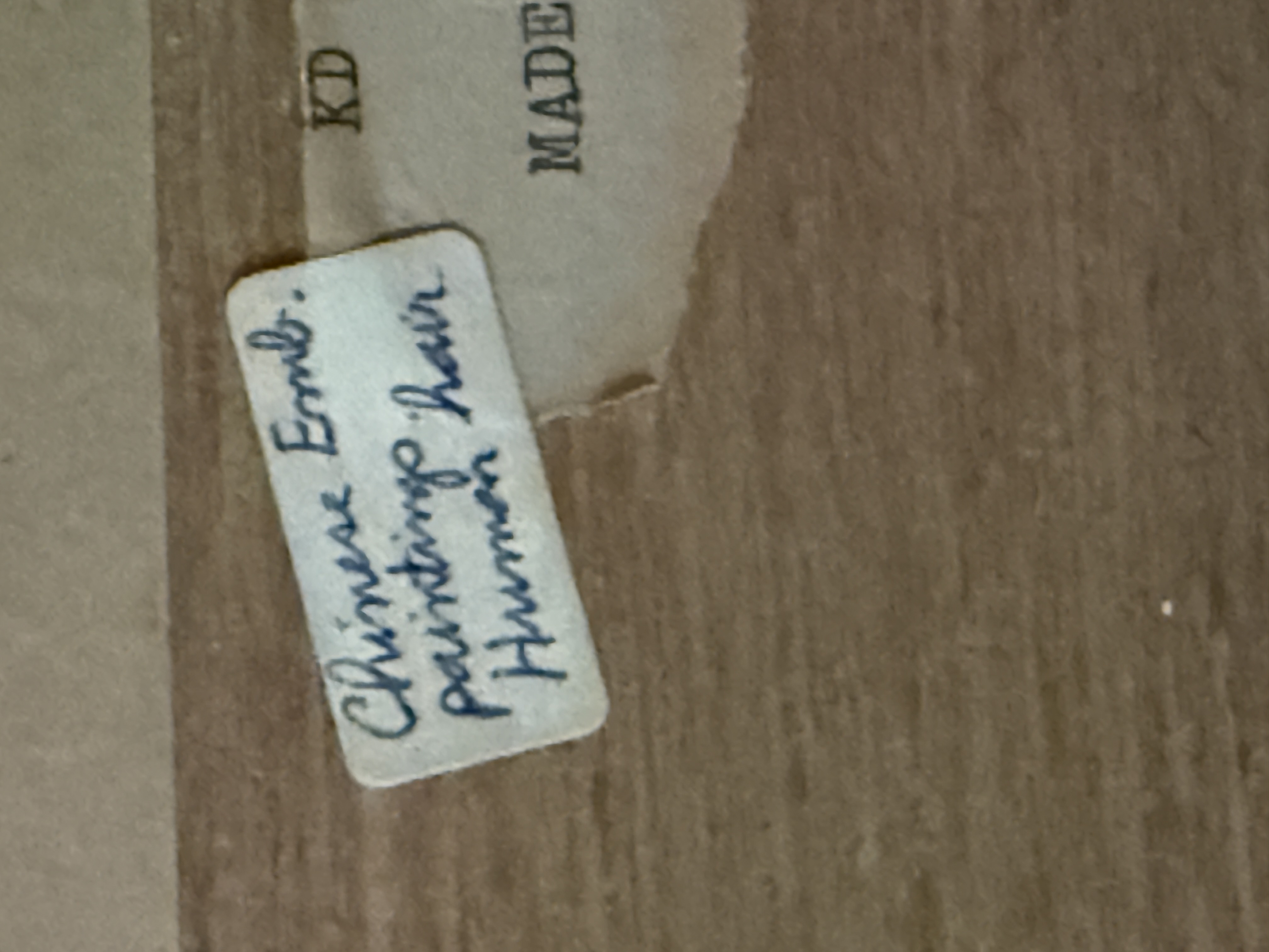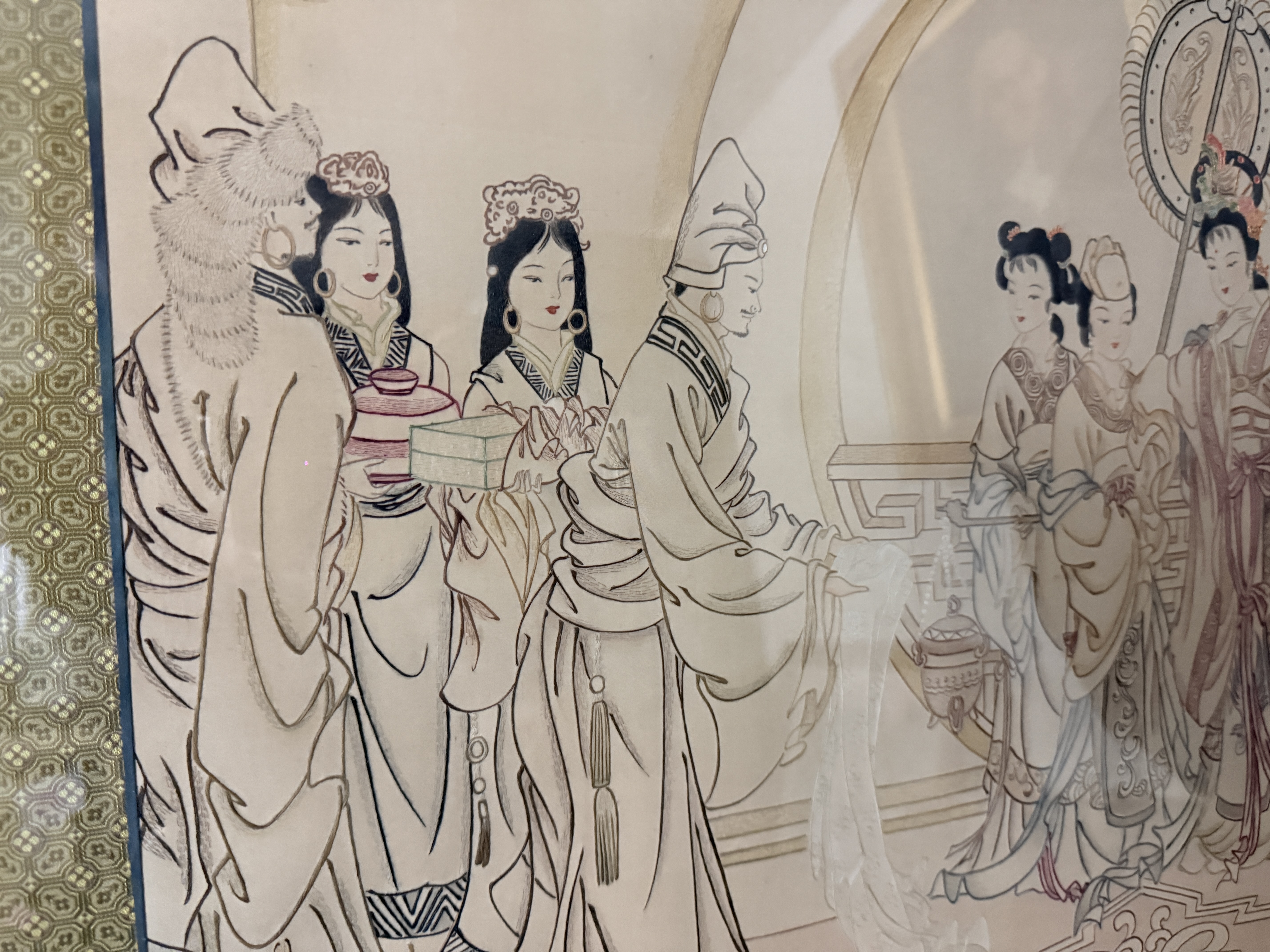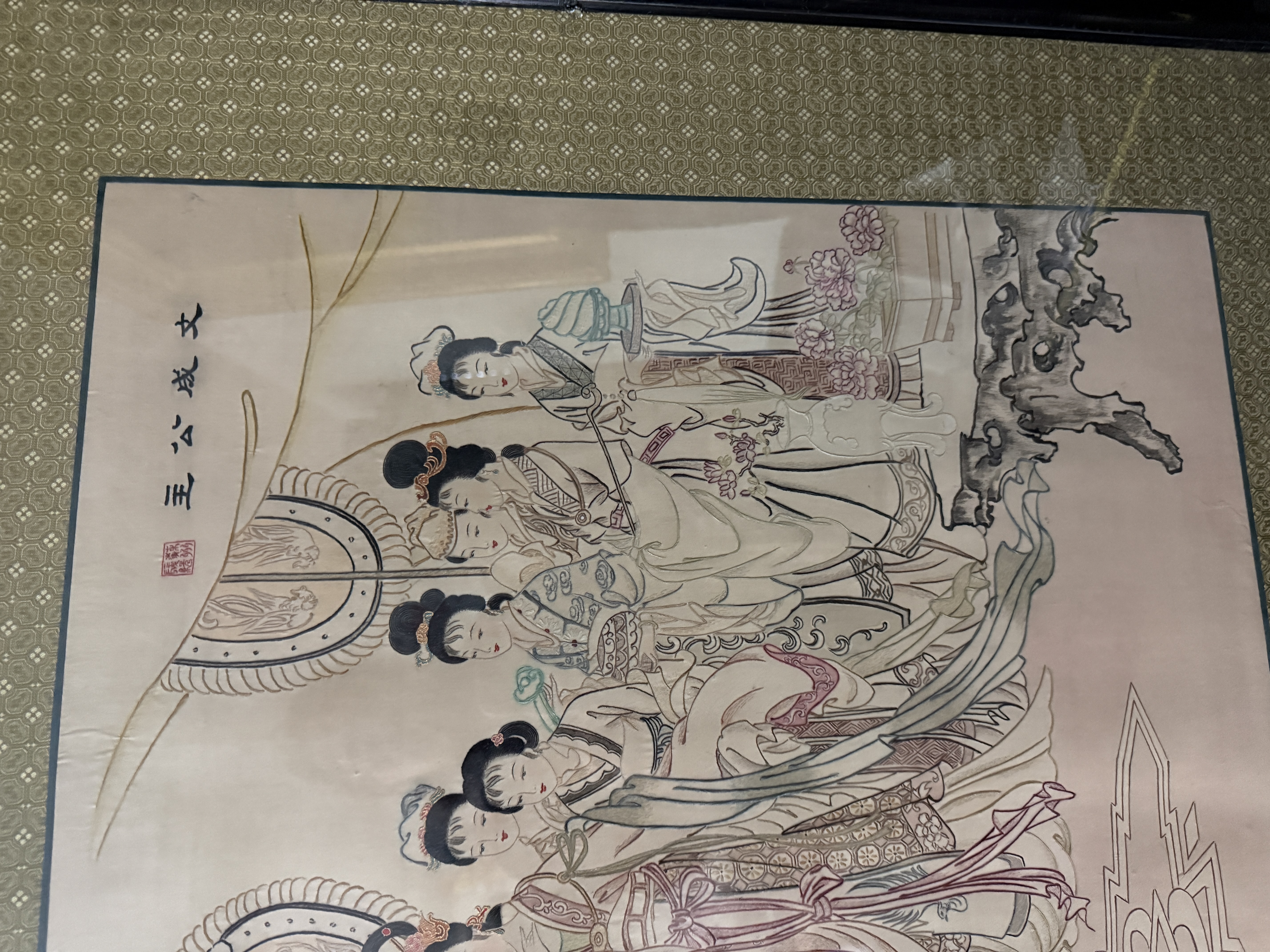 This framed Chinese embroidery is executed in the traditional human hair embroidery technique known as Moxiu. The central scene depicts Princess Wencheng and her attendants in courtly attire, rendered with fine line work. A calligraphic inscription at the upper right identifies the subject as Princess Wencheng, accompanied by a red artist seal. The composition and figure style are in the manner of the Eighty-Seven Immortals, a work traditionally attributed to the Tang dynasty artist Wu Daozi. The embroidery is mounted within a patterned gold-tone silk mat and housed in a dark-lacquered wood frame featuring decorative brass-tone hangers. The reverse includes a handwritten label identifying the medium as human hair and a printed label stating Made in China.