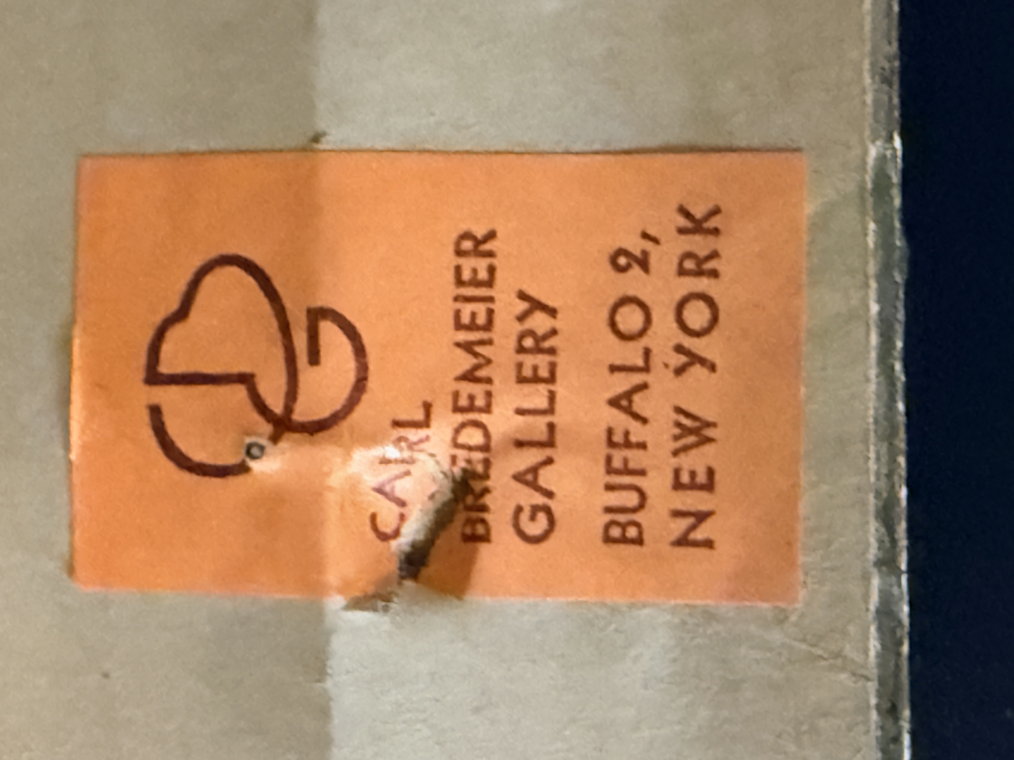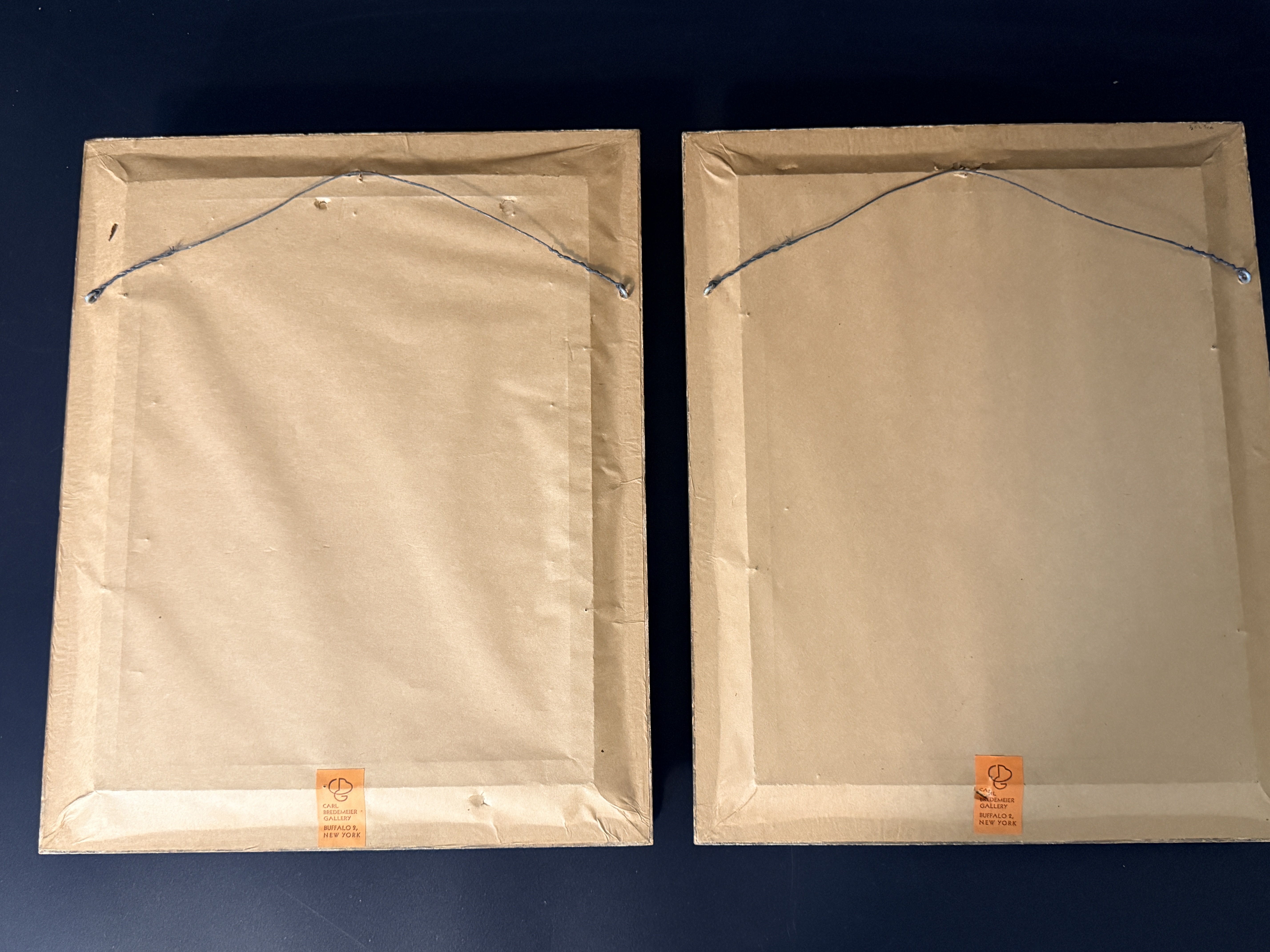 A pair of mid-20th-century impressionistic landscape paintings, executed in oil on canvas board. The first work depicts a sun-dappled forest clearing with a palette of ochre, orange, and soft blue tones. The second work features a shaded forest interior with prominent upright and fallen tree trunks in earthy greens and browns. One painting contains an illegible signature in the lower-right corner. Both works are housed in matching ornate, Rococo-style gilded frames with off-white fabric liners. The reverse of each frame bears a small orange gallery label for the Carl Bredemeier Gallery of Buffalo, New York.