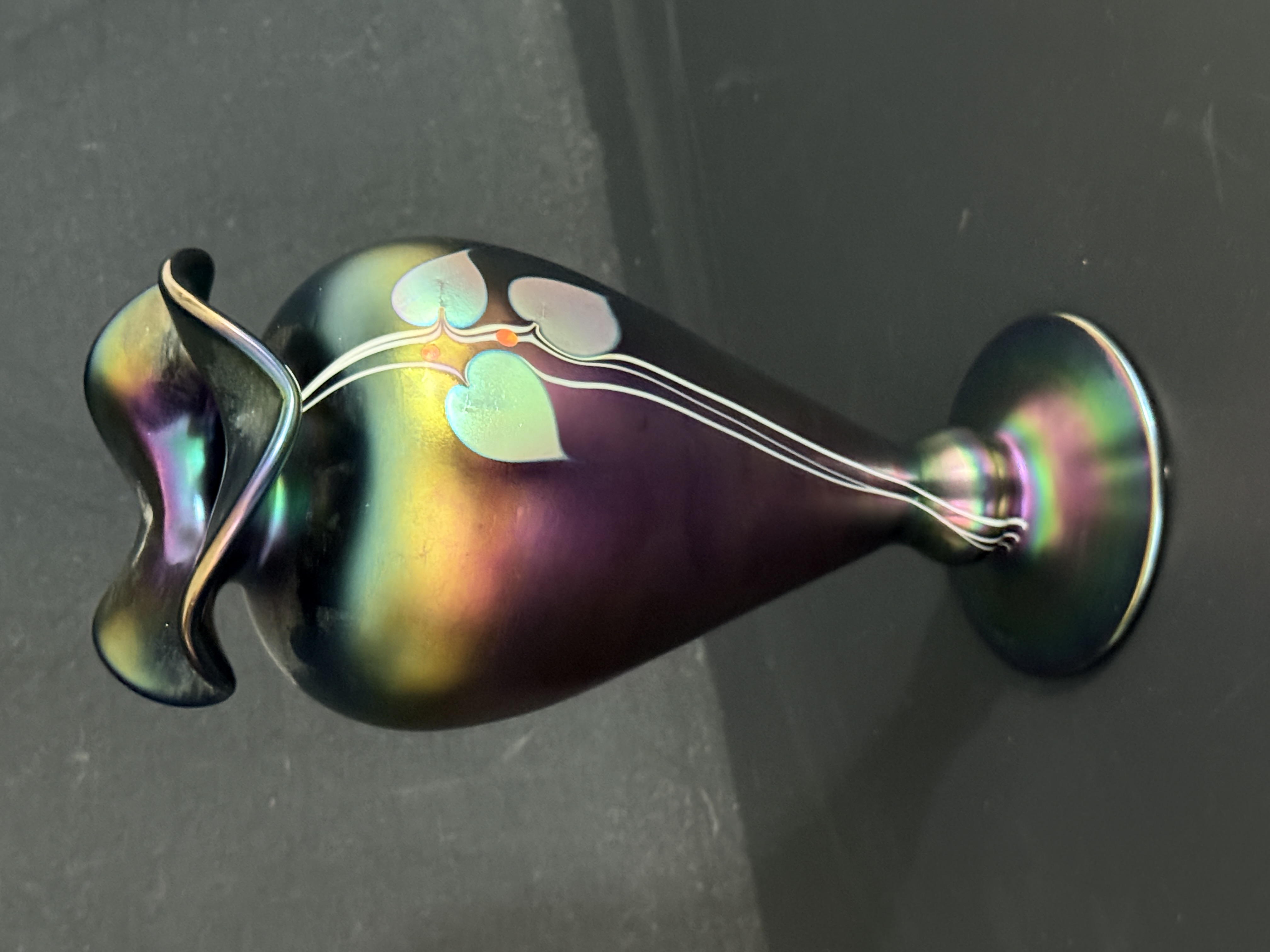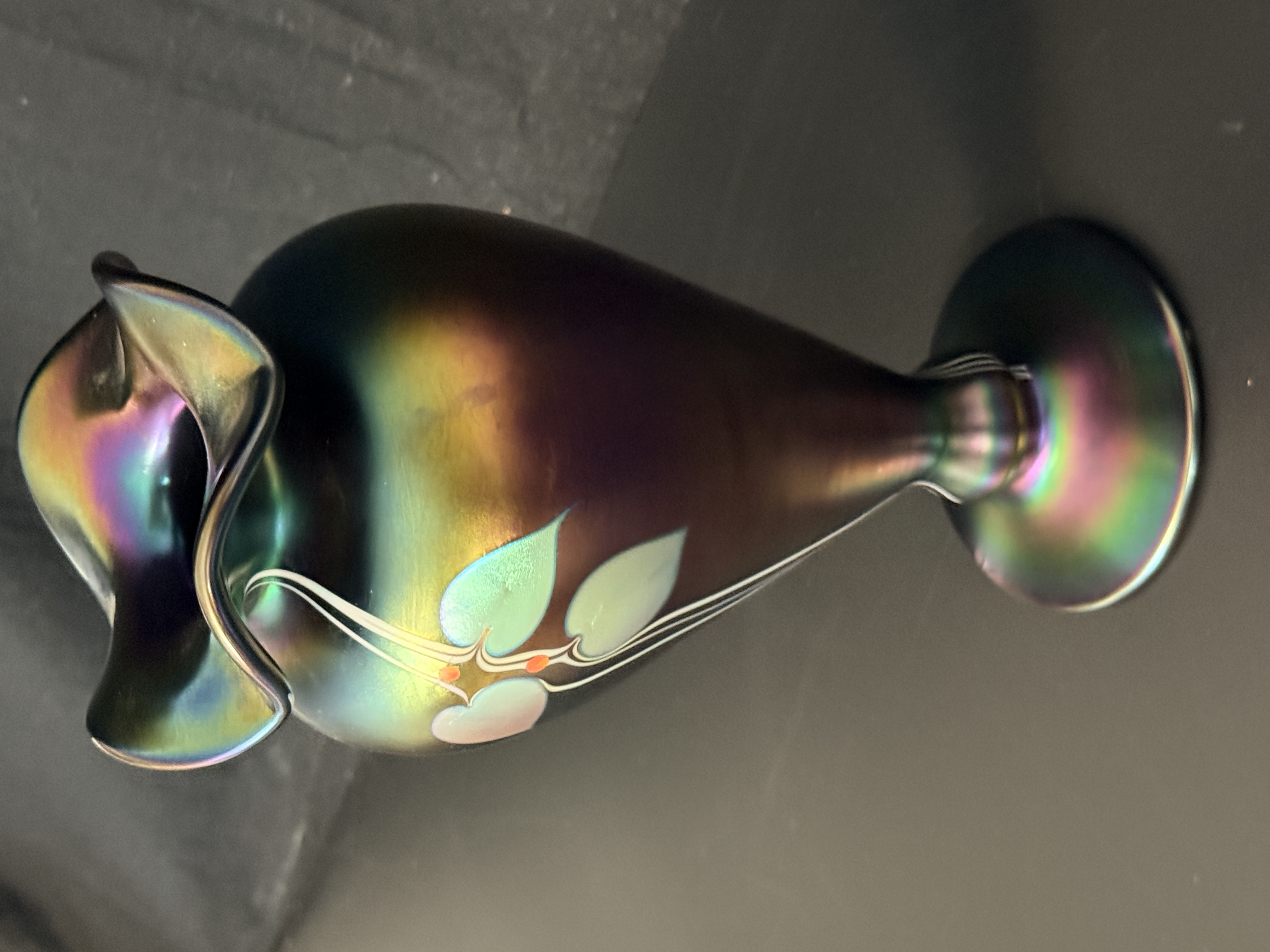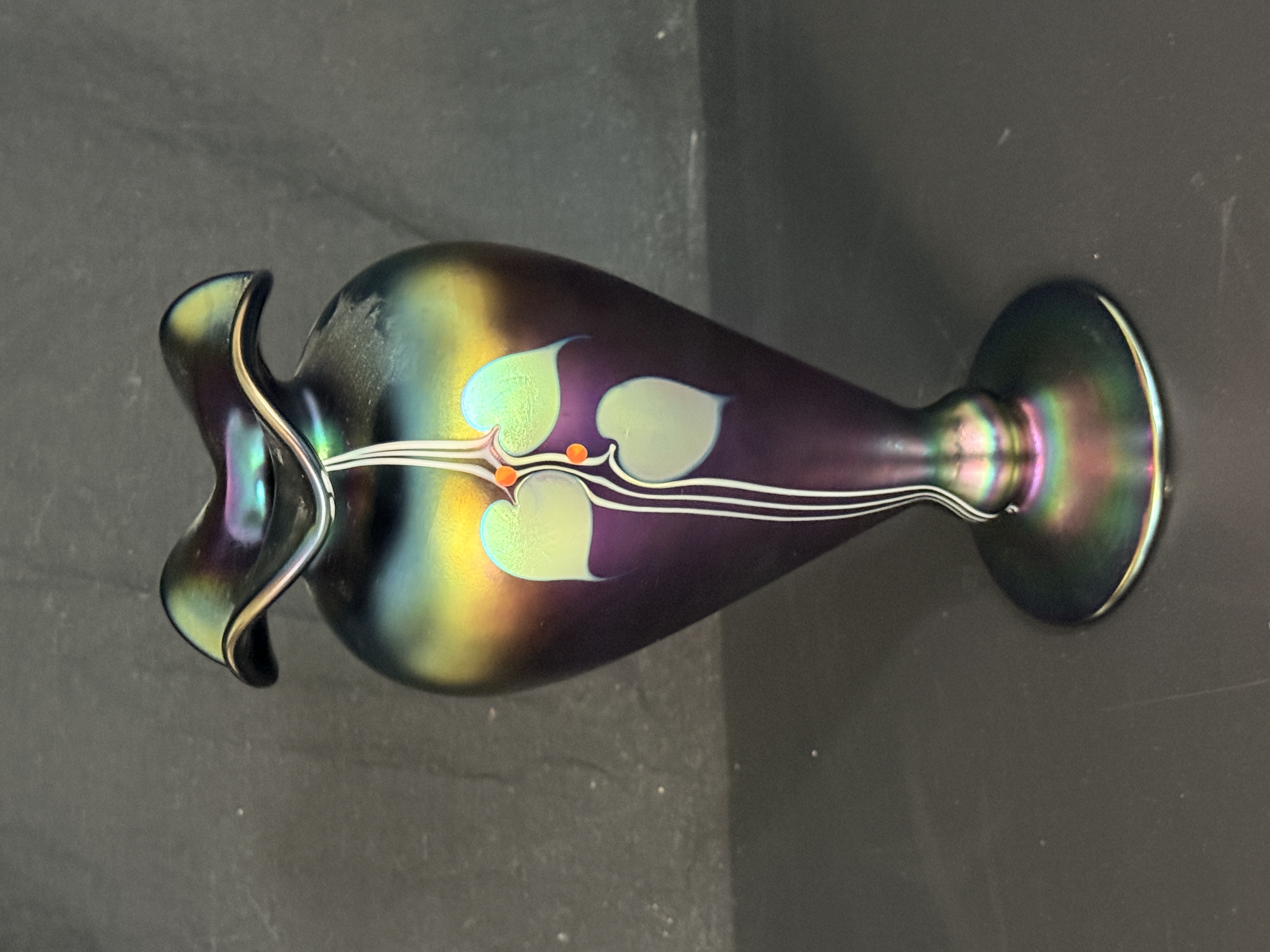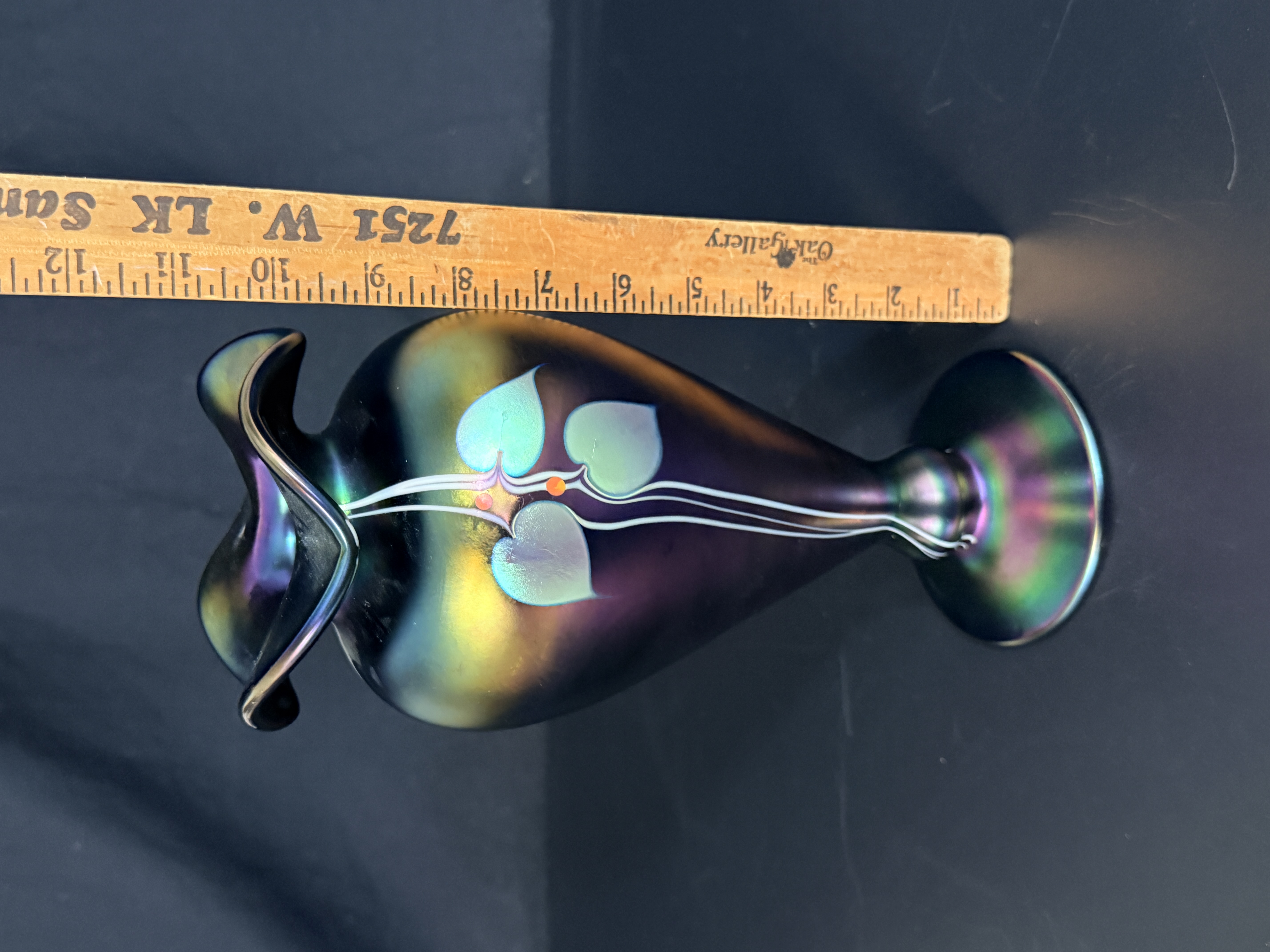 An iridescent art glass vase by Stuart Abelman, executed in an Art Nouveau style. The vessel features a ruffled trefoil rim above an ovoid body that tapers to a flared pedestal base. The glass displays a high-gloss iridescent finish with shifting tones of deep purple, gold, and emerald green. The exterior is decorated with a pulled-trail motif of white lines connecting three heart-shaped leaves and accented with orange dots. The underside of the base is hand-inscribed Abelman VLB340-172 1987 and retains four small felt pads.