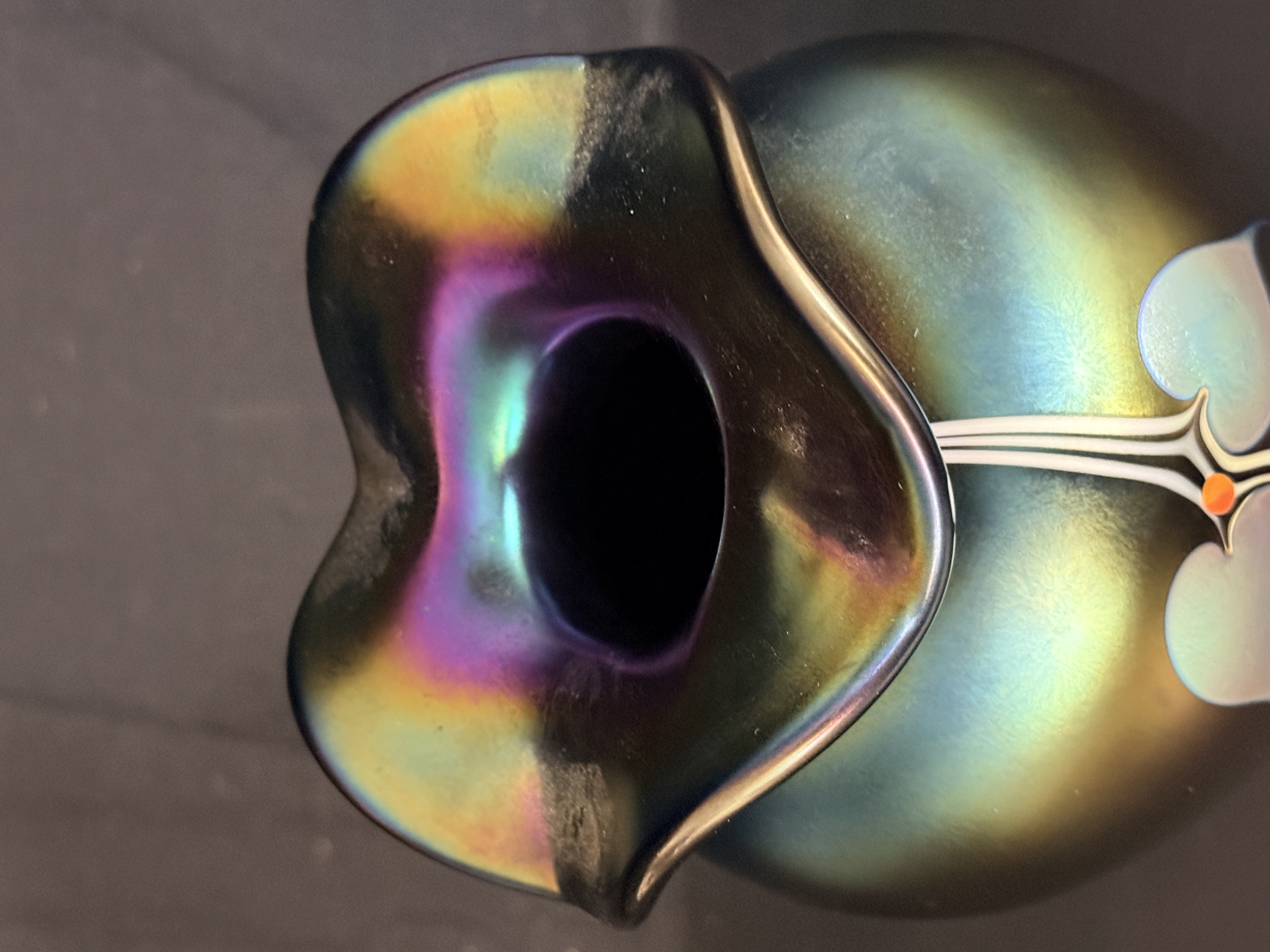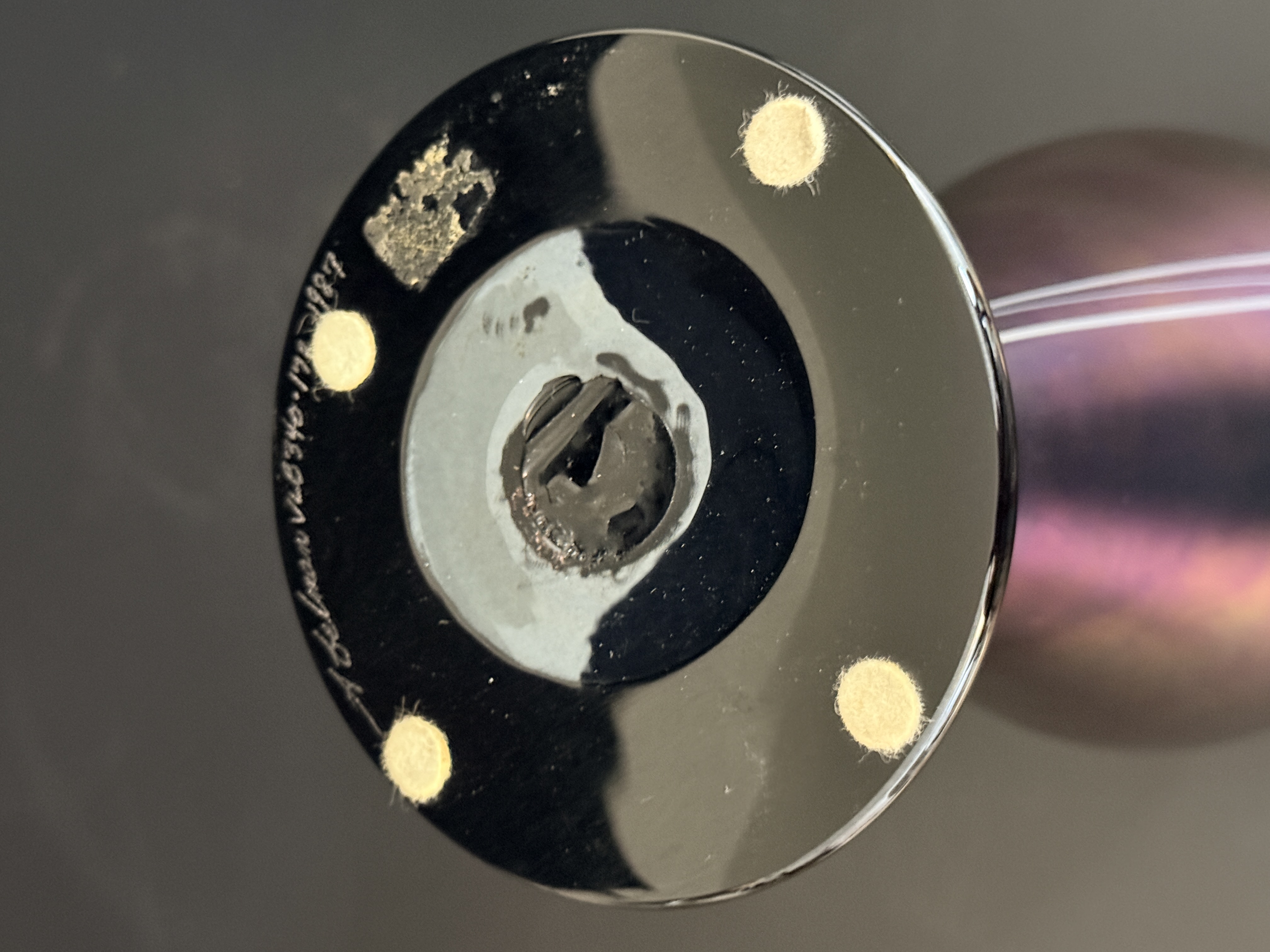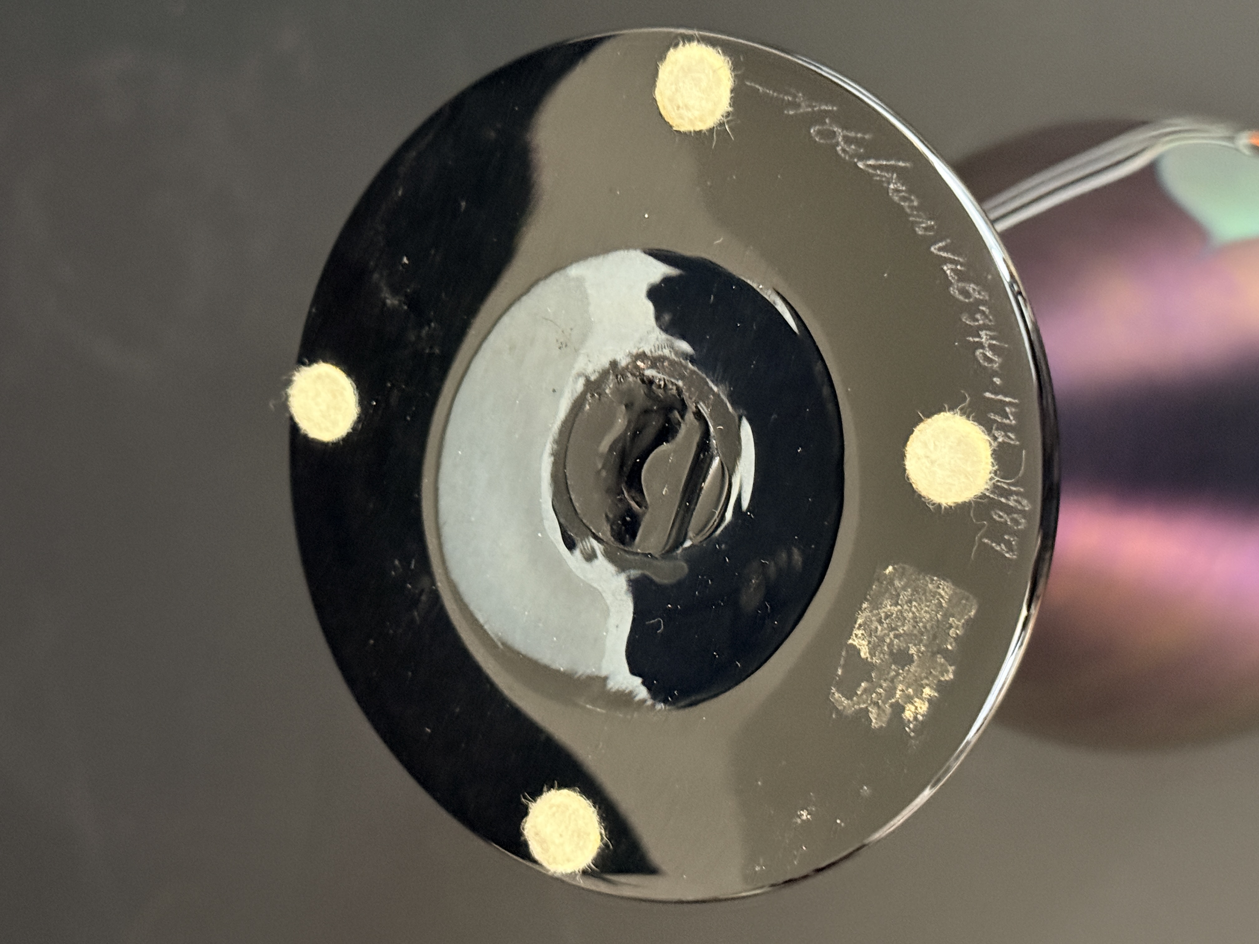 The vase is in overall good condition. Minor adhesive residue from a previous label is visible on the underside of the base. No chips, cracks, or repairs are observed.