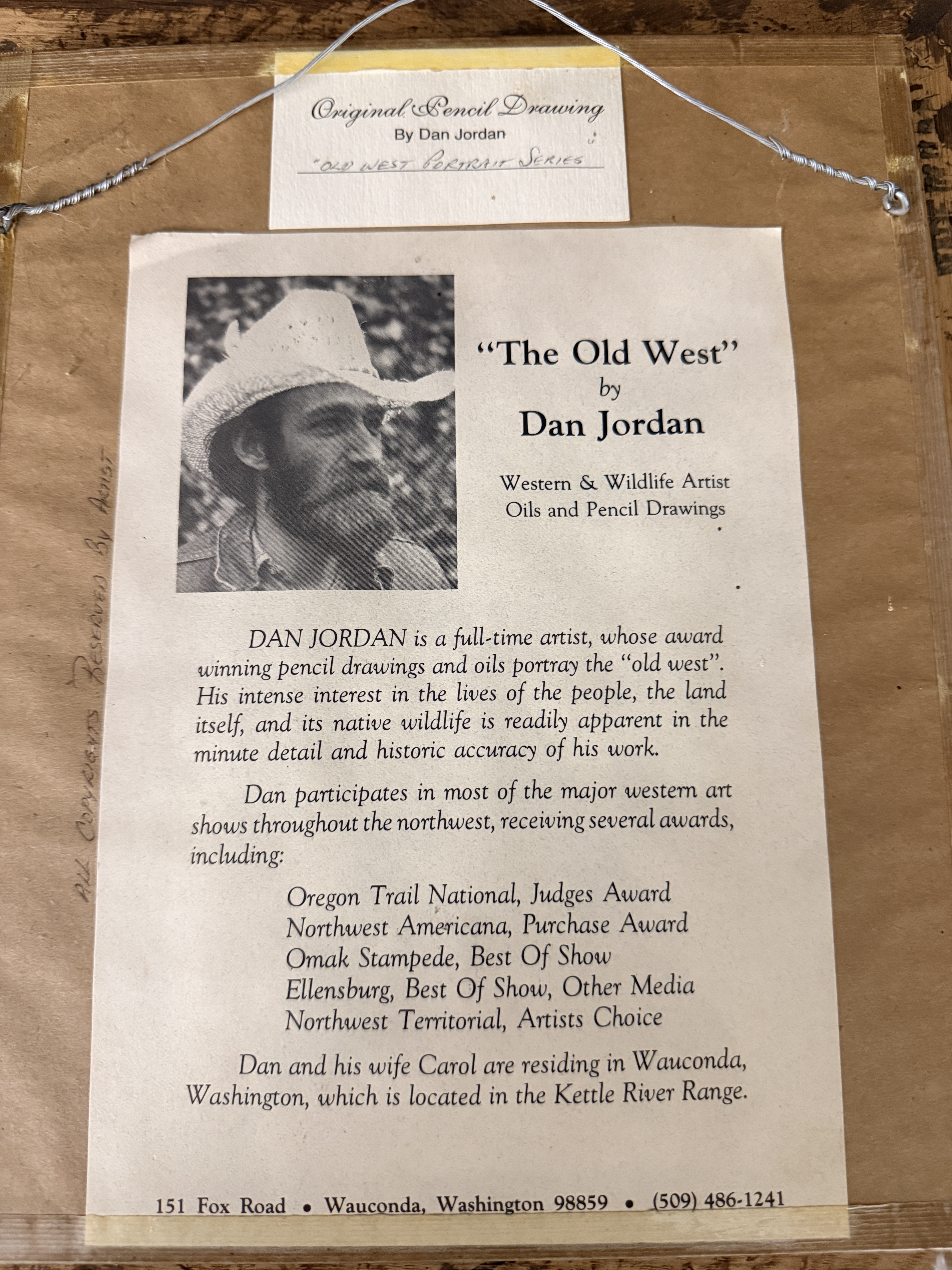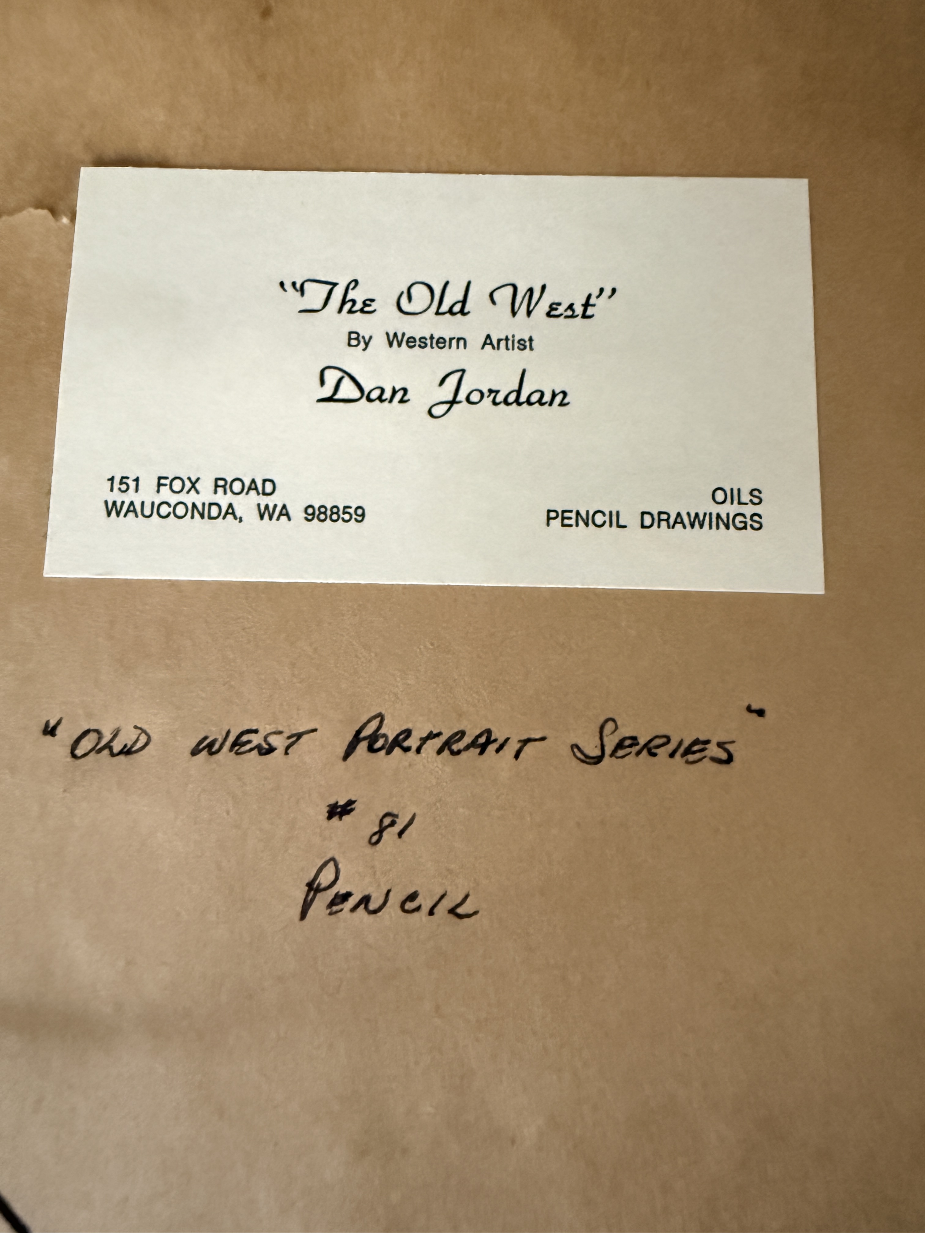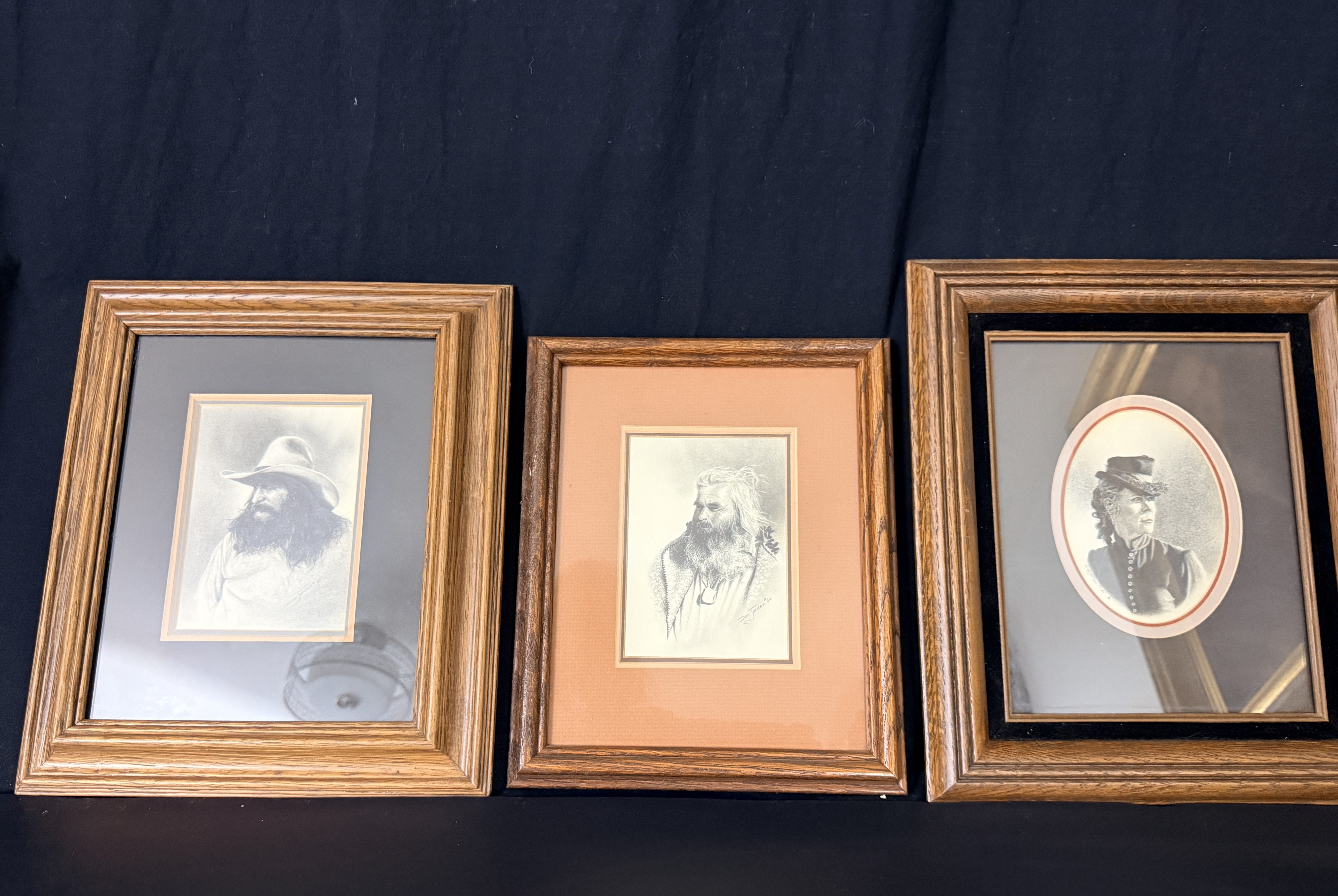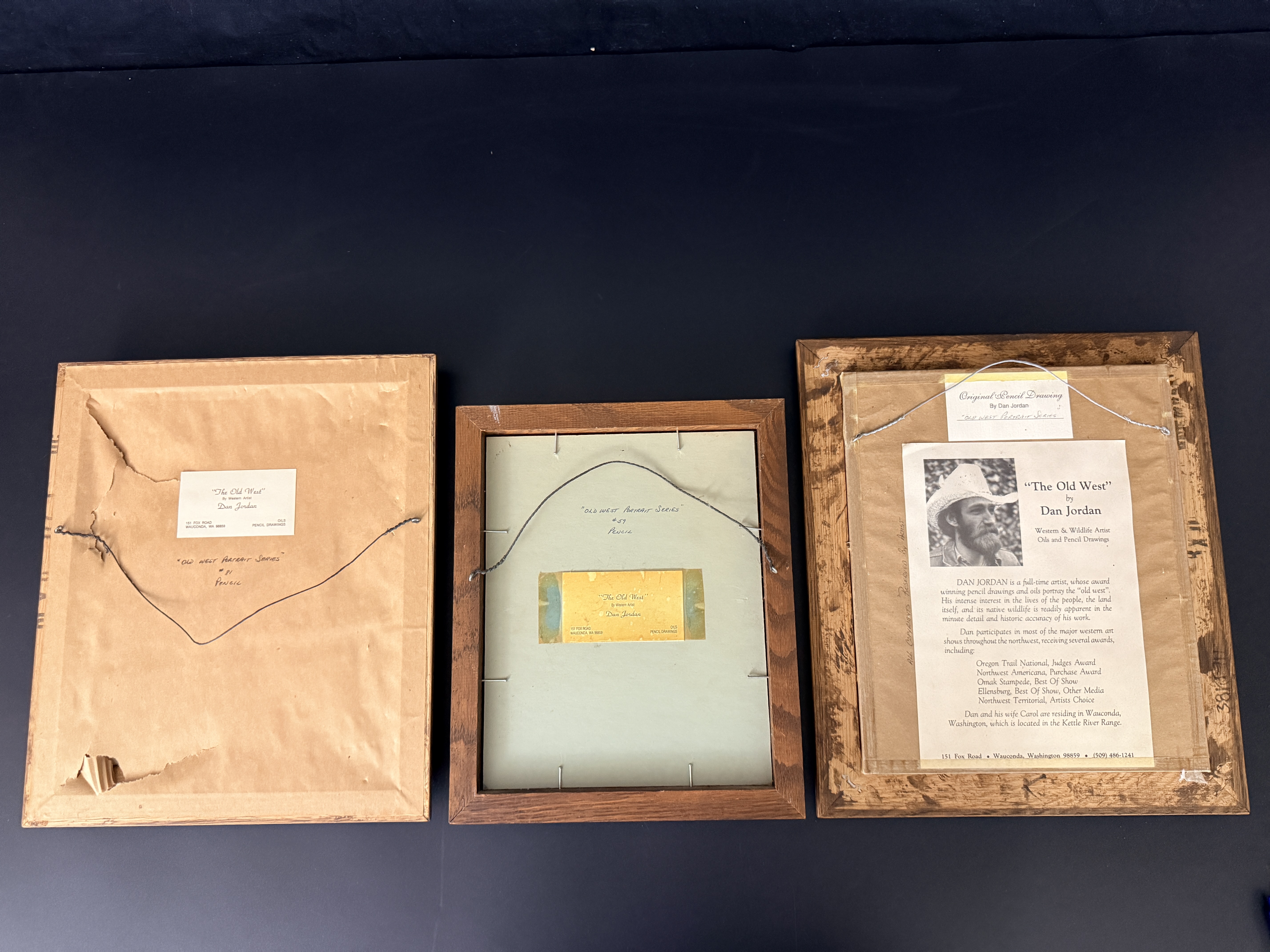 A trio of original pencil drawings on paper by Western artist Dan Jordan, part of the artist’s Old West Portrait Series. The collection features two portraits of bearded men in period attire, one wearing a wide-brimmed hat and the other in a fur-trimmed garment, alongside a profile portrait of a woman in a high-collared dress and small hat. Each work is signed by the artist, with dates including 1976 and 1984 visible. The drawings are matted and housed in coordinating decorative wooden frames. The reverse of the frames includes printed artist biographical labels and handwritten series identifiers, including numbers 59 and 81.