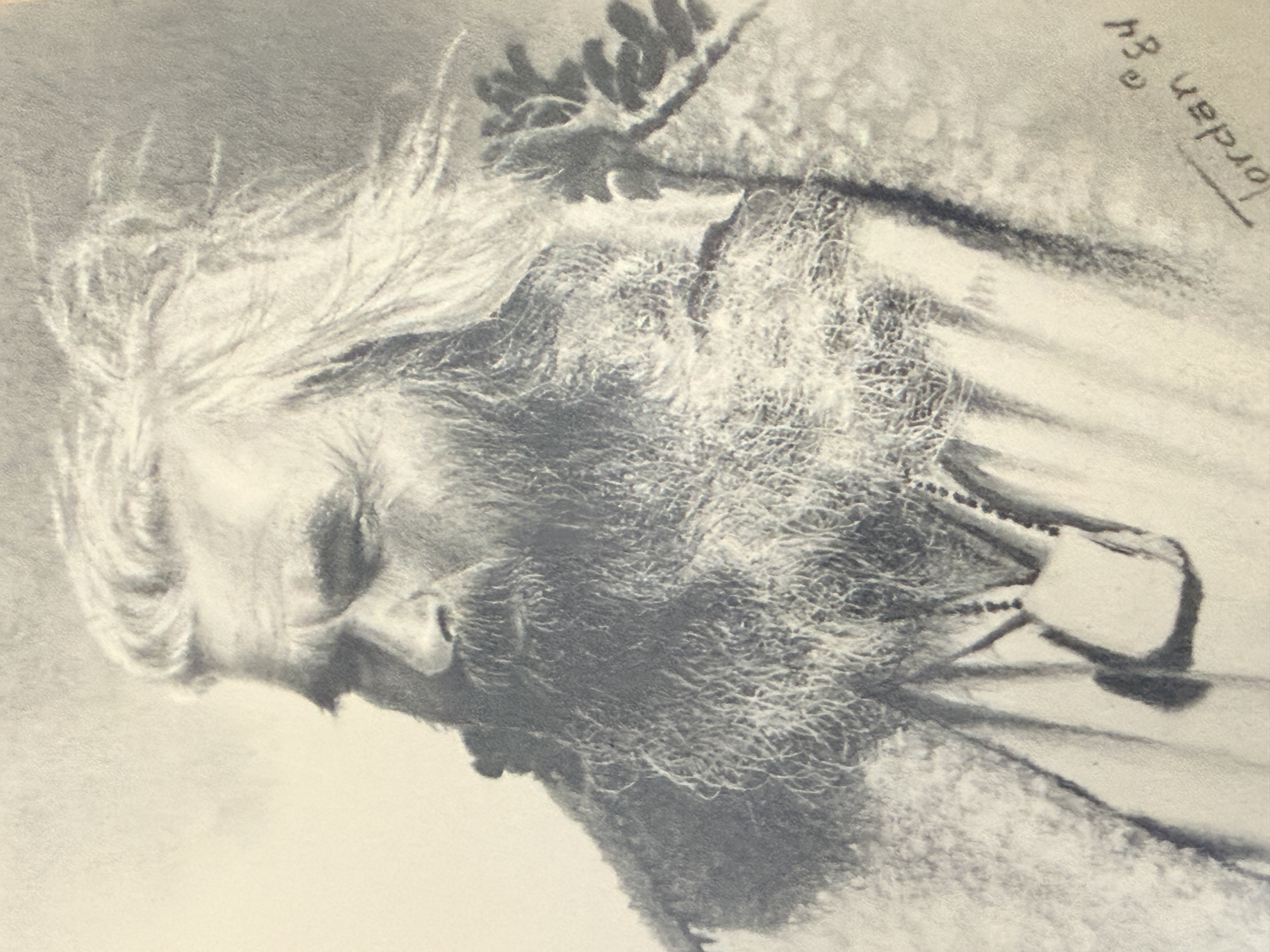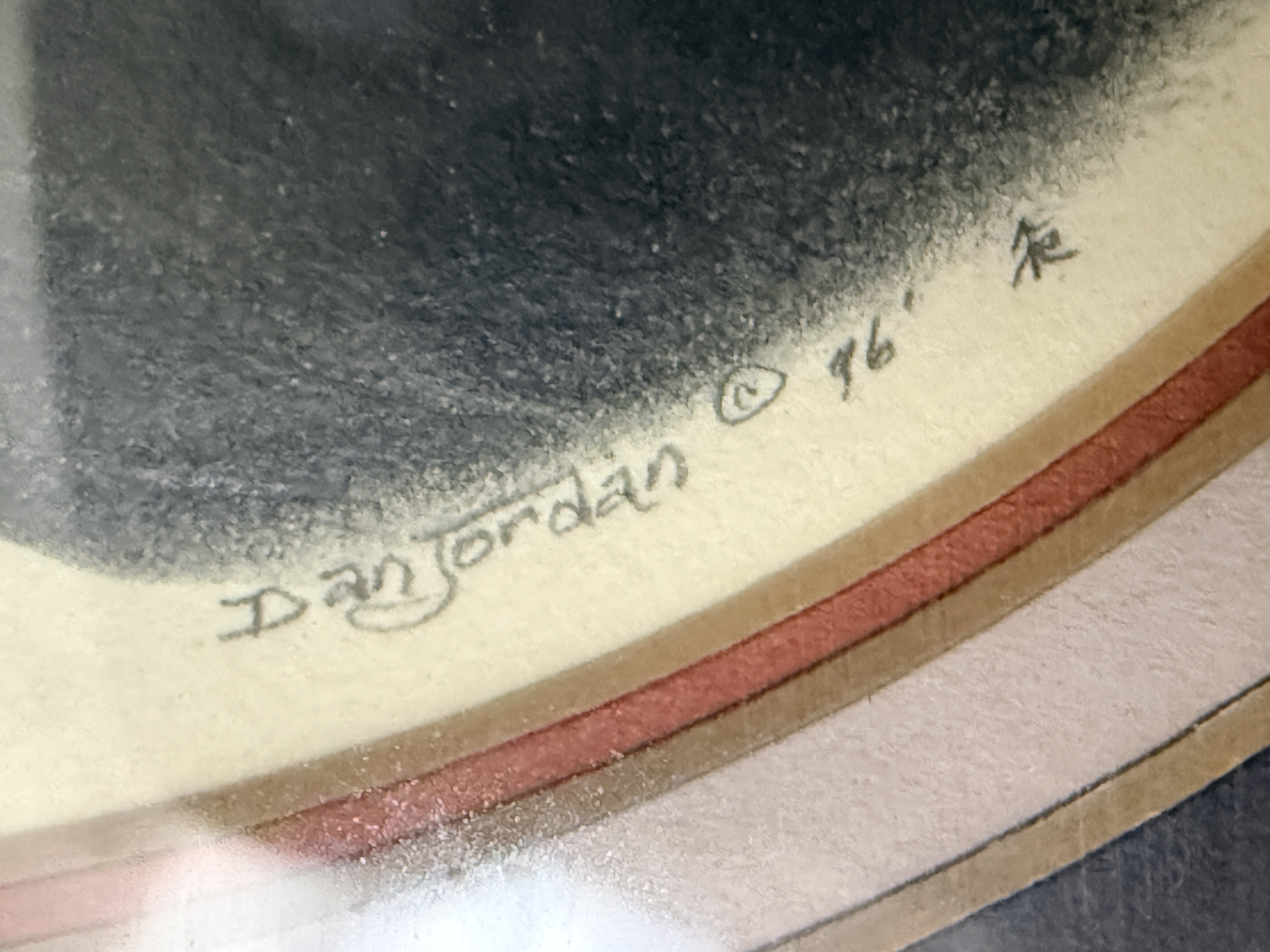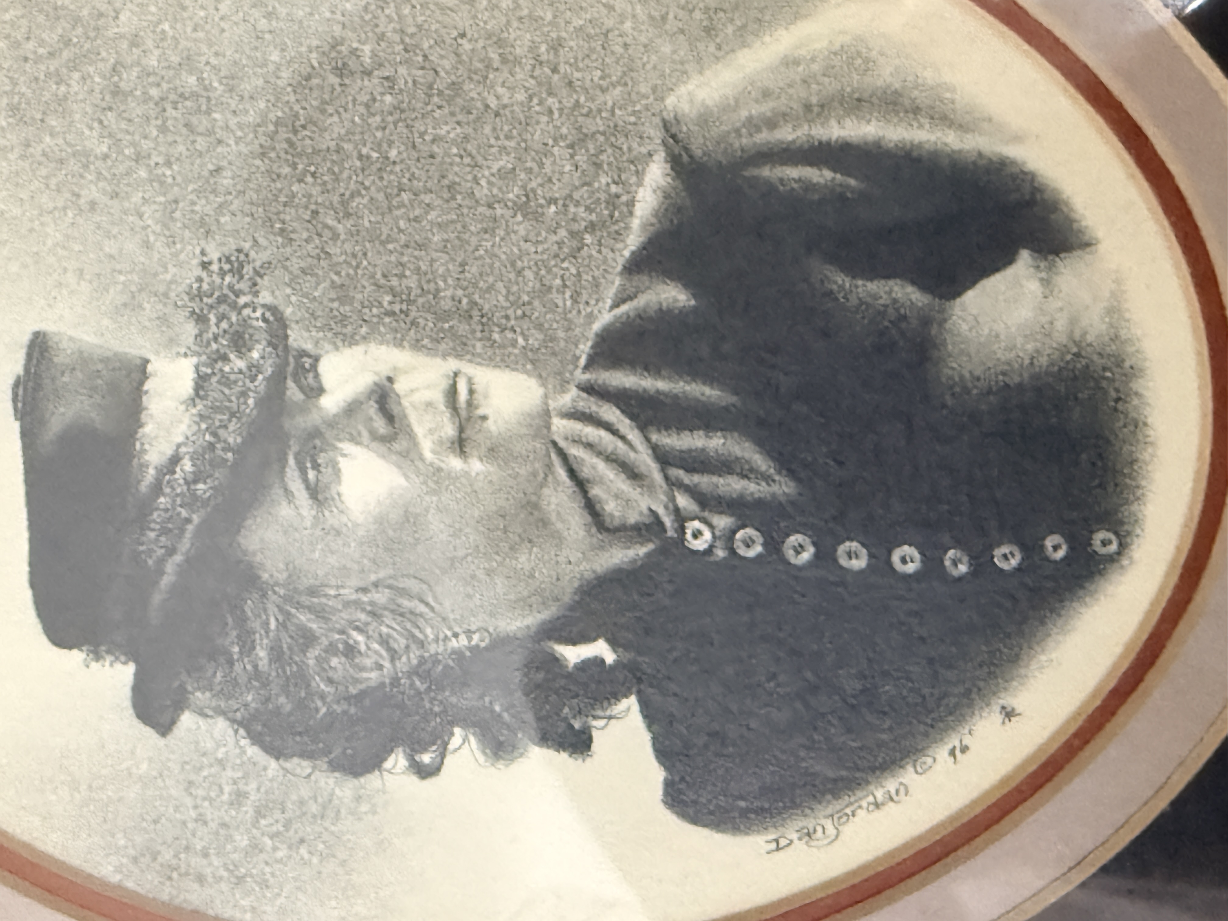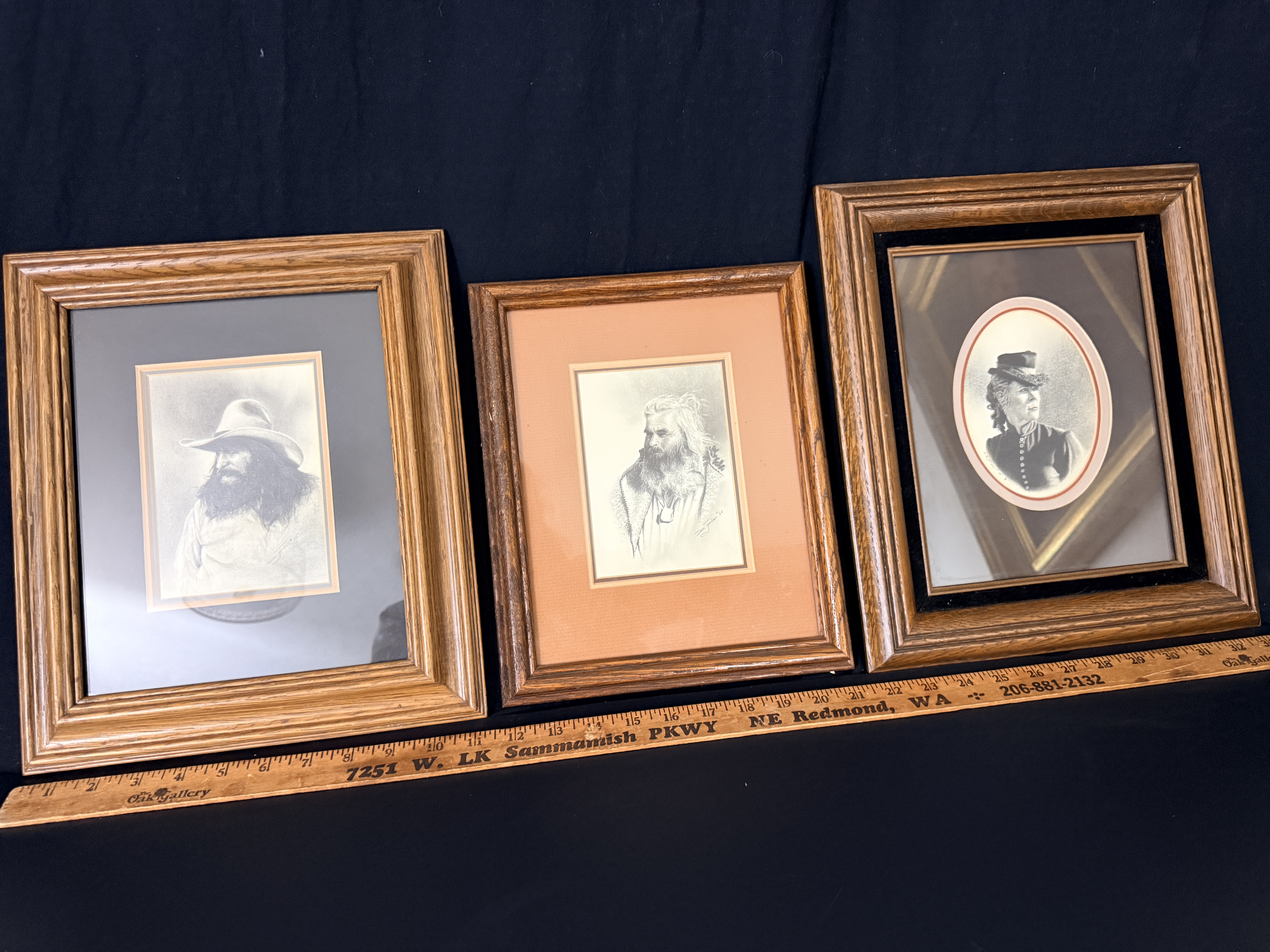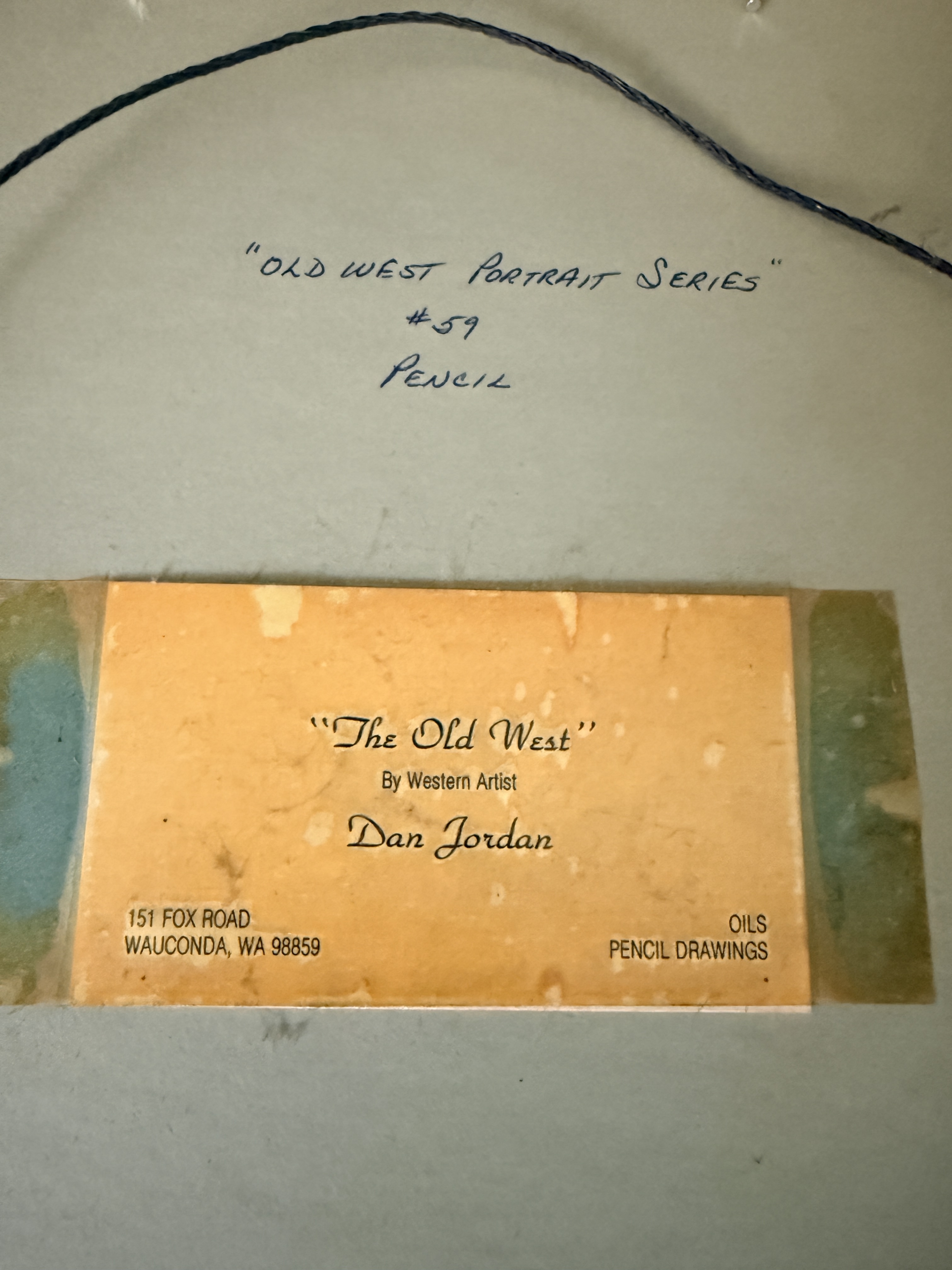 A trio of original pencil drawings on paper by Western artist Dan Jordan, part of the artist’s Old West Portrait Series. The collection features two portraits of bearded men in period attire, one wearing a wide-brimmed hat and the other in a fur-trimmed garment, alongside a profile portrait of a woman in a high-collared dress and small hat. Each work is signed by the artist, with dates including 1976 and 1984 visible. The drawings are matted and housed in coordinating decorative wooden frames. The reverse of the frames includes printed artist biographical labels and handwritten series identifiers, including numbers 59 and 81.