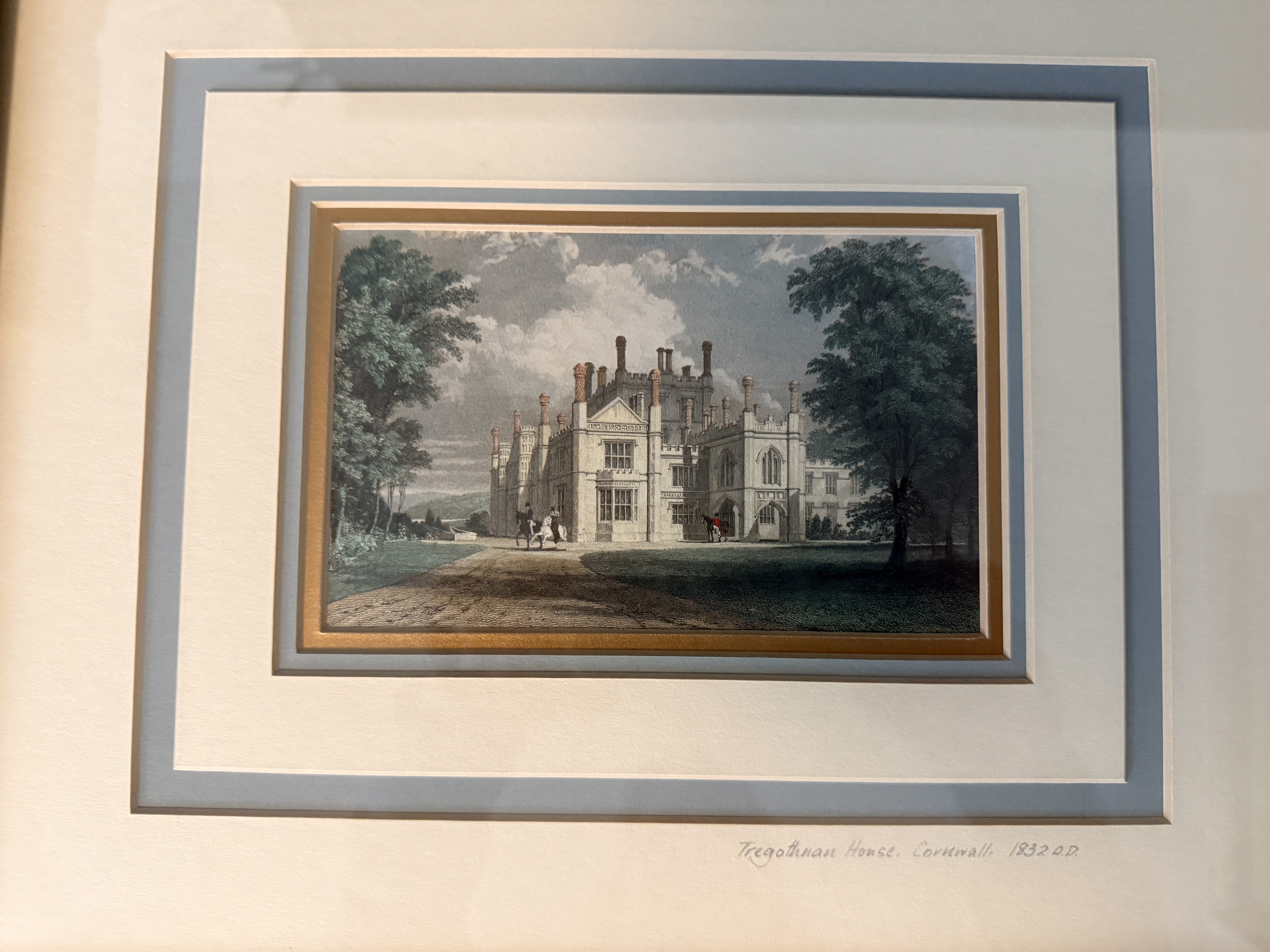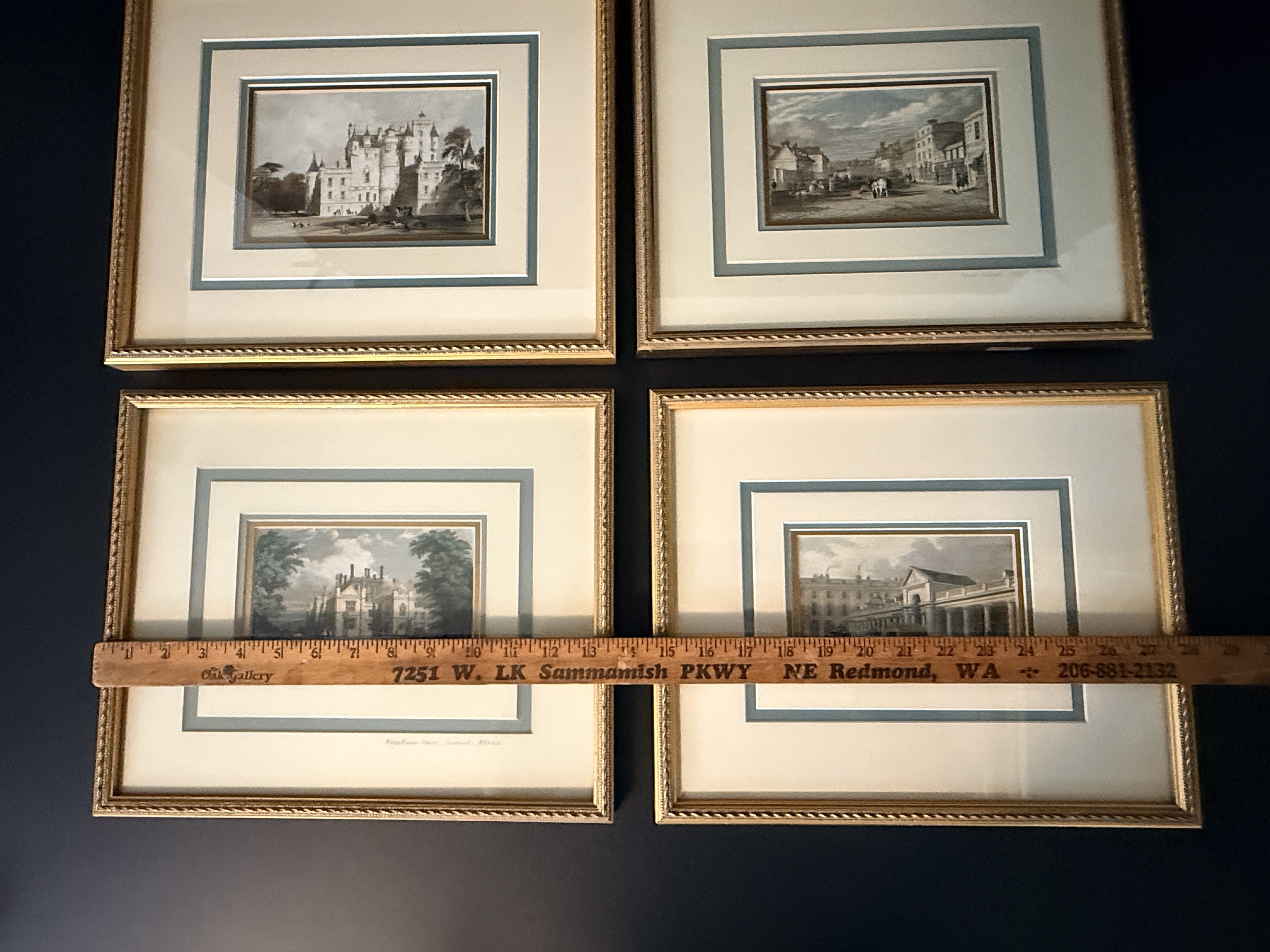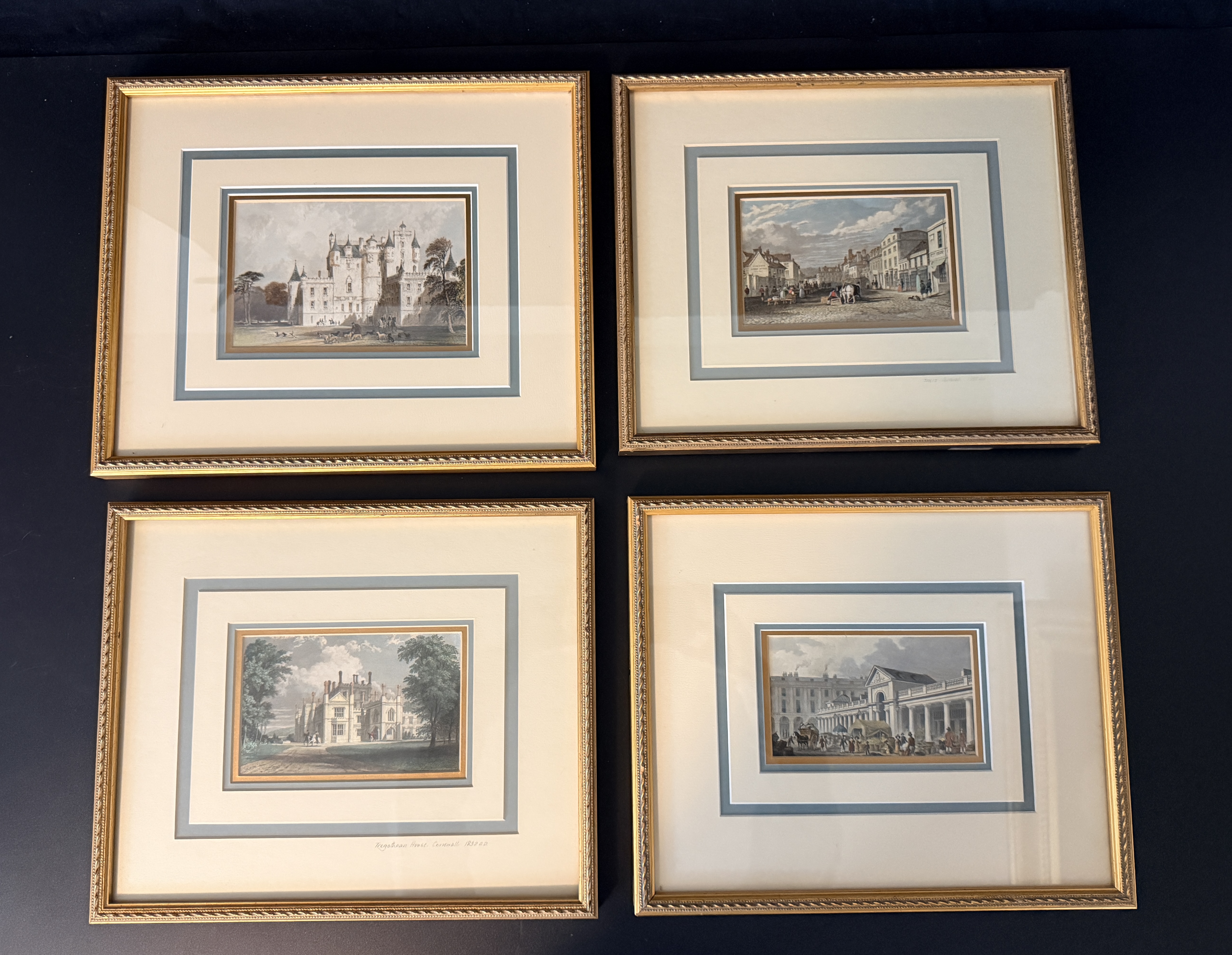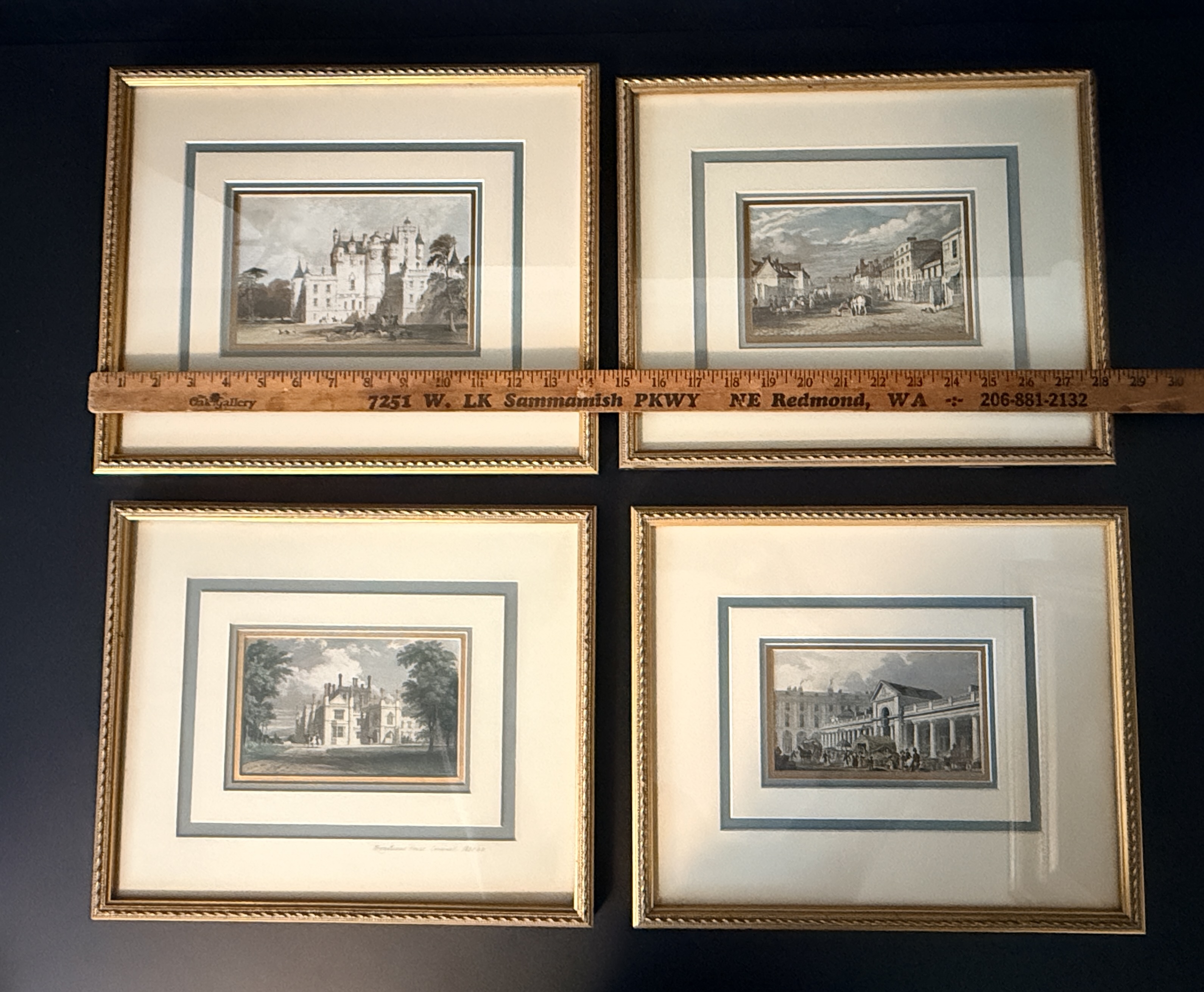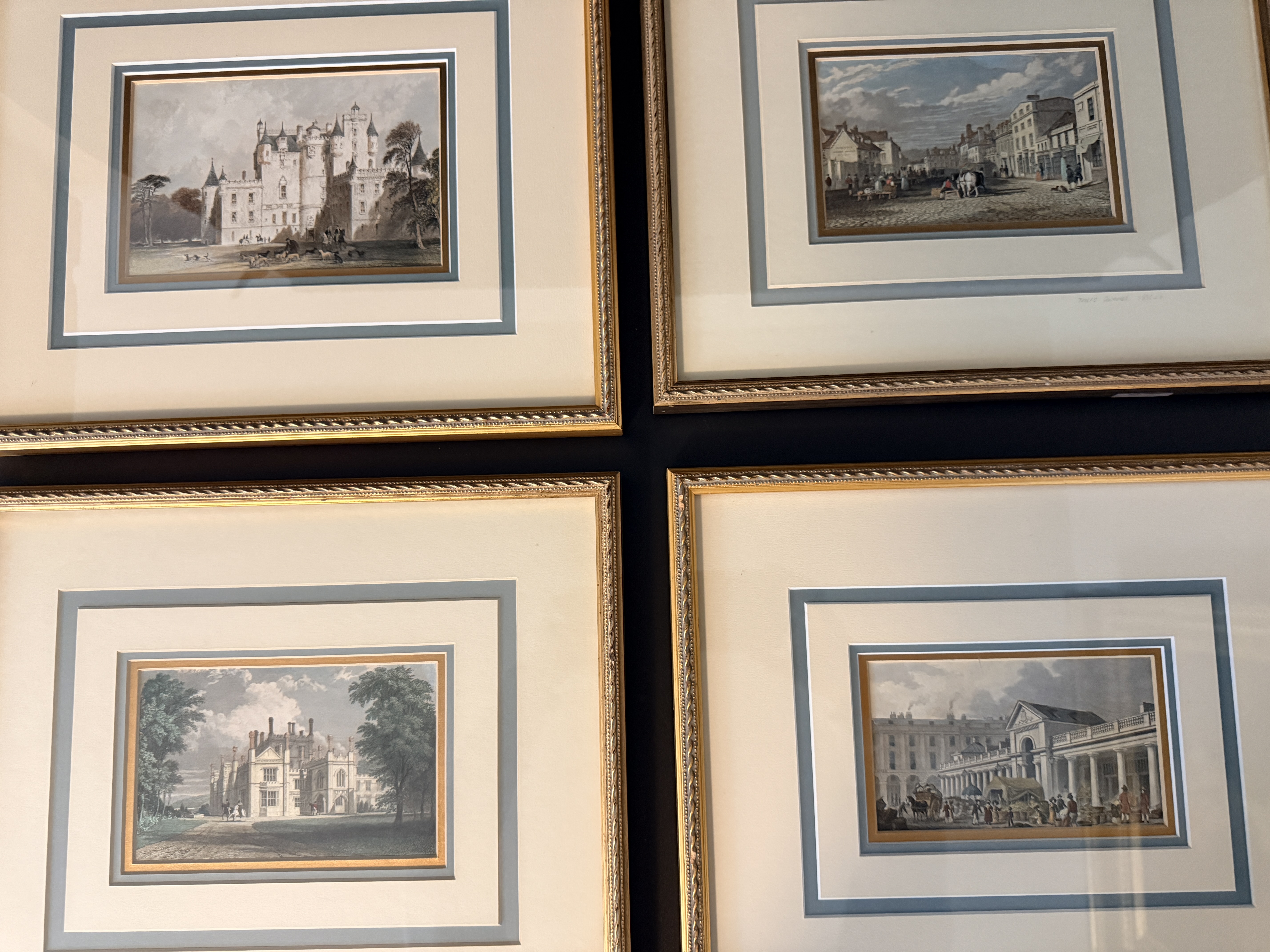 A set of framed prints depicting nineteenth-century British architectural and street scenes in a tinted engraving or lithographic style. The subjects include a Gothic Revival manor house inscribed in pencil on the matting as Tregothnan House. Cornwall. 1832 A.D. and a town square with figures and horse-drawn transport inscribed Truro Cornwall 1832 A.D. Other scenes include a castle with a hunting party and hounds in the foreground and a covered market scene featuring figures and classical columns. Each print is mounted within a multi-layered cream and pale blue mat and housed in a decorative gilt-wood frame featuring a rope-twist inner border. The reverse of the frames includes gallery labels from the Howard/Mandeville Gallery of Edmonds, Washington.
