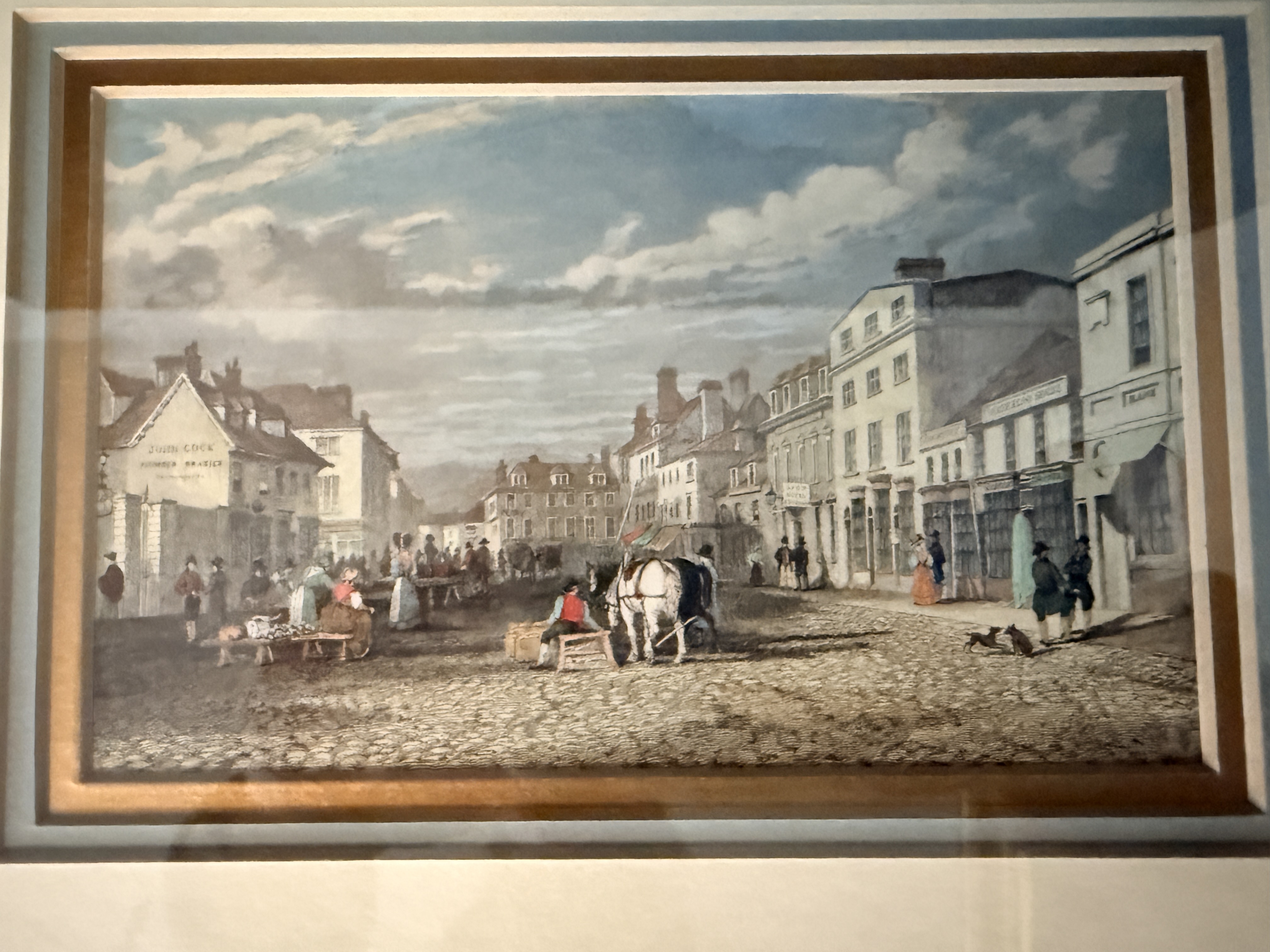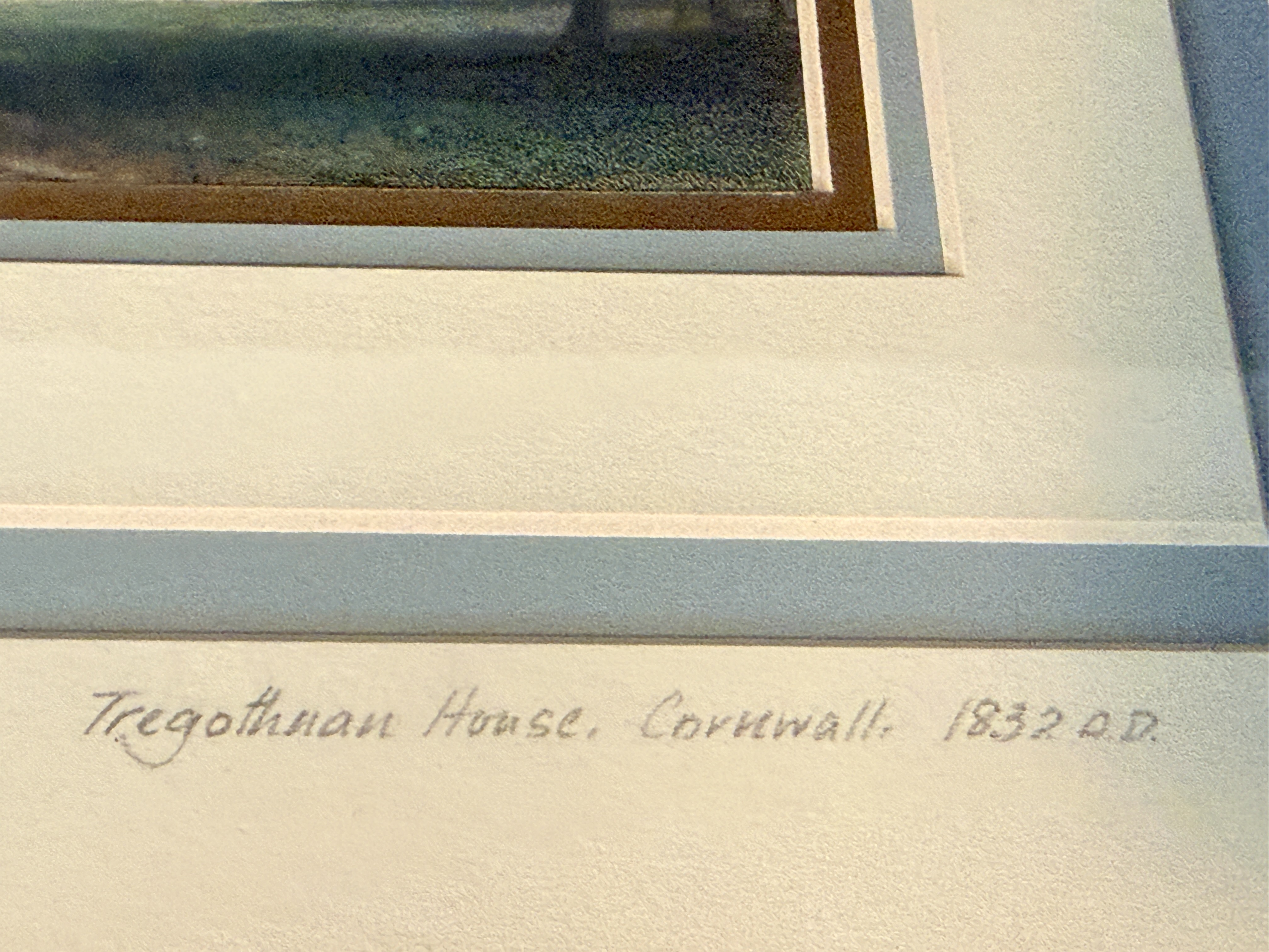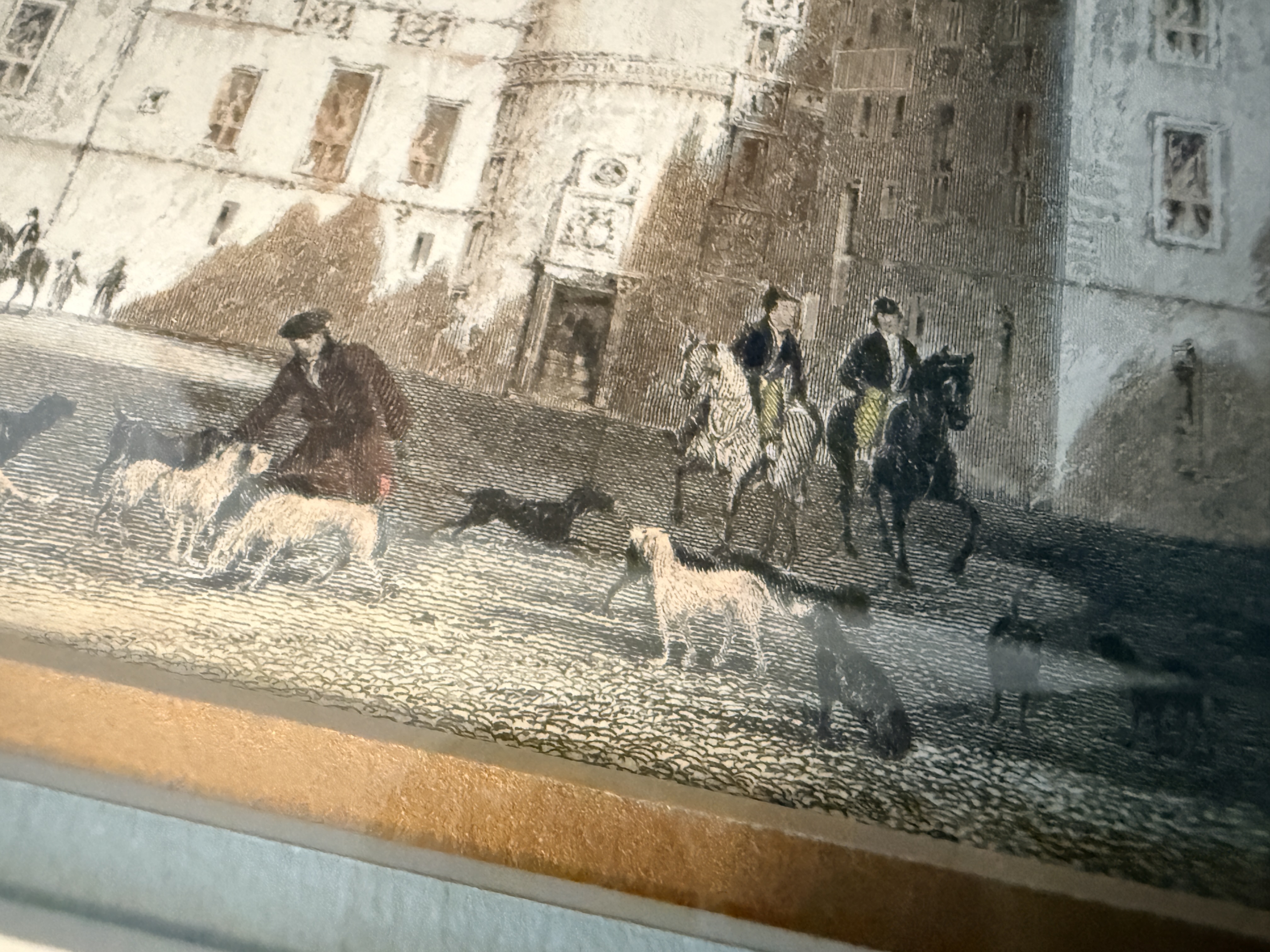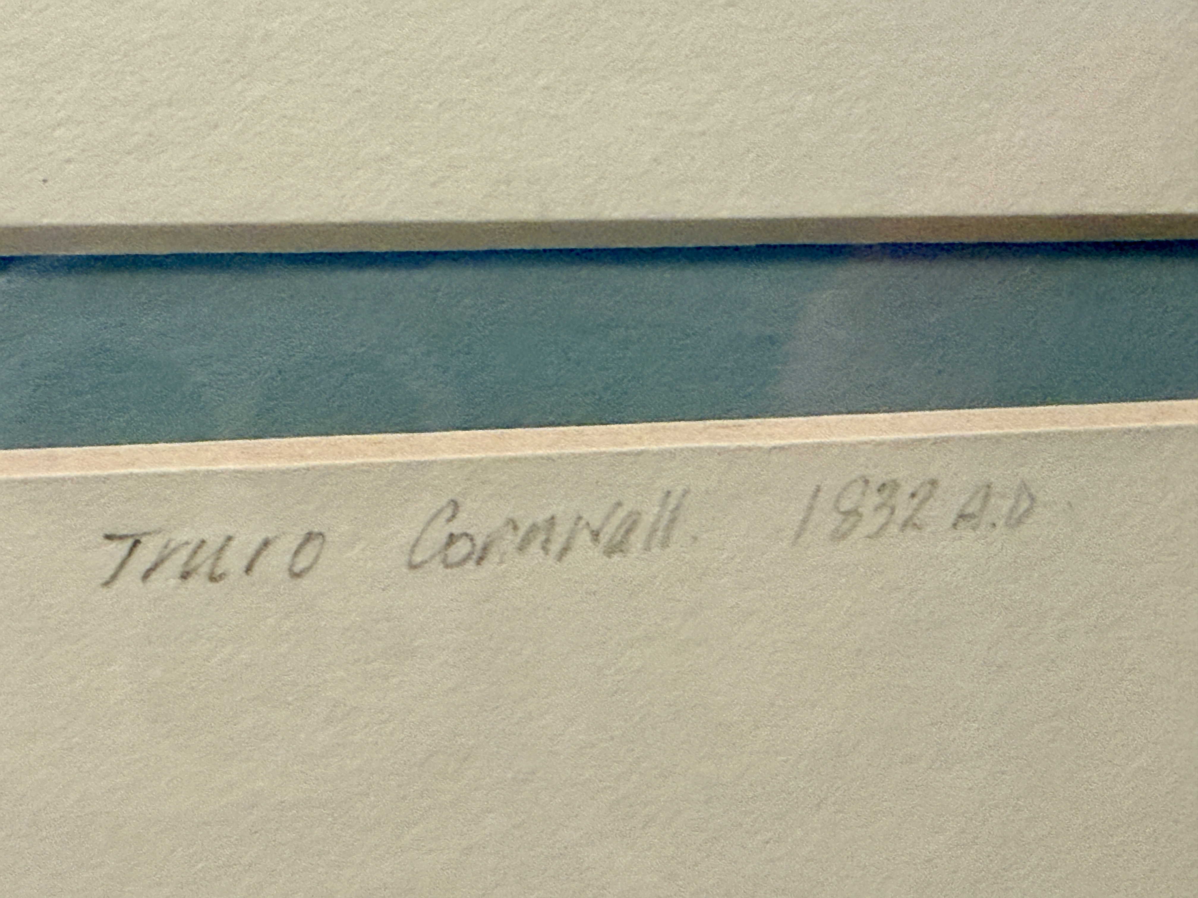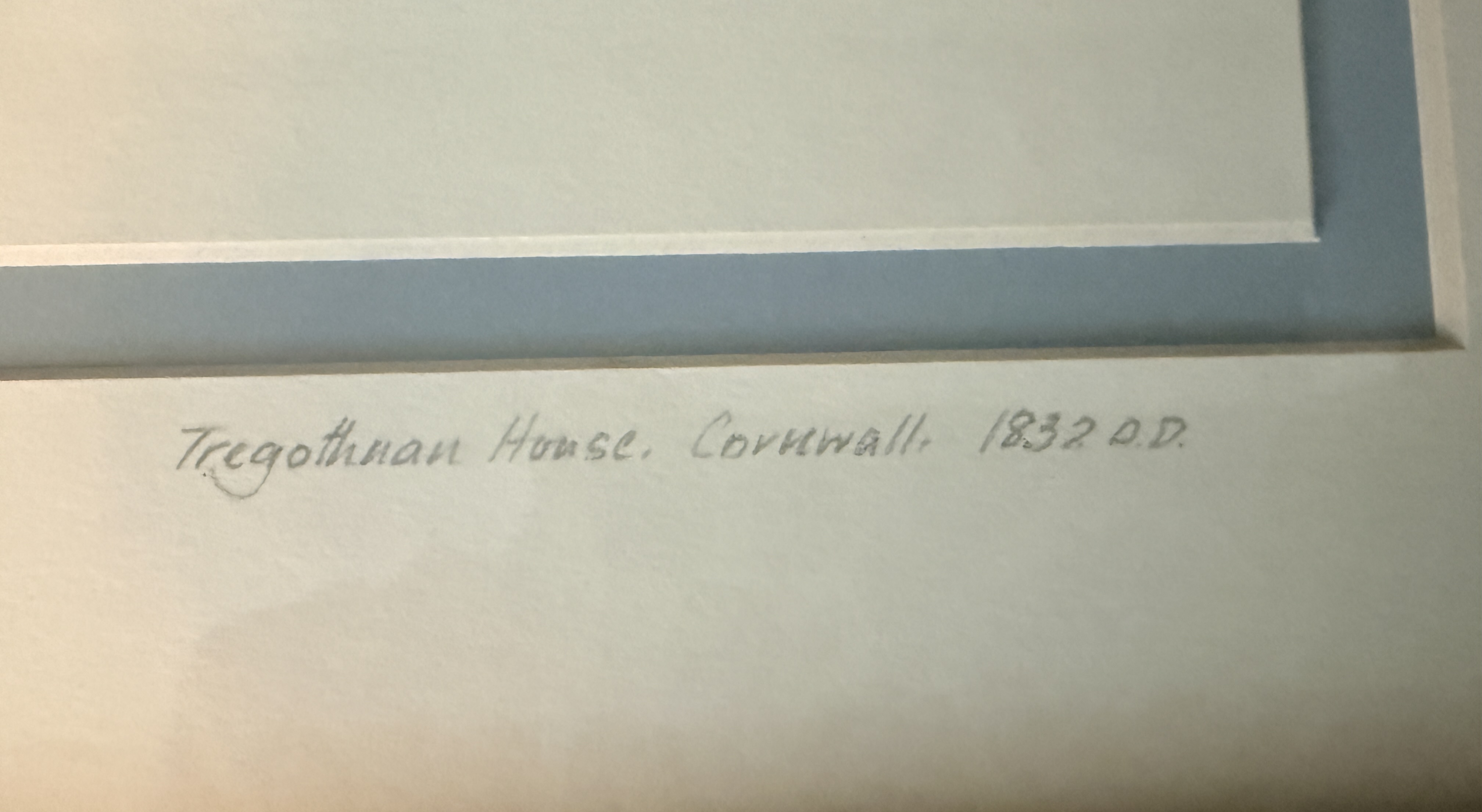 A set of framed prints depicting nineteenth-century British architectural and street scenes in a tinted engraving or lithographic style. The subjects include a Gothic Revival manor house inscribed in pencil on the matting as Tregothnan House. Cornwall. 1832 A.D. and a town square with figures and horse-drawn transport inscribed Truro Cornwall 1832 A.D. Other scenes include a castle with a hunting party and hounds in the foreground and a covered market scene featuring figures and classical columns. Each print is mounted within a multi-layered cream and pale blue mat and housed in a decorative gilt-wood frame featuring a rope-twist inner border. The reverse of the frames includes gallery labels from the Howard/Mandeville Gallery of Edmonds, Washington.