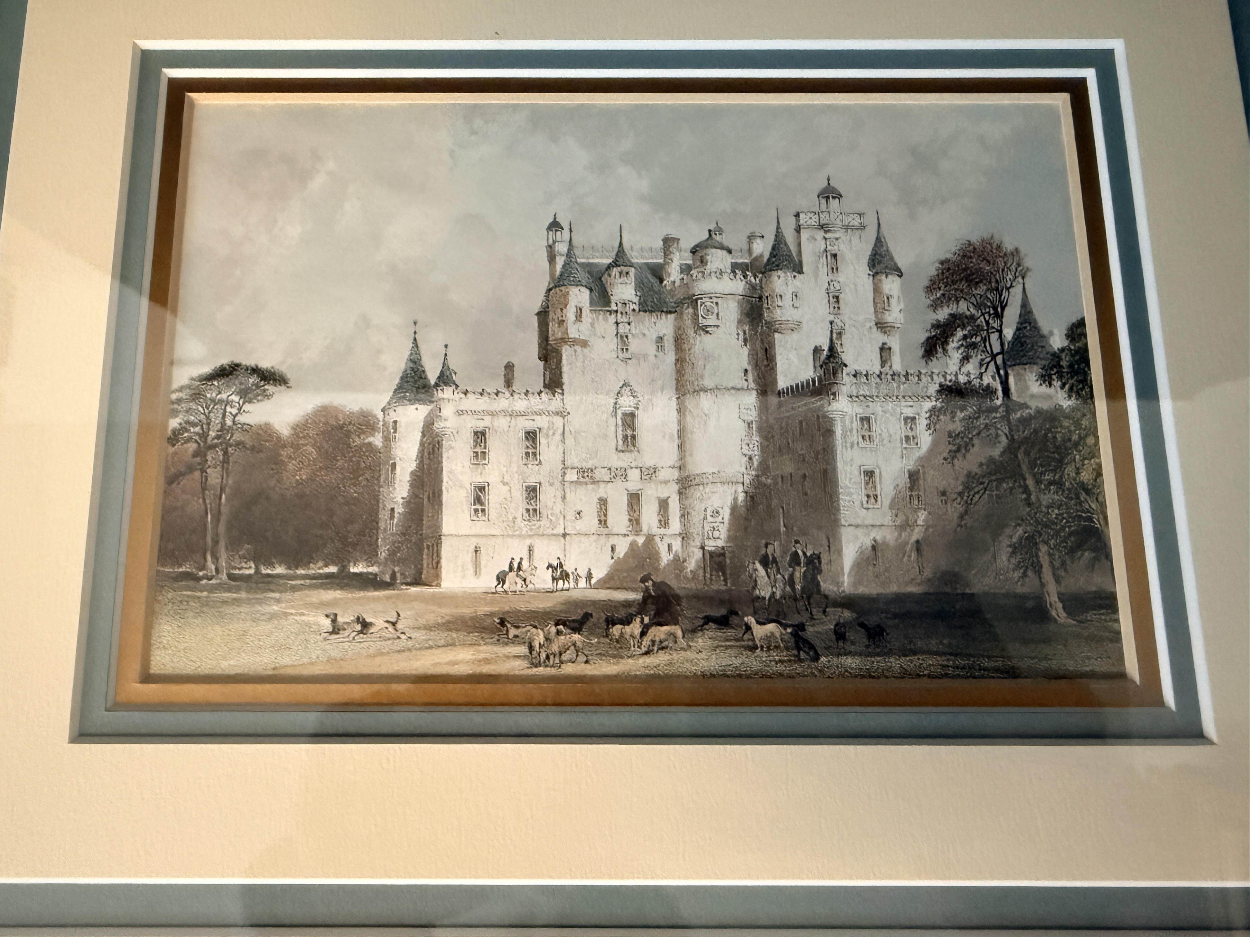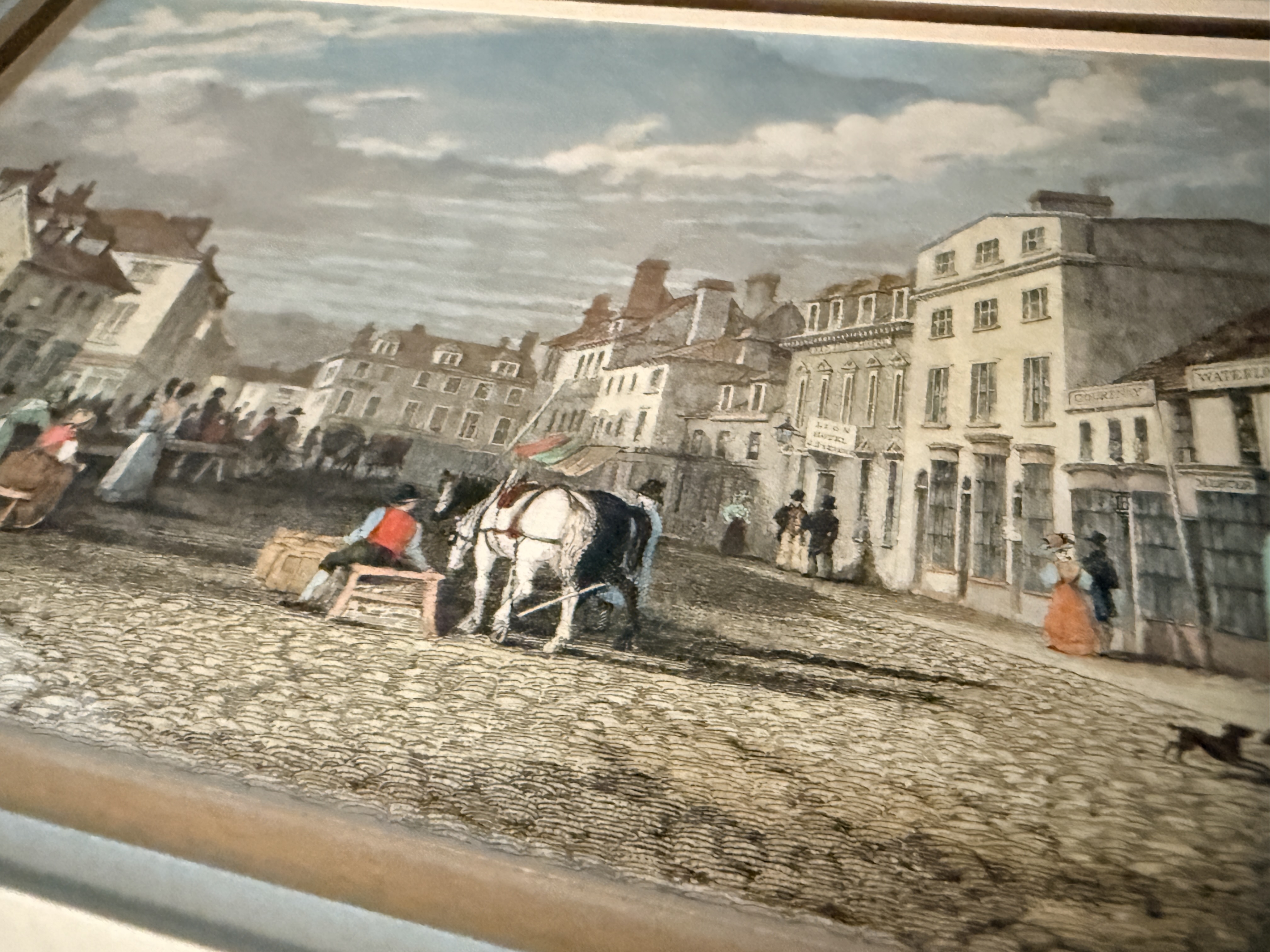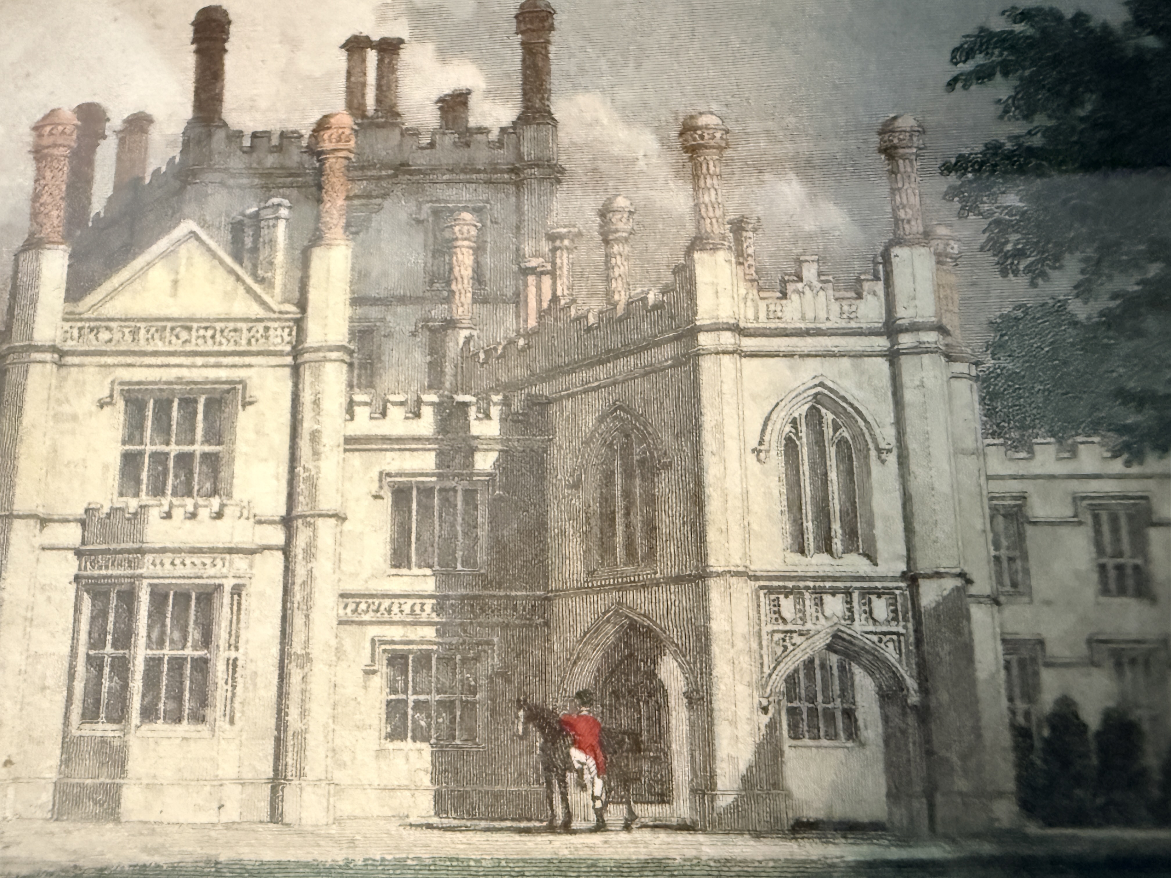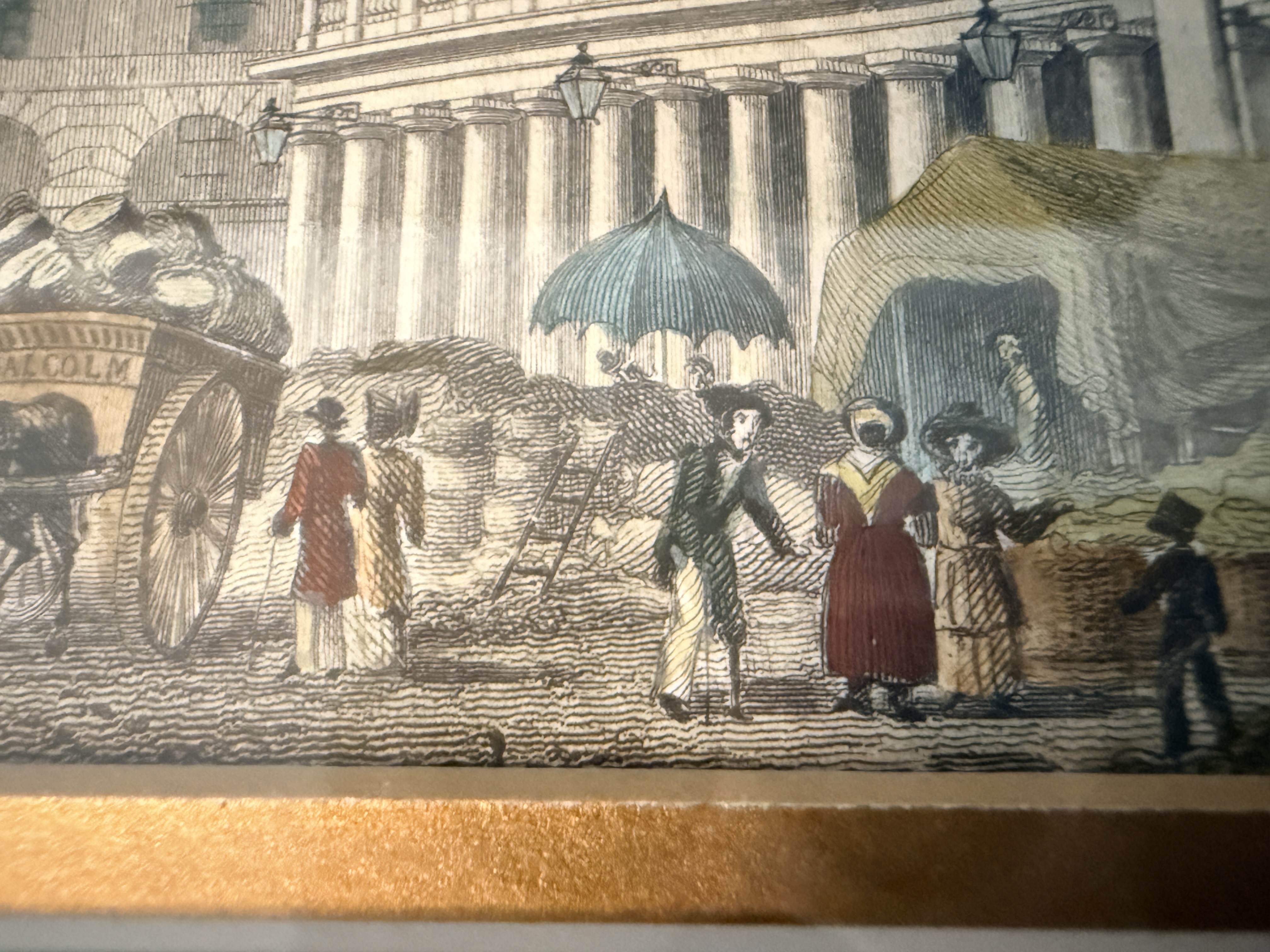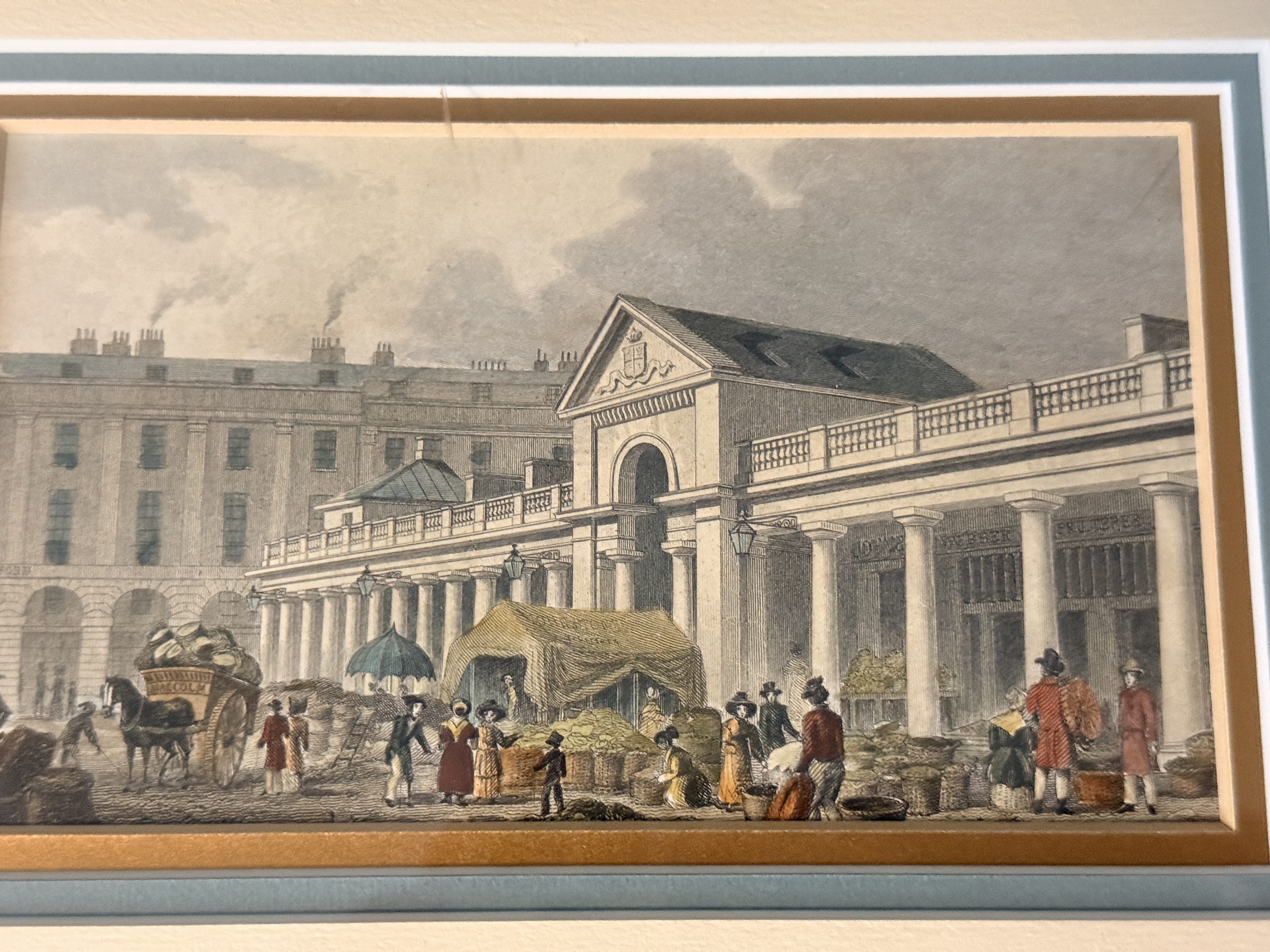 A set of framed prints depicting nineteenth-century British architectural and street scenes in a tinted engraving or lithographic style. The subjects include a Gothic Revival manor house inscribed in pencil on the matting as Tregothnan House. Cornwall. 1832 A.D. and a town square with figures and horse-drawn transport inscribed Truro Cornwall 1832 A.D. Other scenes include a castle with a hunting party and hounds in the foreground and a covered market scene featuring figures and classical columns. Each print is mounted within a multi-layered cream and pale blue mat and housed in a decorative gilt-wood frame featuring a rope-twist inner border. The reverse of the frames includes gallery labels from the Howard/Mandeville Gallery of Edmonds, Washington.