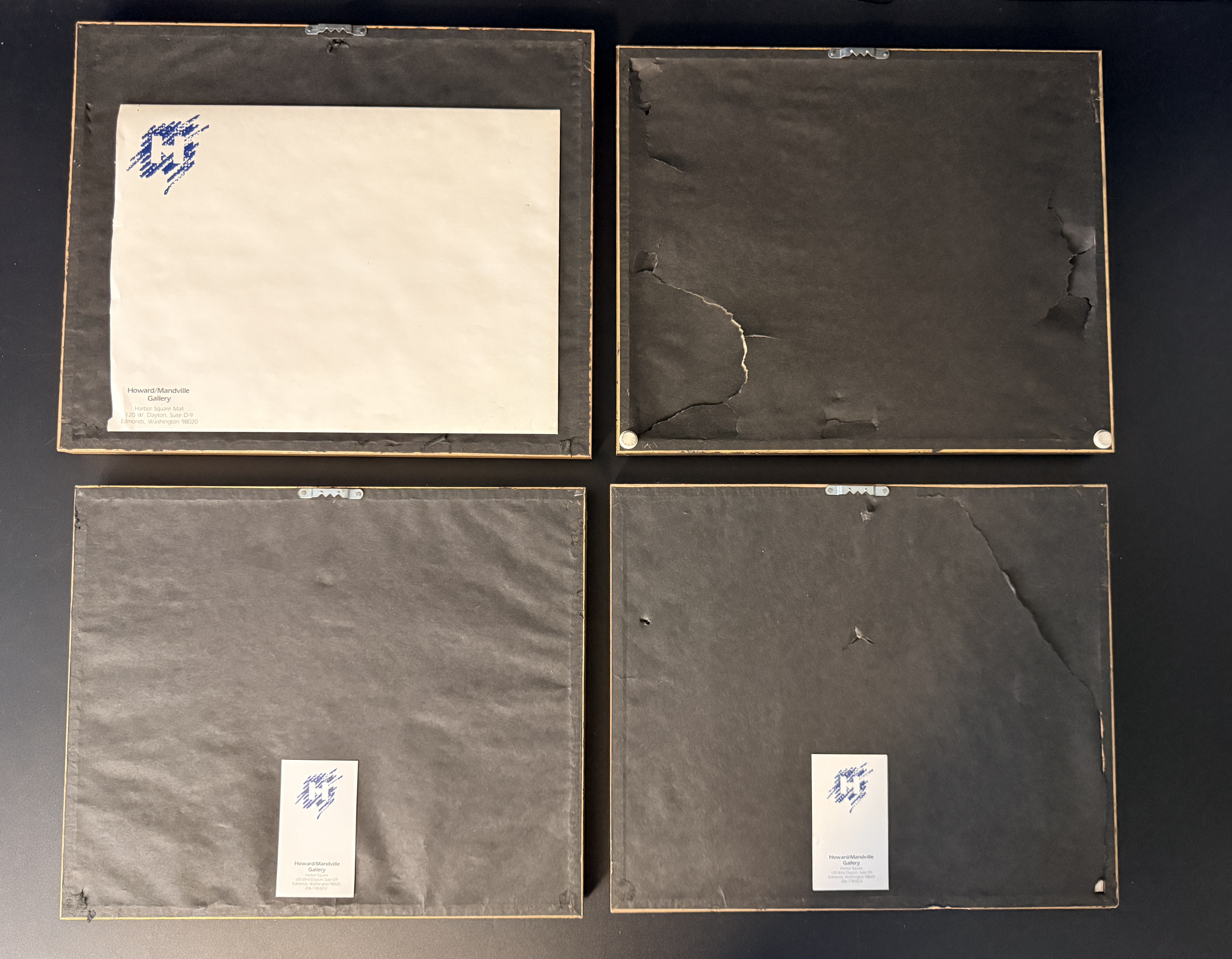 The prints appear to be in good condition with stable colors. The frames exhibit minor age-appropriate wear and light scuffing to the gilt surfaces. The protective backing paper on the reverse of several frames is torn. Art is from a clean smoke free home.