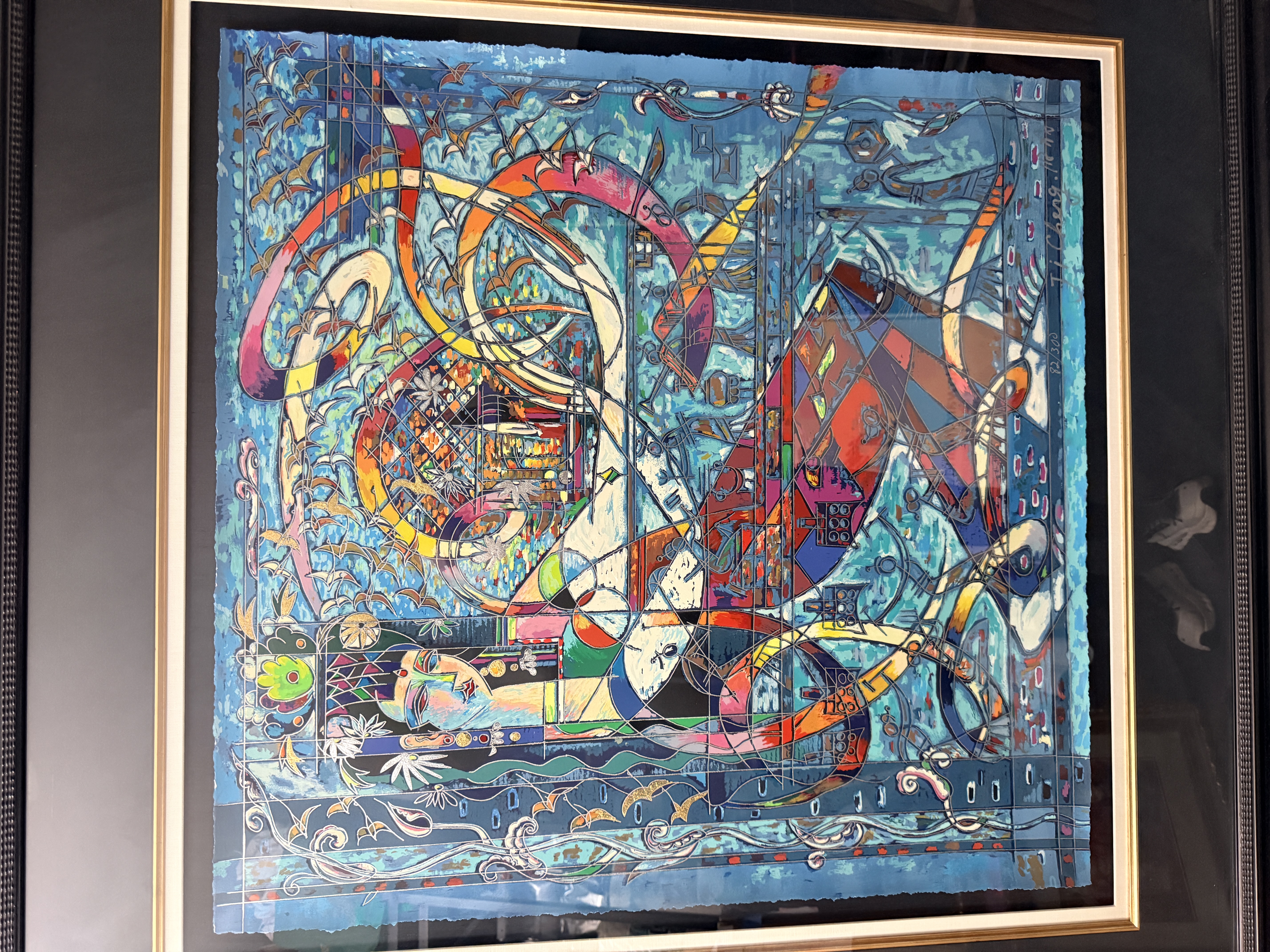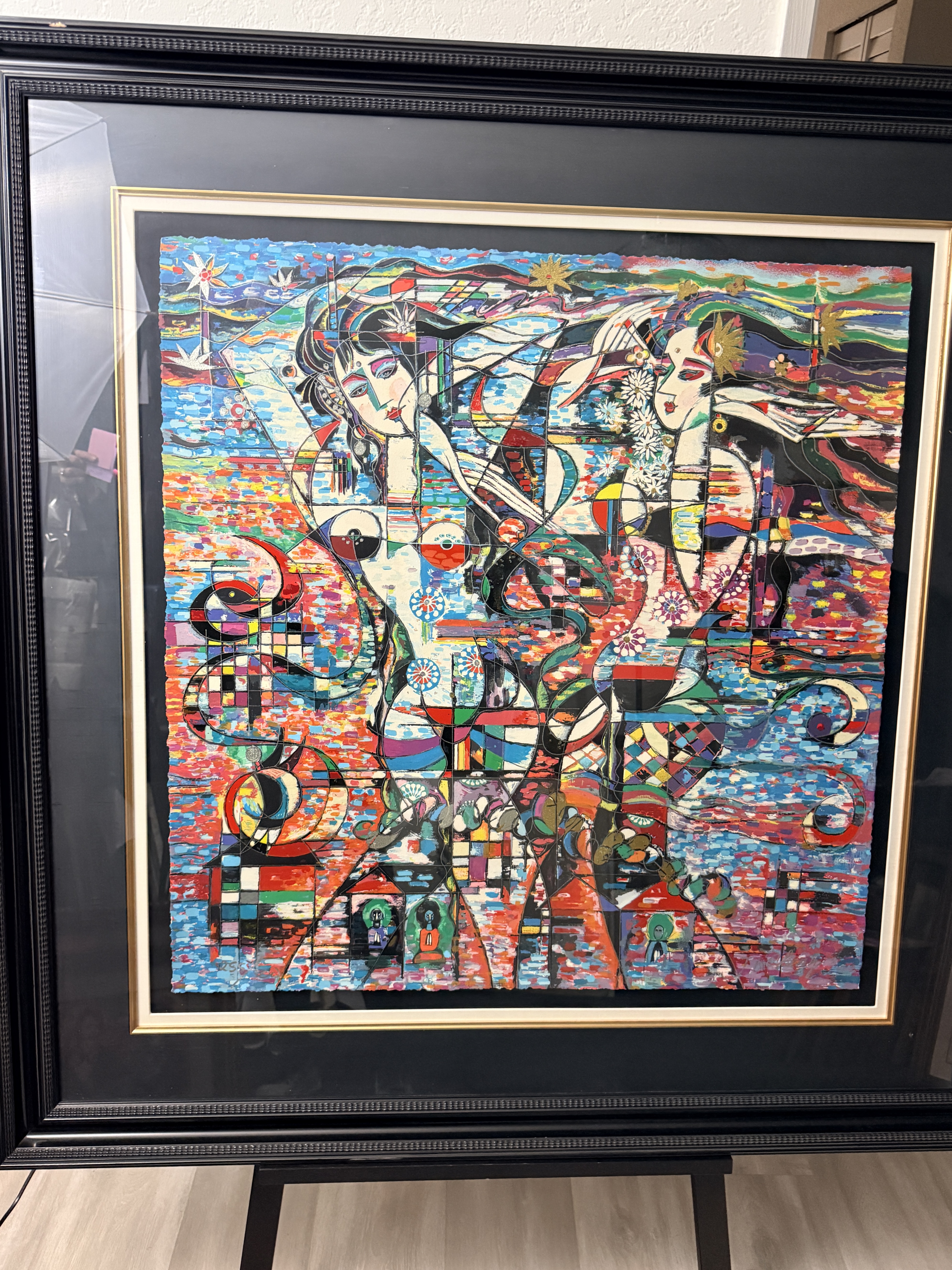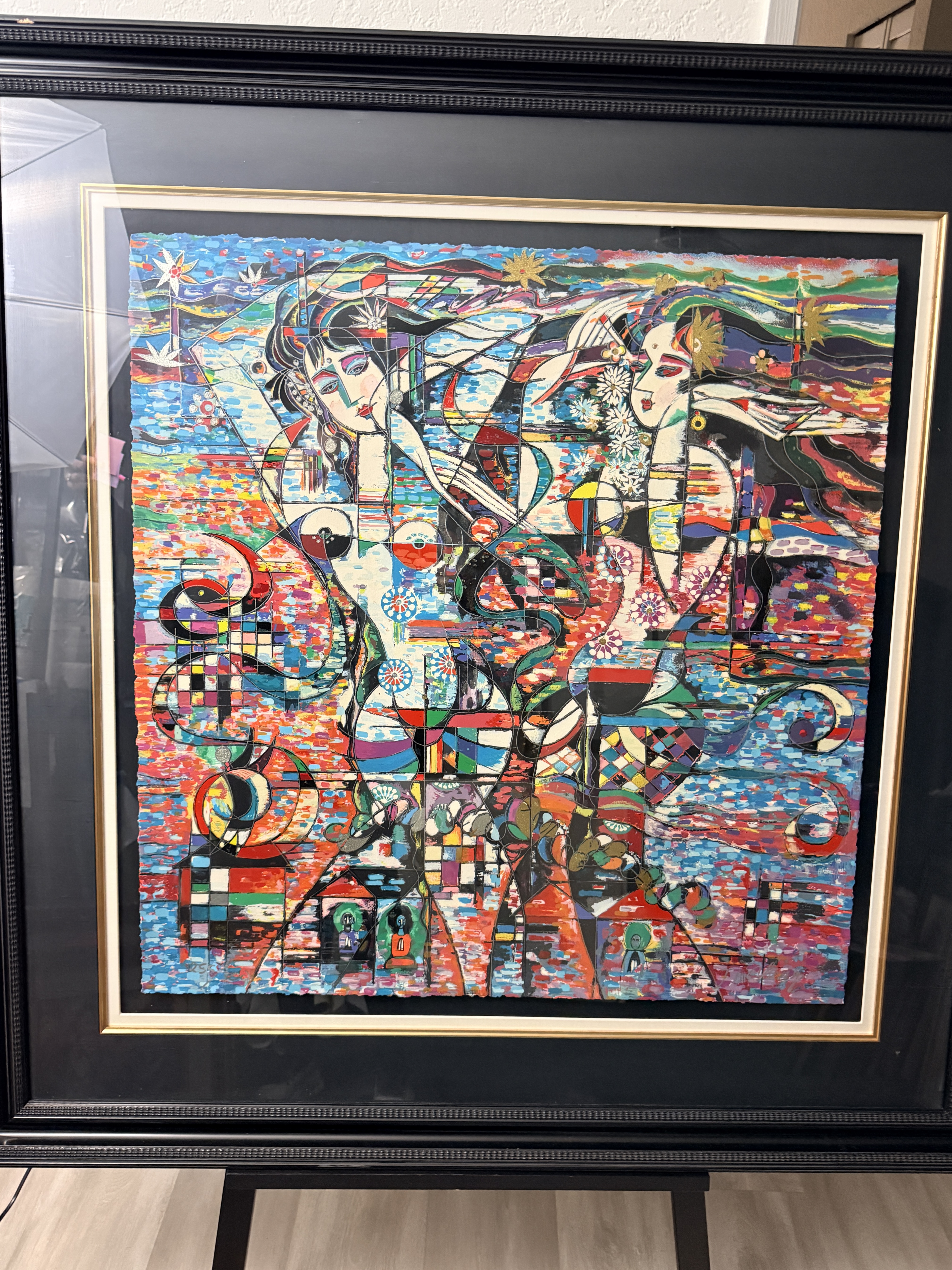 This lot features two large-scale contemporary serigraphs on paper with deckled edges, characteristic of the Yunnan School style. The first piece depicts stylized female figures and floral motifs, signed Jiang and hand-numbered 125/300 in the lower margin. The second piece features a horizontal figure amidst birds and geometric patterns, signed Ji Cheng and hand-numbered 82/300. Both works are professionally mounted with dark mats and housed in black decorative frames with gold-toned inner liners.