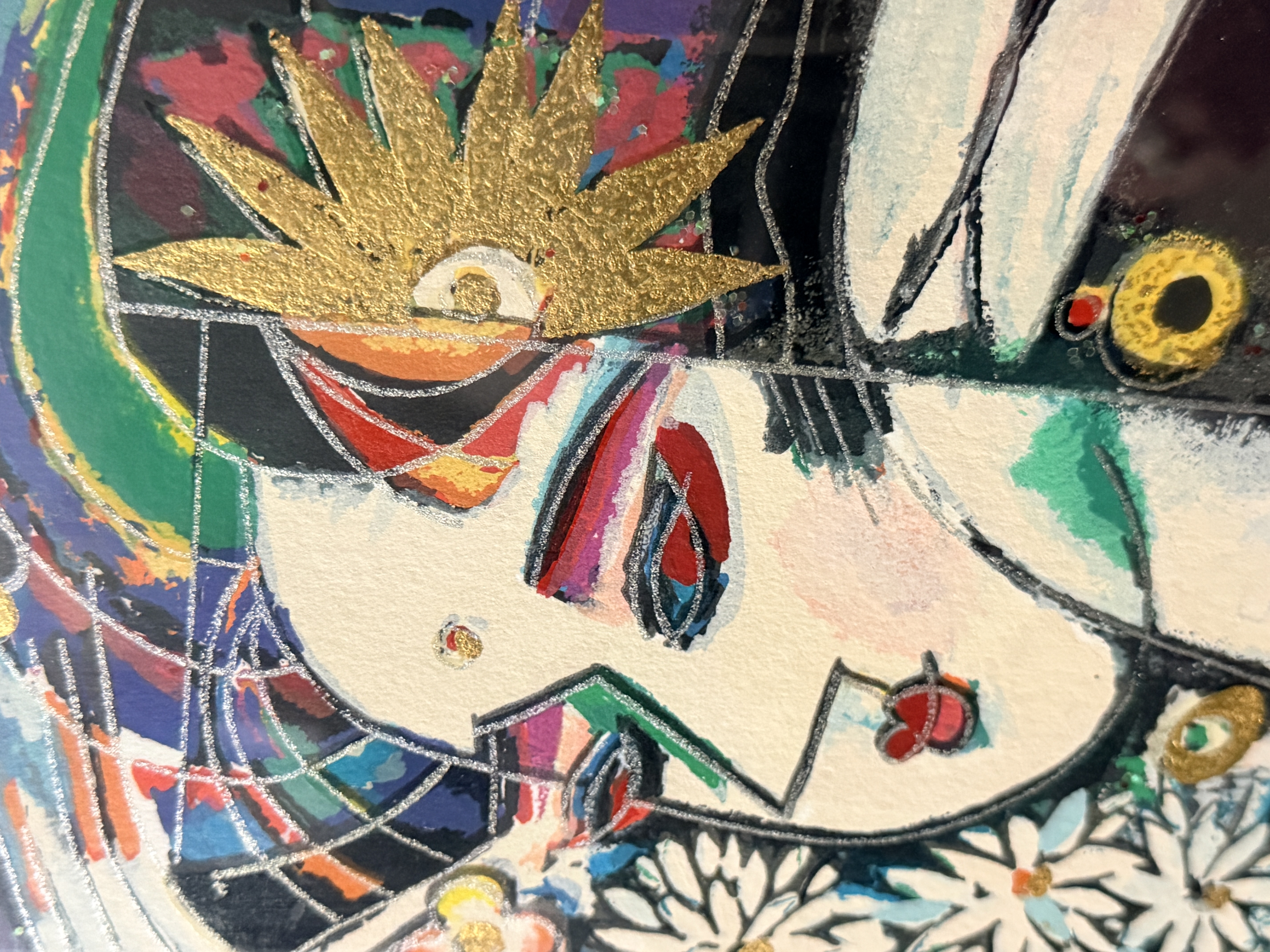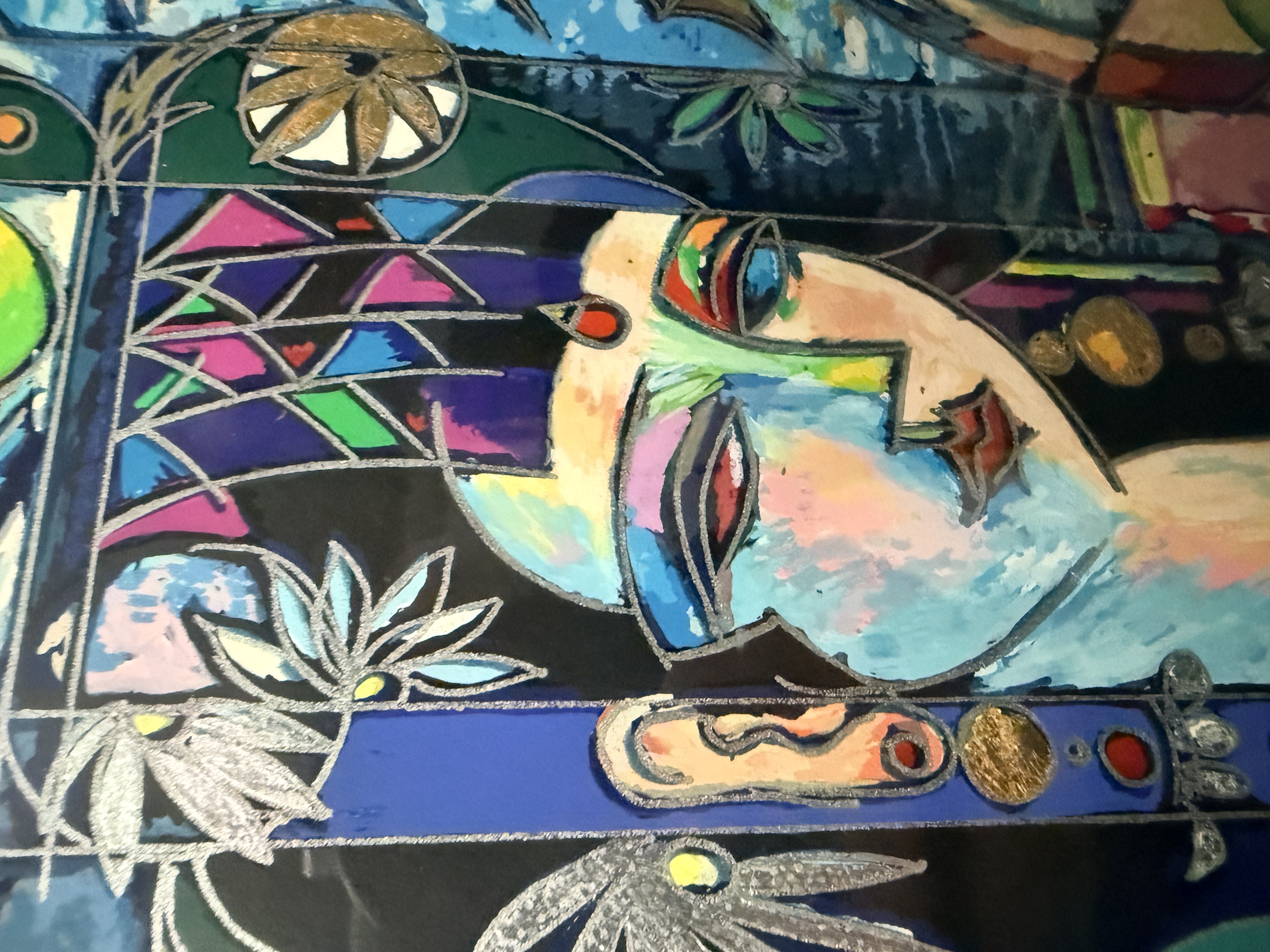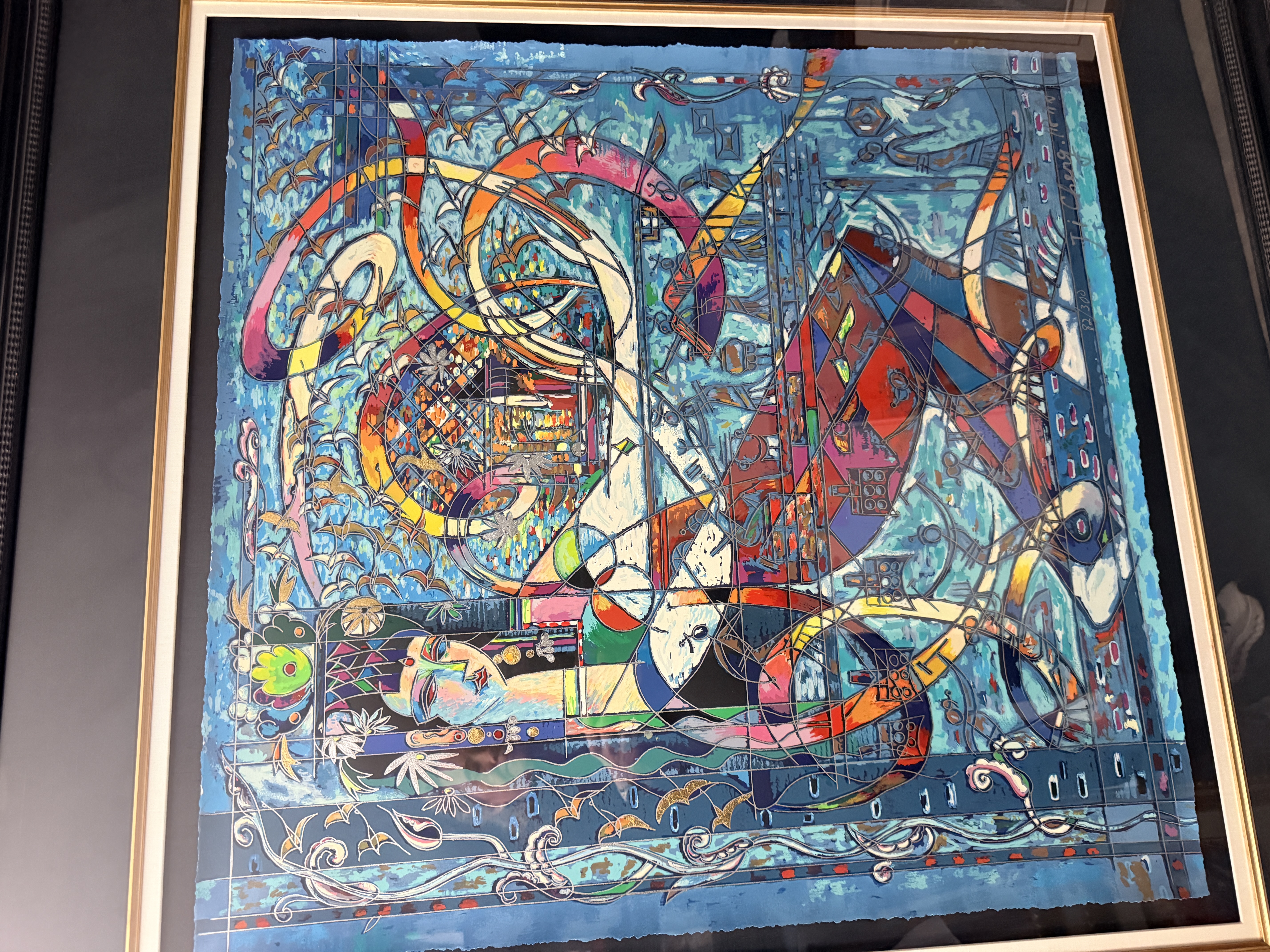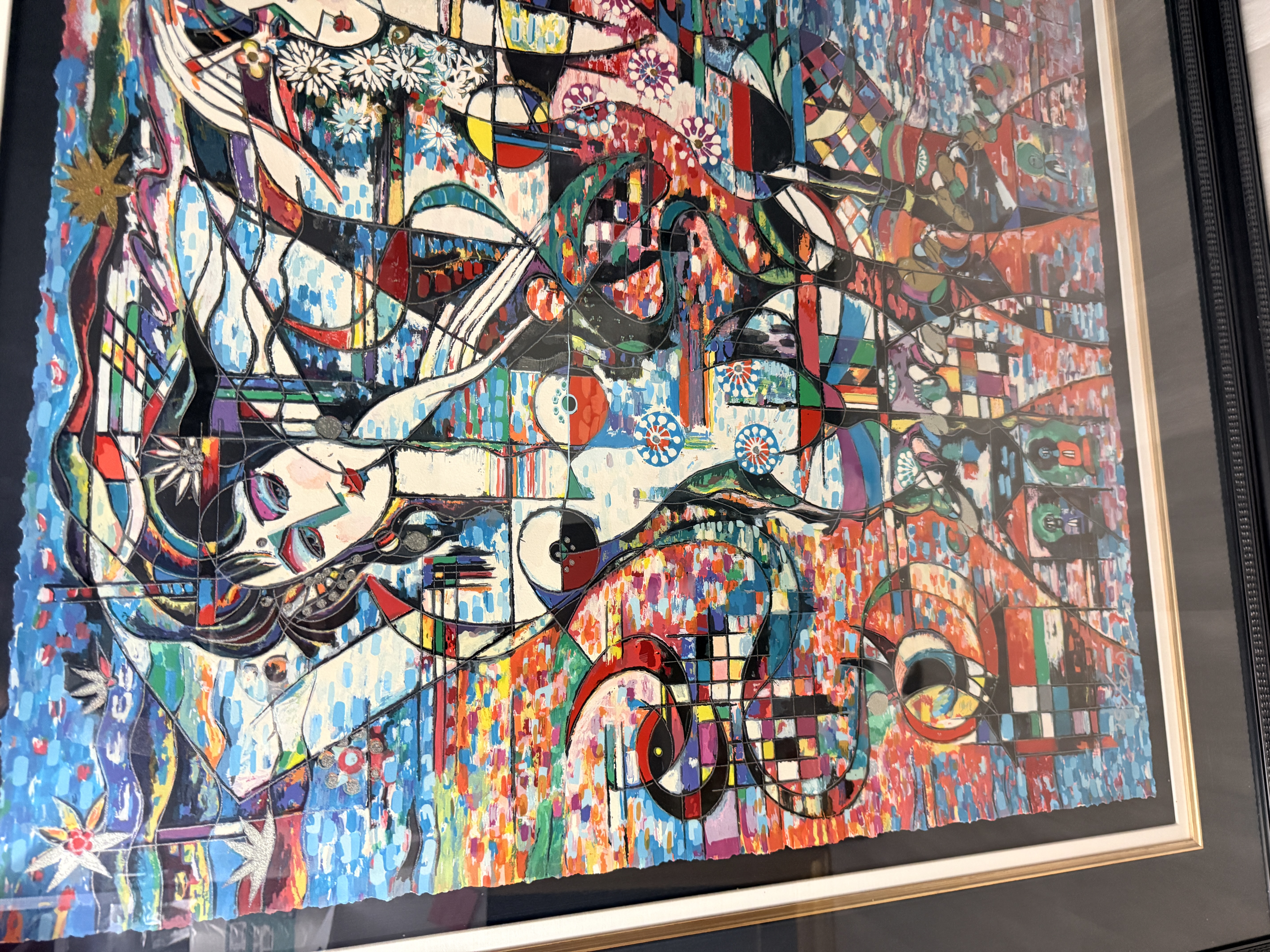 This lot features two large-scale contemporary serigraphs on paper with deckled edges, characteristic of the Yunnan School style. The first piece depicts stylized female figures and floral motifs, signed Jiang and hand-numbered 125/300 in the lower margin. The second piece features a horizontal figure amidst birds and geometric patterns, signed Ji Cheng and hand-numbered 82/300. Both works are professionally mounted with dark mats and housed in black decorative frames with gold-toned inner liners.